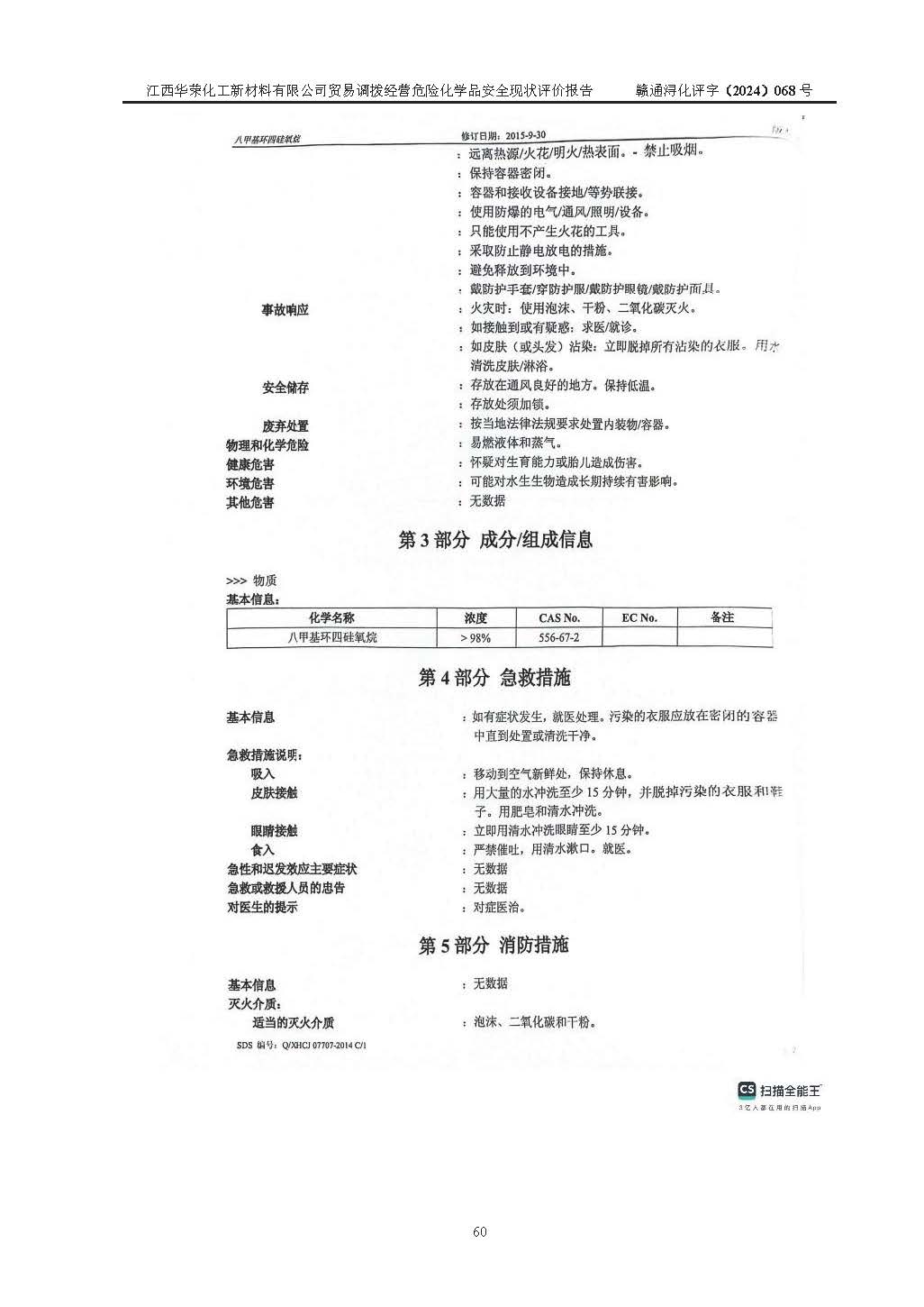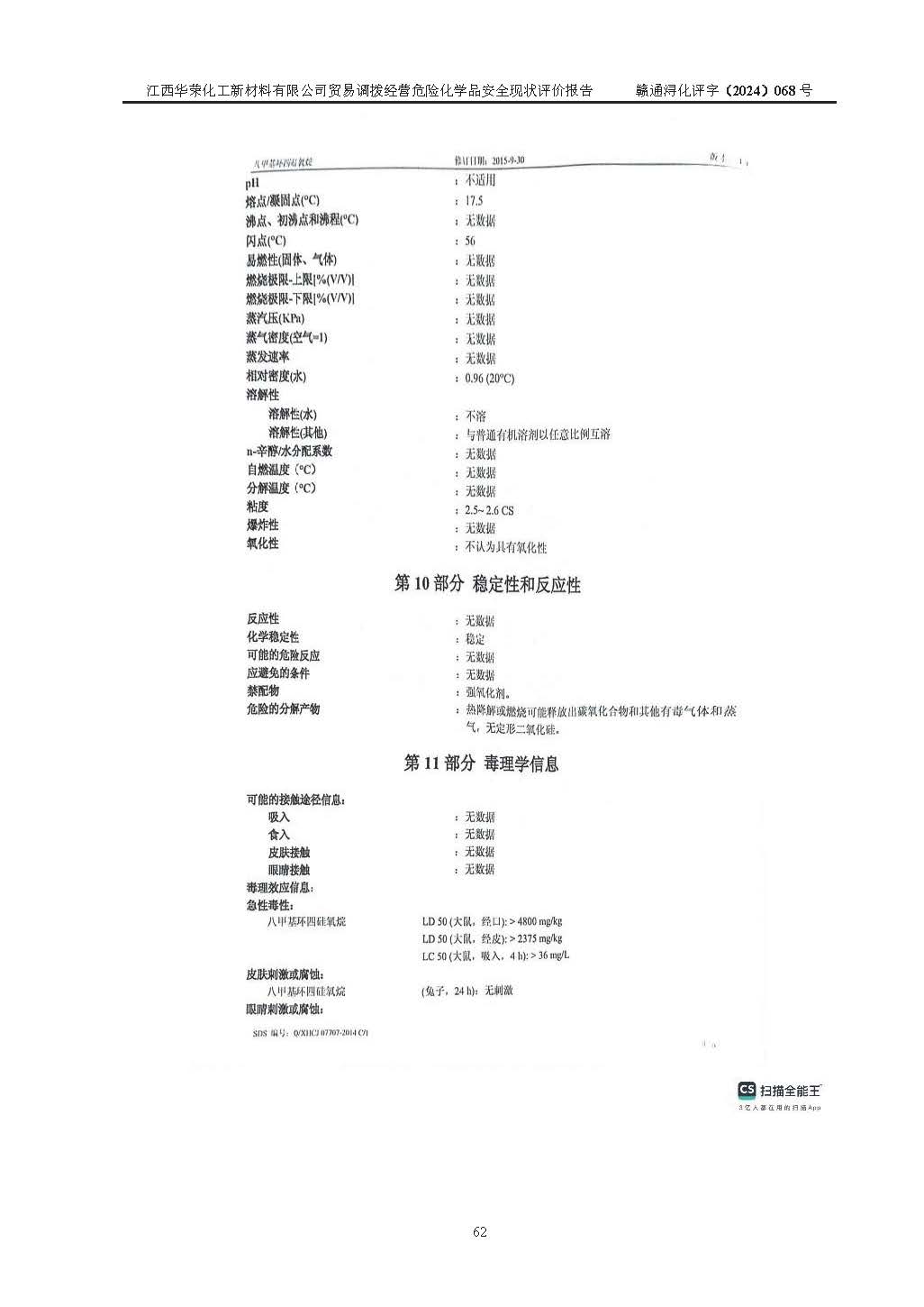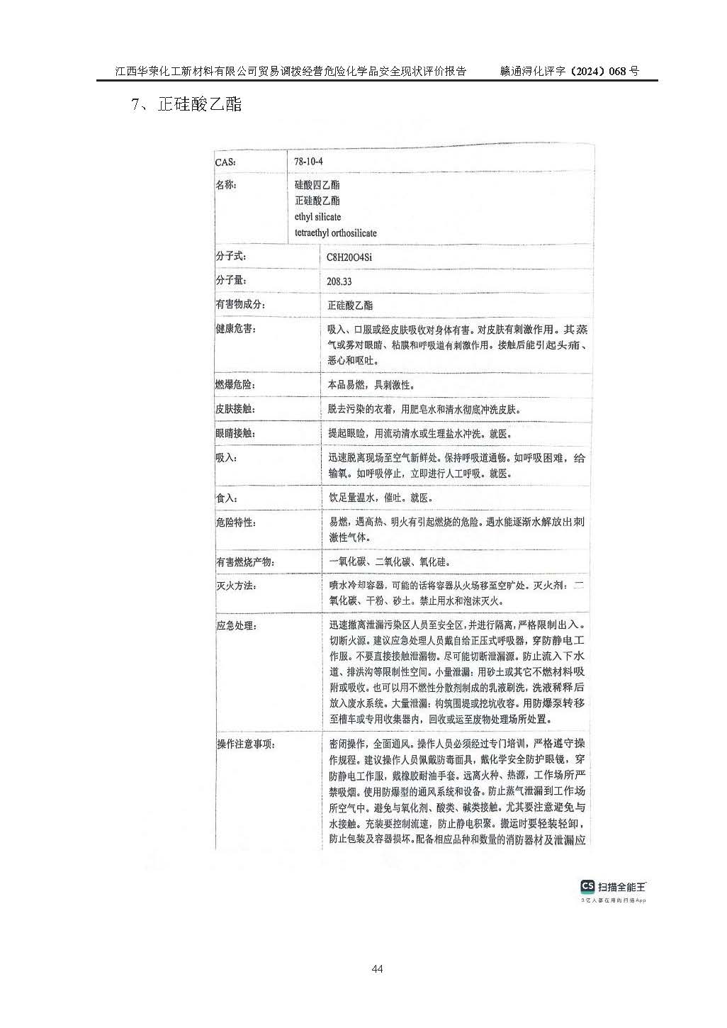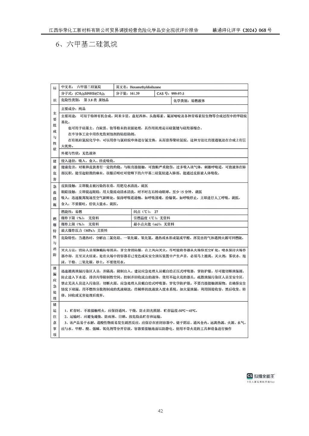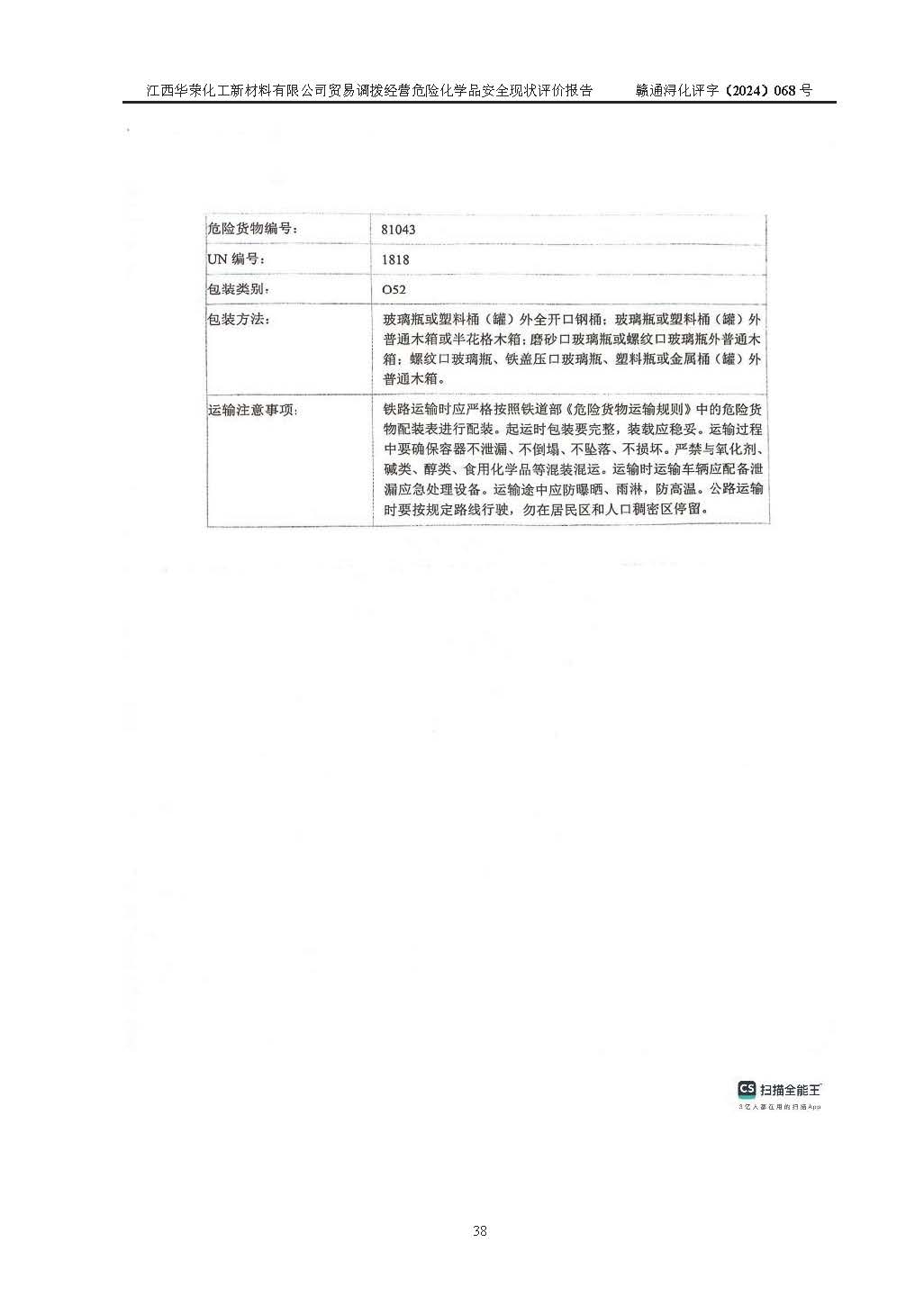 项目简介 | 江西华荣化工新材料有限公司是一家于2015年11月09日注册成立的有限责任公司,企业注册地址与经营场所位于江西省九江市永修县湖东新区开发大道南侧铜锣湾广场总部经济大楼908室,注册资本与实收资本均为200万元人民币。该公司现有员工5人,法定**人王汝华。公司目前经营范围为:许可项目:危险化学品经营(依法须经批准的项目,经相关部门批准后在许可**期内方可开展经营活动,具体经营项目和许可期限以相关部门批准文件或许可证件为准)一般项目:化工产品销售(不含许可类化工产品),橡胶制品销售,建筑材料销售,金属材料销售,货物进出口,信息技术咨询服务(除依法须经批准的项目外,凭营业执照依法自主开展经营活动)。 江西华荣化工新材料有限公司以贸易调拨方式经营危险化学品,品种为:甲基三氯硅烷、二甲基二氯硅烷、**基氯硅烷、四氯化硅、六甲基二硅氧烷、六甲基二硅氮烷、正硅酸乙酯、二甲基硅氧烷混合环体、六甲基环三硅氧烷、八甲基环四硅氧烷、四甲基硅烷、二甲基二乙氧基硅烷、甲基氢二氯硅烷(又称为甲基二氯硅烷,新增)、[闭杯闪点≤60℃](36.有机硅类胶粘剂/54.有机硅树脂)。不涉及危险化学品的运输、储存、店面零售、经营场所样品摆放等问题。企业贸易调拨经营的危险化学品由具有危险化学品经营资质或生产厂家供货,经营的危险化学品的运输委托具有相应资质的单位承担。 根据《危险化学品安全管理条例》(***第645号令修订)、《危险化学品经营许可证管理办法》(**安监总局第55号令,第79号令修改)等法规和文件的要求,《危险化学品经营许可证》申请单位,应提供《安全评价报告》。 江西华荣化工新材料有限公司已向发证部门提出申请,目前正在做申请的准备工作,故委托江西通安安全评价有限公司承担其贸易调拨经营危险化学品安全条件现状评价工作。 江西通安安全评价有限公司接受委托后,组织了评价组;于2024年6月对该公司办公经营场所进行了现场踏勘,查询该公司经营管理模式及规章制度执行情况。依据《安全评价通则》(AQ8001-2007)的要求,评价组完成了风险分析、资料收集、现场勘查和类比调查等前期准备工作。在此基础上,根据企业提供的资料,分析了该企业在贸易调拨经营过程中可能存在的危险、有害因素。选择了相应的安全评价方法逐项进行分析、评价,提出相应的预防和控制对策措施;并与企业安全管理人员进行了沟通后,编制完成了本评价报告,以作为企业申办《危险化学品经营许可证》的安全技术依据。 本次评价范围为江西华荣化工新材料有限公司贸易调拨经营危险化学品过程中的安全条件及安全管理方面的现状。包括经营过程中安全管理的组织、机构、人员及安全管理制度等。该单位不涉及贸易调拨经营危险化学品的运输、储存,其委托危险化学品的道路运输、储存不在本评价范围内。 | ||||||