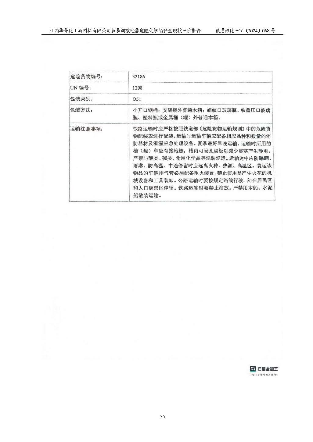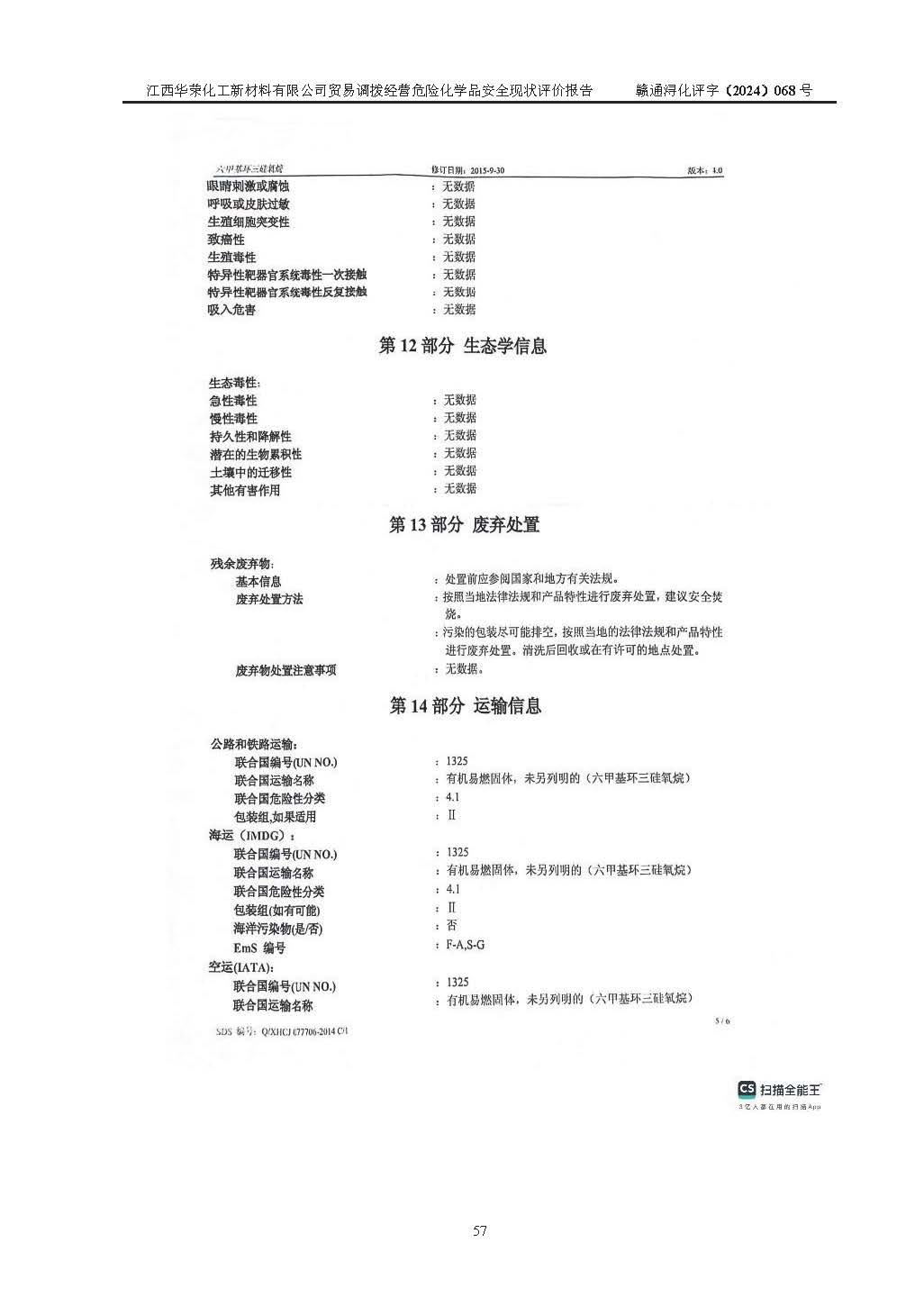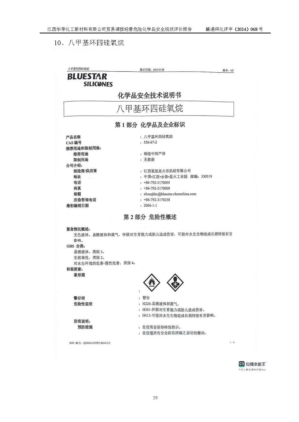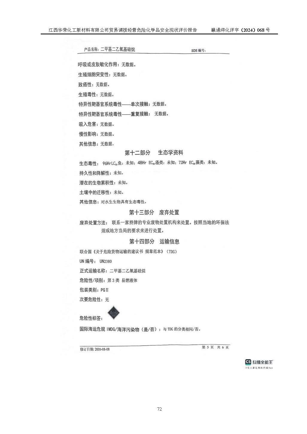 项目简介 | 江西华荣化工新材料有限公司是一家于2015年11月09日注册成立的有限责任公司,企业注册地址与经营场所位于江西省九江市永修县湖东新区开发大道南侧铜锣湾广场总部经济大楼908室,注册资本与实收资本均为200万元人民币。该公司现有员工5人,法定**人王汝华。公司目前经营范围为:许可项目:危险化学品经营(依法须经批准的项目,经相关部门批准后在许可**期内方可开展经营活动,具体经营项目和许可期限以相关部门批准文件或许可证件为准)一般项目:化工产品销售(不含许可类化工产品),橡胶制品销售,建筑材料销售,金属材料销售,货物进出口,信息技术咨询服务(除依法须经批准的项目外,凭营业执照依法自主开展经营活动)。 江西华荣化工新材料有限公司以贸易调拨方式经营危险化学品,品种为:甲基三氯硅烷、二甲基二氯硅烷、**基氯硅烷、四氯化硅、六甲基二硅氧烷、六甲基二硅氮烷、正硅酸乙酯、二甲基硅氧烷混合环体、六甲基环三硅氧烷、八甲基环四硅氧烷、四甲基硅烷、二甲基二乙氧基硅烷、甲基氢二氯硅烷(又称为甲基二氯硅烷,新增)、[闭杯闪点≤60℃](36.有机硅类胶粘剂/54.有机硅树脂)。不涉及危险化学品的运输、储存、店面零售、经营场所样品摆放等问题。企业贸易调拨经营的危险化学品由具有危险化学品经营资质或生产厂家供货,经营的危险化学品的运输委托具有相应资质的单位承担。 根据《危险化学品安全管理条例》(***第645号令修订)、《危险化学品经营许可证管理办法》(**安监总局第55号令,第79号令修改)等法规和文件的要求,《危险化学品经营许可证》申请单位,应提供《安全评价报告》。 江西华荣化工新材料有限公司已向发证部门提出申请,目前正在做申请的准备工作,故委托江西通安安全评价有限公司承担其贸易调拨经营危险化学品安全条件现状评价工作。 江西通安安全评价有限公司接受委托后,组织了评价组;于2024年6月对该公司办公经营场所进行了现场踏勘,查询该公司经营管理模式及规章制度执行情况。依据《安全评价通则》(AQ8001-2007)的要求,评价组完成了风险分析、资料收集、现场勘查和类比调查等前期准备工作。在此基础上,根据企业提供的资料,分析了该企业在贸易调拨经营过程中可能存在的危险、有害因素。选择了相应的安全评价方法逐项进行分析、评价,提出相应的预防和控制对策措施;并与企业安全管理人员进行了沟通后,编制完成了本评价报告,以作为企业申办《危险化学品经营许可证》的安全技术依据。 本次评价范围为江西华荣化工新材料有限公司贸易调拨经营危险化学品过程中的安全条件及安全管理方面的现状。包括经营过程中安全管理的组织、机构、人员及安全管理制度等。该单位不涉及贸易调拨经营危险化学品的运输、储存,其委托危险化学品的道路运输、储存不在本评价范围内。 | ||||||