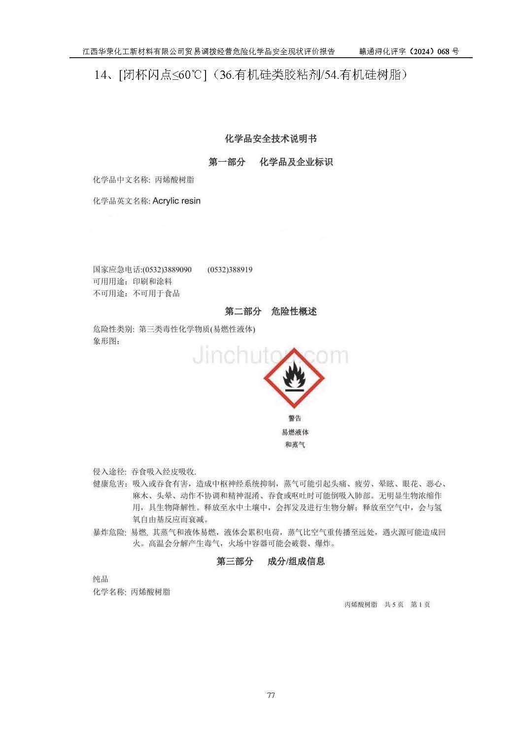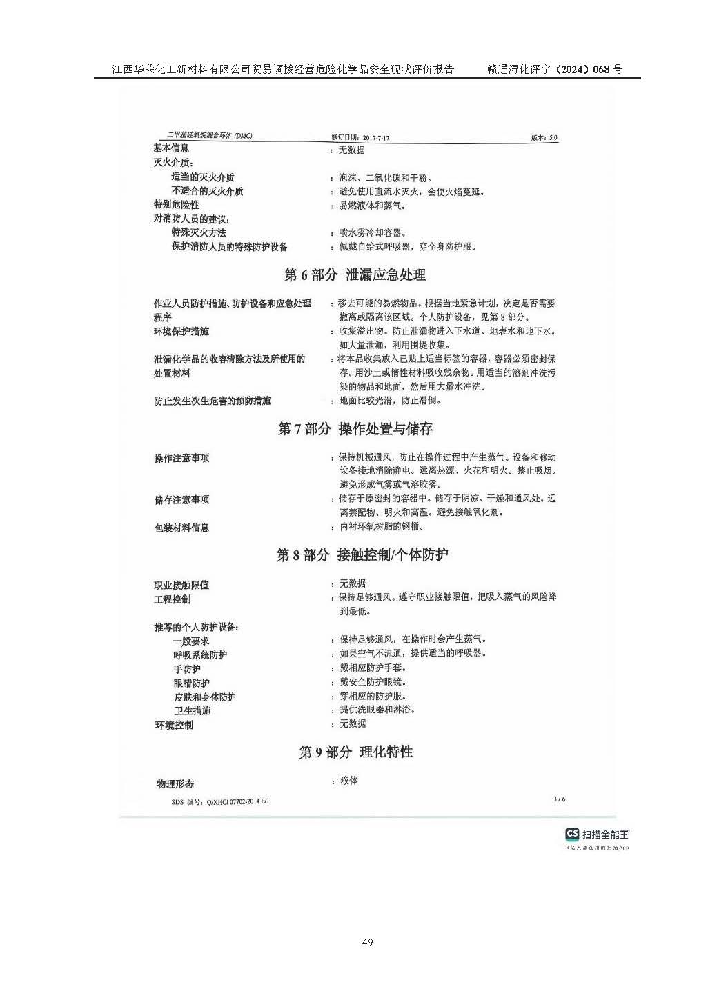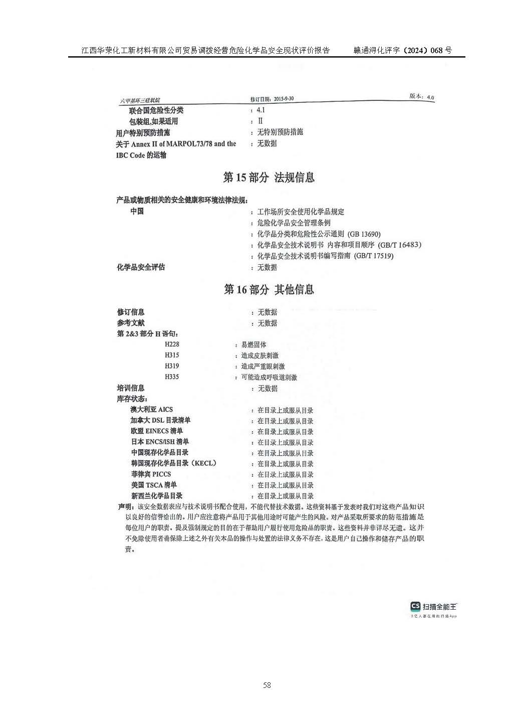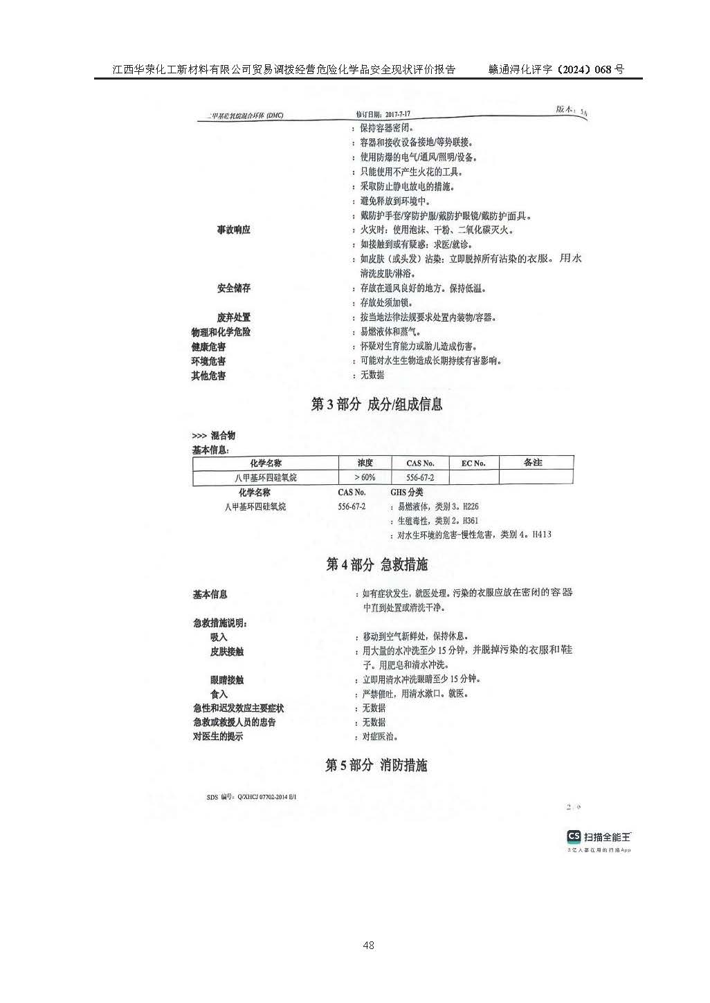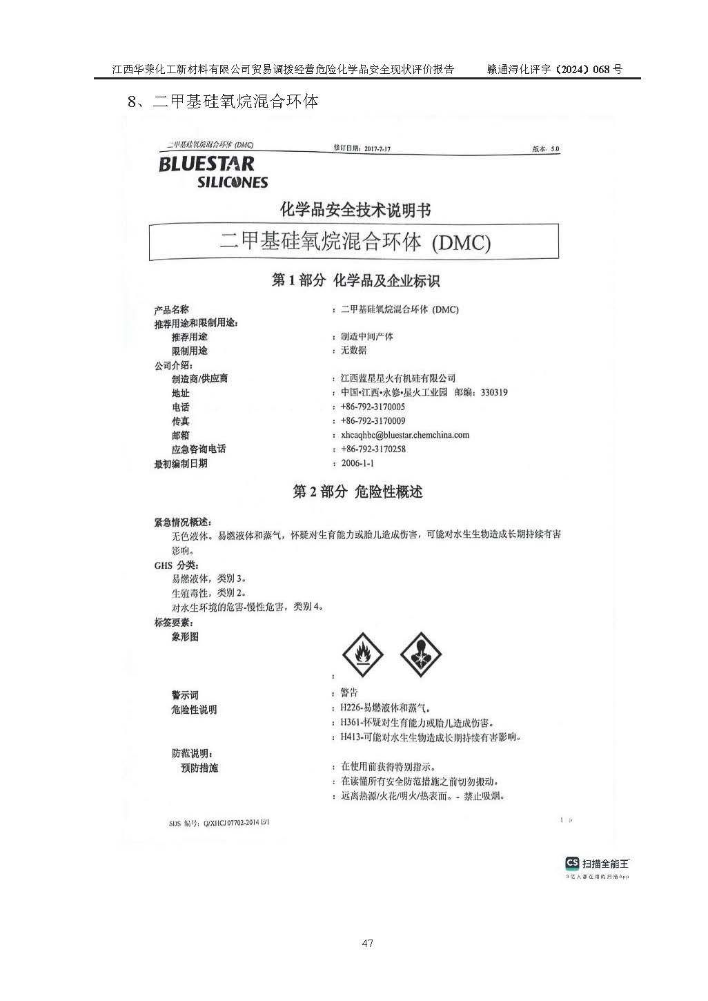 项目简介 | 江西华荣化工新材料有限公司是一家于2015年11月09日注册成立的有限责任公司,企业注册地址与经营场所位于江西省九江市永修县湖东新区开发大道南侧铜锣湾广场总部经济大楼908室,注册资本与实收资本均为200万元人民币。该公司现有员工5人,法定**人王汝华。公司目前经营范围为:许可项目:危险化学品经营(依法须经批准的项目,经相关部门批准后在许可**期内方可开展经营活动,具体经营项目和许可期限以相关部门批准文件或许可证件为准)一般项目:化工产品销售(不含许可类化工产品),橡胶制品销售,建筑材料销售,金属材料销售,货物进出口,信息技术咨询服务(除依法须经批准的项目外,凭营业执照依法自主开展经营活动)。 江西华荣化工新材料有限公司以贸易调拨方式经营危险化学品,品种为:甲基三氯硅烷、二甲基二氯硅烷、**基氯硅烷、四氯化硅、六甲基二硅氧烷、六甲基二硅氮烷、正硅酸乙酯、二甲基硅氧烷混合环体、六甲基环三硅氧烷、八甲基环四硅氧烷、四甲基硅烷、二甲基二乙氧基硅烷、甲基氢二氯硅烷(又称为甲基二氯硅烷,新增)、[闭杯闪点≤60℃](36.有机硅类胶粘剂/54.有机硅树脂)。不涉及危险化学品的运输、储存、店面零售、经营场所样品摆放等问题。企业贸易调拨经营的危险化学品由具有危险化学品经营资质或生产厂家供货,经营的危险化学品的运输委托具有相应资质的单位承担。 根据《危险化学品安全管理条例》(***第645号令修订)、《危险化学品经营许可证管理办法》(**安监总局第55号令,第79号令修改)等法规和文件的要求,《危险化学品经营许可证》申请单位,应提供《安全评价报告》。 江西华荣化工新材料有限公司已向发证部门提出申请,目前正在做申请的准备工作,故委托江西通安安全评价有限公司承担其贸易调拨经营危险化学品安全条件现状评价工作。 江西通安安全评价有限公司接受委托后,组织了评价组;于2024年6月对该公司办公经营场所进行了现场踏勘,查询该公司经营管理模式及规章制度执行情况。依据《安全评价通则》(AQ8001-2007)的要求,评价组完成了风险分析、资料收集、现场勘查和类比调查等前期准备工作。在此基础上,根据企业提供的资料,分析了该企业在贸易调拨经营过程中可能存在的危险、有害因素。选择了相应的安全评价方法逐项进行分析、评价,提出相应的预防和控制对策措施;并与企业安全管理人员进行了沟通后,编制完成了本评价报告,以作为企业申办《危险化学品经营许可证》的安全技术依据。 本次评价范围为江西华荣化工新材料有限公司贸易调拨经营危险化学品过程中的安全条件及安全管理方面的现状。包括经营过程中安全管理的组织、机构、人员及安全管理制度等。该单位不涉及贸易调拨经营危险化学品的运输、储存,其委托危险化学品的道路运输、储存不在本评价范围内。 | ||||||