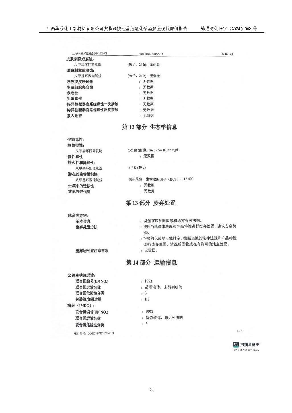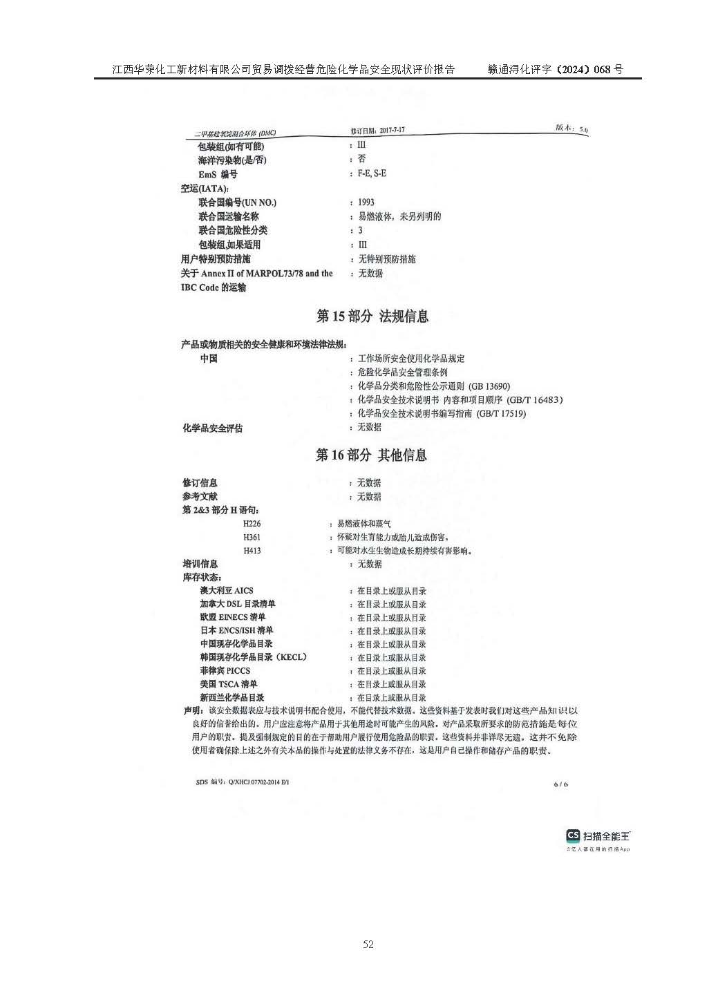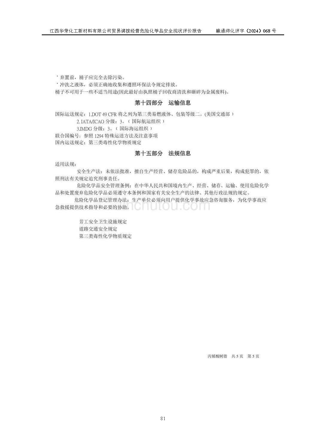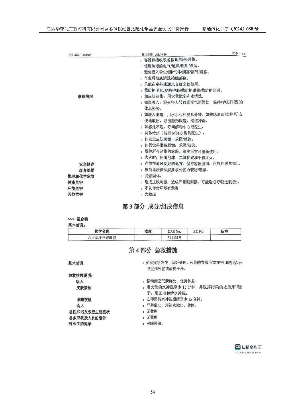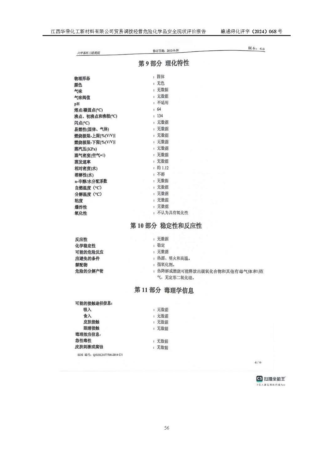 项目简介 | 江西华荣化工新材料有限公司是一家于2015年11月09日注册成立的有限责任公司,企业注册地址与经营场所位于江西省九江市永修县湖东新区开发大道南侧铜锣湾广场总部经济大楼908室,注册资本与实收资本均为200万元人民币。该公司现有员工5人,法定**人王汝华。公司目前经营范围为:许可项目:危险化学品经营(依法须经批准的项目,经相关部门批准后在许可**期内方可开展经营活动,具体经营项目和许可期限以相关部门批准文件或许可证件为准)一般项目:化工产品销售(不含许可类化工产品),橡胶制品销售,建筑材料销售,金属材料销售,货物进出口,信息技术咨询服务(除依法须经批准的项目外,凭营业执照依法自主开展经营活动)。 江西华荣化工新材料有限公司以贸易调拨方式经营危险化学品,品种为:甲基三氯硅烷、二甲基二氯硅烷、**基氯硅烷、四氯化硅、六甲基二硅氧烷、六甲基二硅氮烷、正硅酸乙酯、二甲基硅氧烷混合环体、六甲基环三硅氧烷、八甲基环四硅氧烷、四甲基硅烷、二甲基二乙氧基硅烷、甲基氢二氯硅烷(又称为甲基二氯硅烷,新增)、[闭杯闪点≤60℃](36.有机硅类胶粘剂/54.有机硅树脂)。不涉及危险化学品的运输、储存、店面零售、经营场所样品摆放等问题。企业贸易调拨经营的危险化学品由具有危险化学品经营资质或生产厂家供货,经营的危险化学品的运输委托具有相应资质的单位承担。 根据《危险化学品安全管理条例》(***第645号令修订)、《危险化学品经营许可证管理办法》(**安监总局第55号令,第79号令修改)等法规和文件的要求,《危险化学品经营许可证》申请单位,应提供《安全评价报告》。 江西华荣化工新材料有限公司已向发证部门提出申请,目前正在做申请的准备工作,故委托江西通安安全评价有限公司承担其贸易调拨经营危险化学品安全条件现状评价工作。 江西通安安全评价有限公司接受委托后,组织了评价组;于2024年6月对该公司办公经营场所进行了现场踏勘,查询该公司经营管理模式及规章制度执行情况。依据《安全评价通则》(AQ8001-2007)的要求,评价组完成了风险分析、资料收集、现场勘查和类比调查等前期准备工作。在此基础上,根据企业提供的资料,分析了该企业在贸易调拨经营过程中可能存在的危险、有害因素。选择了相应的安全评价方法逐项进行分析、评价,提出相应的预防和控制对策措施;并与企业安全管理人员进行了沟通后,编制完成了本评价报告,以作为企业申办《危险化学品经营许可证》的安全技术依据。 本次评价范围为江西华荣化工新材料有限公司贸易调拨经营危险化学品过程中的安全条件及安全管理方面的现状。包括经营过程中安全管理的组织、机构、人员及安全管理制度等。该单位不涉及贸易调拨经营危险化学品的运输、储存,其委托危险化学品的道路运输、储存不在本评价范围内。 | ||||||