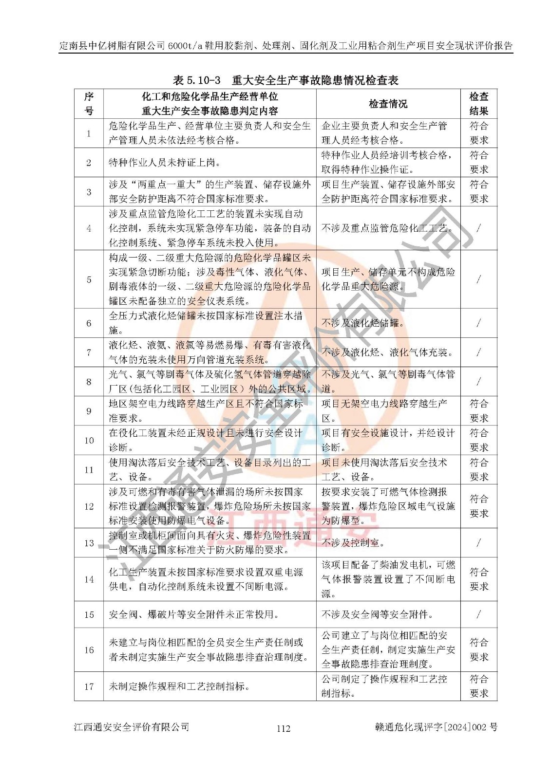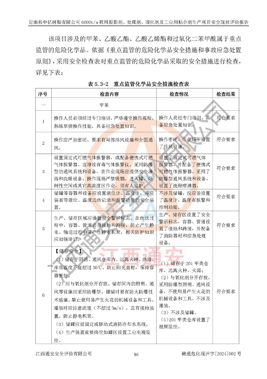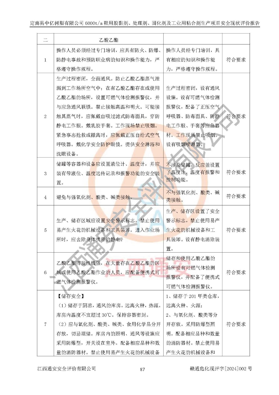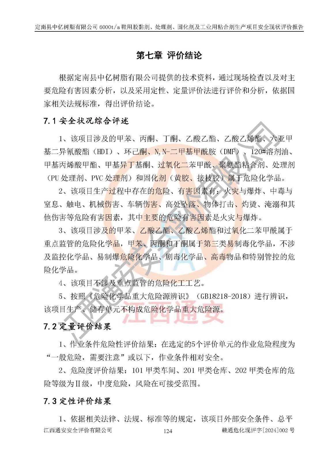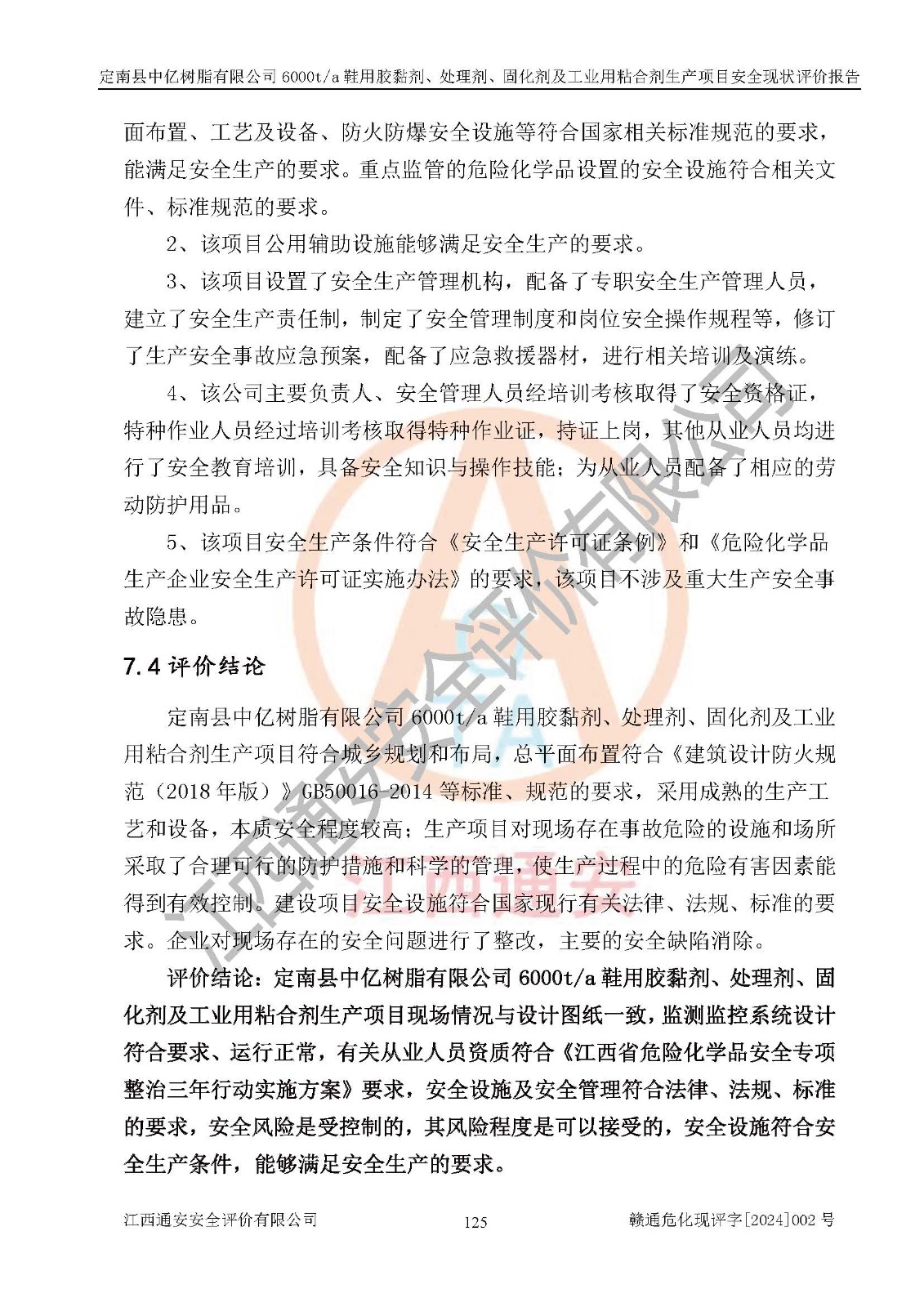 评价结论 | 定南县中亿树脂有限公司6000t/a鞋用胶黏剂、处理剂、固化剂及工业用粘合剂生产项目现场情况与设计图纸一致,监测监控系统设计符合要求、运行正常,有关从业人员资质符合《江西省危险化学品安全专项整治三年行动实施方案》要求,安全设施及安全管理符合法律、法规、标准的要求,安全风险是受控制的,其风险程度是可以接受的,安全设施符合安全生产条件,能够满足安全生产的要求。 | ||||||