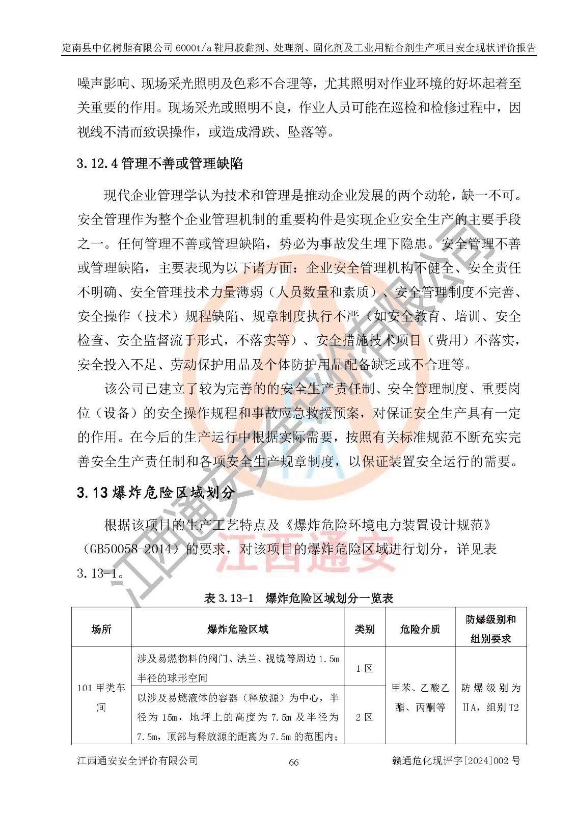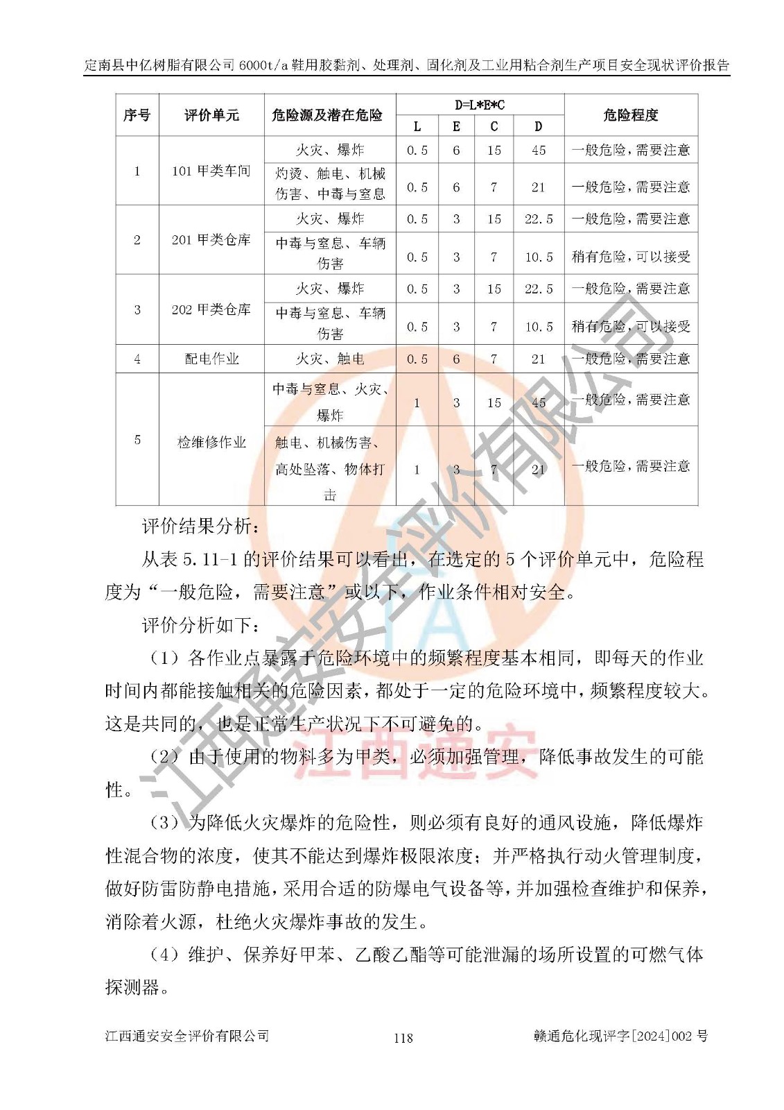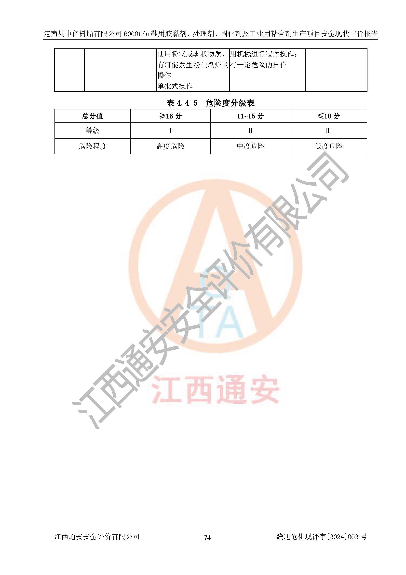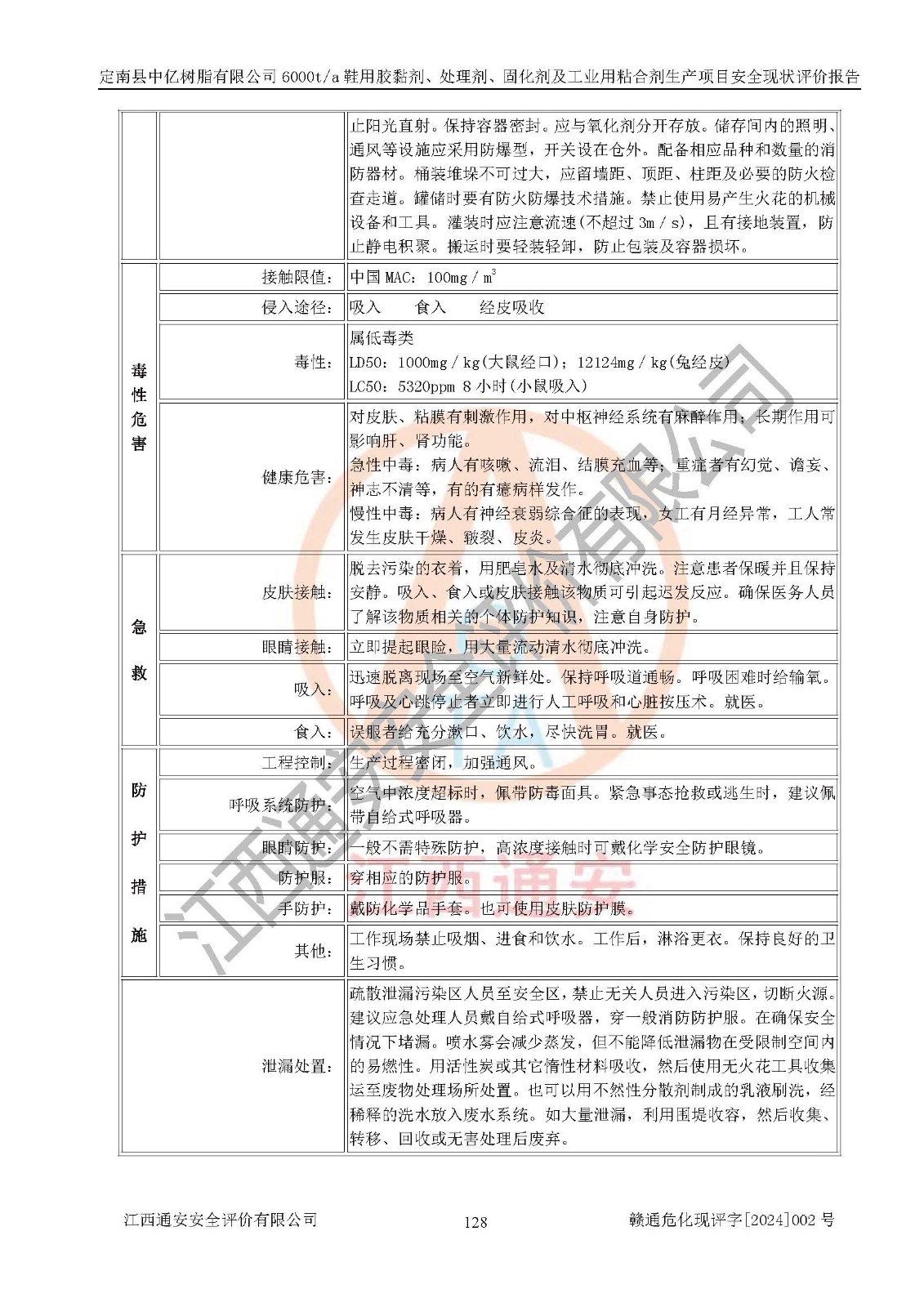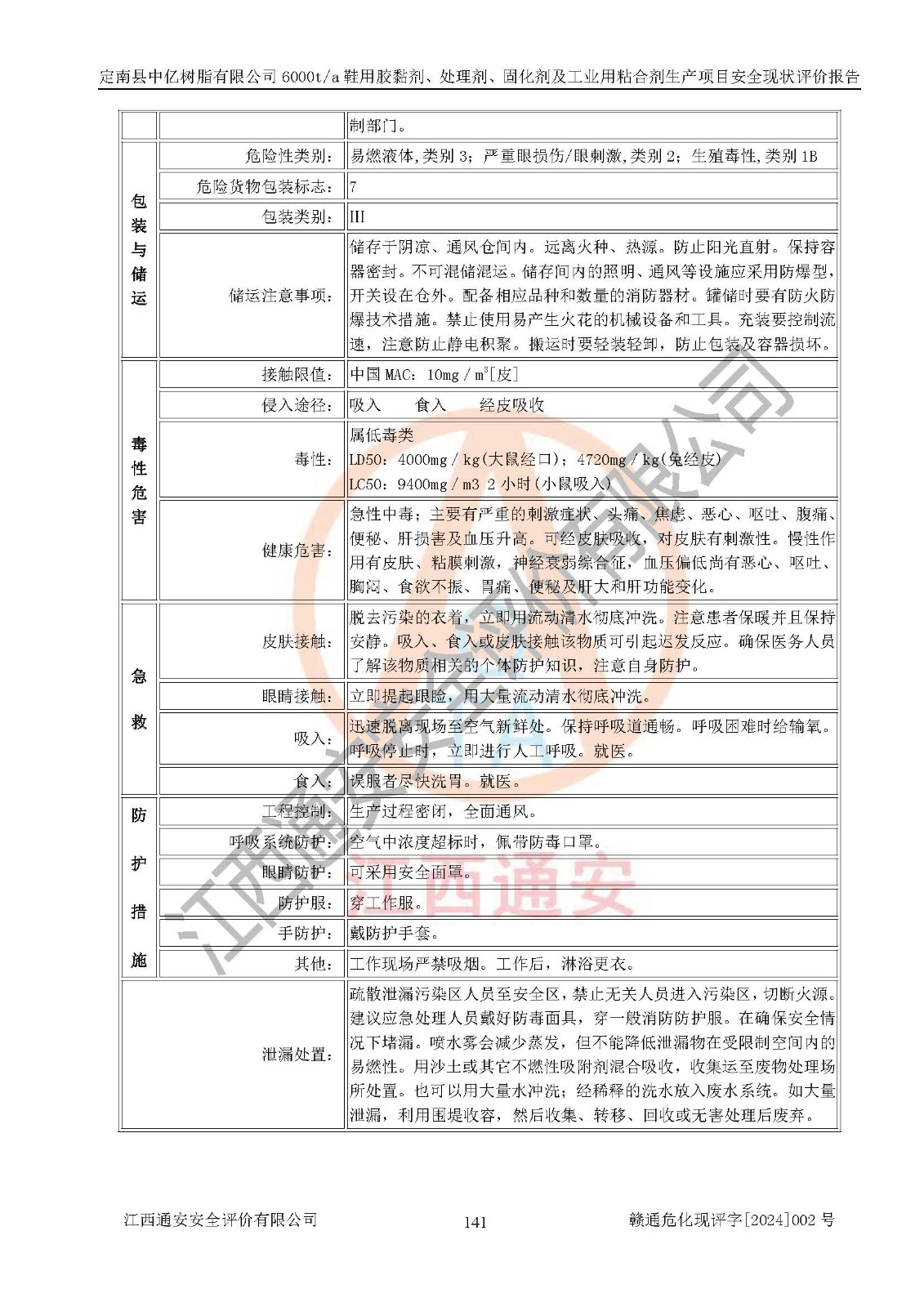 评价结论 | 定南县中亿树脂有限公司6000t/a鞋用胶黏剂、处理剂、固化剂及工业用粘合剂生产项目现场情况与设计图纸一致,监测监控系统设计符合要求、运行正常,有关从业人员资质符合《江西省危险化学品安全专项整治三年行动实施方案》要求,安全设施及安全管理符合法律、法规、标准的要求,安全风险是受控制的,其风险程度是可以接受的,安全设施符合安全生产条件,能够满足安全生产的要求。 | ||||||