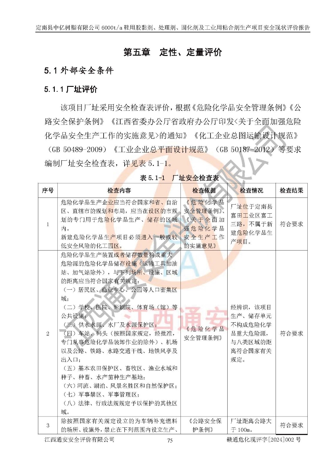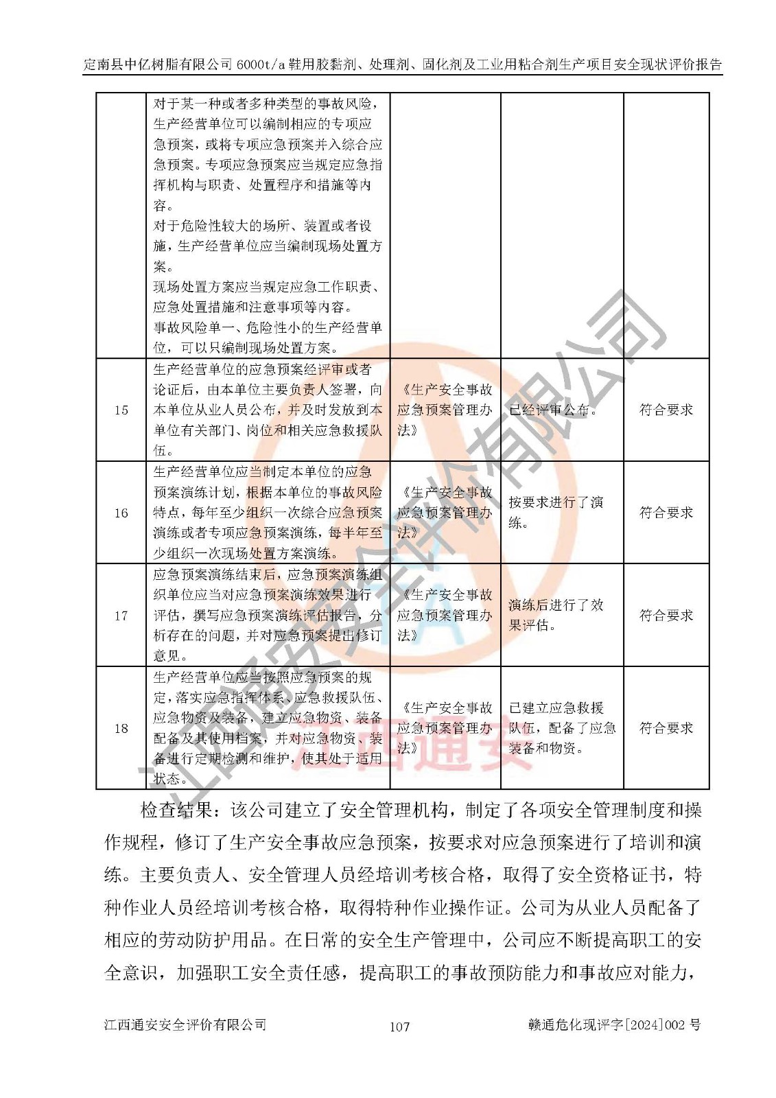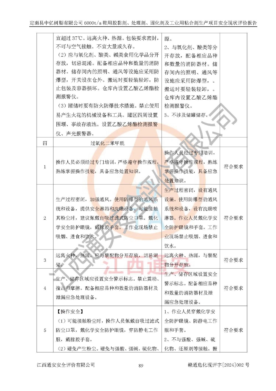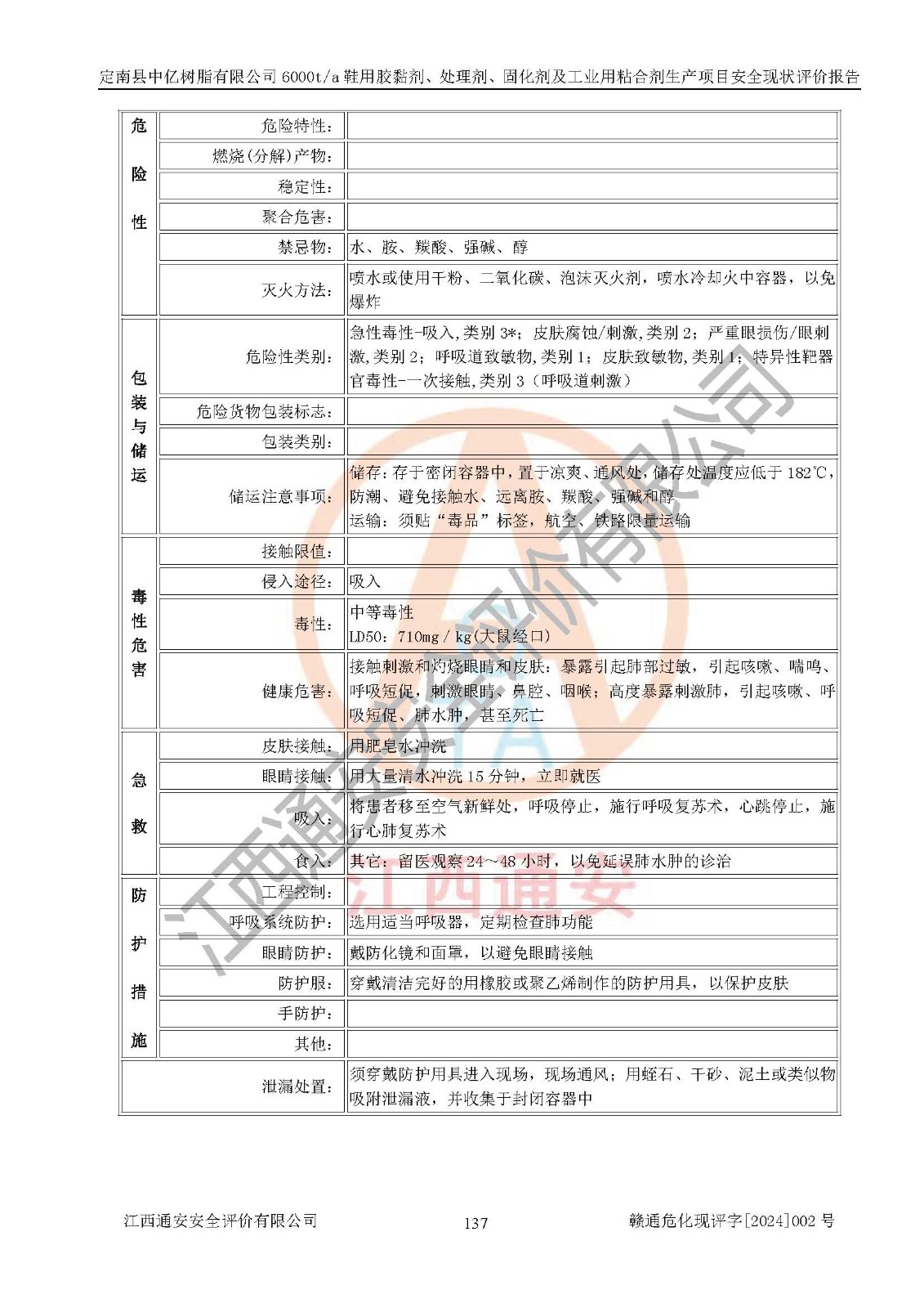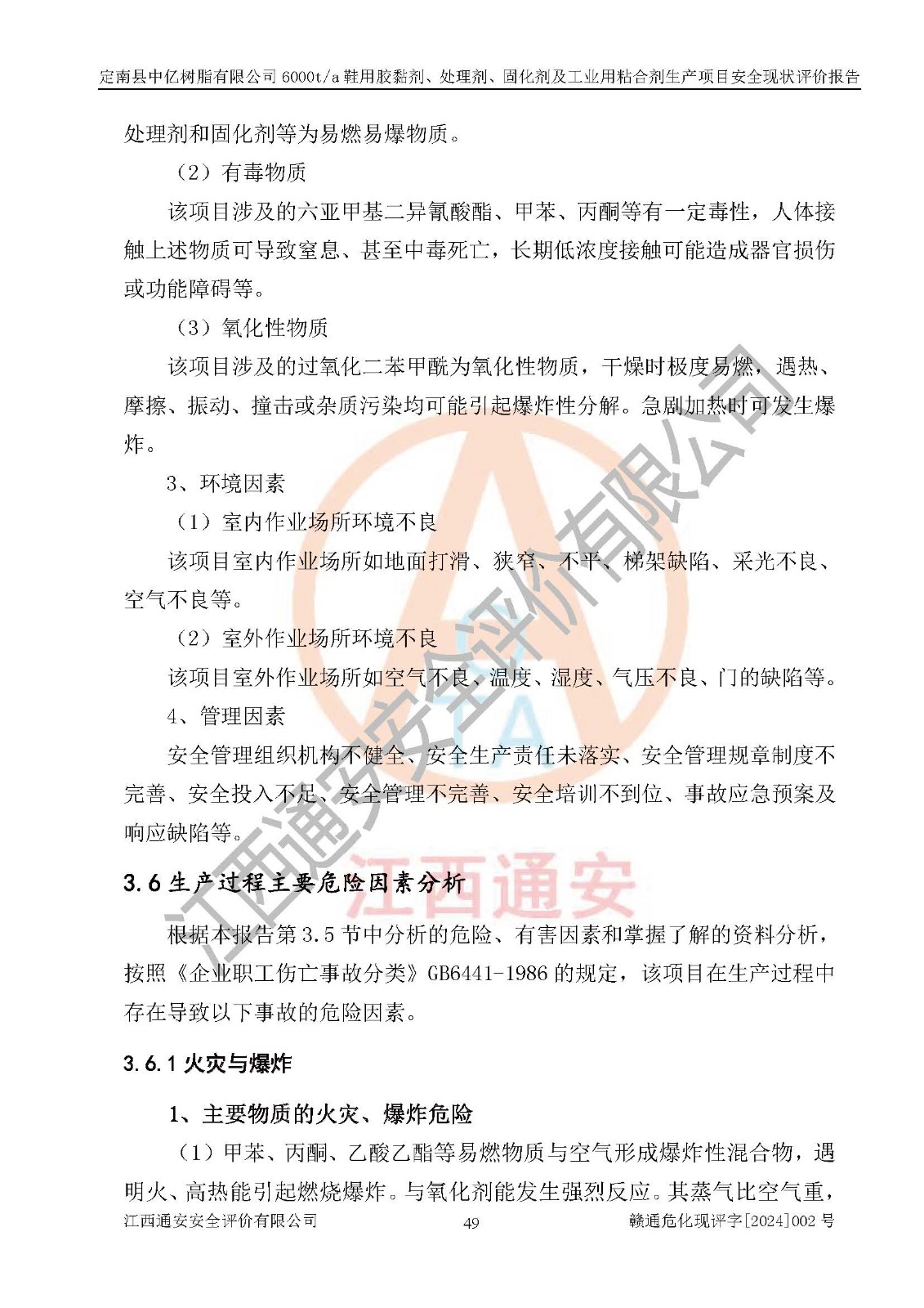 评价结论 | 定南县中亿树脂有限公司6000t/a鞋用胶黏剂、处理剂、固化剂及工业用粘合剂生产项目现场情况与设计图纸一致,监测监控系统设计符合要求、运行正常,有关从业人员资质符合《江西省危险化学品安全专项整治三年行动实施方案》要求,安全设施及安全管理符合法律、法规、标准的要求,安全风险是受控制的,其风险程度是可以接受的,安全设施符合安全生产条件,能够满足安全生产的要求。 | ||||||