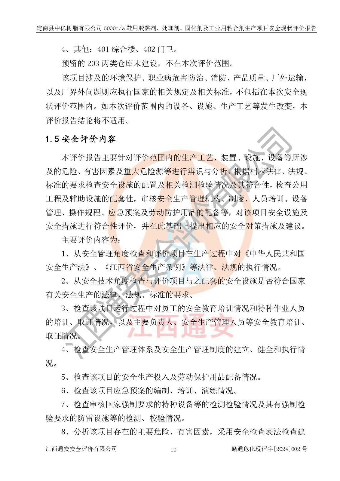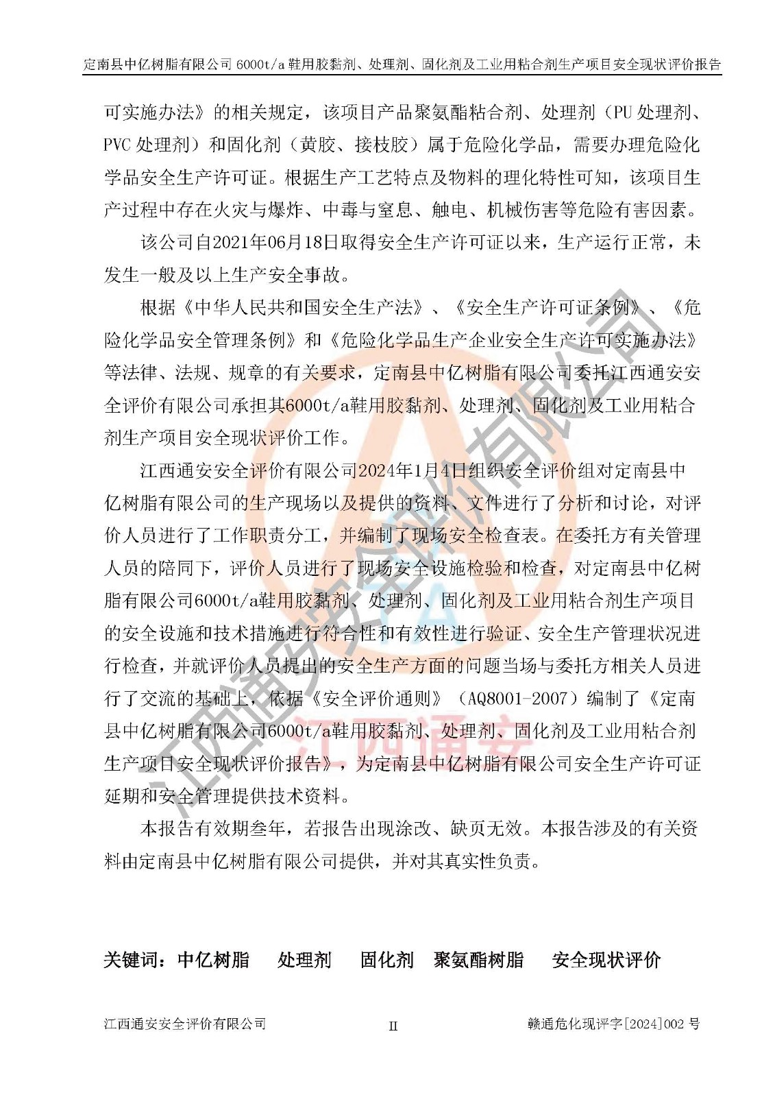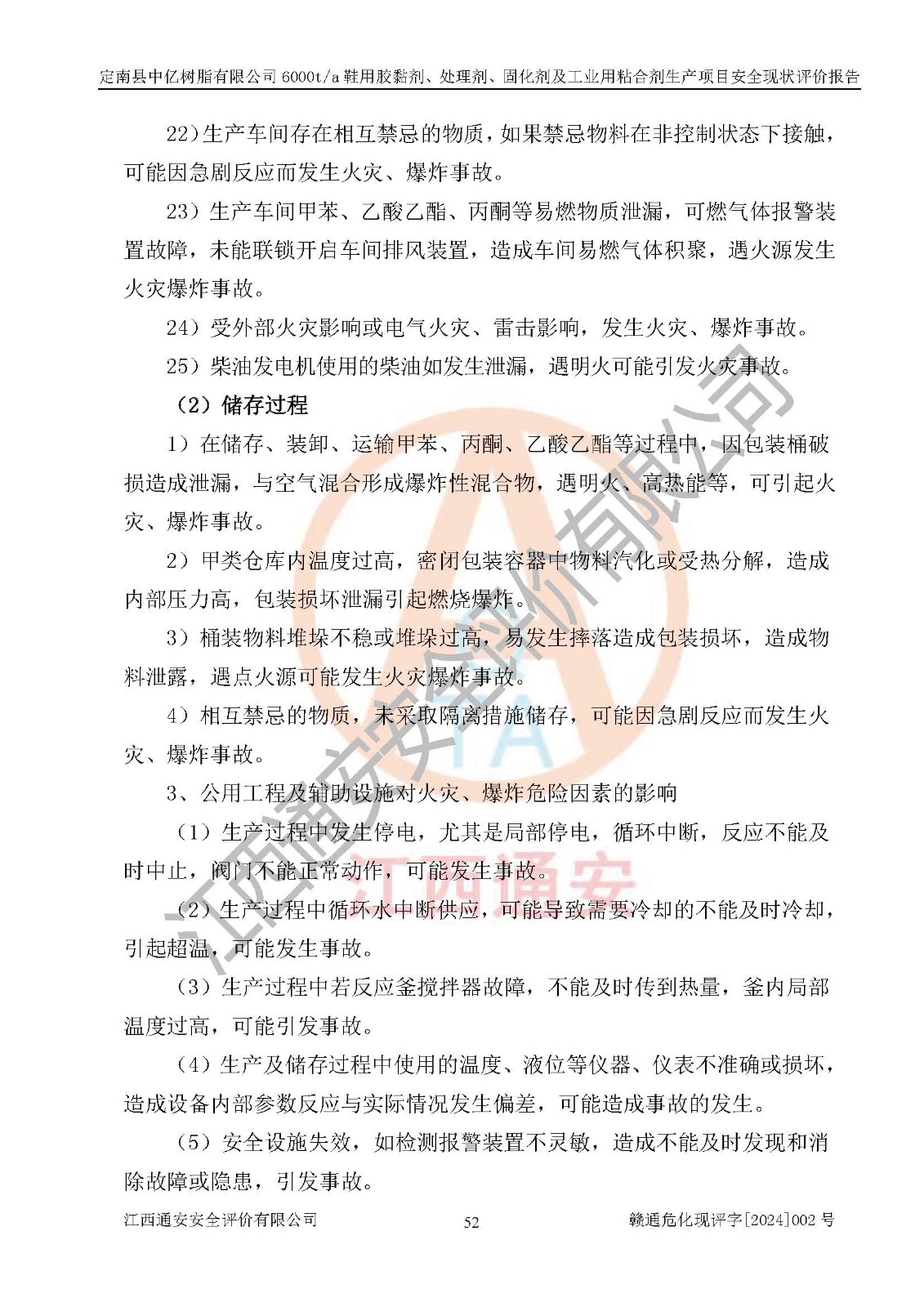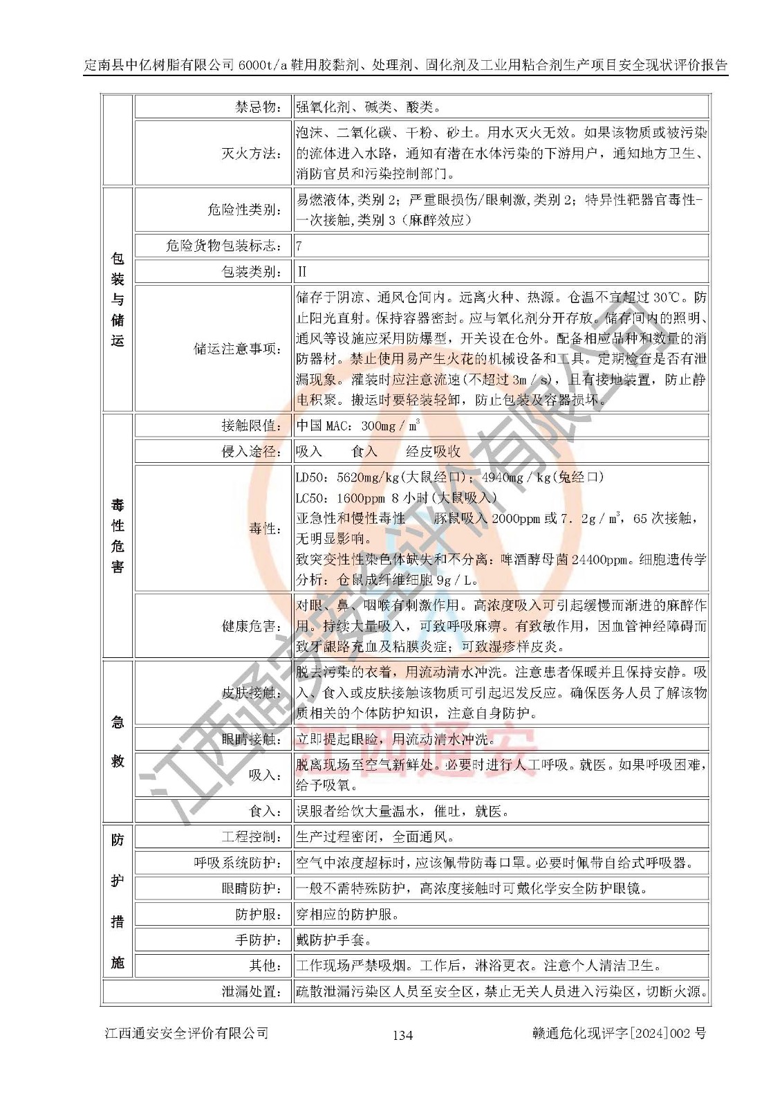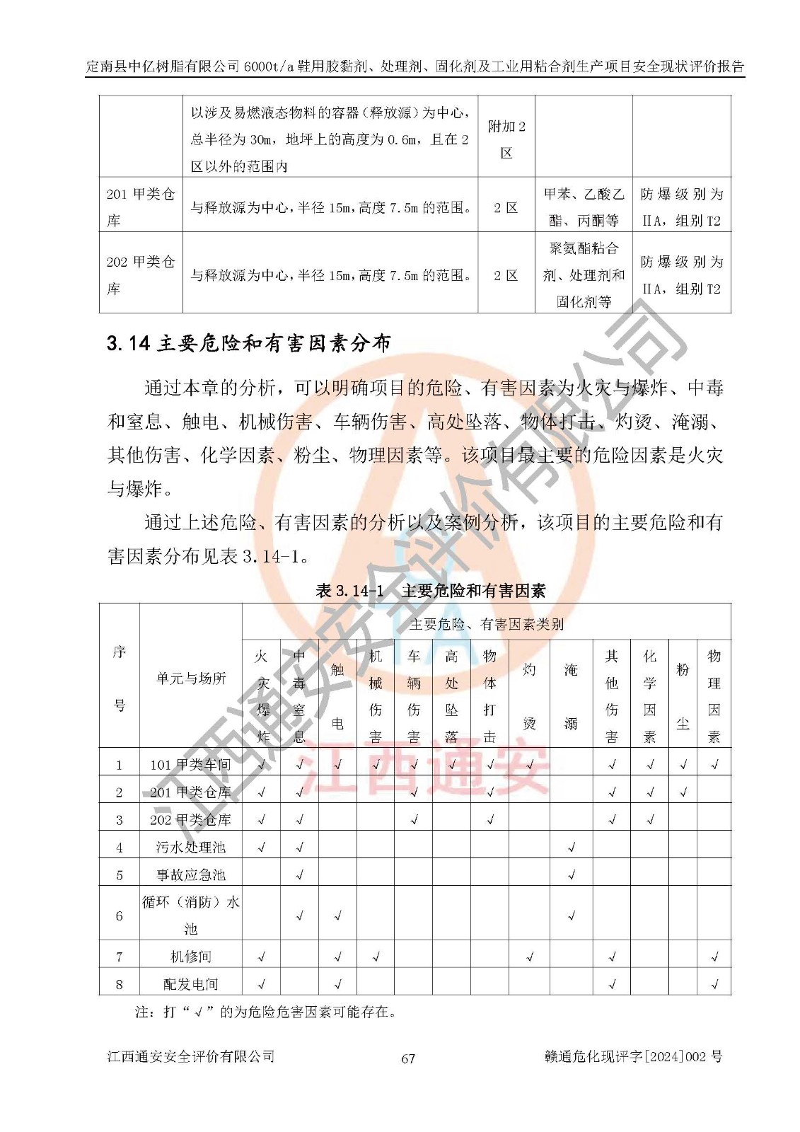 评价结论 | 定南县中亿树脂有限公司6000t/a鞋用胶黏剂、处理剂、固化剂及工业用粘合剂生产项目现场情况与设计图纸一致,监测监控系统设计符合要求、运行正常,有关从业人员资质符合《江西省危险化学品安全专项整治三年行动实施方案》要求,安全设施及安全管理符合法律、法规、标准的要求,安全风险是受控制的,其风险程度是可以接受的,安全设施符合安全生产条件,能够满足安全生产的要求。 | ||||||