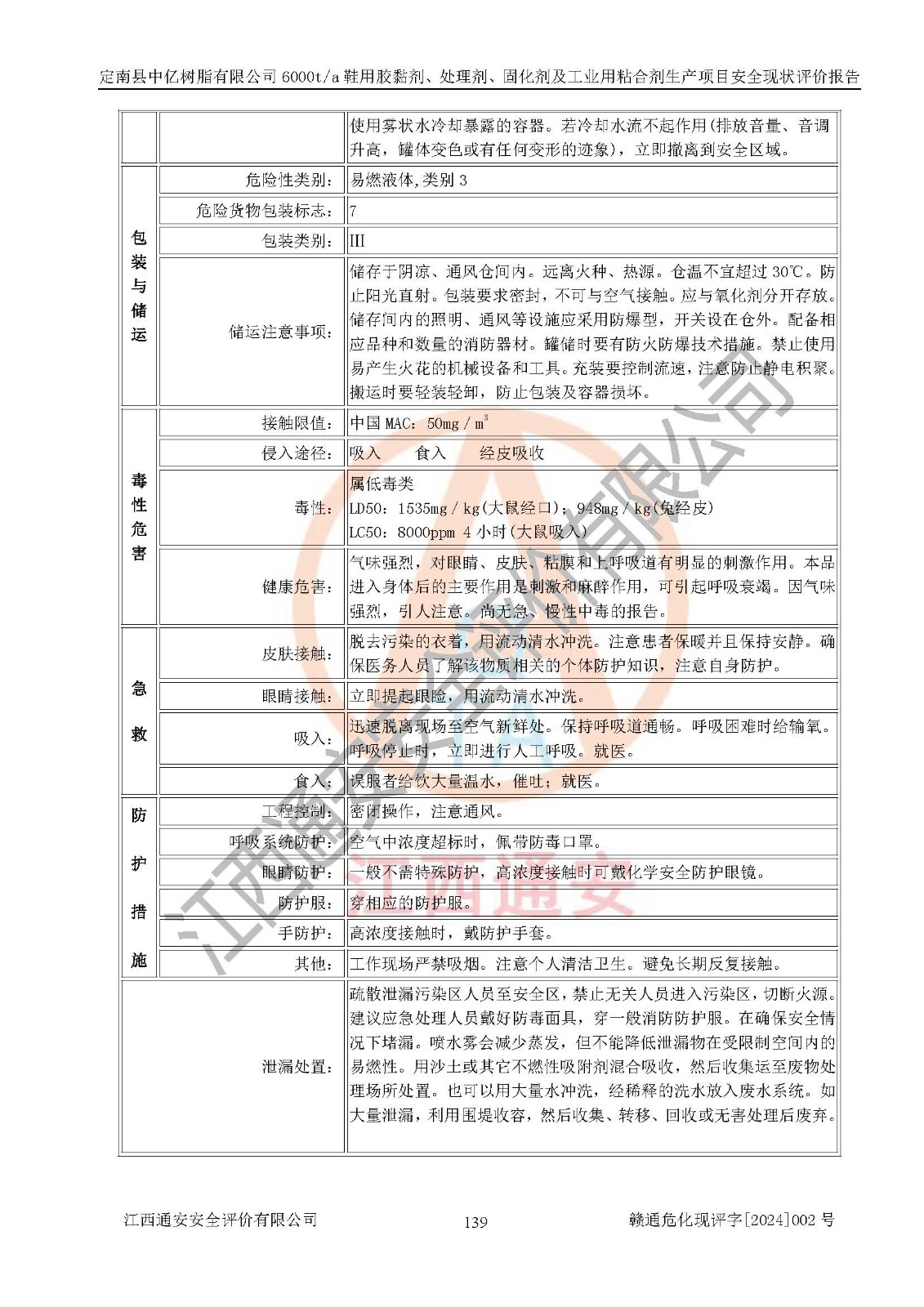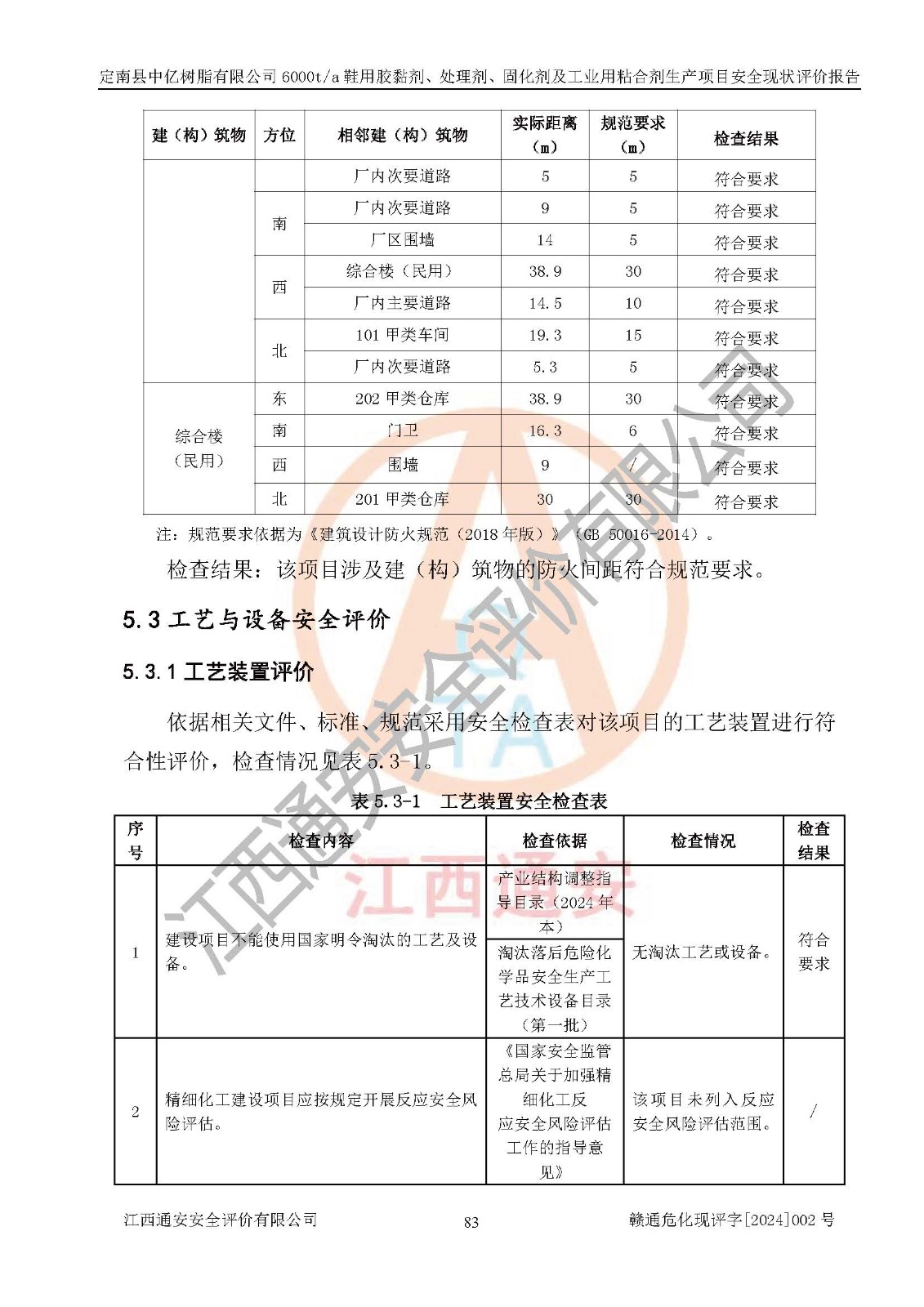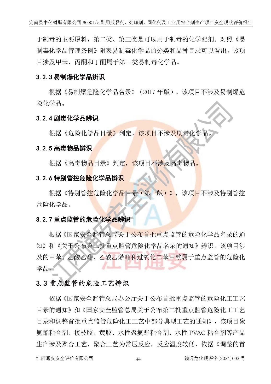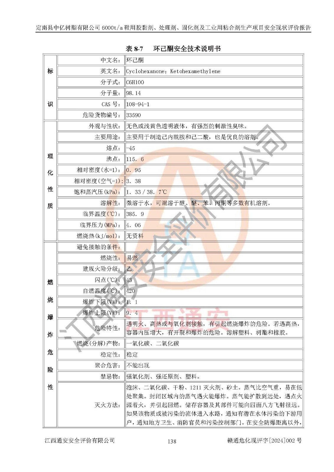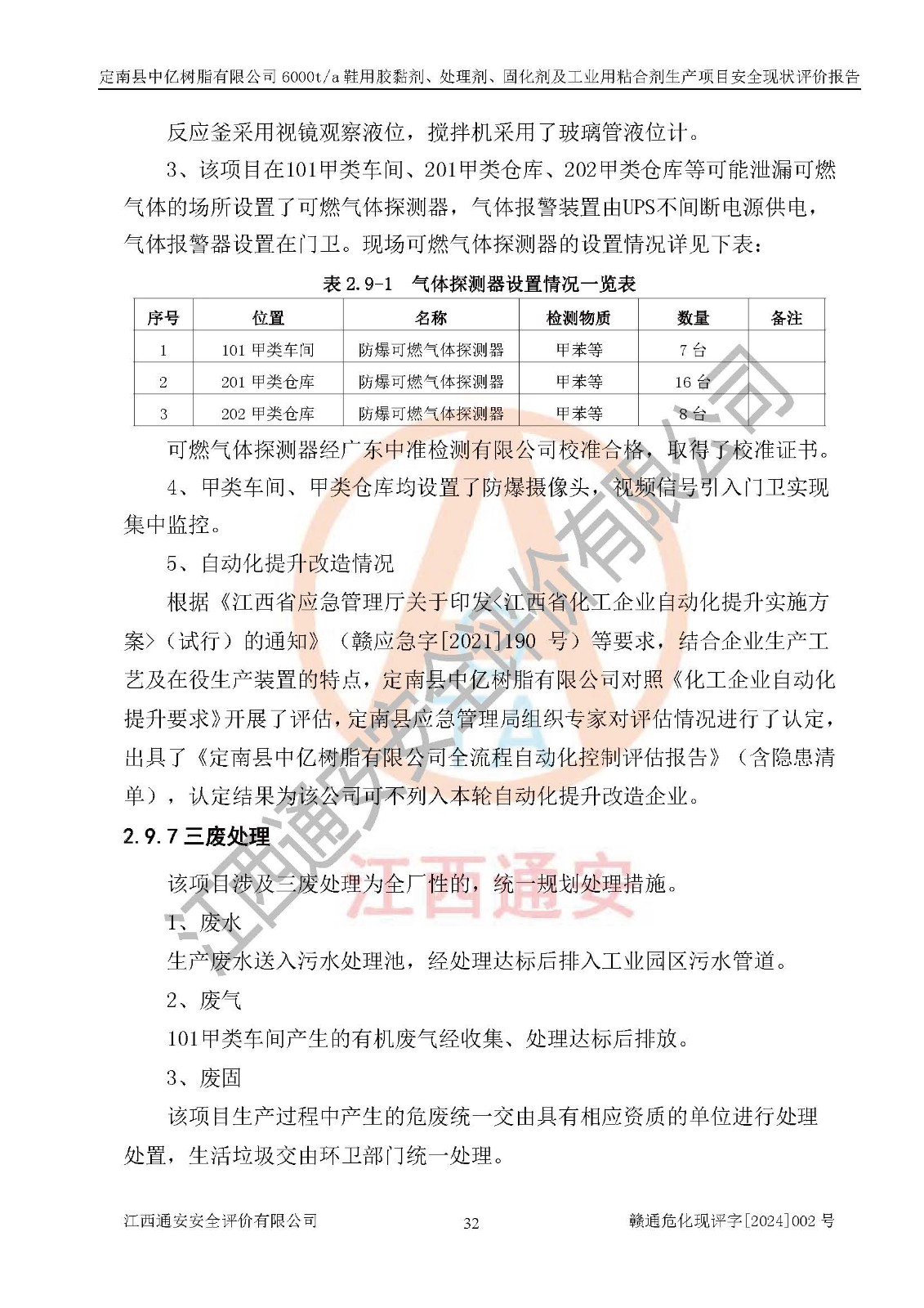 评价结论 | 定南县中亿树脂有限公司6000t/a鞋用胶黏剂、处理剂、固化剂及工业用粘合剂生产项目现场情况与设计图纸一致,监测监控系统设计符合要求、运行正常,有关从业人员资质符合《江西省危险化学品安全专项整治三年行动实施方案》要求,安全设施及安全管理符合法律、法规、标准的要求,安全风险是受控制的,其风险程度是可以接受的,安全设施符合安全生产条件,能够满足安全生产的要求。 | ||||||