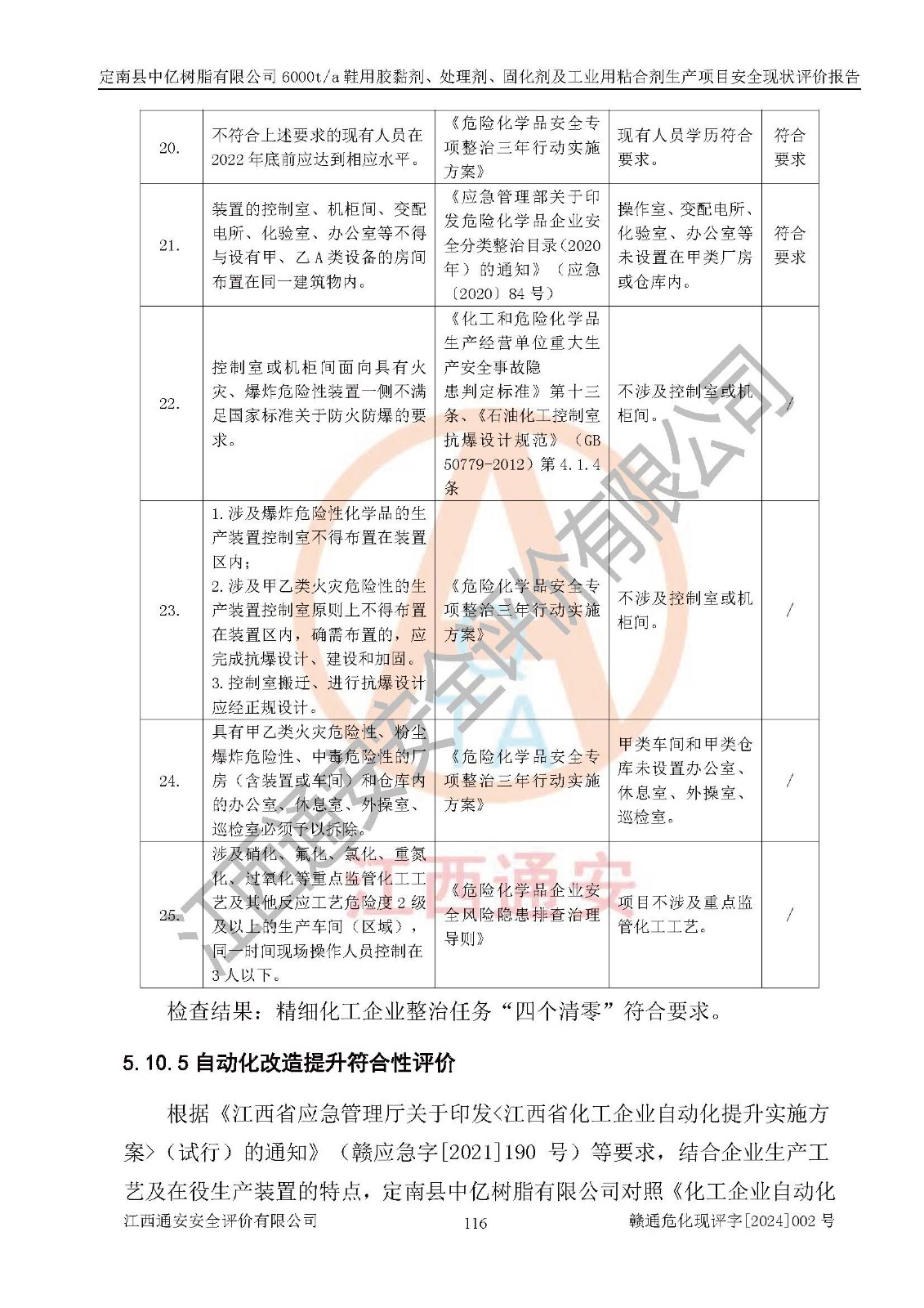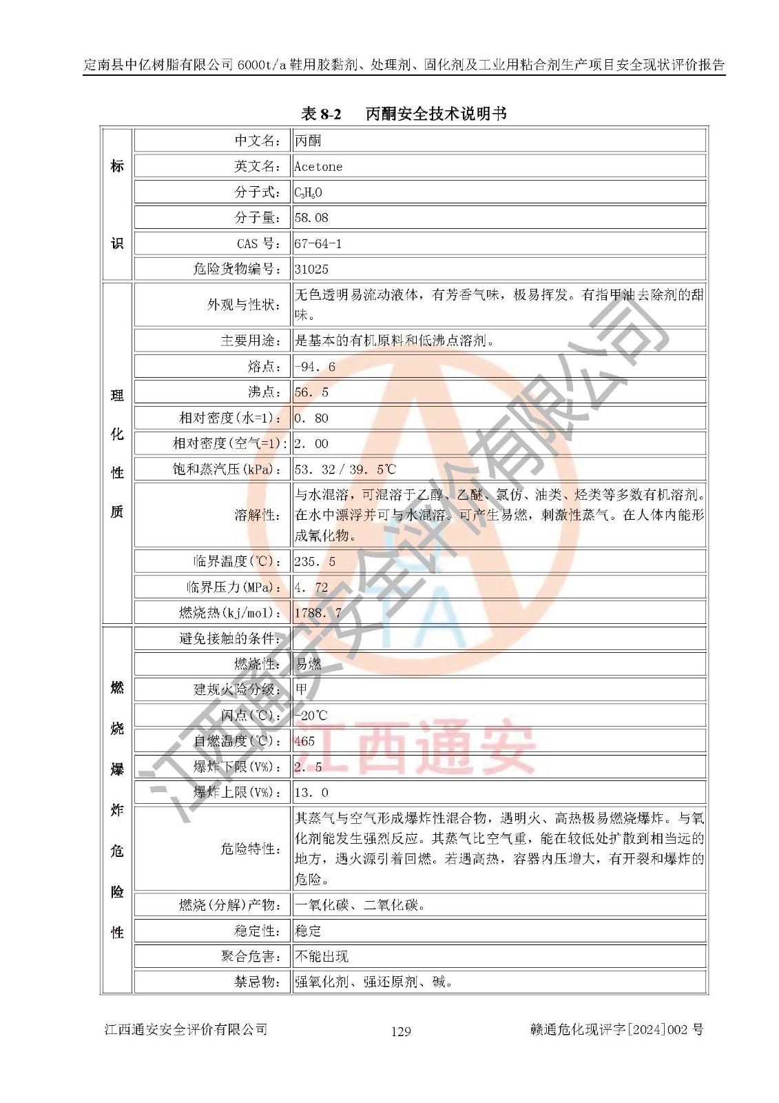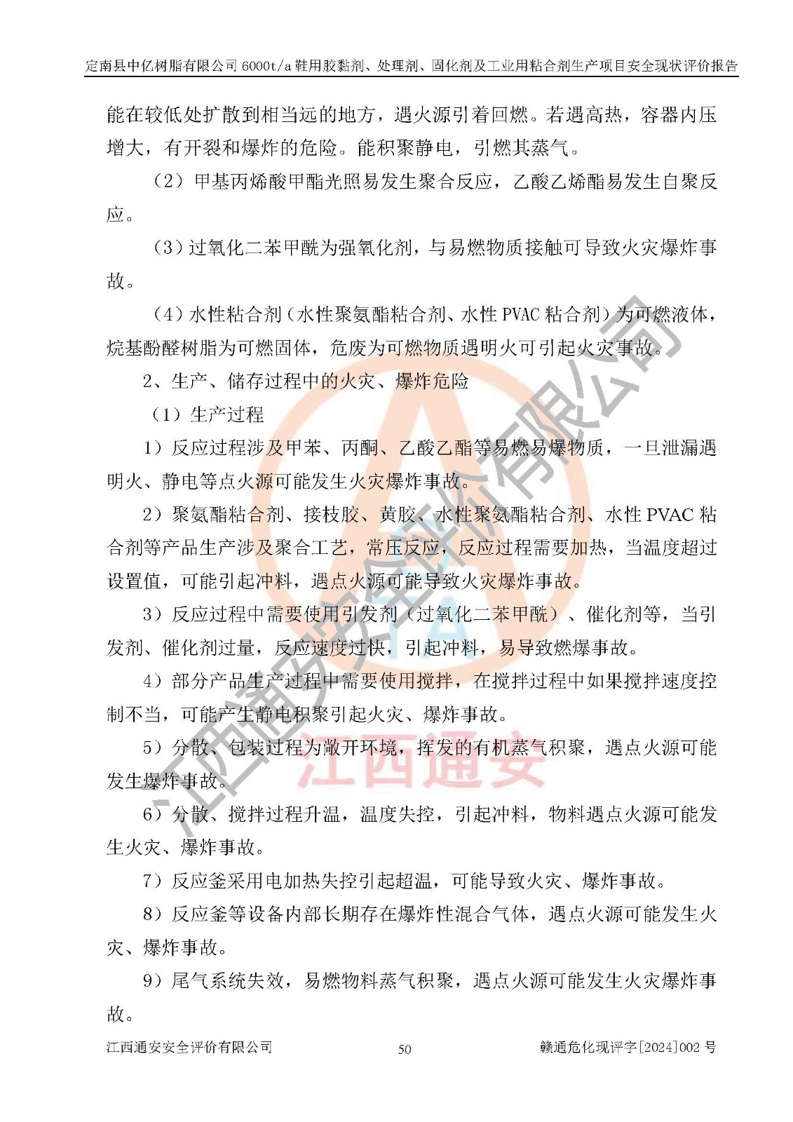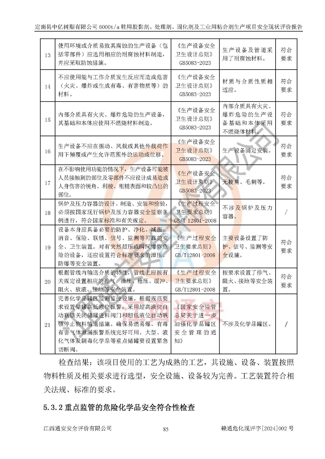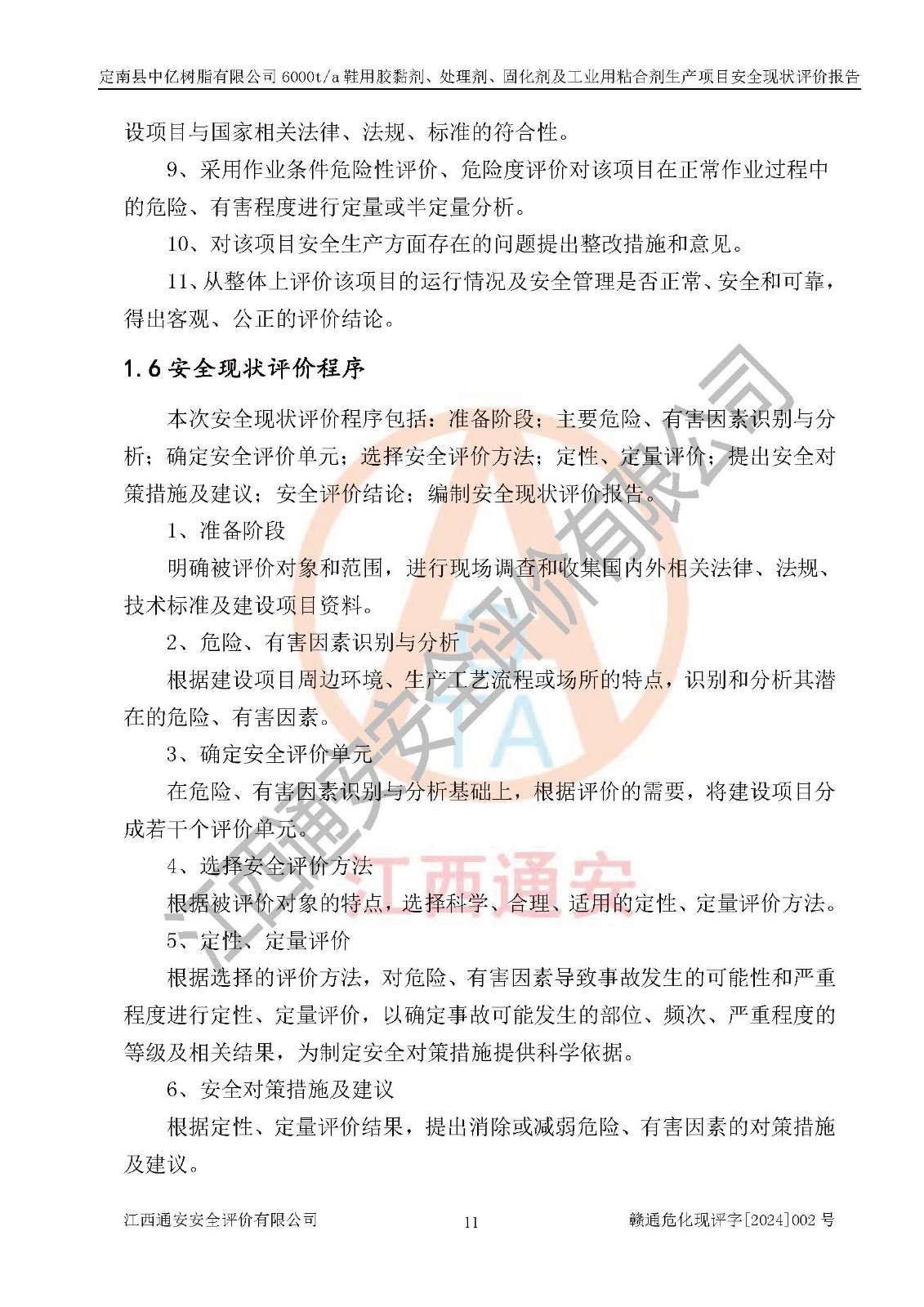 评价结论 | 定南县中亿树脂有限公司6000t/a鞋用胶黏剂、处理剂、固化剂及工业用粘合剂生产项目现场情况与设计图纸一致,监测监控系统设计符合要求、运行正常,有关从业人员资质符合《江西省危险化学品安全专项整治三年行动实施方案》要求,安全设施及安全管理符合法律、法规、标准的要求,安全风险是受控制的,其风险程度是可以接受的,安全设施符合安全生产条件,能够满足安全生产的要求。 | ||||||