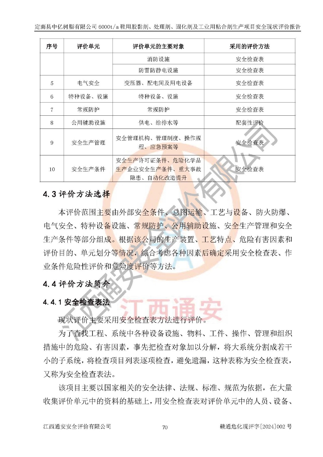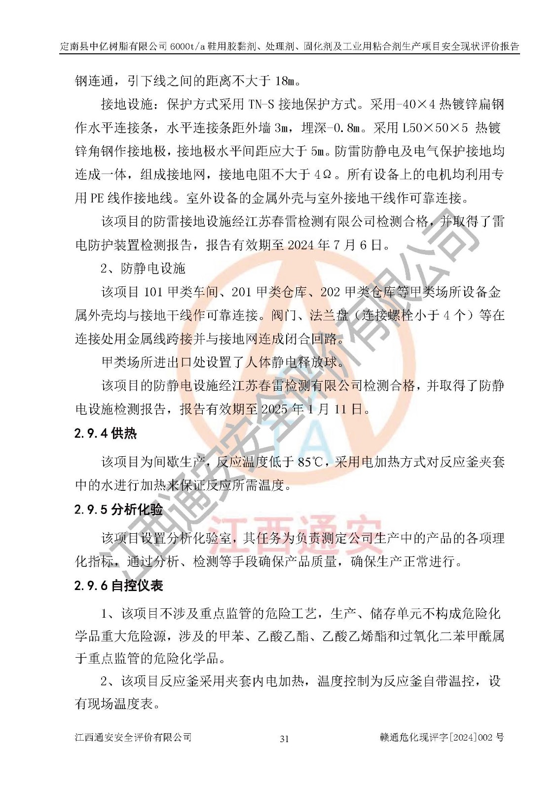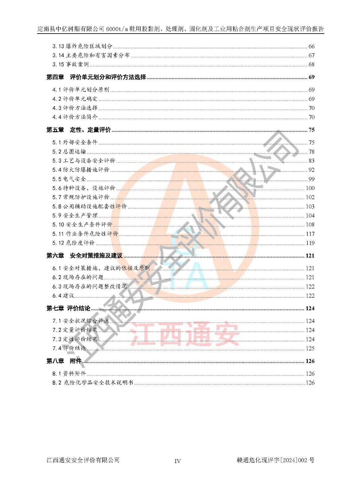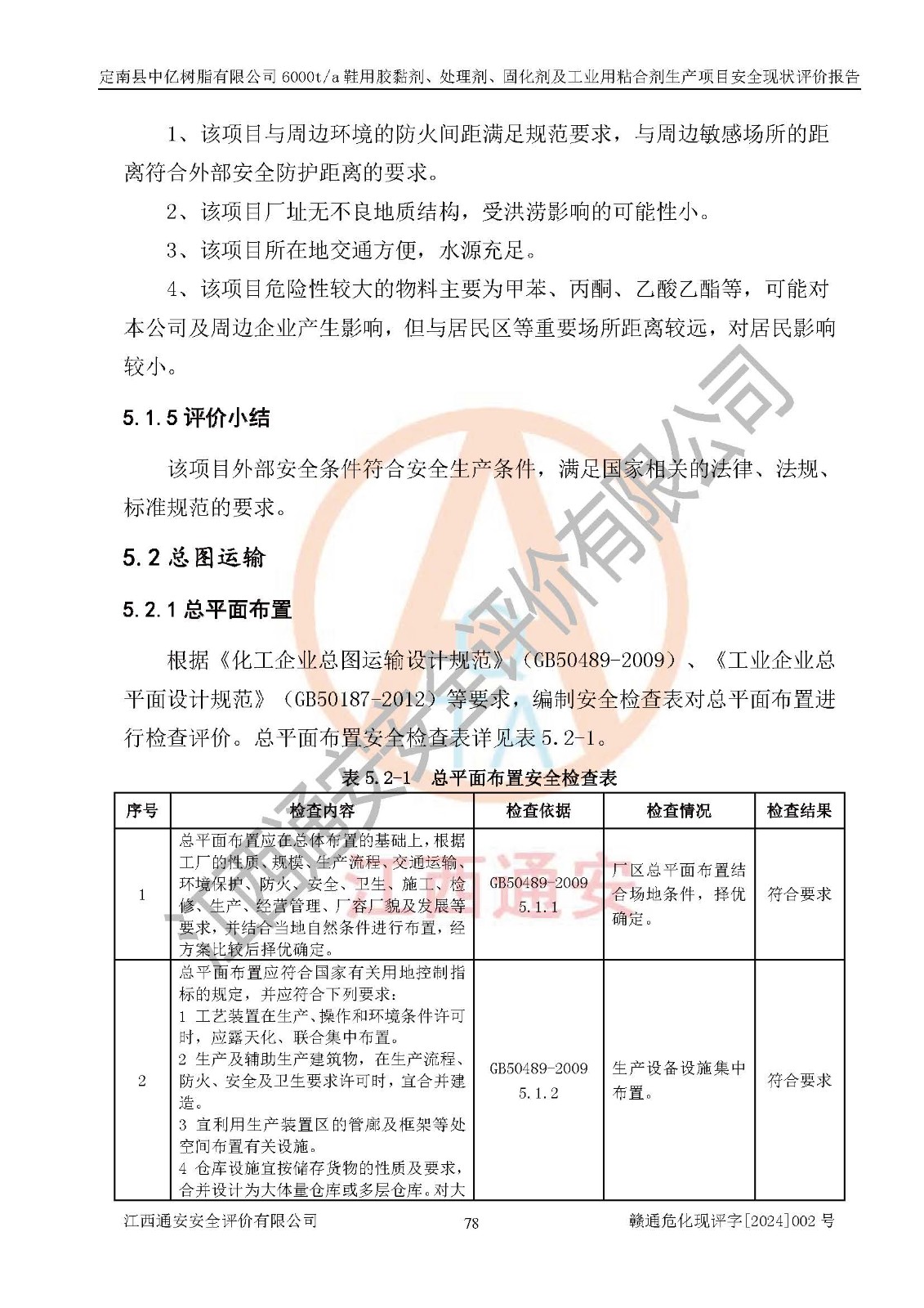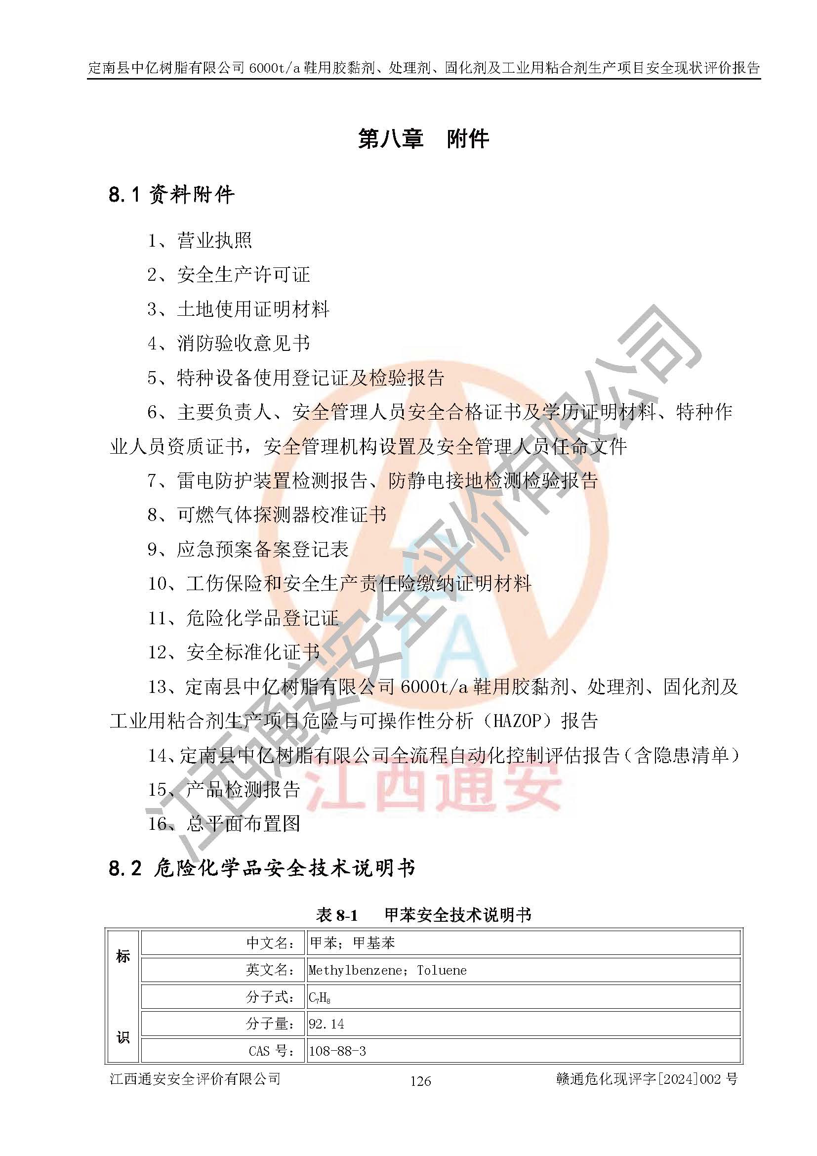 评价结论 | 定南县中亿树脂有限公司6000t/a鞋用胶黏剂、处理剂、固化剂及工业用粘合剂生产项目现场情况与设计图纸一致,监测监控系统设计符合要求、运行正常,有关从业人员资质符合《江西省危险化学品安全专项整治三年行动实施方案》要求,安全设施及安全管理符合法律、法规、标准的要求,安全风险是受控制的,其风险程度是可以接受的,安全设施符合安全生产条件,能够满足安全生产的要求。 | ||||||
