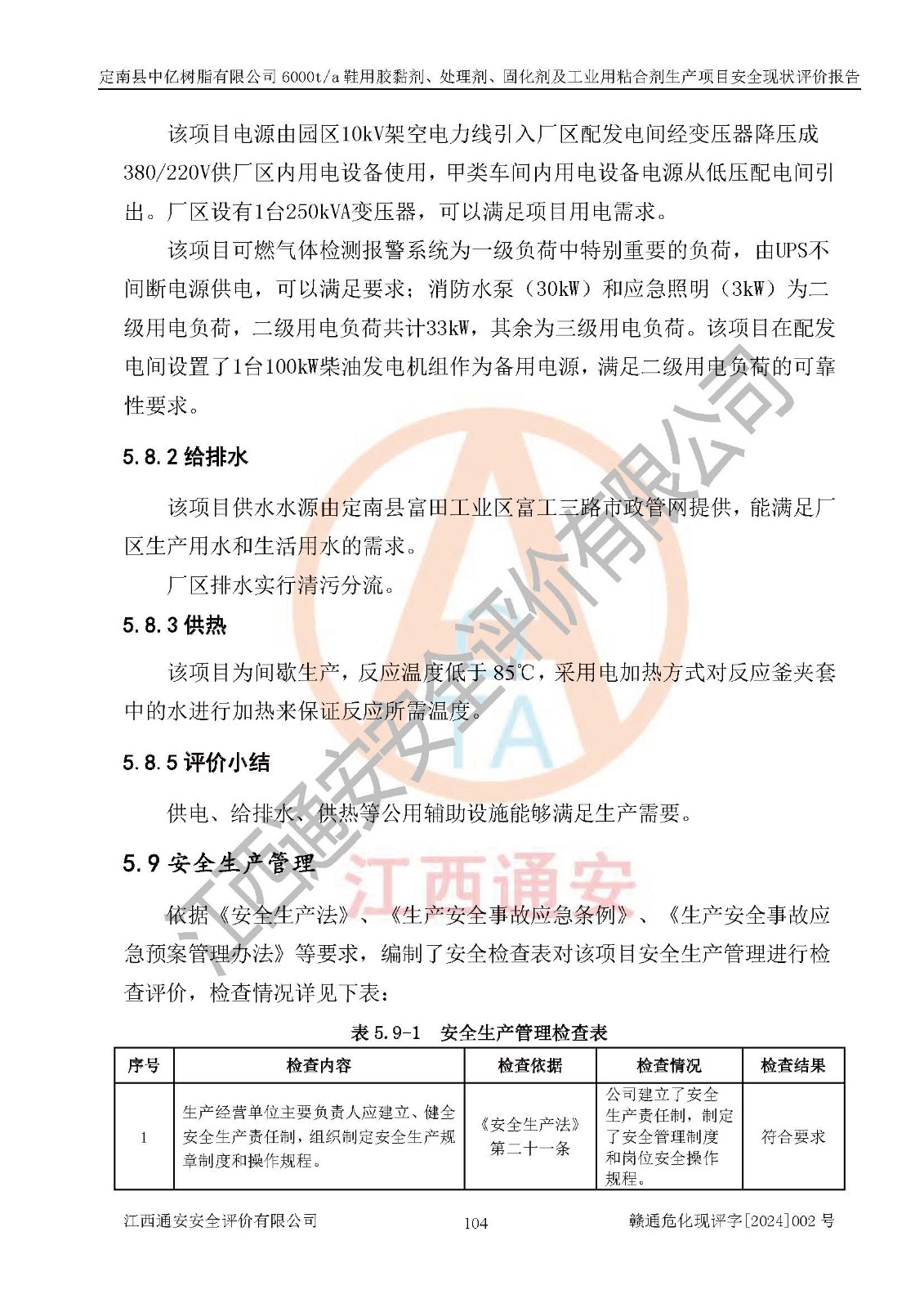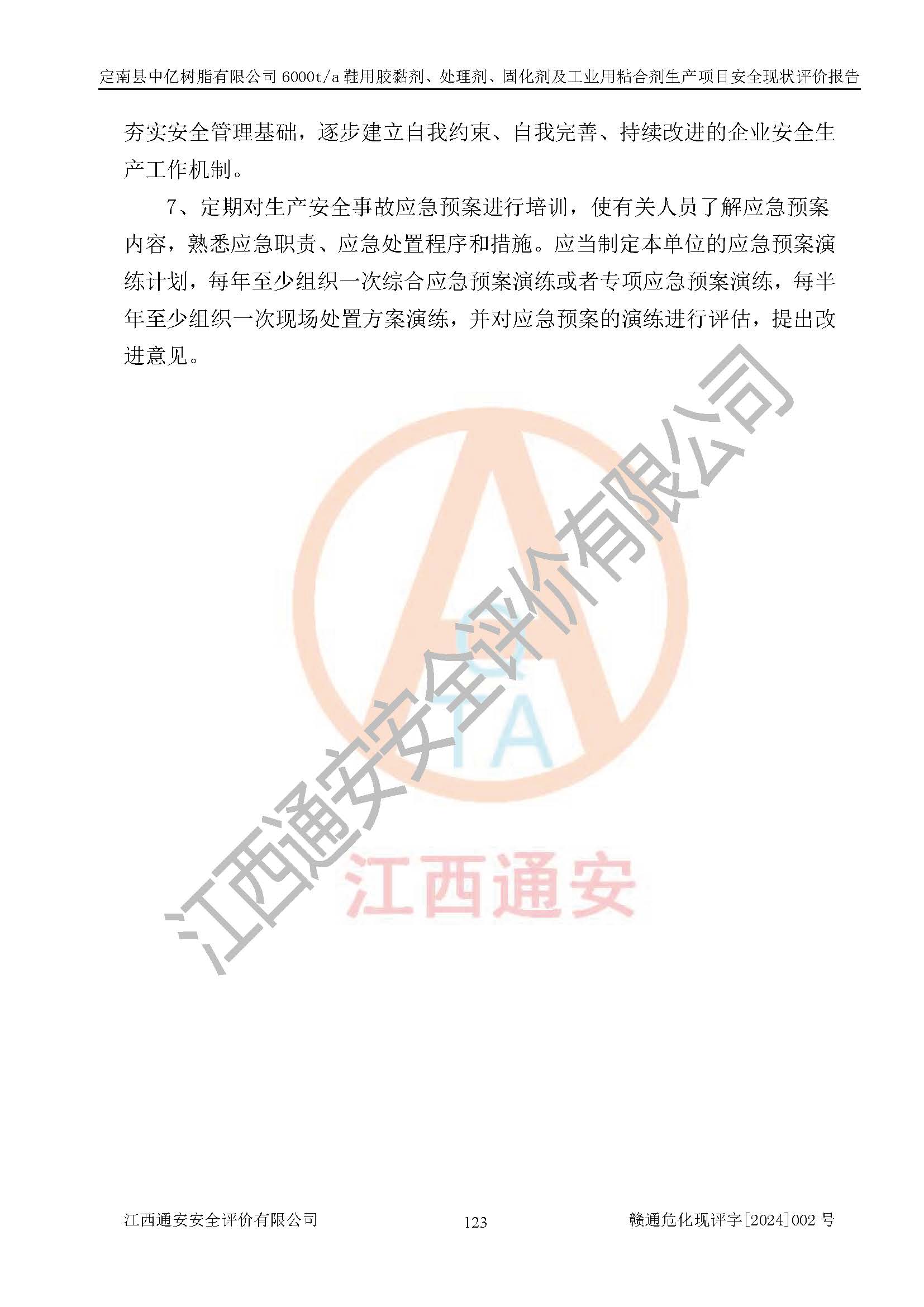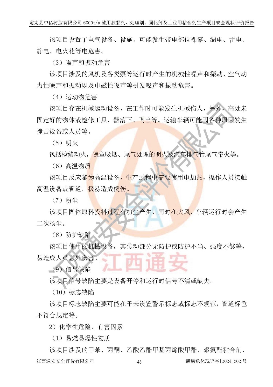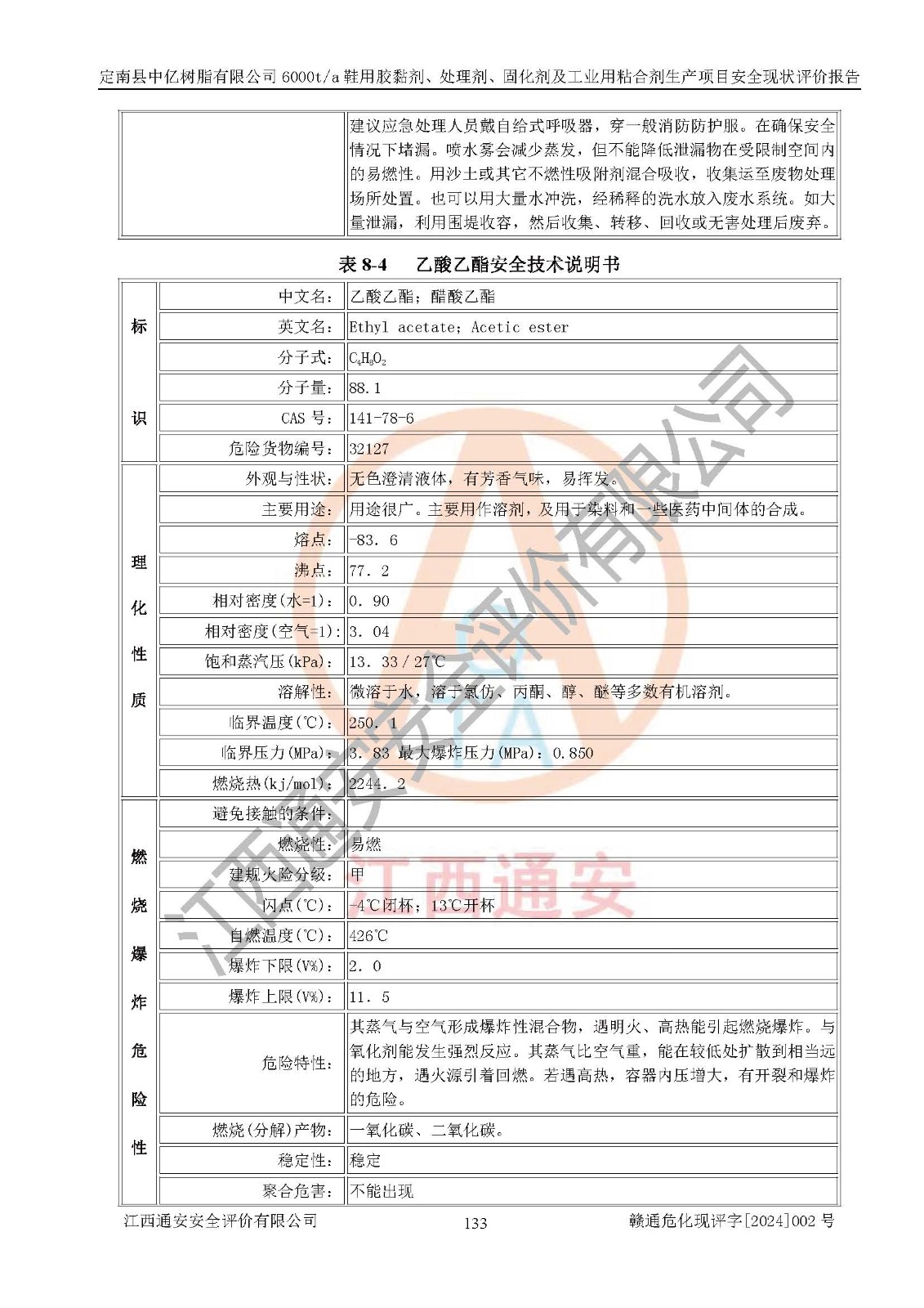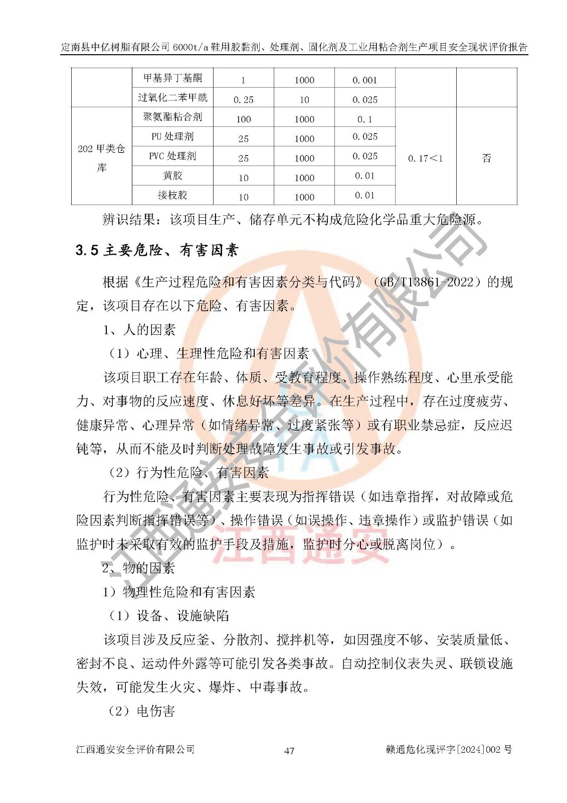 评价结论 | 定南县中亿树脂有限公司6000t/a鞋用胶黏剂、处理剂、固化剂及工业用粘合剂生产项目现场情况与设计图纸一致,监测监控系统设计符合要求、运行正常,有关从业人员资质符合《江西省危险化学品安全专项整治三年行动实施方案》要求,安全设施及安全管理符合法律、法规、标准的要求,安全风险是受控制的,其风险程度是可以接受的,安全设施符合安全生产条件,能够满足安全生产的要求。 | ||||||
