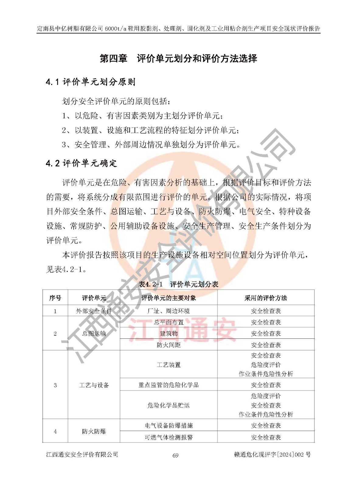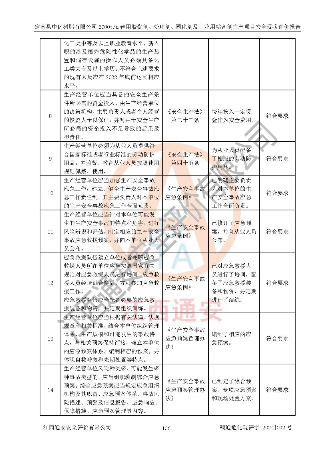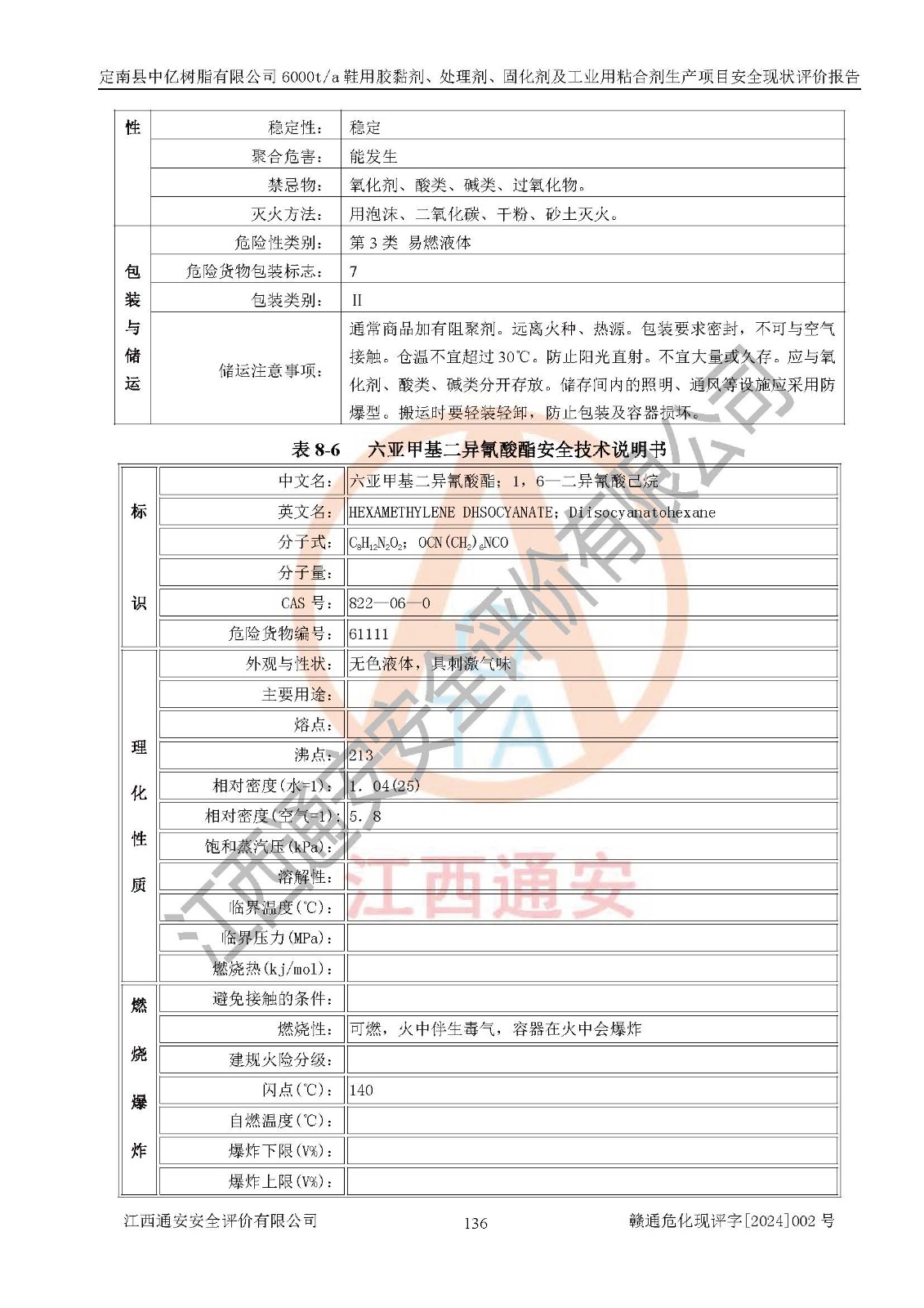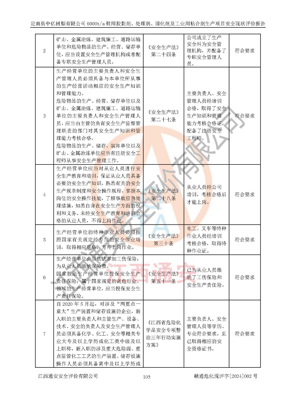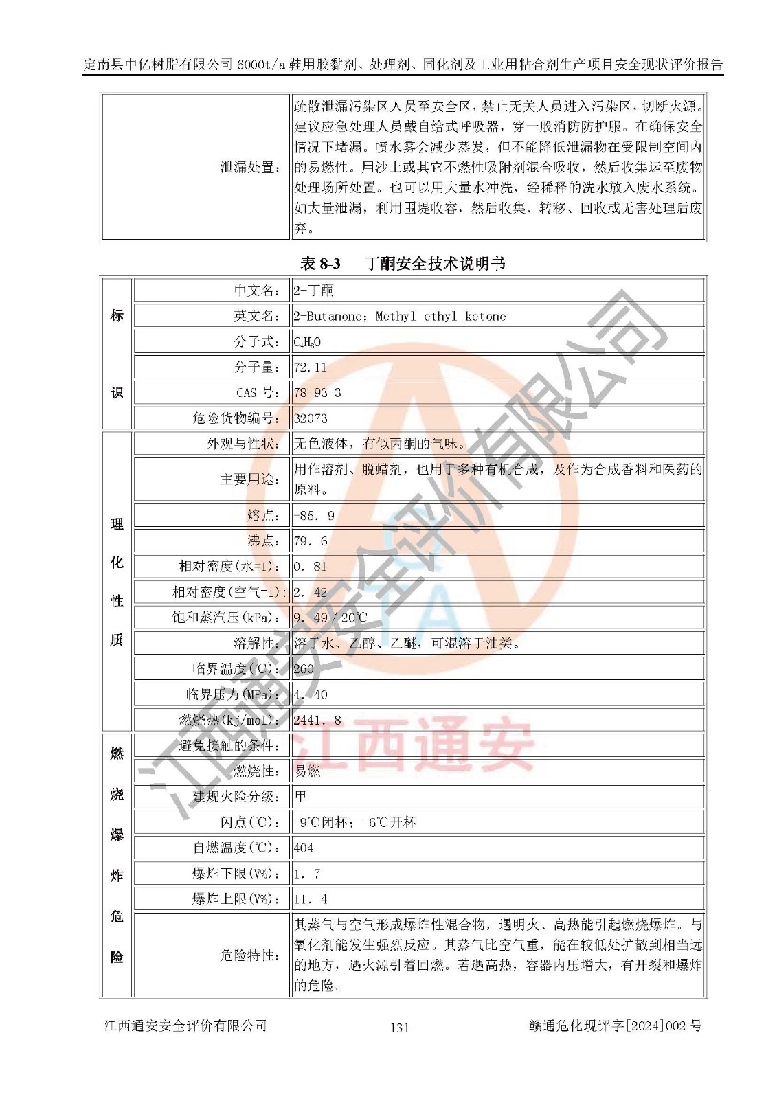 评价结论 | 定南县中亿树脂有限公司6000t/a鞋用胶黏剂、处理剂、固化剂及工业用粘合剂生产项目现场情况与设计图纸一致,监测监控系统设计符合要求、运行正常,有关从业人员资质符合《江西省危险化学品安全专项整治三年行动实施方案》要求,安全设施及安全管理符合法律、法规、标准的要求,安全风险是受控制的,其风险程度是可以接受的,安全设施符合安全生产条件,能够满足安全生产的要求。 | ||||||
