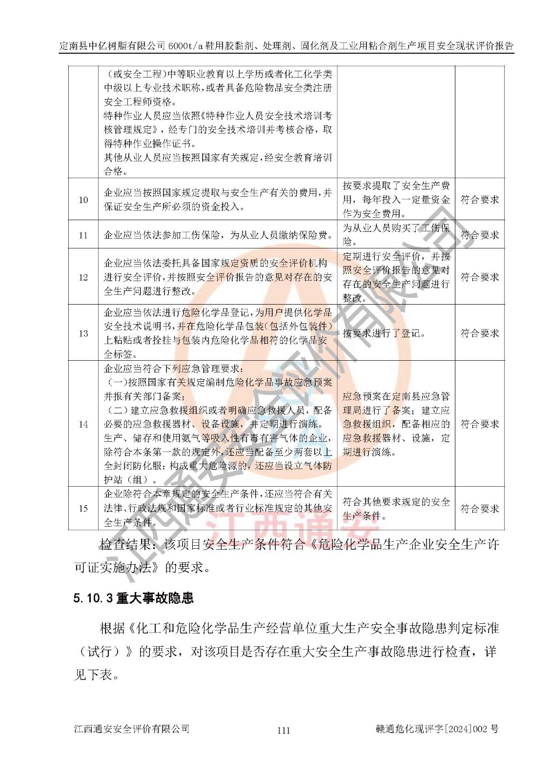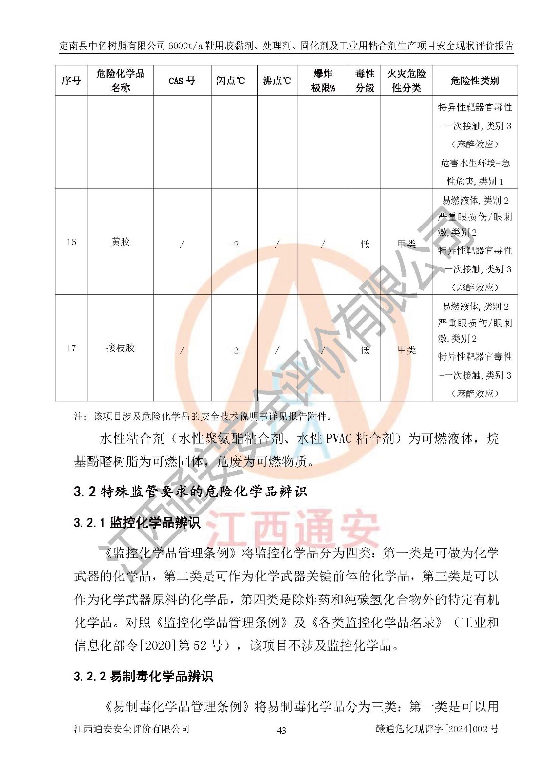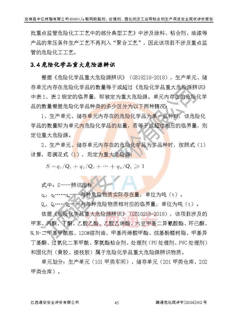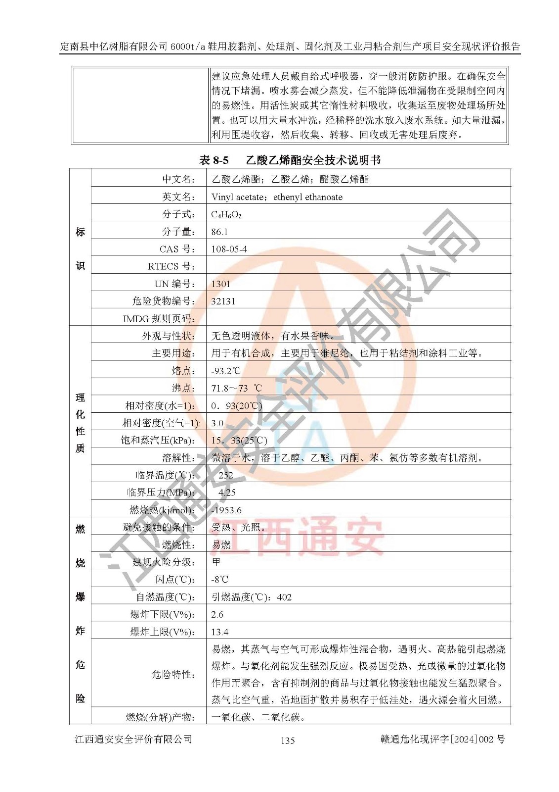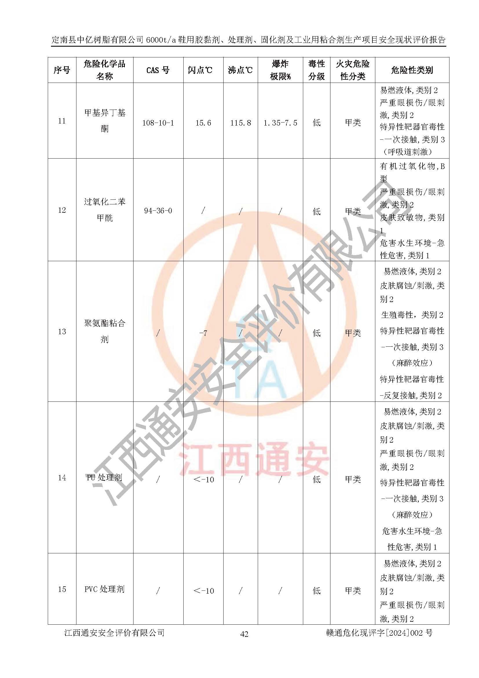评价结论 | 定南县中亿树脂有限公司6000t/a鞋用胶黏剂、处理剂、固化剂及工业用粘合剂生产项目现场情况与设计图纸一致,监测监控系统设计符合要求、运行正常,有关从业人员资质符合《江西省危险化学品安全专项整治三年行动实施方案》要求,安全设施及安全管理符合法律、法规、标准的要求,安全风险是受控制的,其风险程度是可以接受的,安全设施符合安全生产条件,能够满足安全生产的要求。 | ||||||