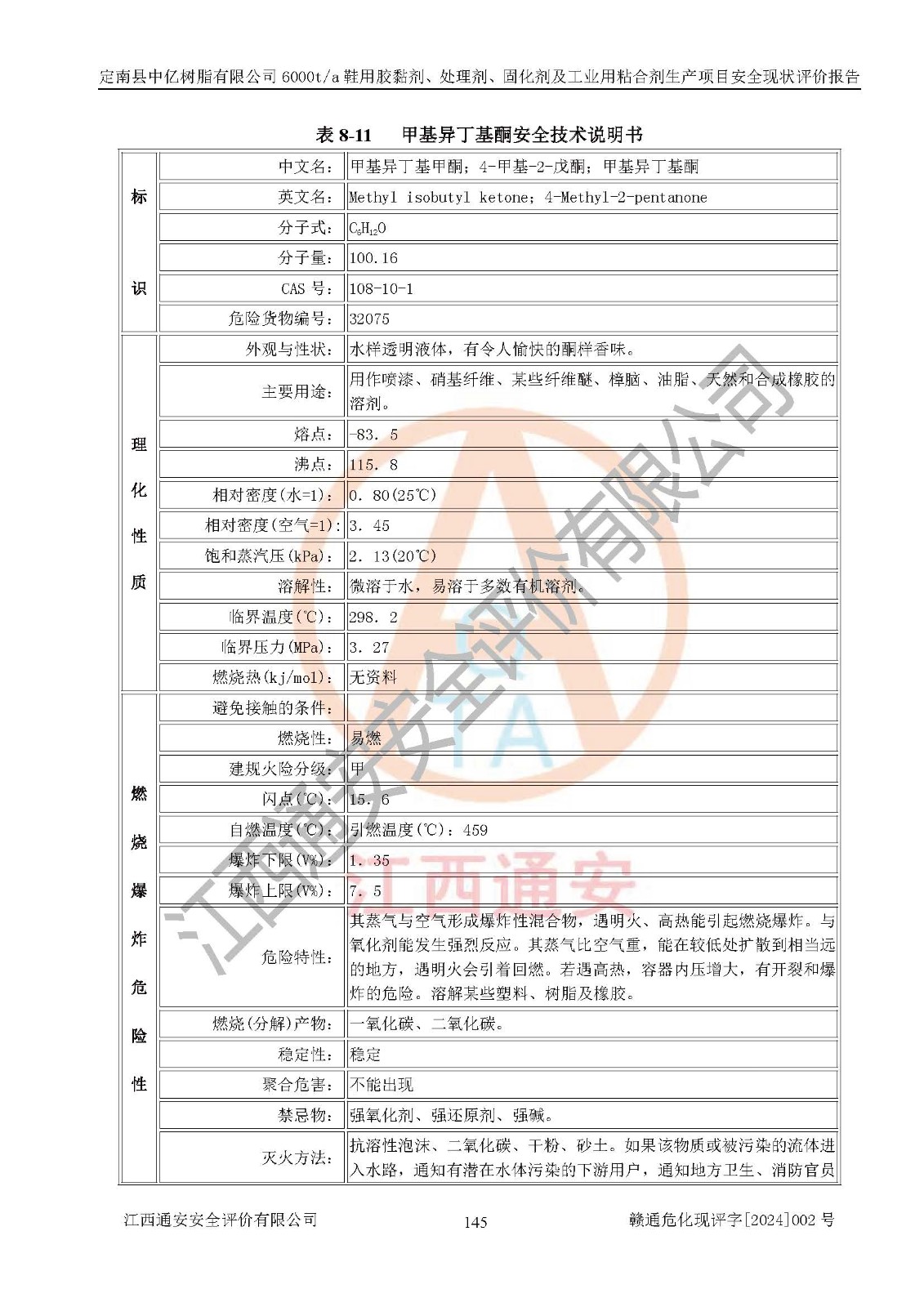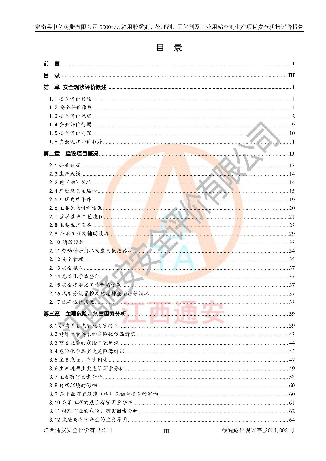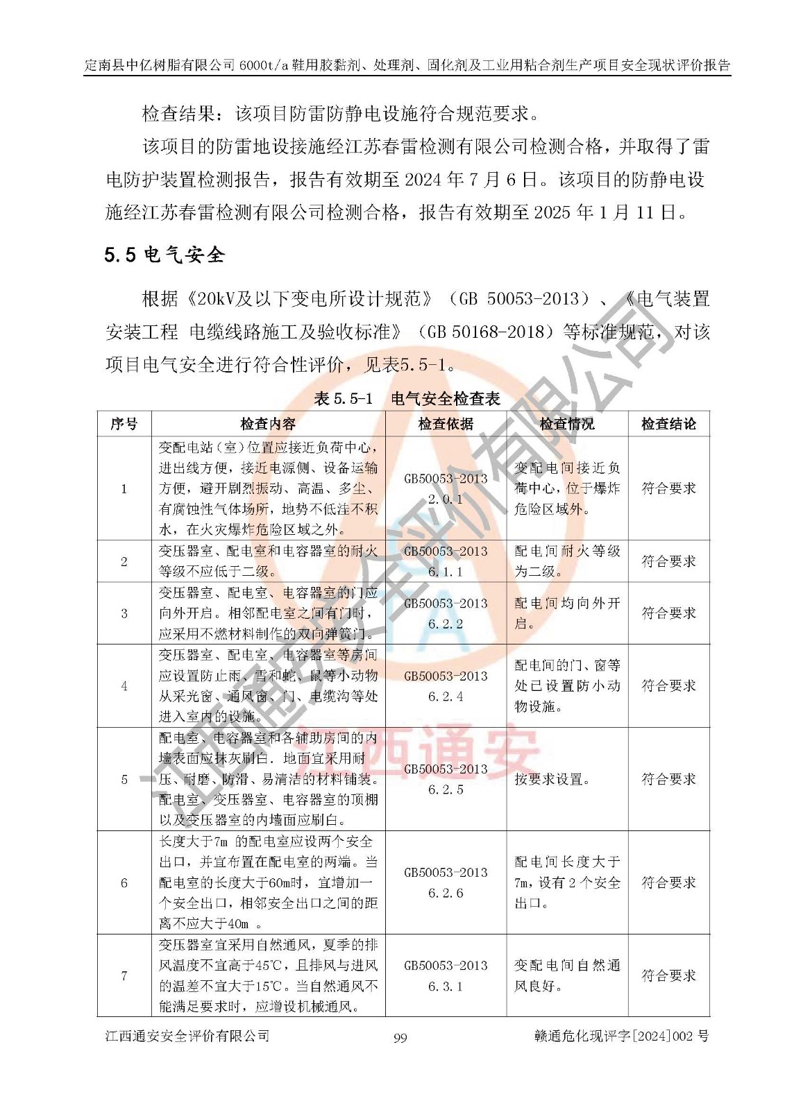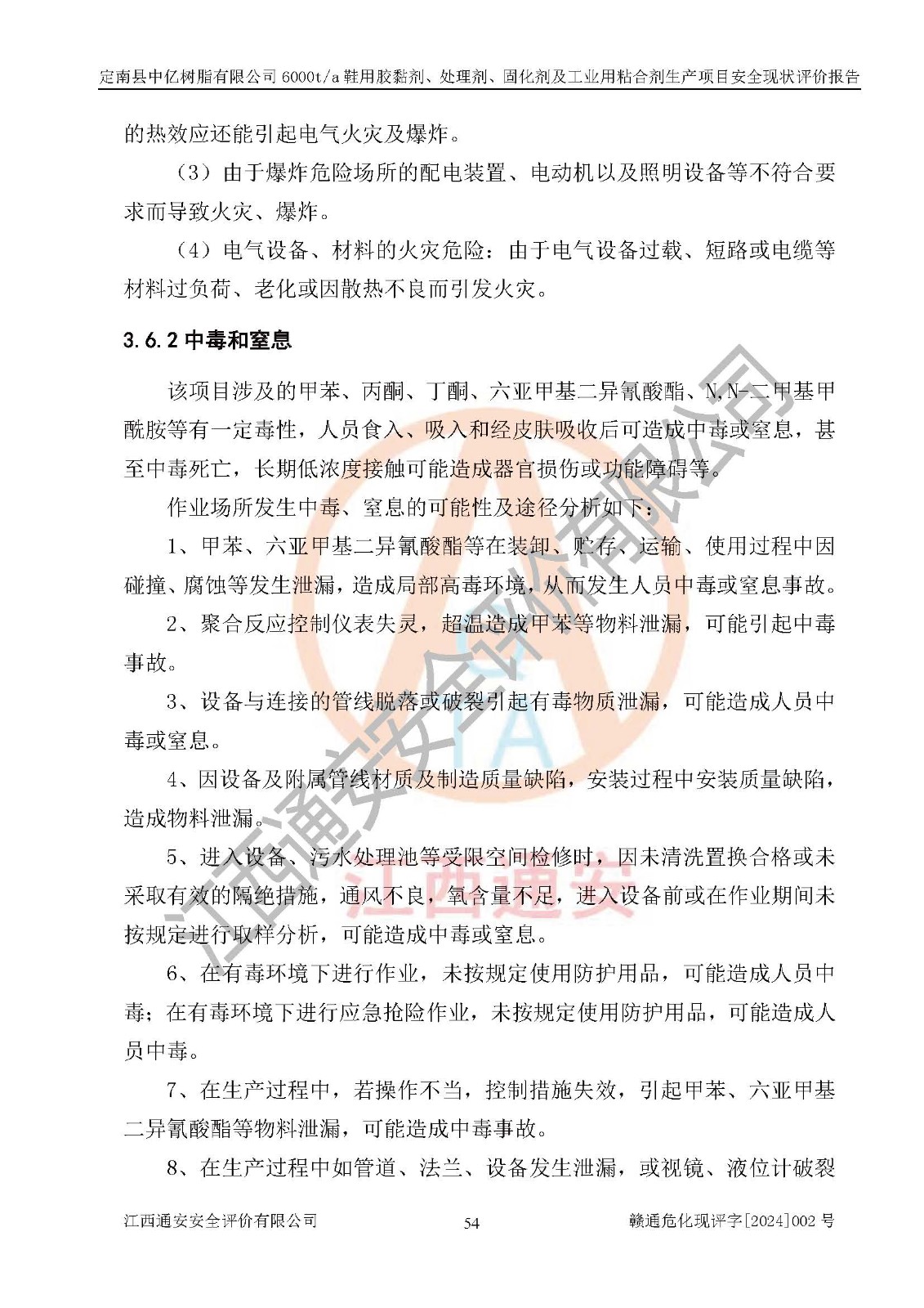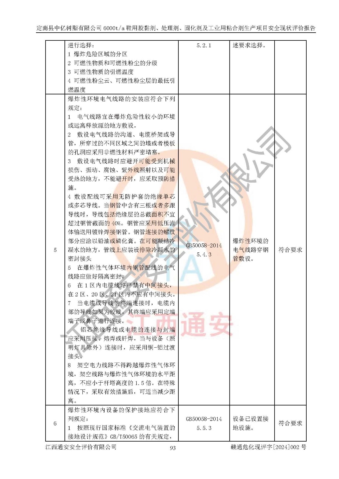 评价结论 | 定南县中亿树脂有限公司6000t/a鞋用胶黏剂、处理剂、固化剂及工业用粘合剂生产项目现场情况与设计图纸一致,监测监控系统设计符合要求、运行正常,有关从业人员资质符合《江西省危险化学品安全专项整治三年行动实施方案》要求,安全设施及安全管理符合法律、法规、标准的要求,安全风险是受控制的,其风险程度是可以接受的,安全设施符合安全生产条件,能够满足安全生产的要求。 | ||||||