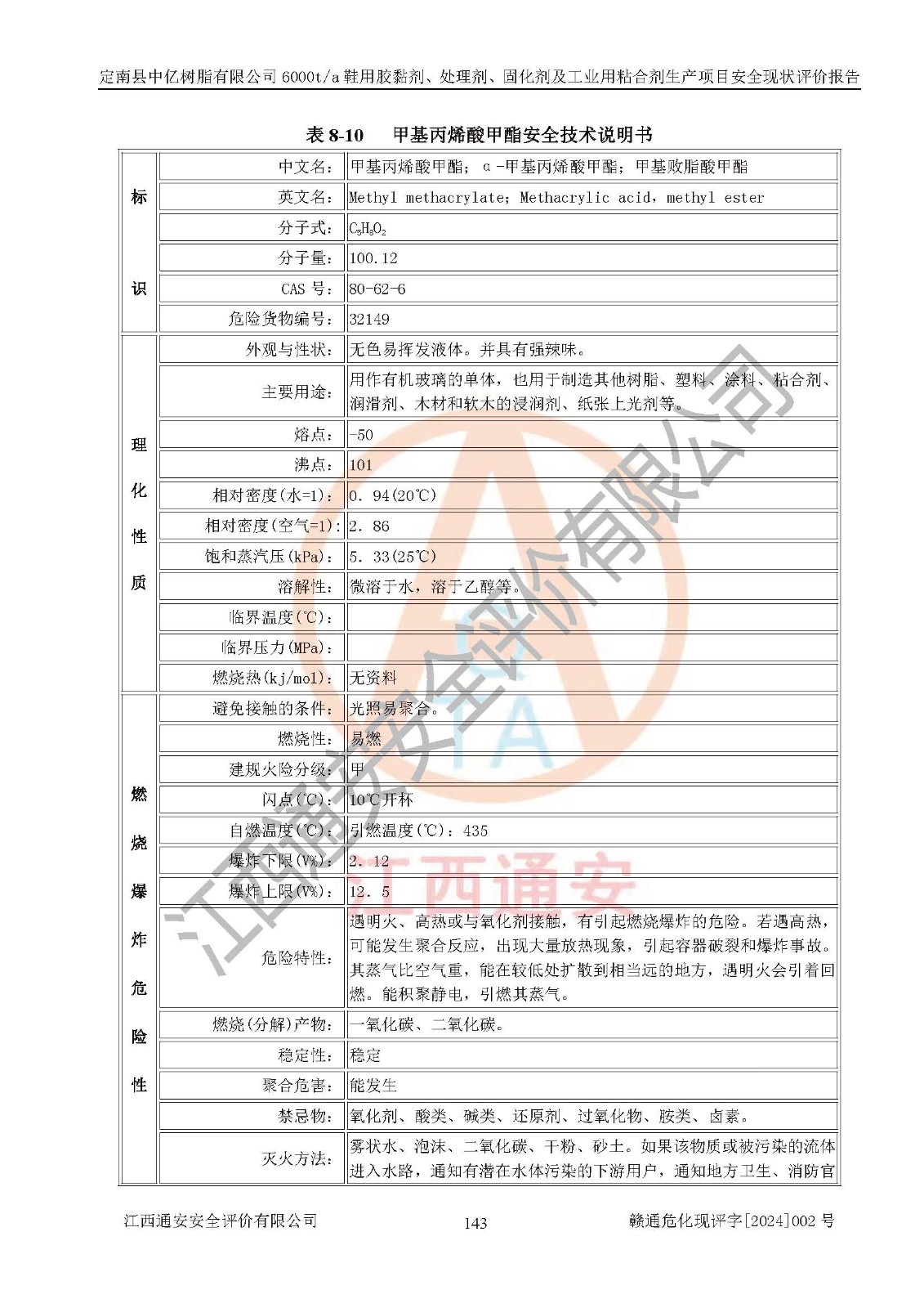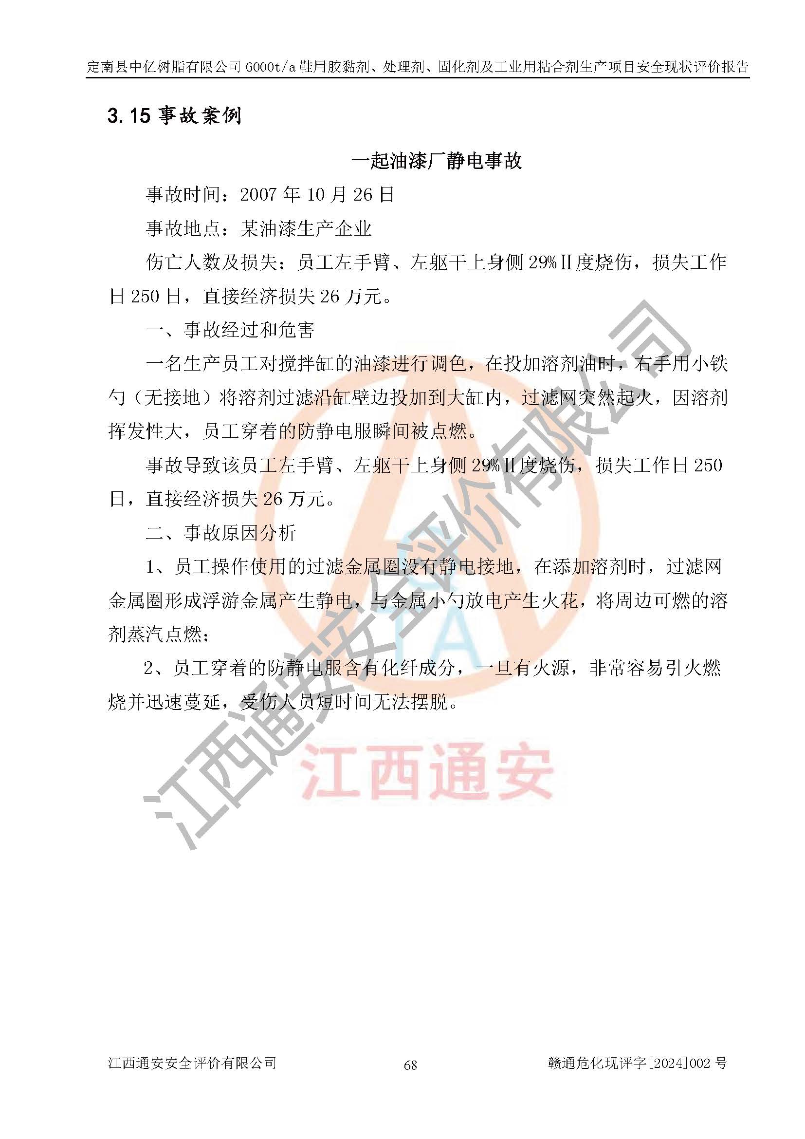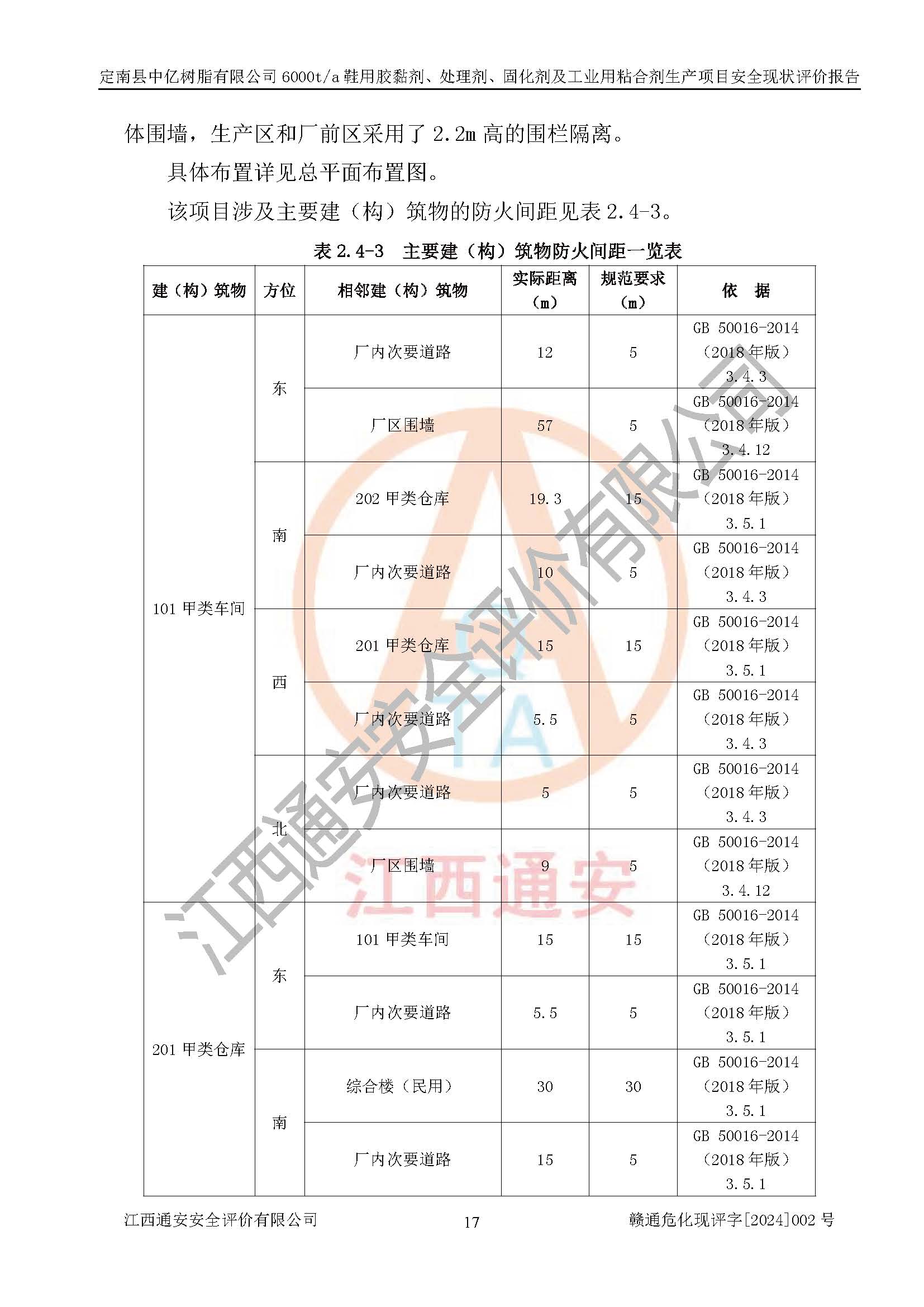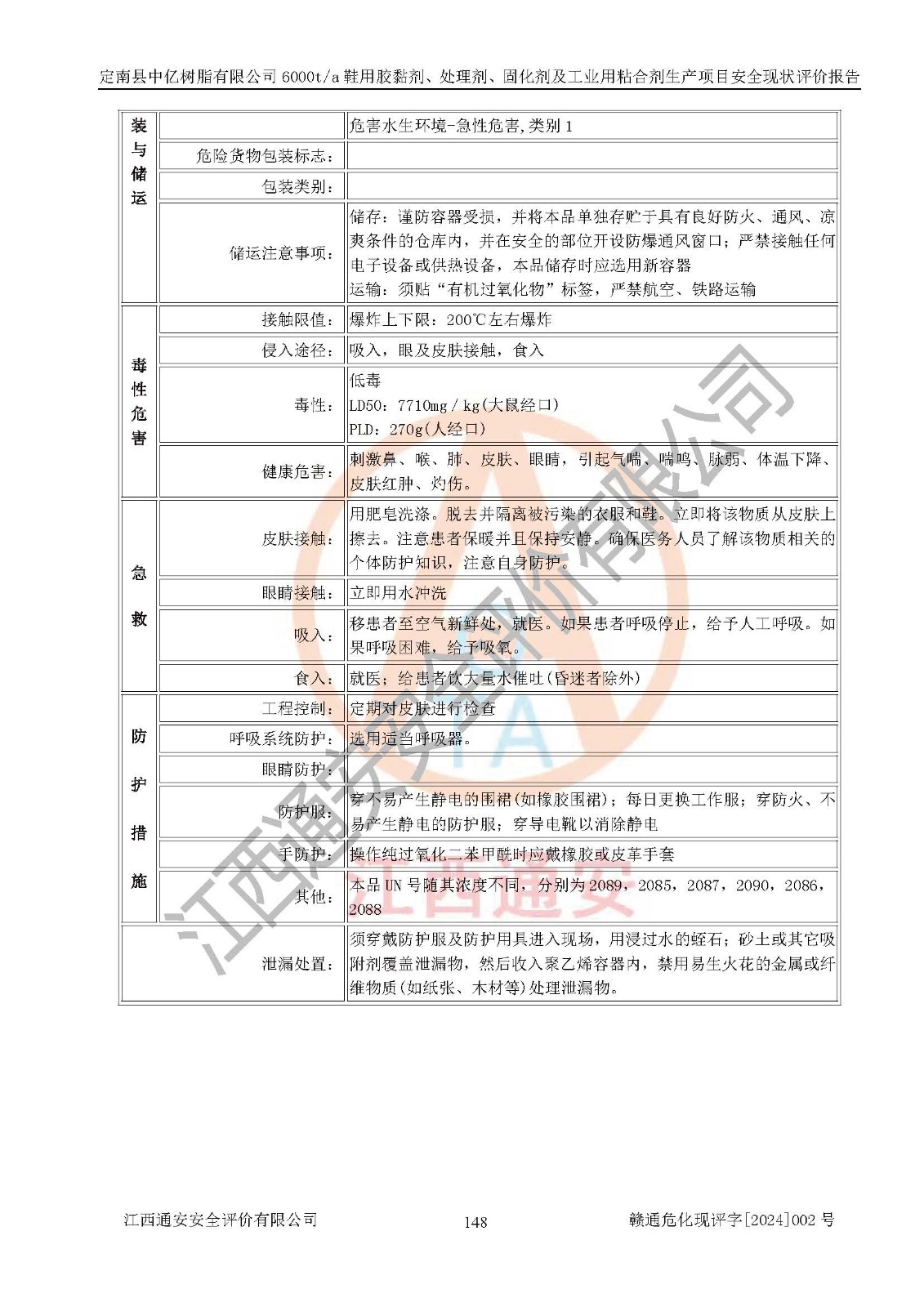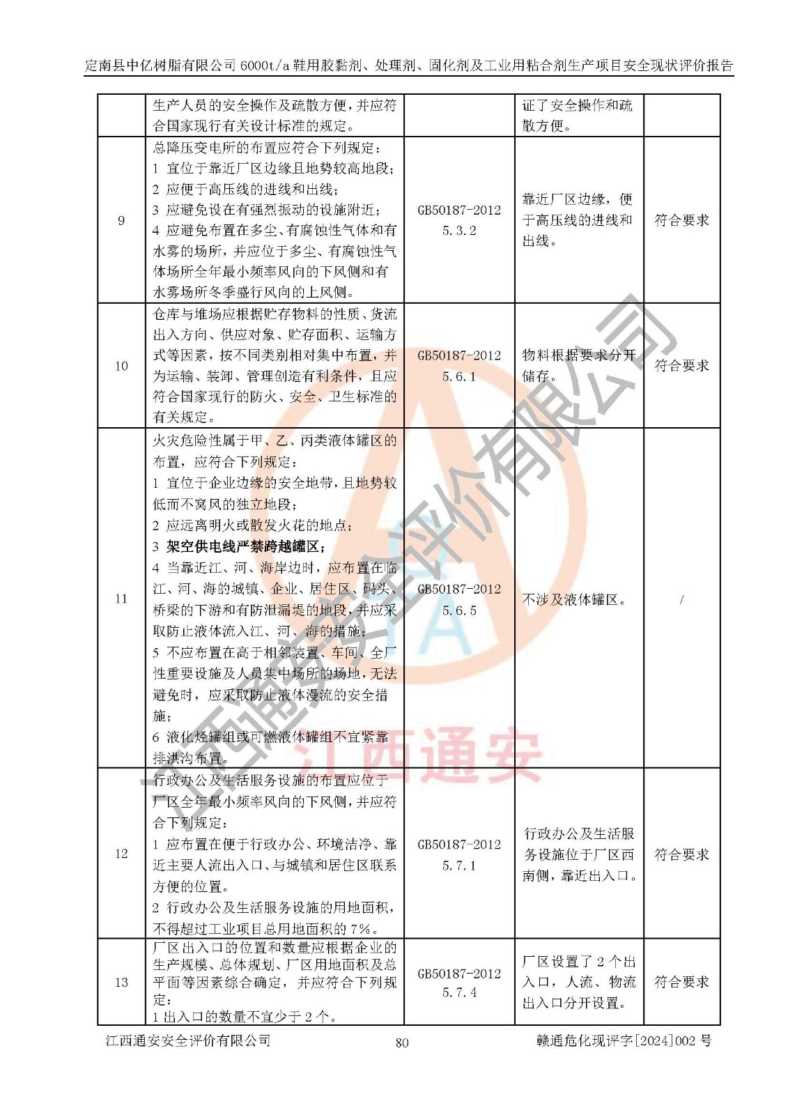 评价结论 | 定南县中亿树脂有限公司6000t/a鞋用胶黏剂、处理剂、固化剂及工业用粘合剂生产项目现场情况与设计图纸一致,监测监控系统设计符合要求、运行正常,有关从业人员资质符合《江西省危险化学品安全专项整治三年行动实施方案》要求,安全设施及安全管理符合法律、法规、标准的要求,安全风险是受控制的,其风险程度是可以接受的,安全设施符合安全生产条件,能够满足安全生产的要求。 | ||||||