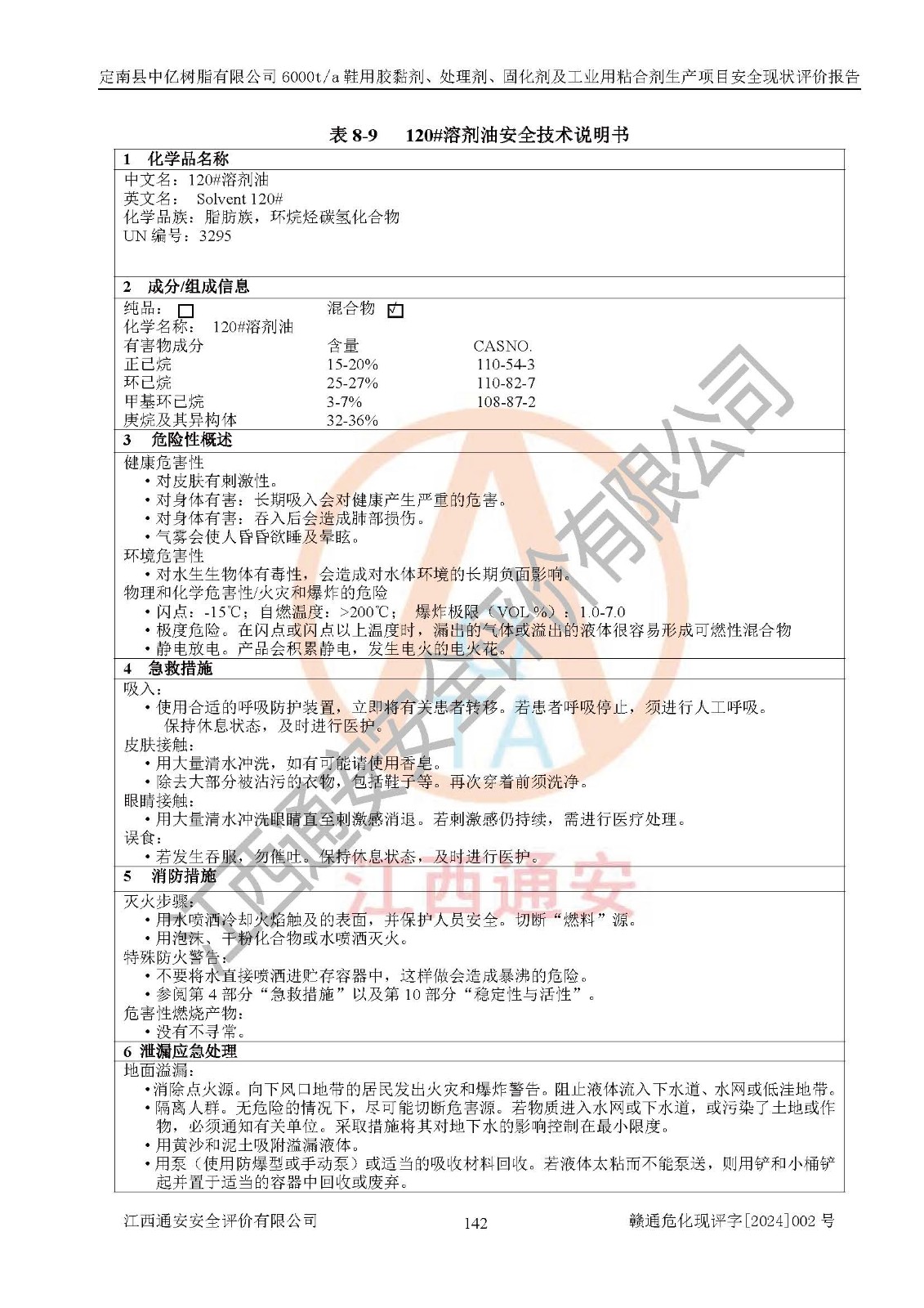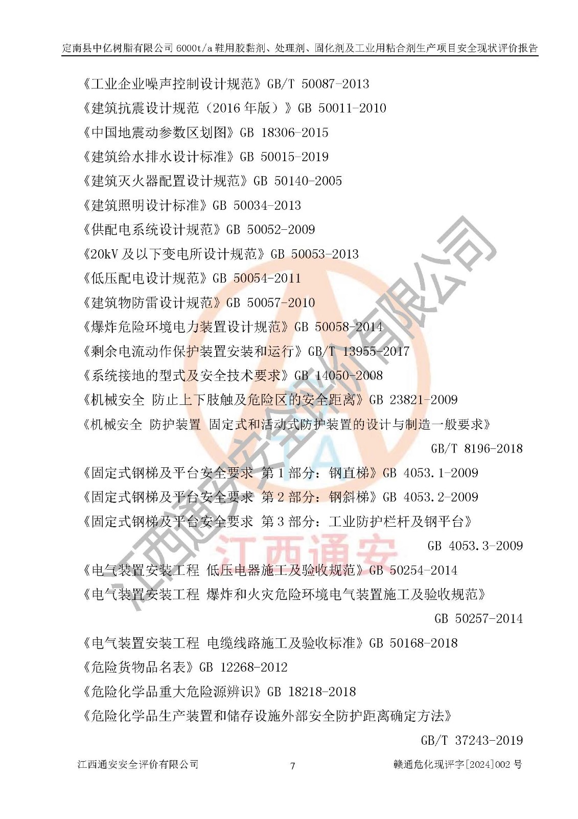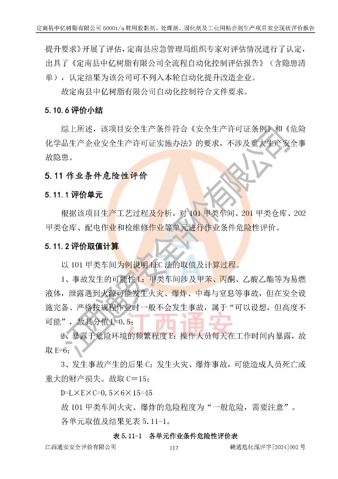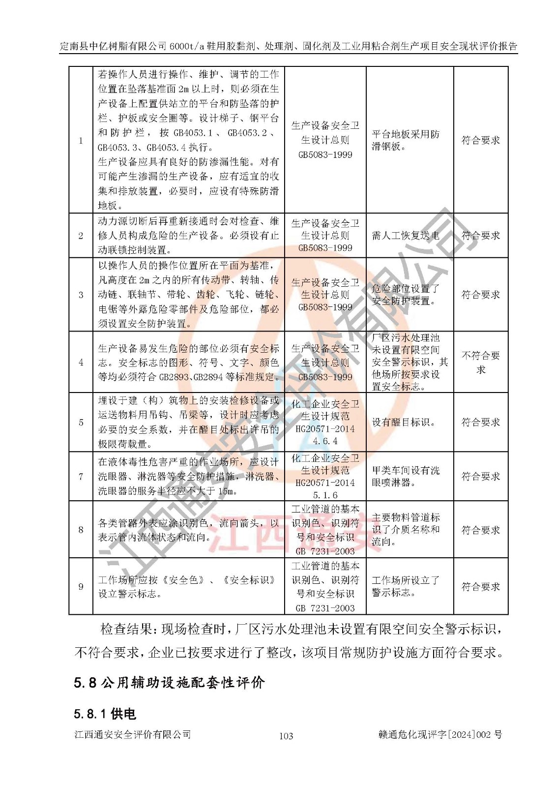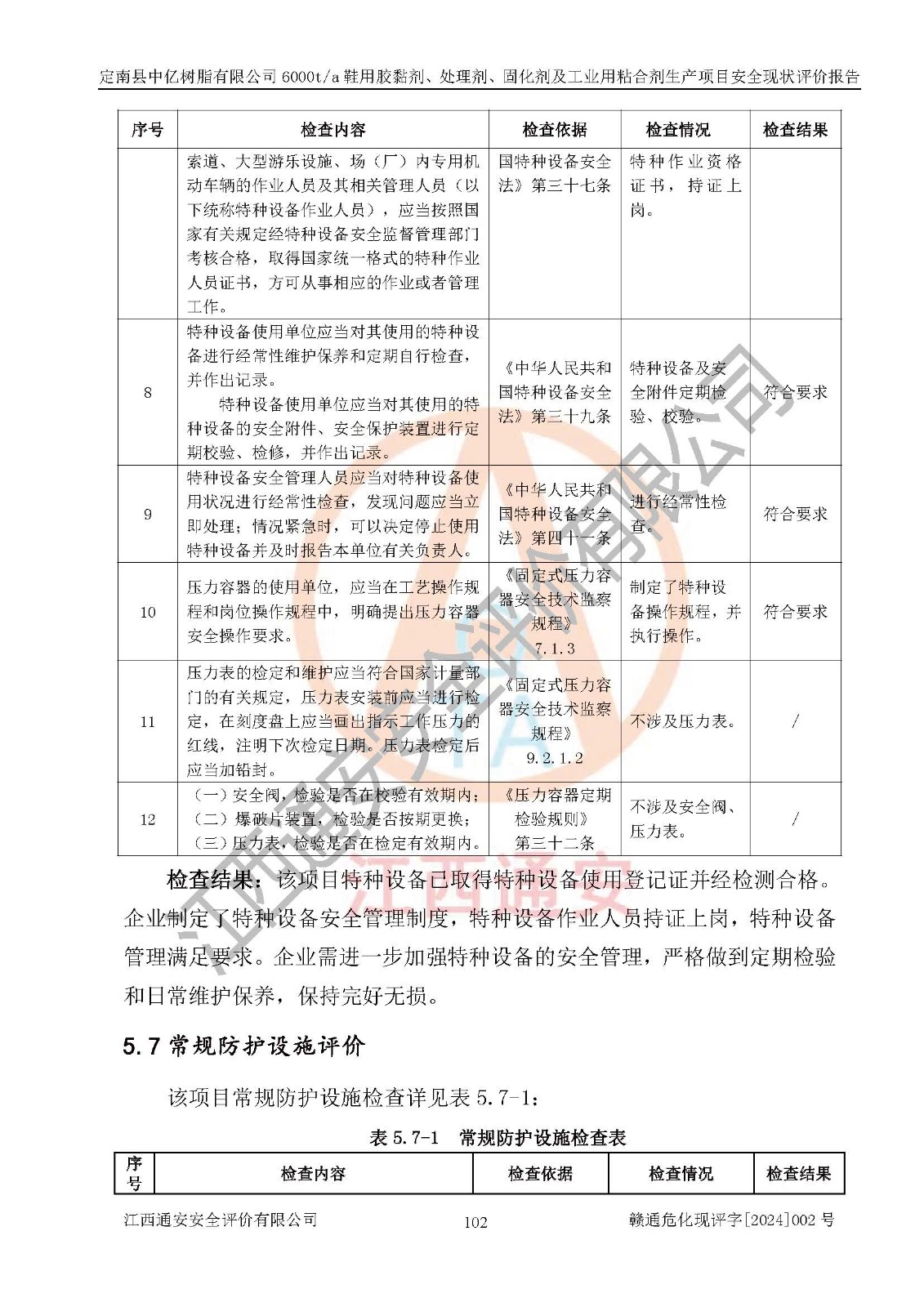 评价结论 | 定南县中亿树脂有限公司6000t/a鞋用胶黏剂、处理剂、固化剂及工业用粘合剂生产项目现场情况与设计图纸一致,监测监控系统设计符合要求、运行正常,有关从业人员资质符合《江西省危险化学品安全专项整治三年行动实施方案》要求,安全设施及安全管理符合法律、法规、标准的要求,安全风险是受控制的,其风险程度是可以接受的,安全设施符合安全生产条件,能够满足安全生产的要求。 | ||||||