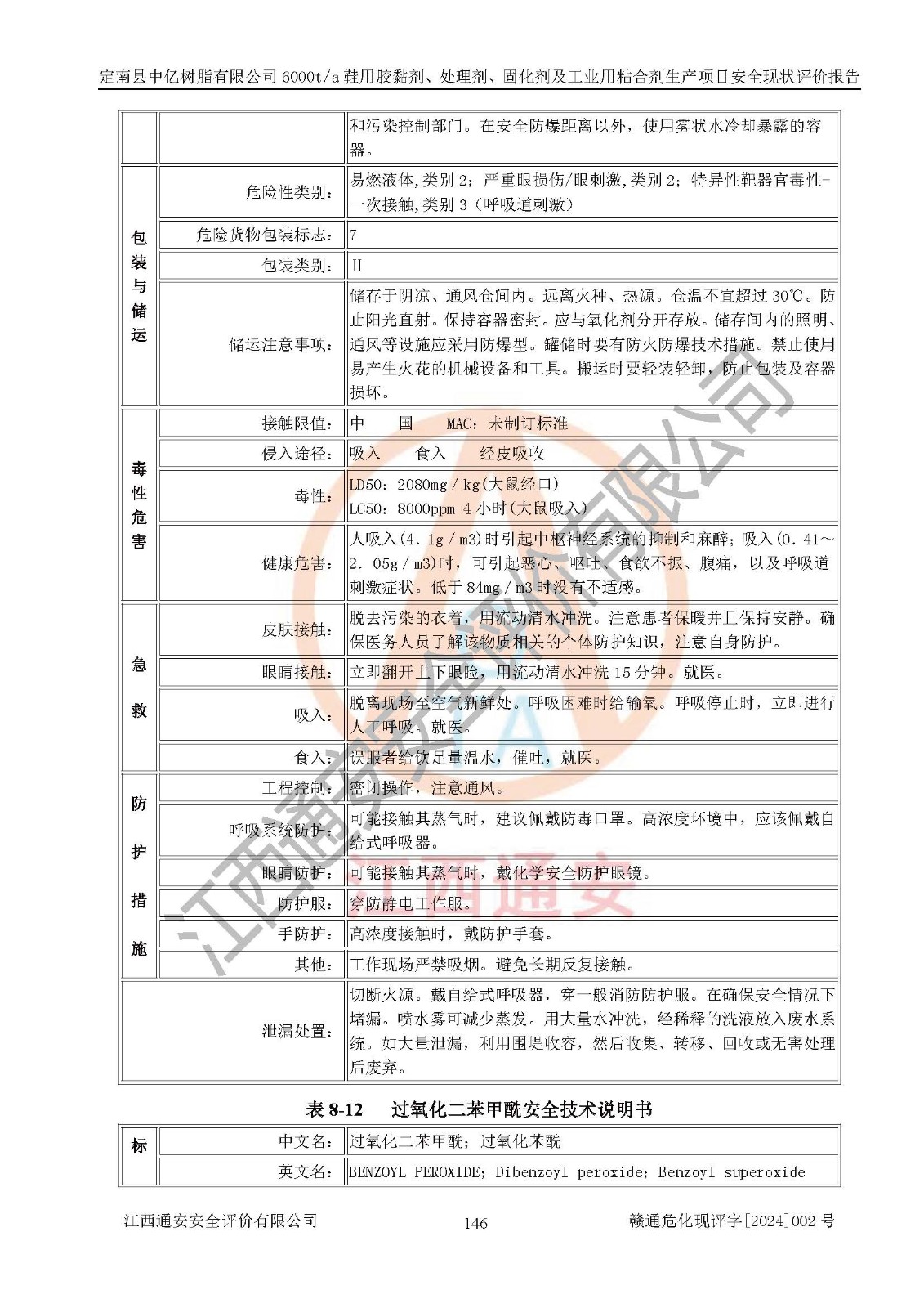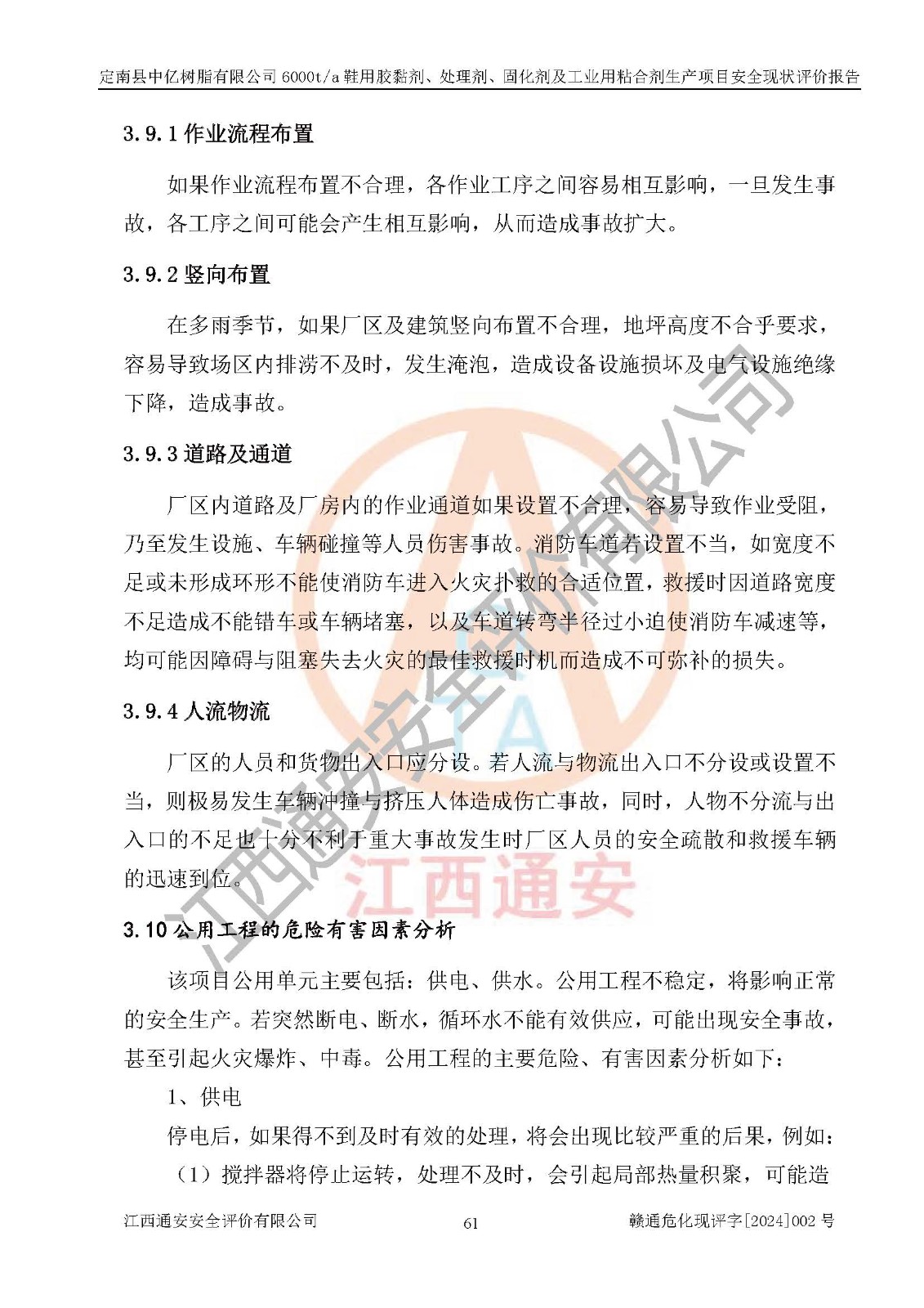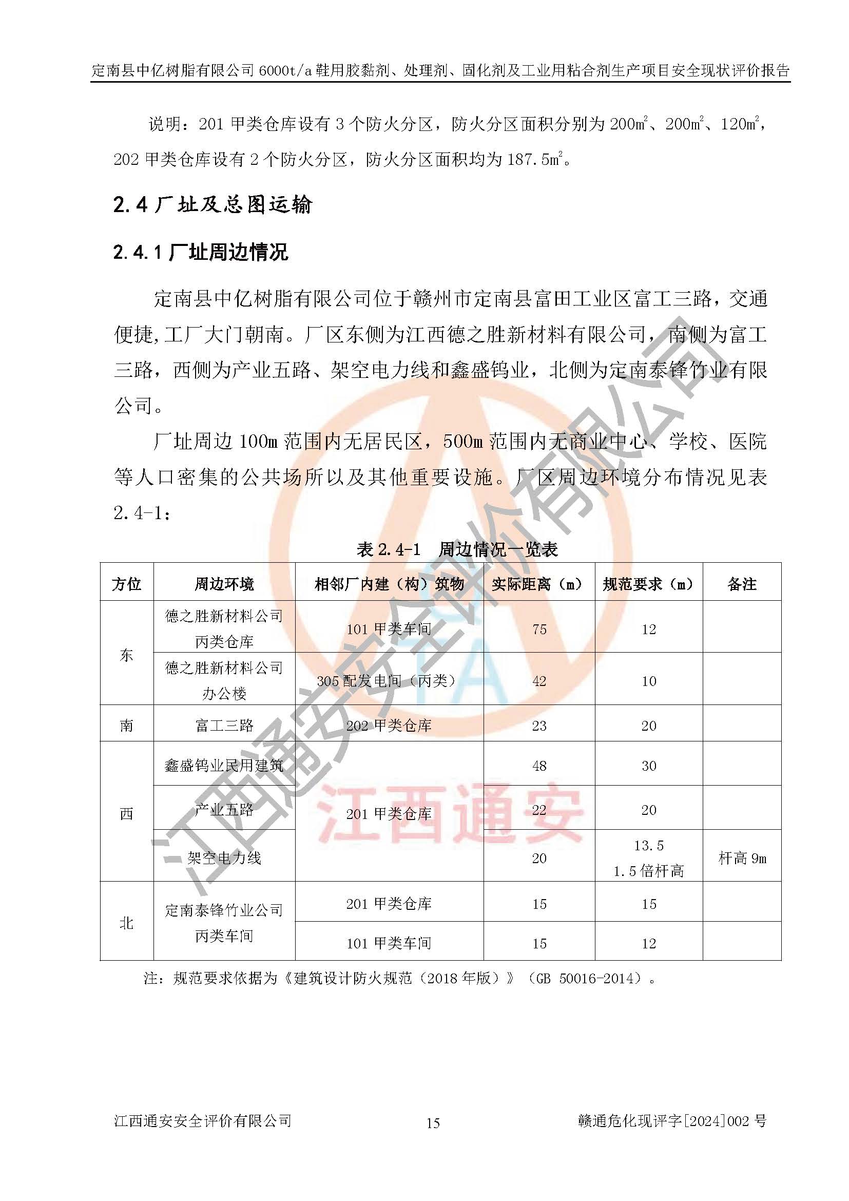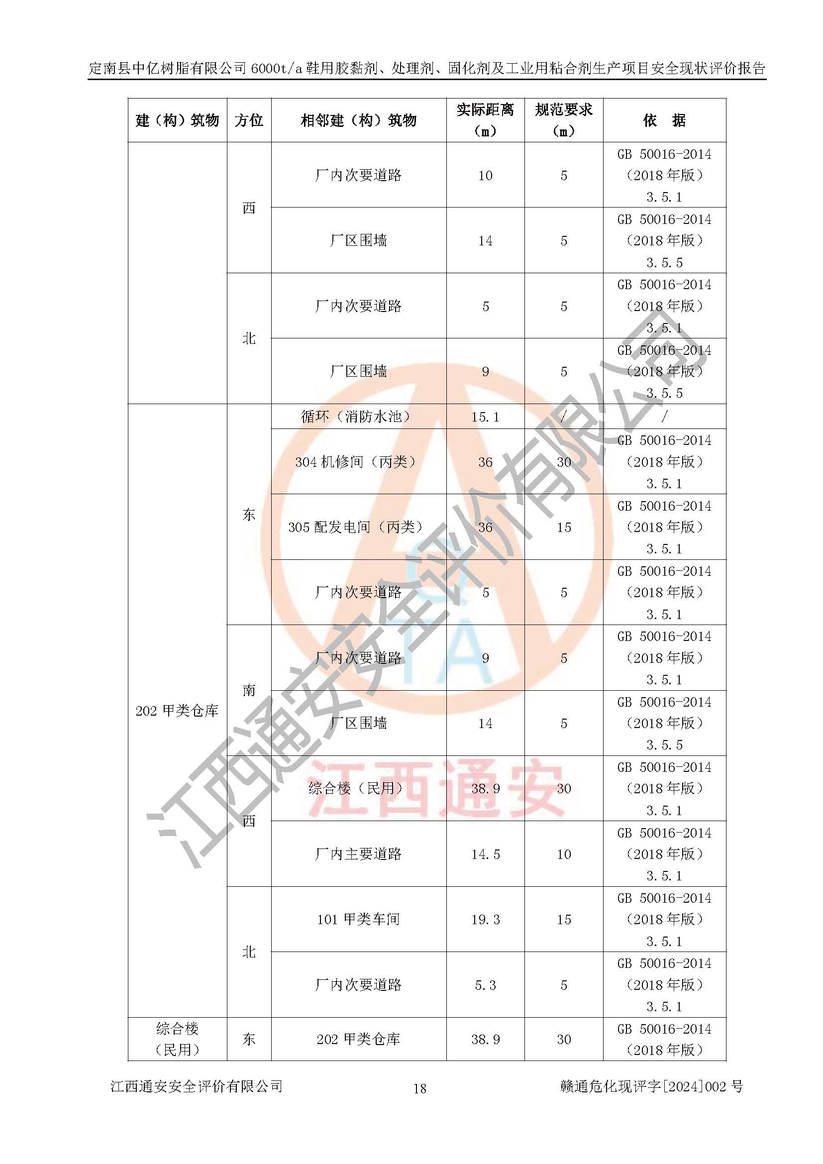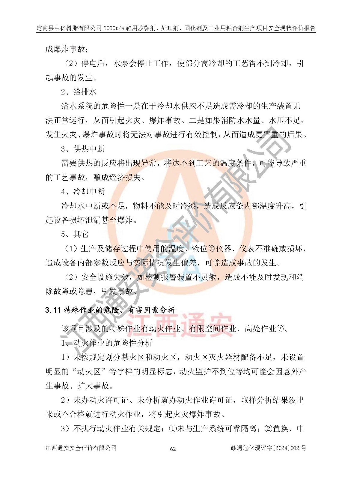 评价结论 | 定南县中亿树脂有限公司6000t/a鞋用胶黏剂、处理剂、固化剂及工业用粘合剂生产项目现场情况与设计图纸一致,监测监控系统设计符合要求、运行正常,有关从业人员资质符合《江西省危险化学品安全专项整治三年行动实施方案》要求,安全设施及安全管理符合法律、法规、标准的要求,安全风险是受控制的,其风险程度是可以接受的,安全设施符合安全生产条件,能够满足安全生产的要求。 | ||||||