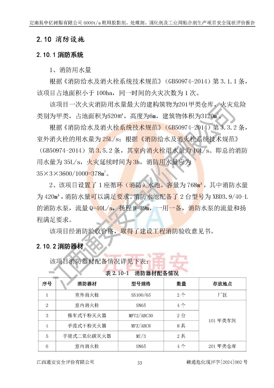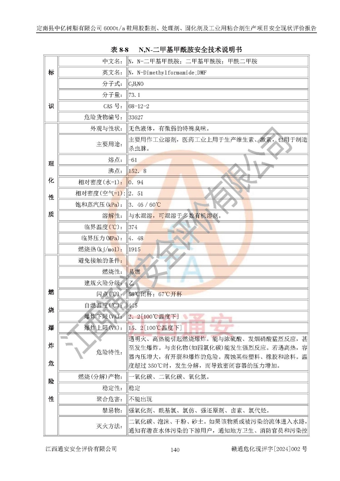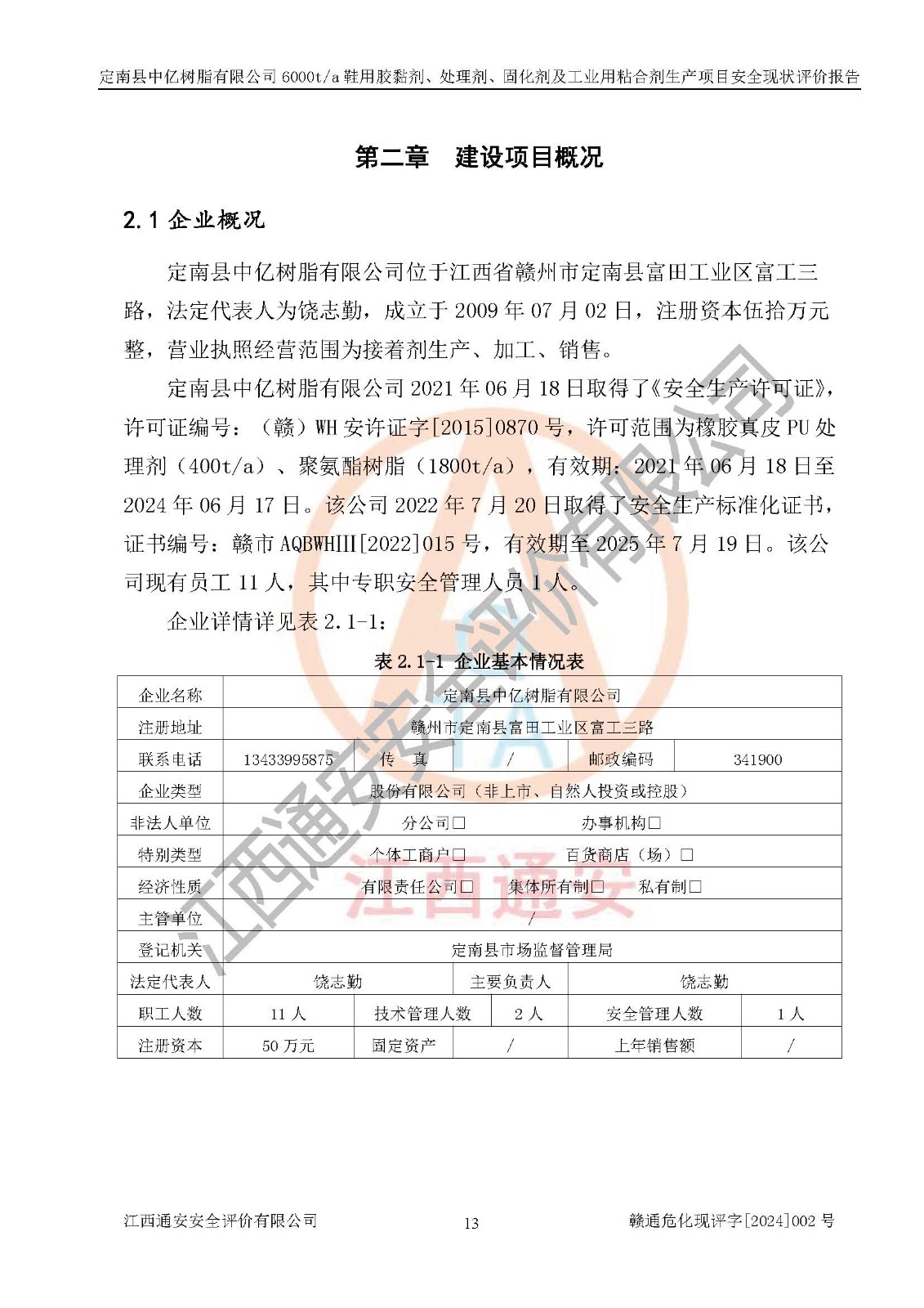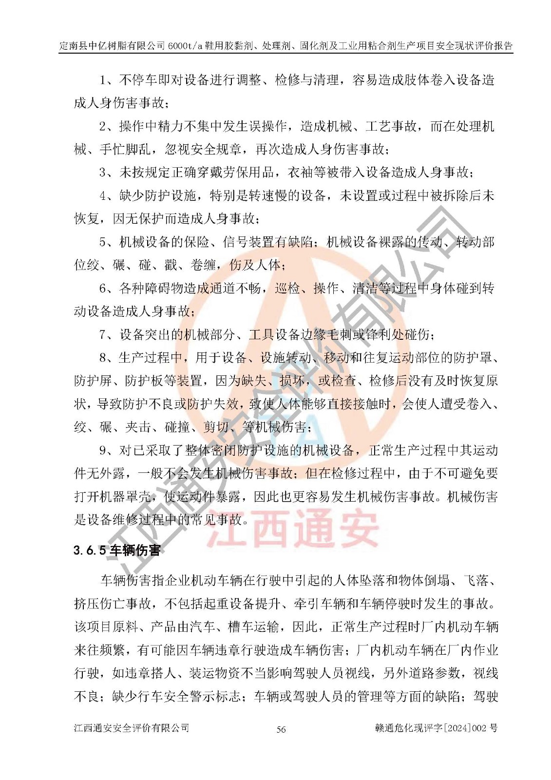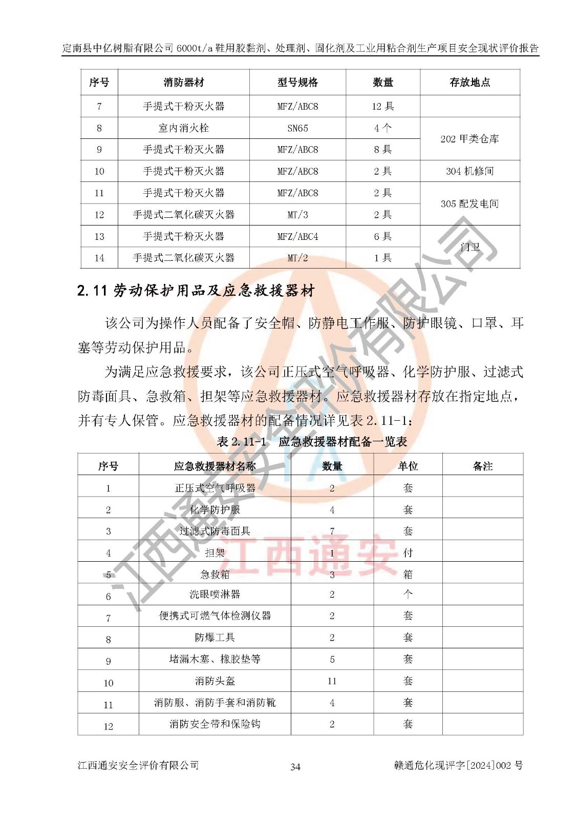 评价结论 | 定南县中亿树脂有限公司6000t/a鞋用胶黏剂、处理剂、固化剂及工业用粘合剂生产项目现场情况与设计图纸一致,监测监控系统设计符合要求、运行正常,有关从业人员资质符合《江西省危险化学品安全专项整治三年行动实施方案》要求,安全设施及安全管理符合法律、法规、标准的要求,安全风险是受控制的,其风险程度是可以接受的,安全设施符合安全生产条件,能够满足安全生产的要求。 | ||||||