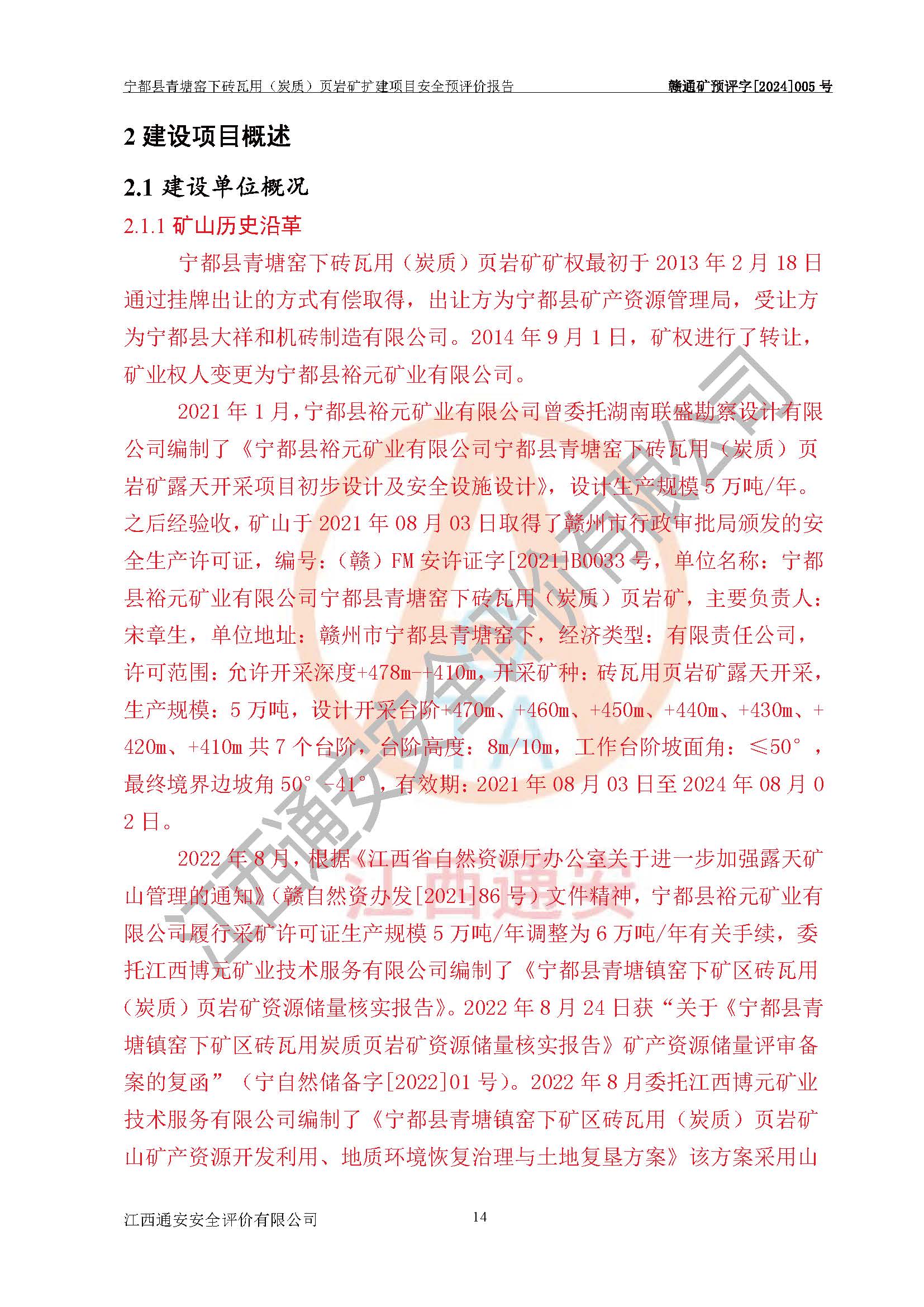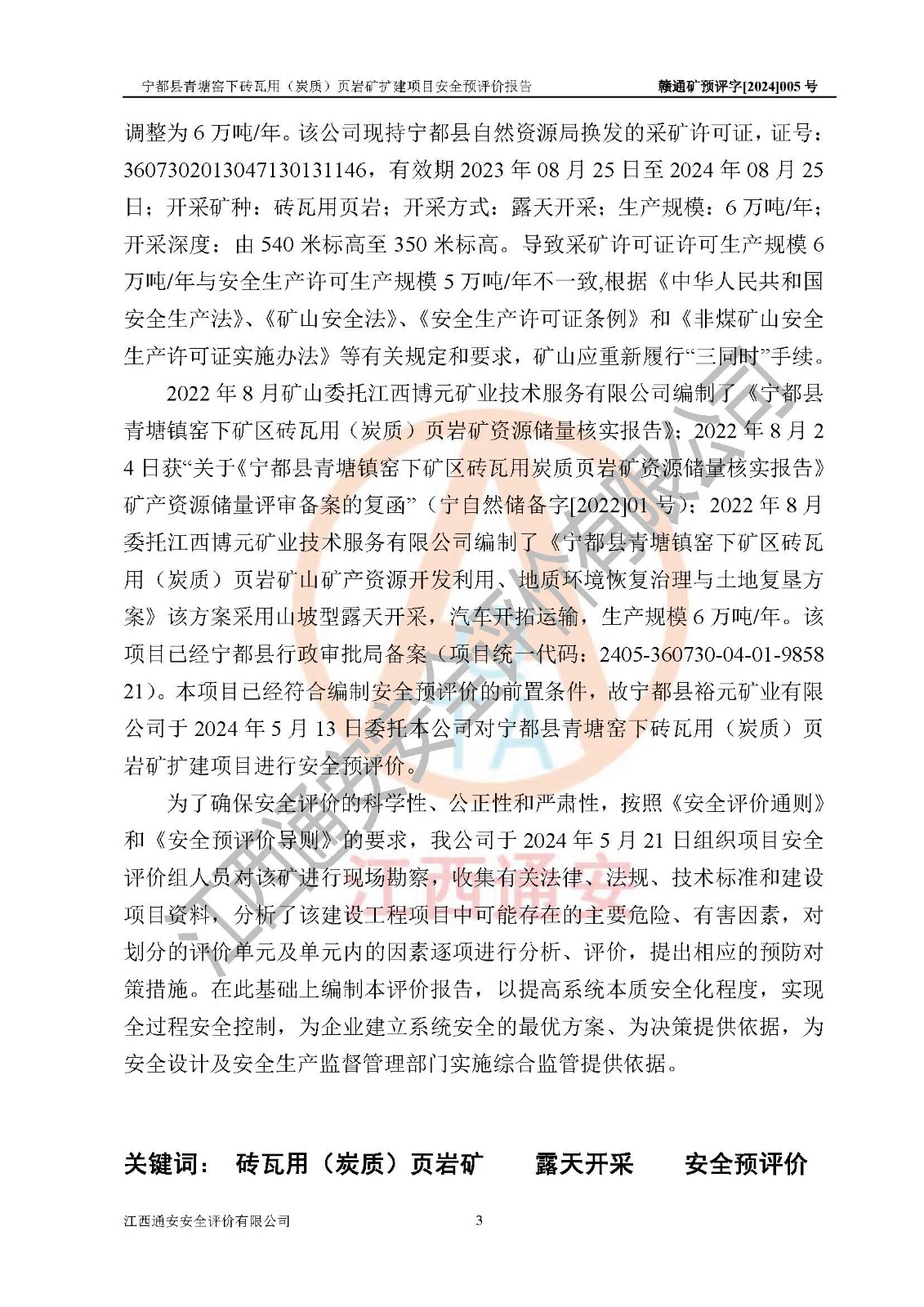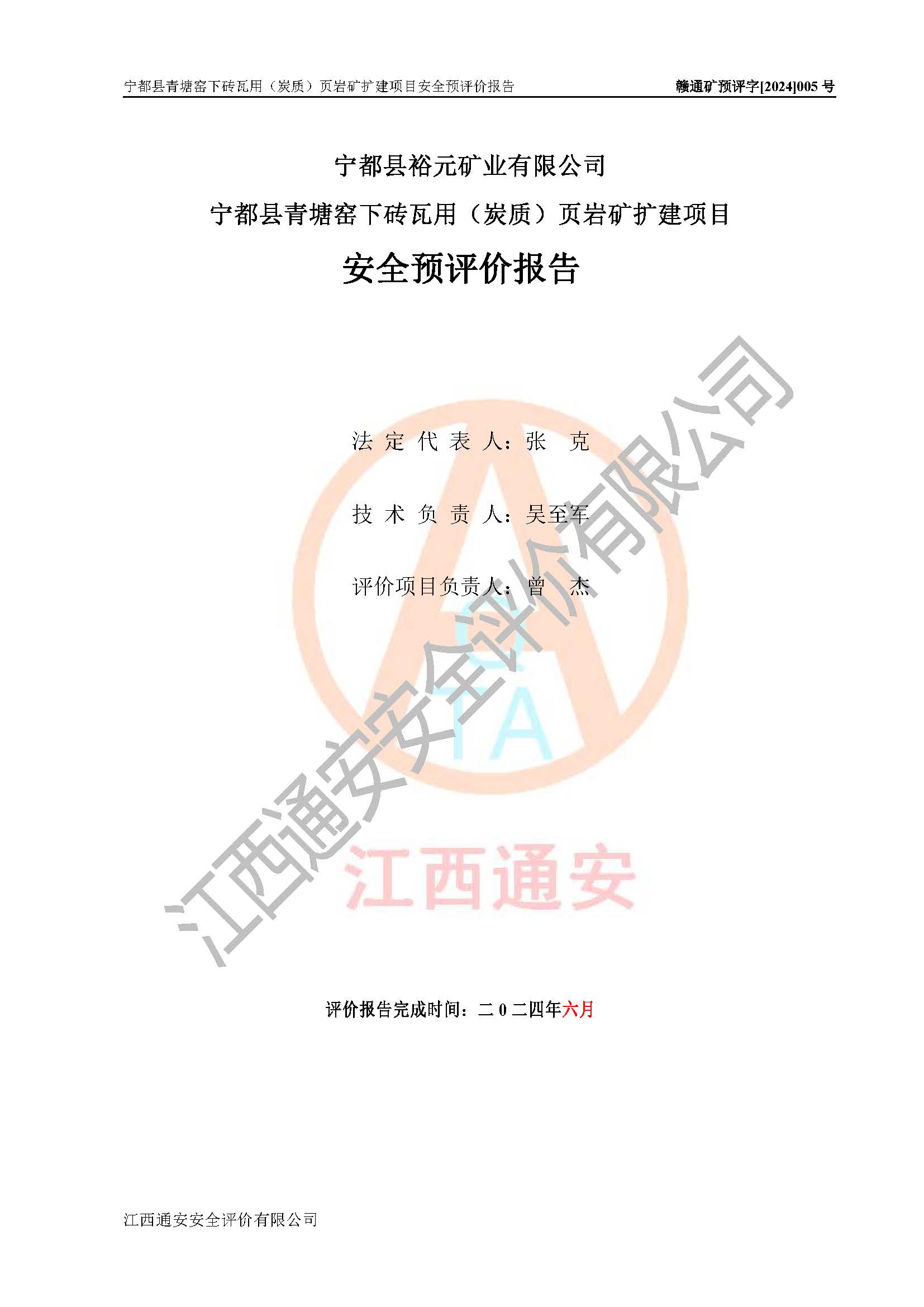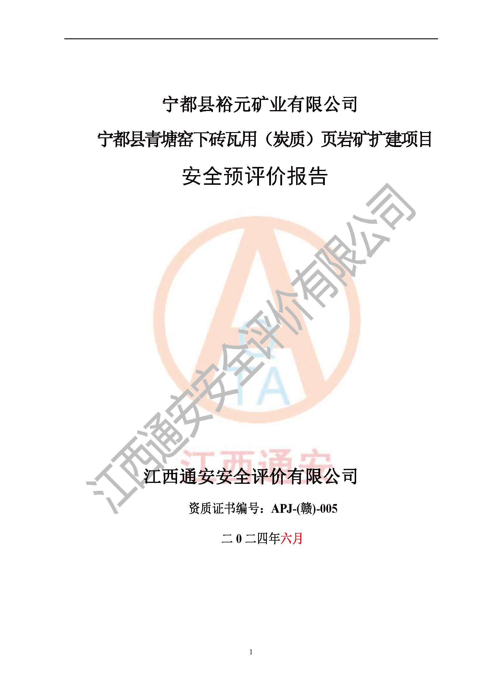 评价报告名称 | 宁都县裕元矿业有限公司宁都县青塘窑下砖瓦用(炭质)页岩矿扩建项目安全预评价报告 | ||||