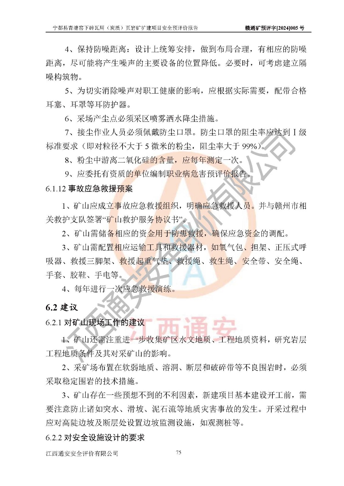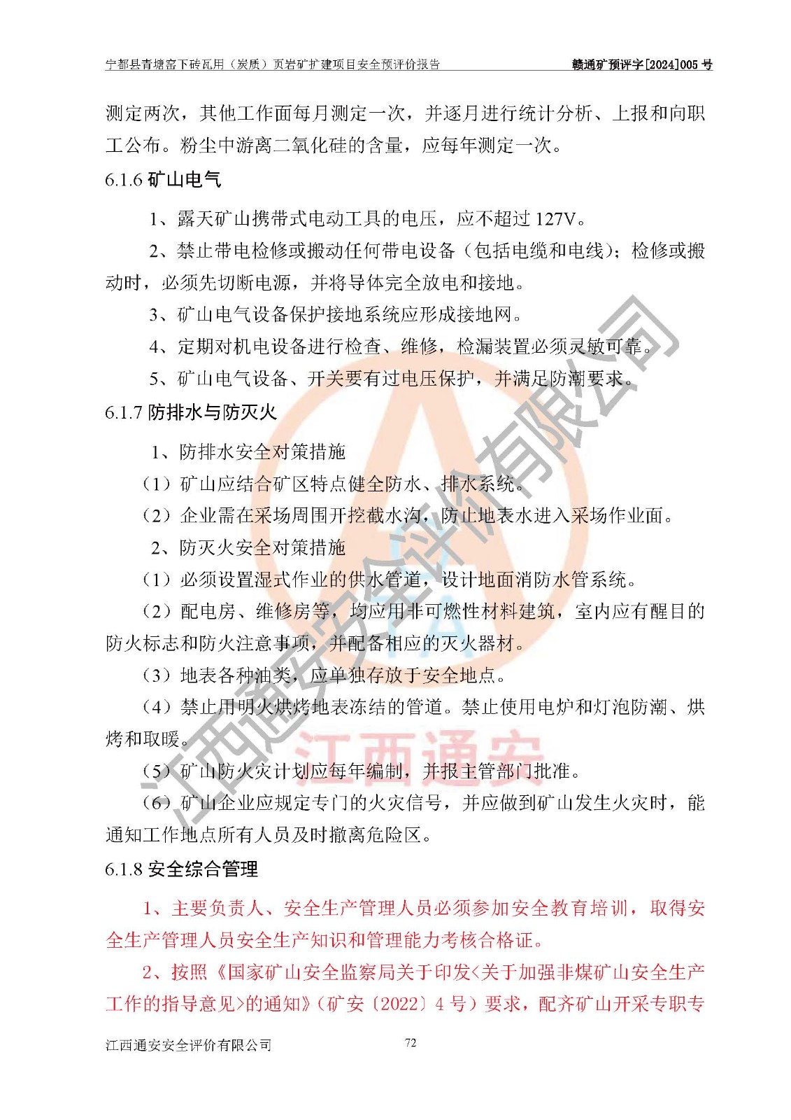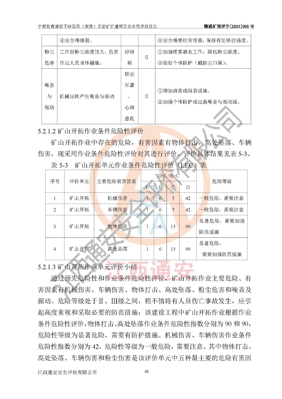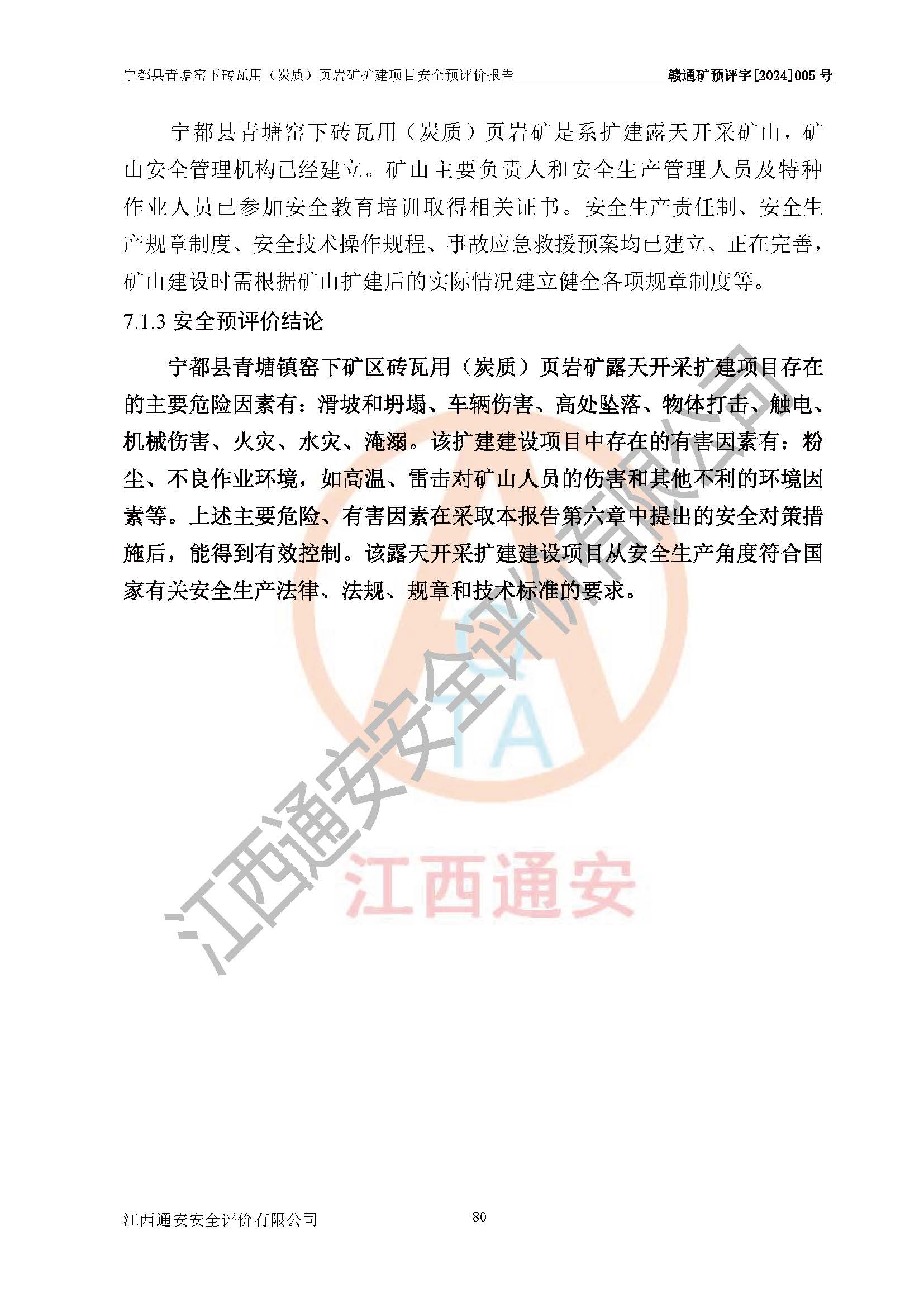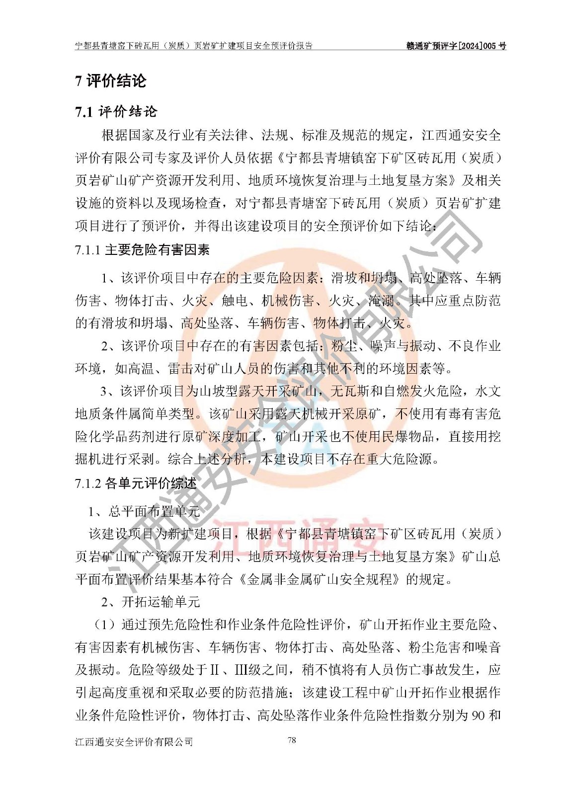 评价结论 | 宁都县青塘镇窑下矿区砖瓦用(炭质)页岩矿露天开采扩建项目存在的主要危险因素有:滑坡和坍塌、**伤害、高处坠落、物体打击、触电、机械伤害、火灾、水灾、淹溺。该扩建建设项目中存在的有害因素有:粉尘、不良作业环境,如高温、雷击对矿山人员的伤害和其他不利的环境因素等。上述主要危险、有害因素在采取本报告第六章中提出的安全对策措施后,能得到**控制。该露天开采扩建建设项目从安全生产角度符合**有关安全生产法律、法规、规章和技术标准的要求。