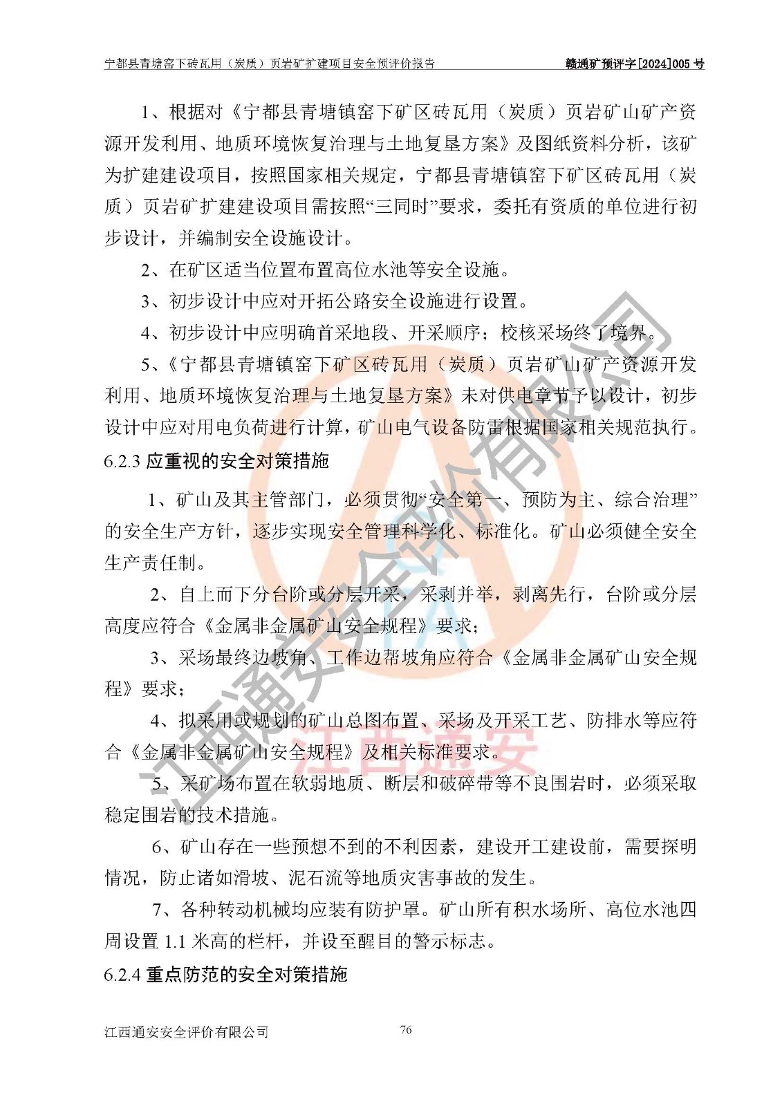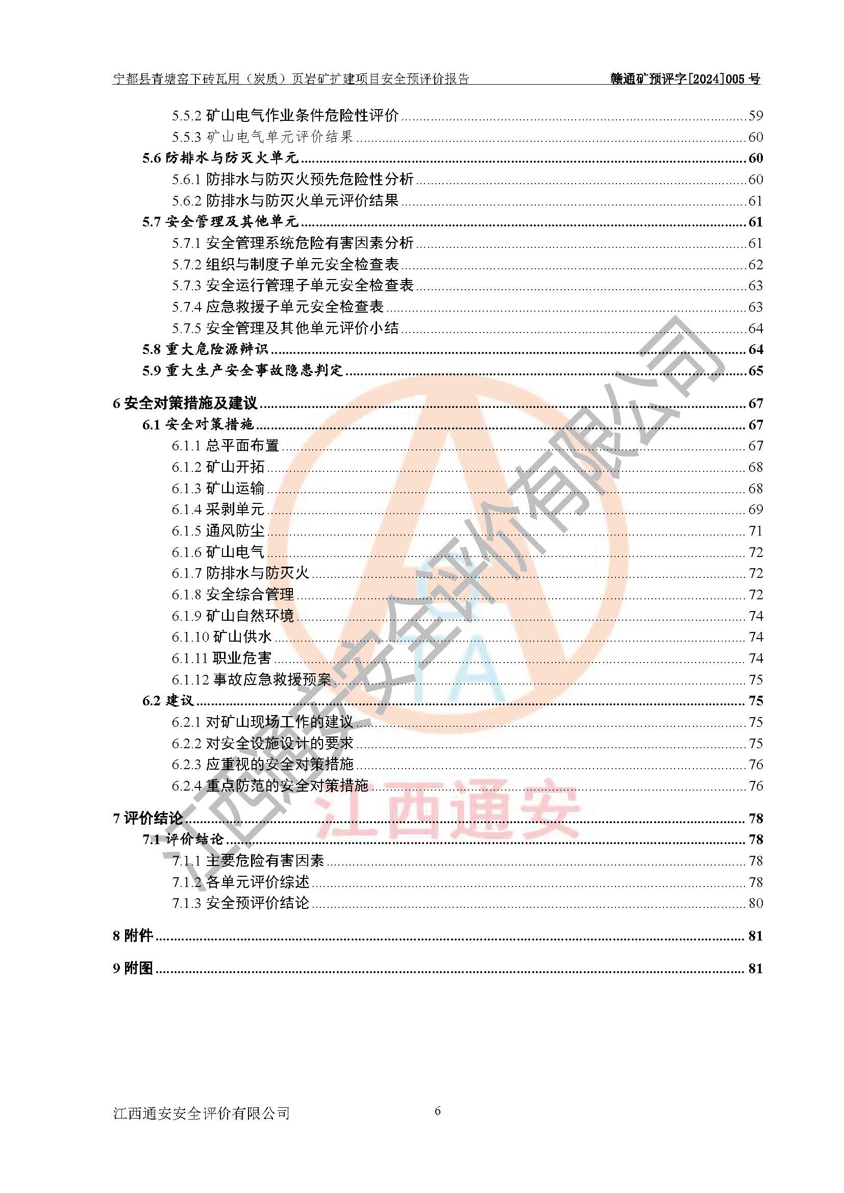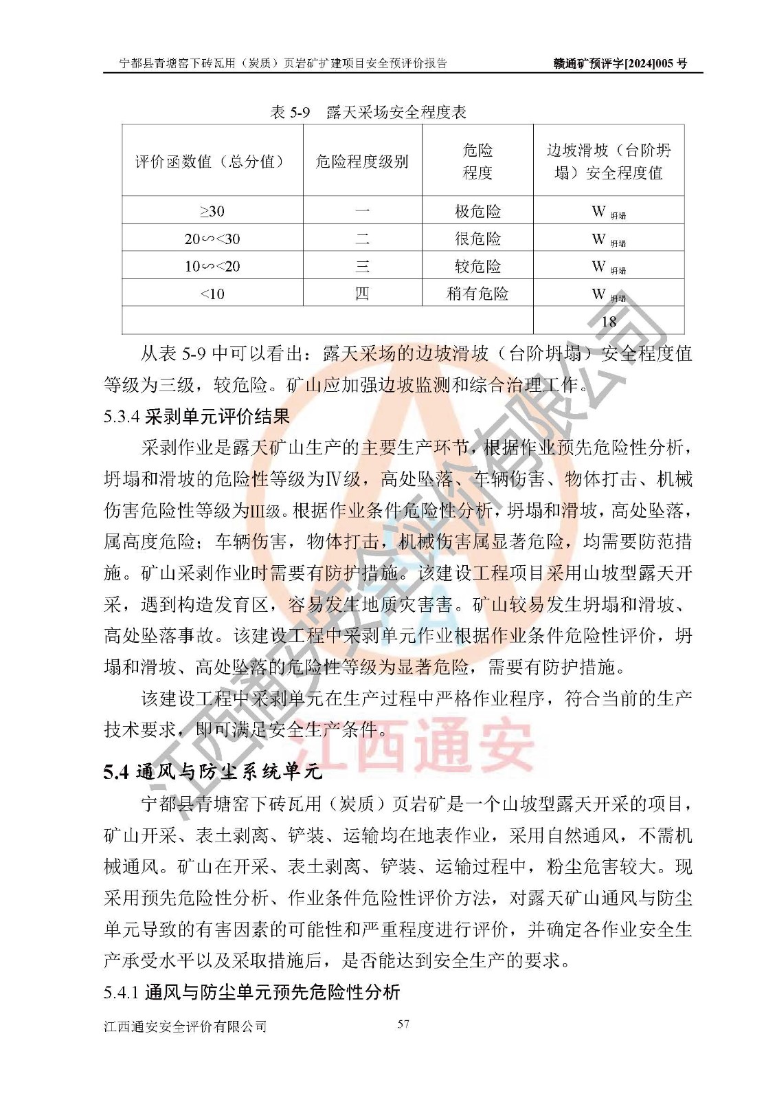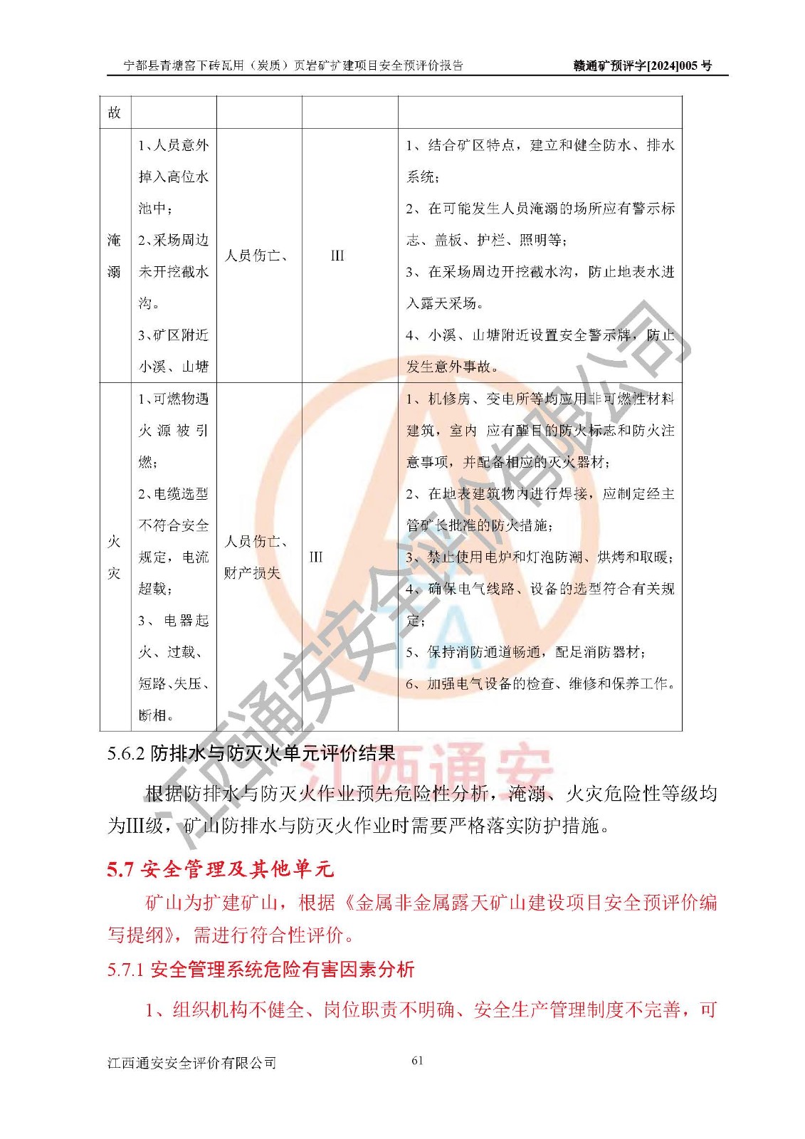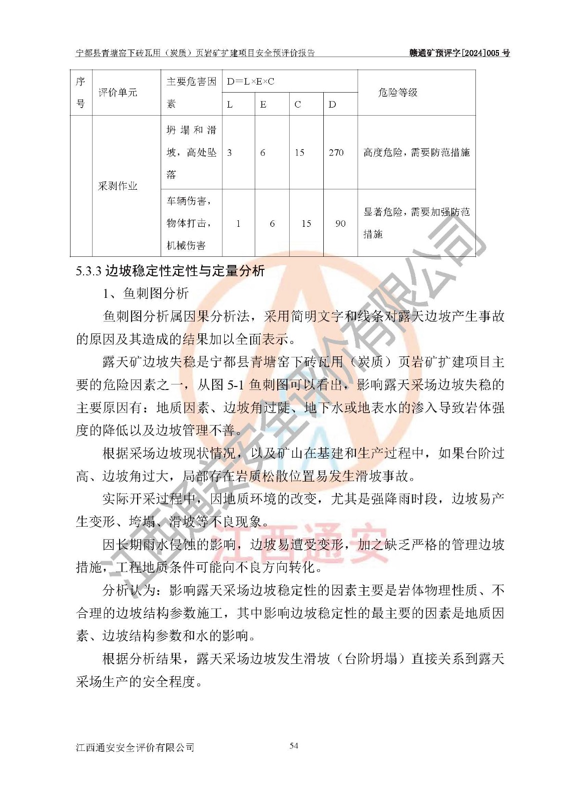 评价结论 | 宁都县青塘镇窑下矿区砖瓦用(炭质)页岩矿露天开采扩建项目存在的主要危险因素有:滑坡和坍塌、**伤害、高处坠落、物体打击、触电、机械伤害、火灾、水灾、淹溺。该扩建建设项目中存在的有害因素有:粉尘、不良作业环境,如高温、雷击对矿山人员的伤害和其他不利的环境因素等。上述主要危险、有害因素在采取本报告第六章中提出的安全对策措施后,能得到**控制。该露天开采扩建建设项目从安全生产角度符合**有关安全生产法律、法规、规章和技术标准的要求。