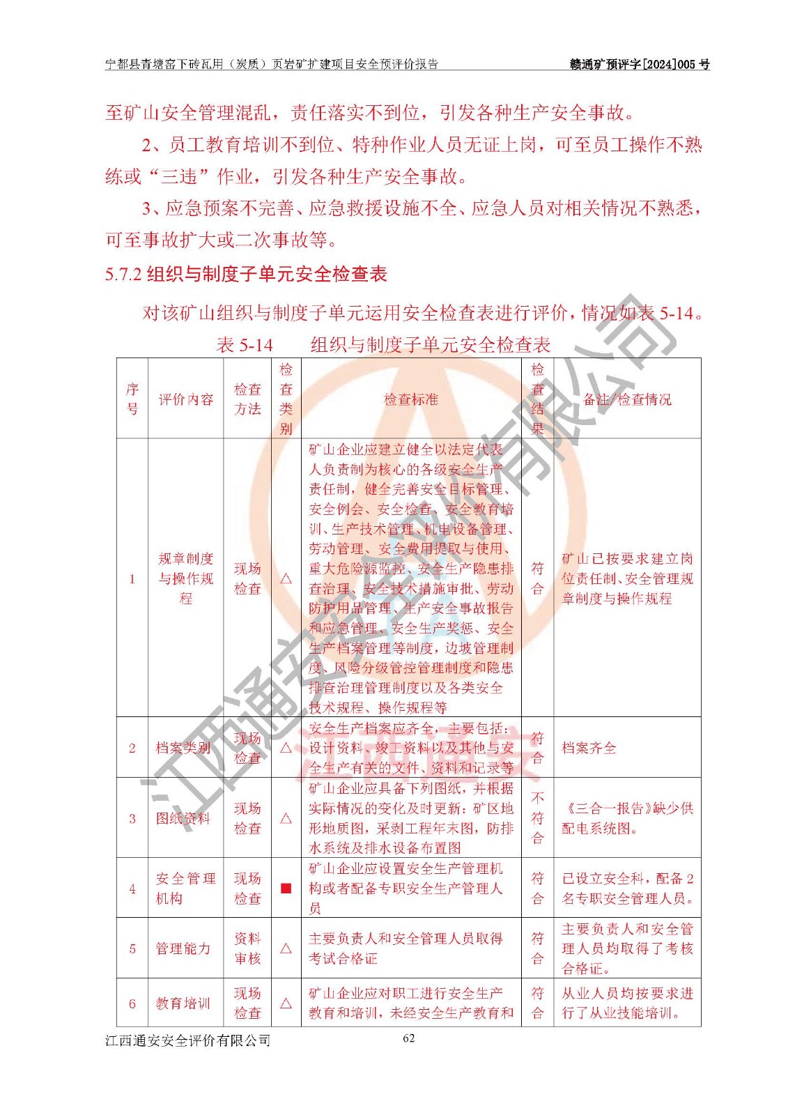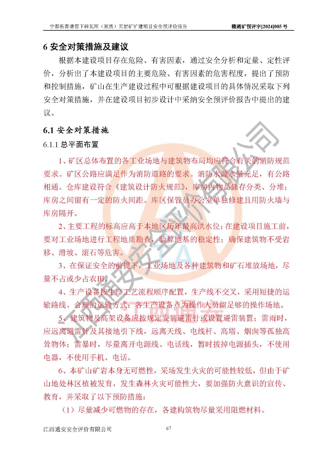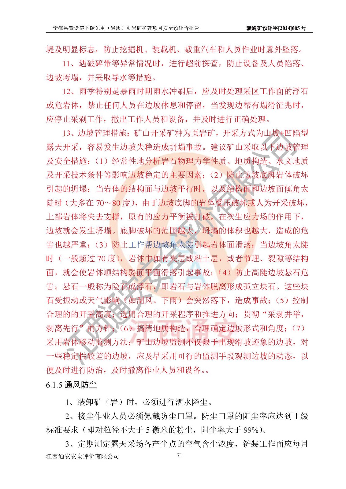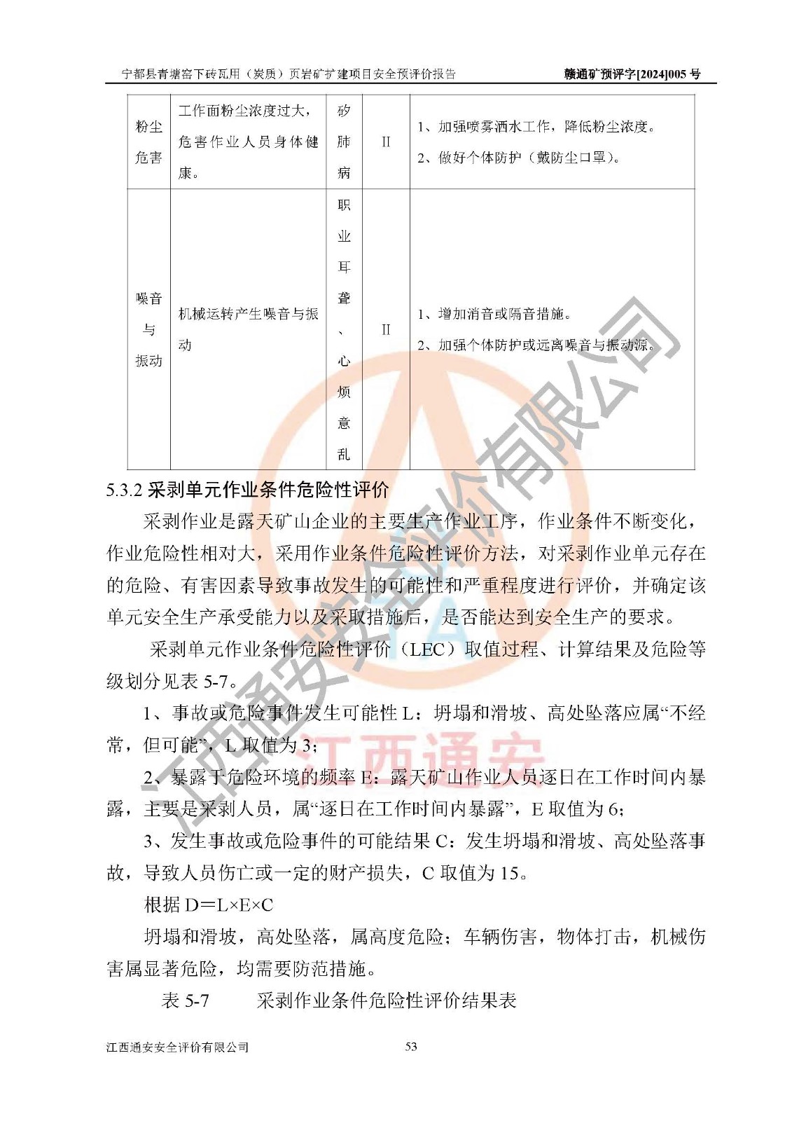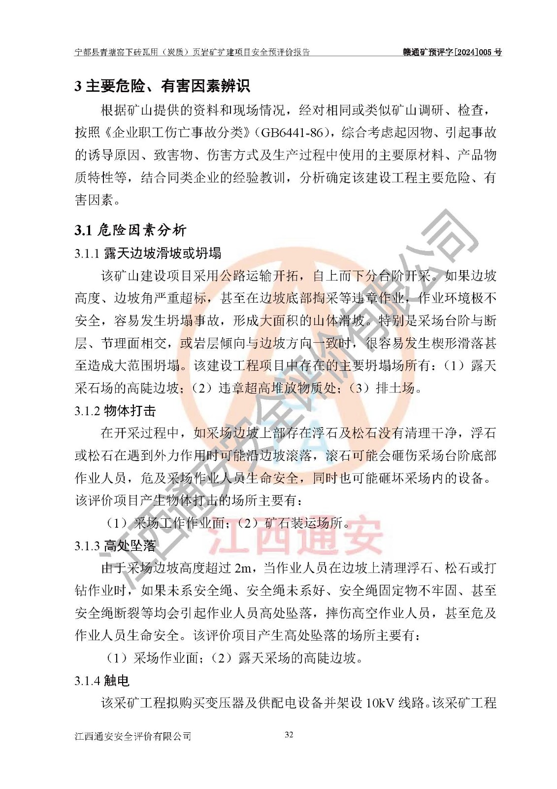 评价结论 | 宁都县青塘镇窑下矿区砖瓦用(炭质)页岩矿露天开采扩建项目存在的主要危险因素有:滑坡和坍塌、**伤害、高处坠落、物体打击、触电、机械伤害、火灾、水灾、淹溺。该扩建建设项目中存在的有害因素有:粉尘、不良作业环境,如高温、雷击对矿山人员的伤害和其他不利的环境因素等。上述主要危险、有害因素在采取本报告第六章中提出的安全对策措施后,能得到**控制。该露天开采扩建建设项目从安全生产角度符合**有关安全生产法律、法规、规章和技术标准的要求。