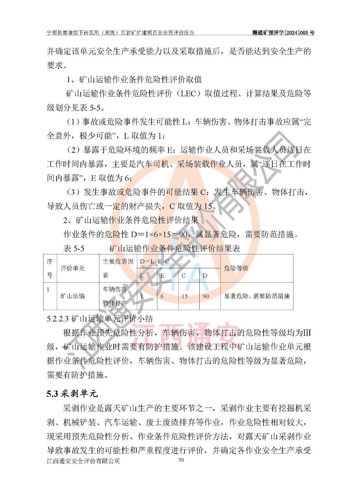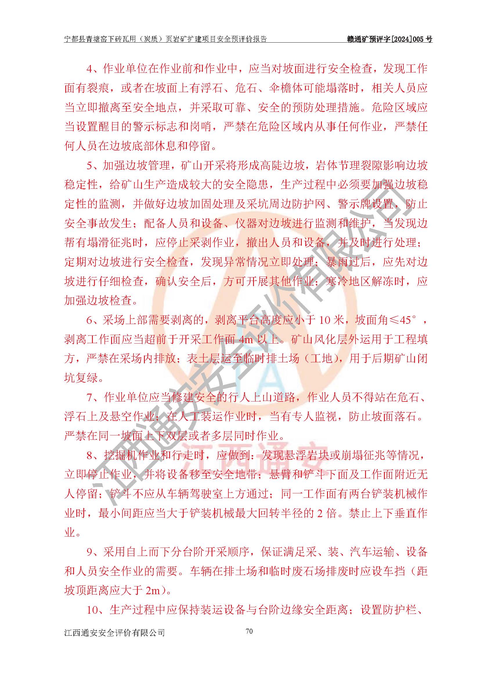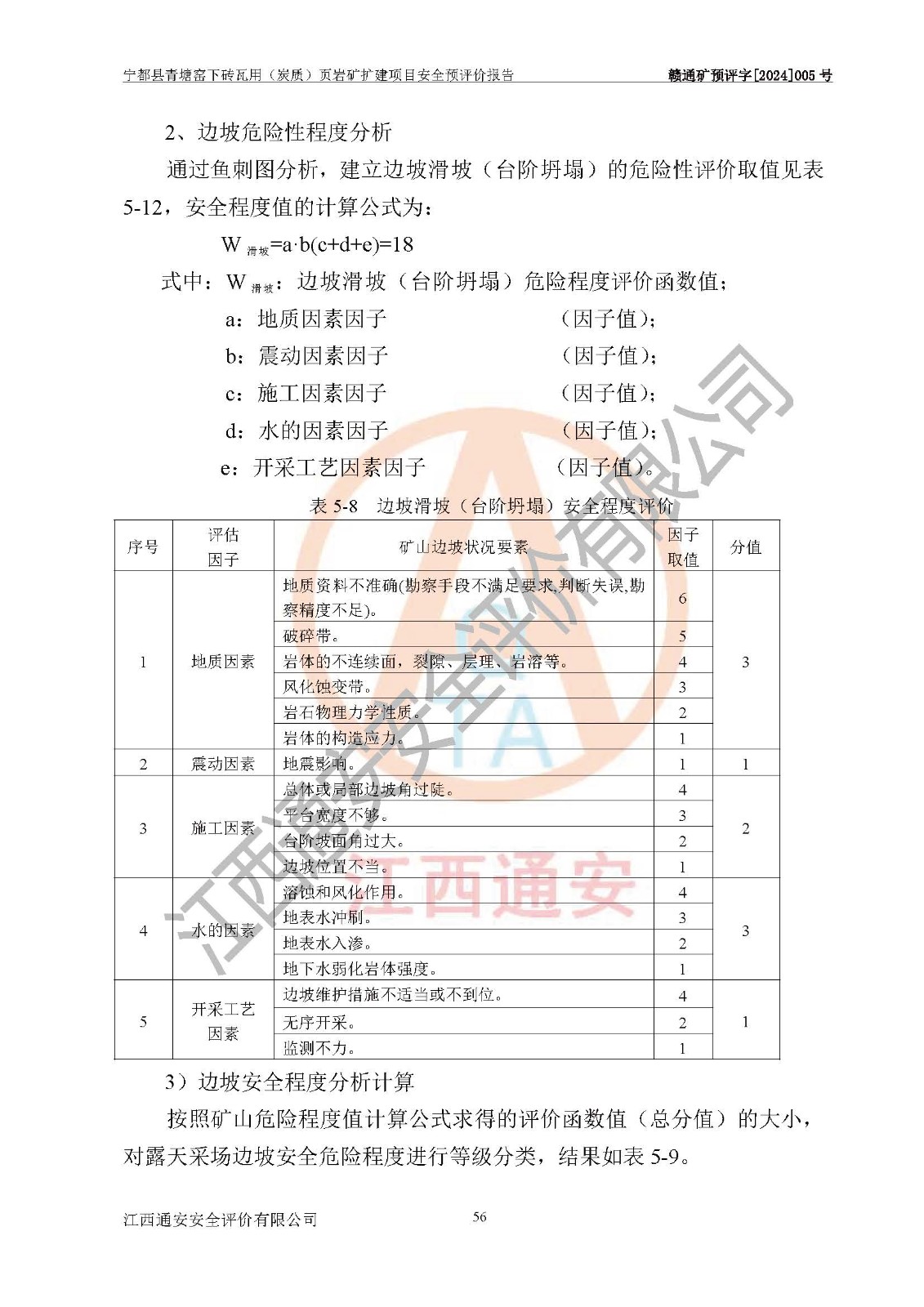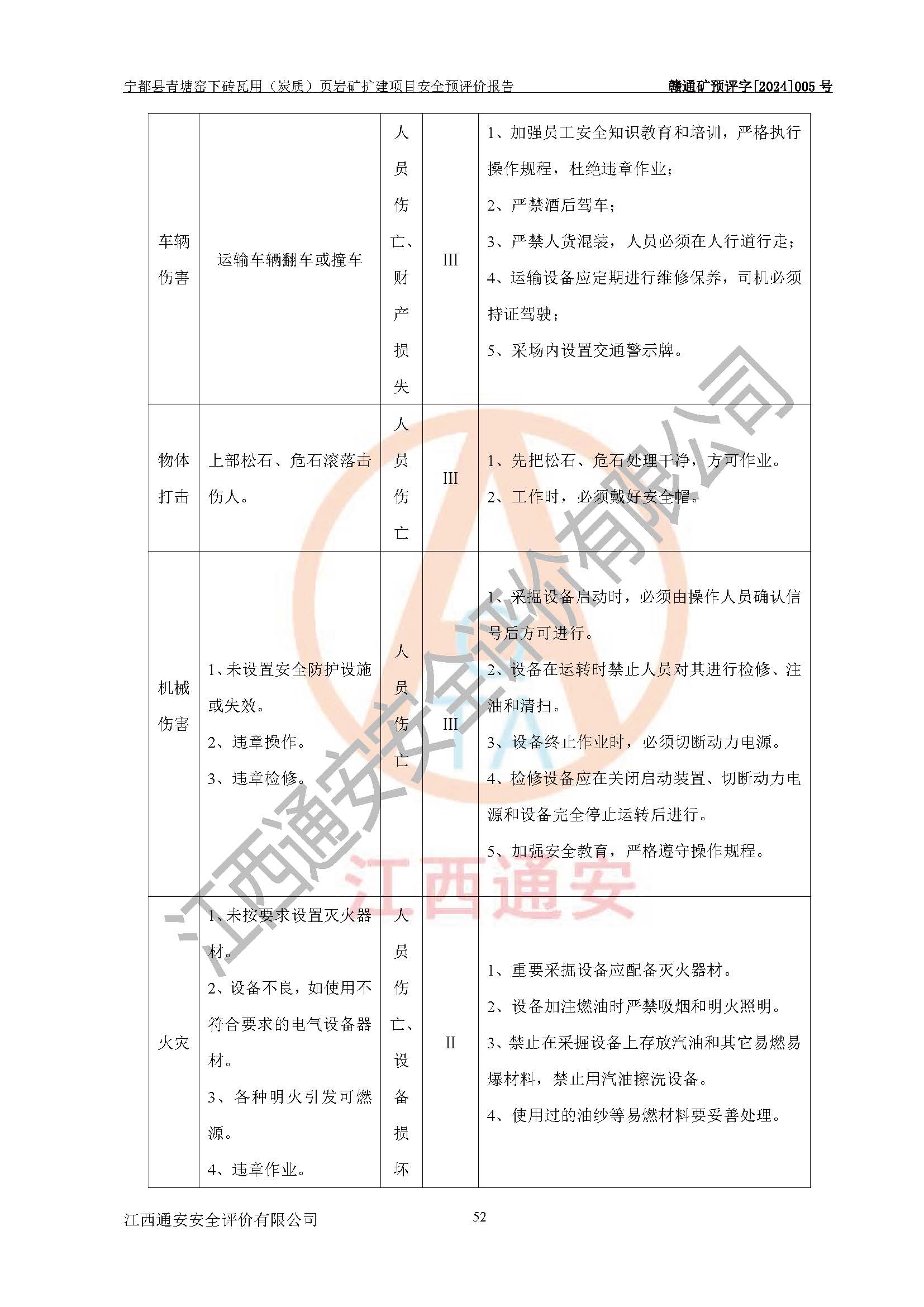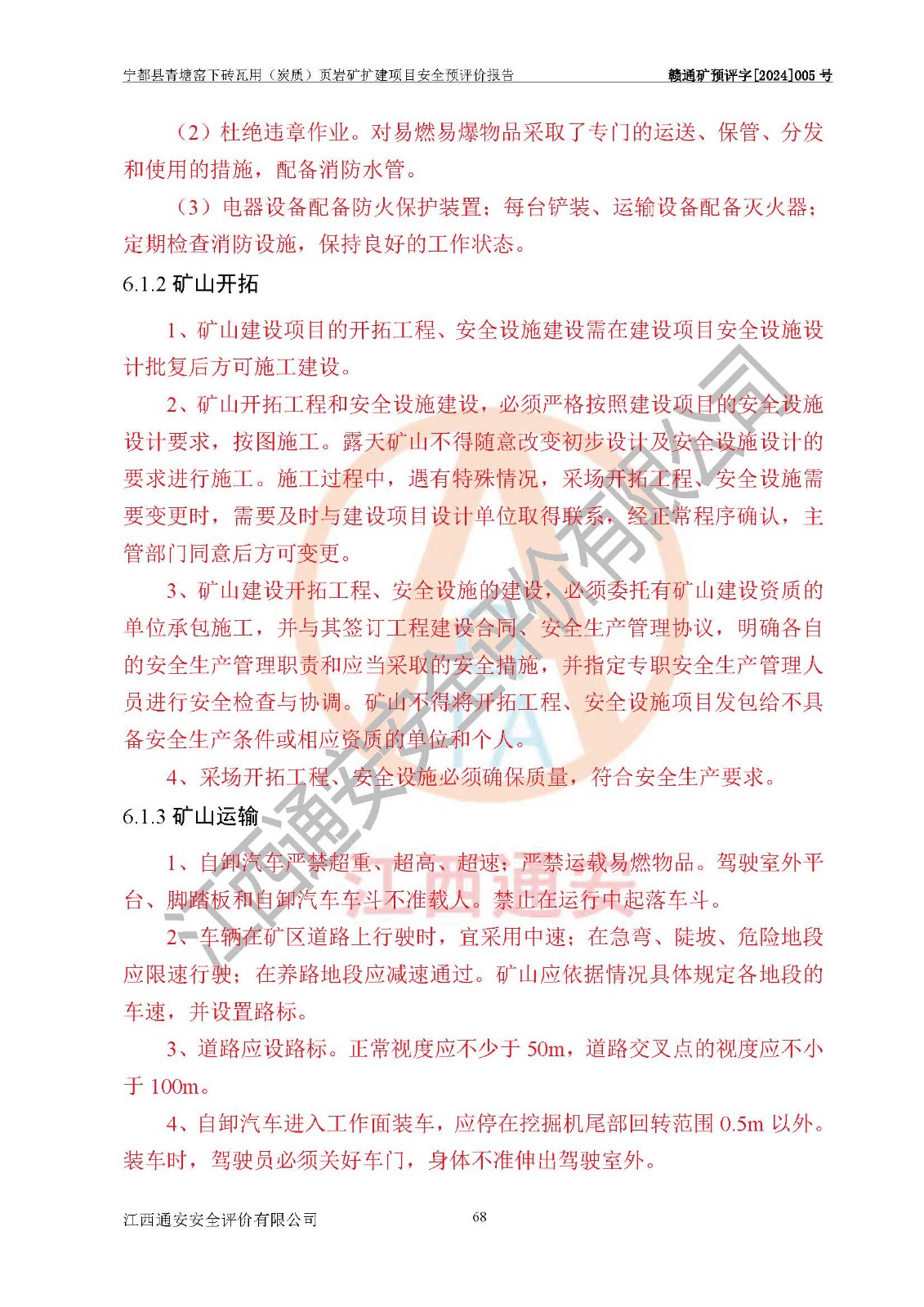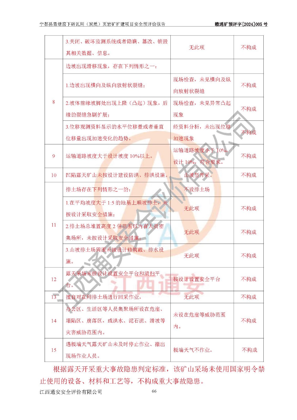 评价结论 | 宁都县青塘镇窑下矿区砖瓦用(炭质)页岩矿露天开采扩建项目存在的主要危险因素有:滑坡和坍塌、**伤害、高处坠落、物体打击、触电、机械伤害、火灾、水灾、淹溺。该扩建建设项目中存在的有害因素有:粉尘、不良作业环境,如高温、雷击对矿山人员的伤害和其他不利的环境因素等。上述主要危险、有害因素在采取本报告第六章中提出的安全对策措施后,能得到**控制。该露天开采扩建建设项目从安全生产角度符合**有关安全生产法律、法规、规章和技术标准的要求。