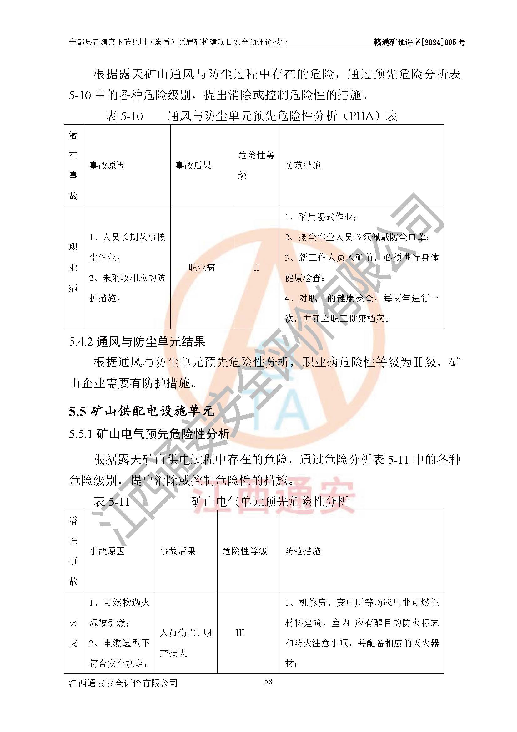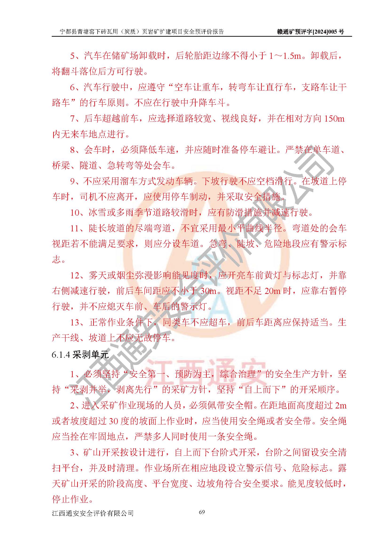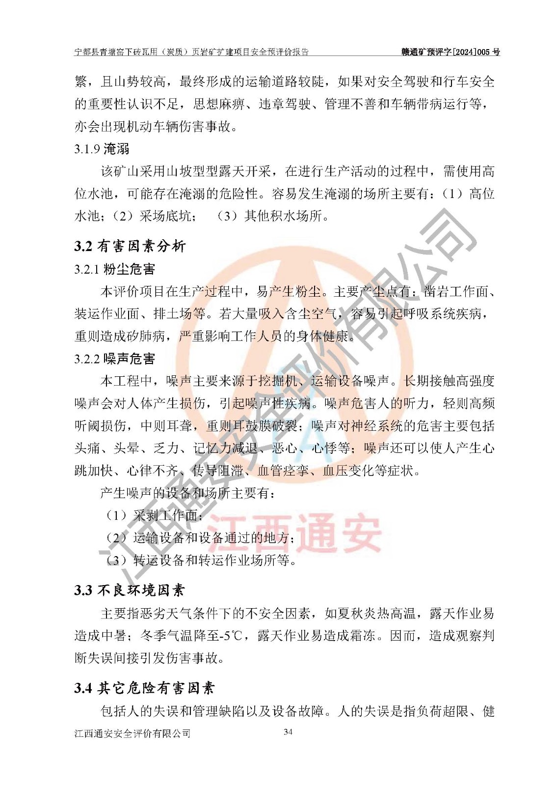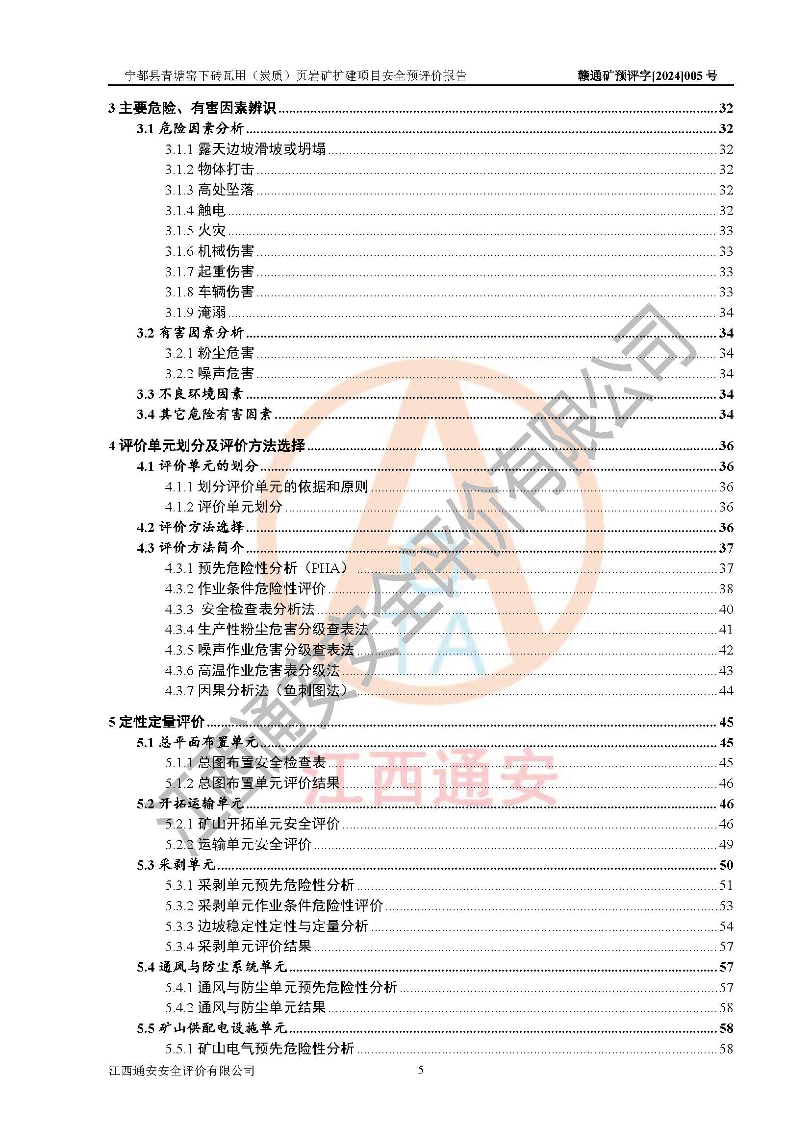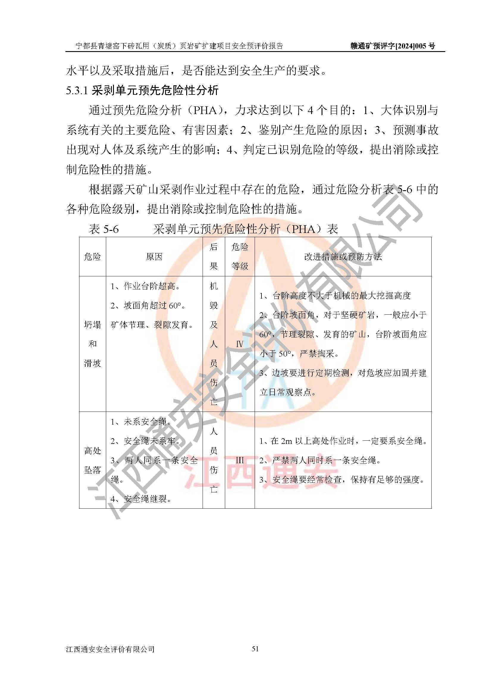 评价结论 | 宁都县青塘镇窑下矿区砖瓦用(炭质)页岩矿露天开采扩建项目存在的主要危险因素有:滑坡和坍塌、**伤害、高处坠落、物体打击、触电、机械伤害、火灾、水灾、淹溺。该扩建建设项目中存在的有害因素有:粉尘、不良作业环境,如高温、雷击对矿山人员的伤害和其他不利的环境因素等。上述主要危险、有害因素在采取本报告第六章中提出的安全对策措施后,能得到**控制。该露天开采扩建建设项目从安全生产角度符合**有关安全生产法律、法规、规章和技术标准的要求。