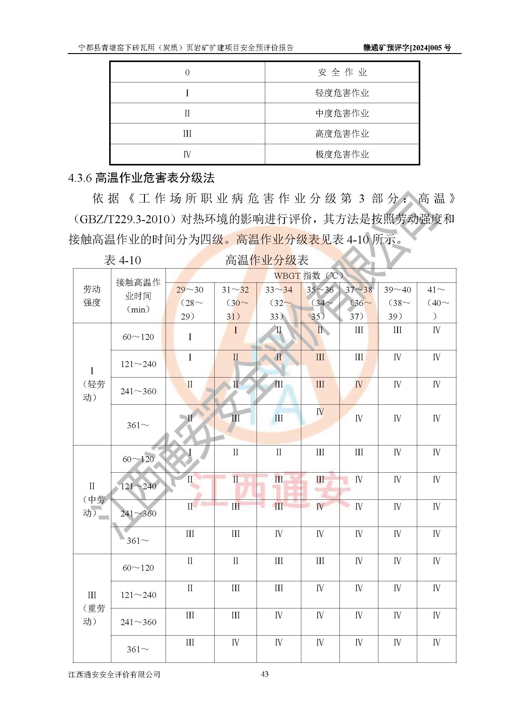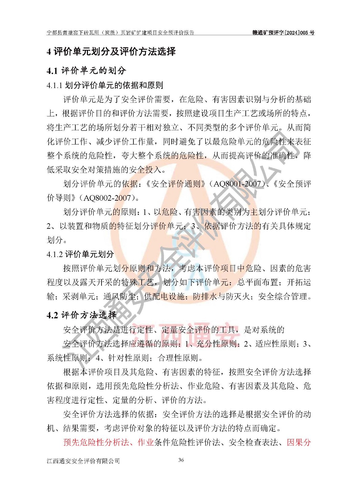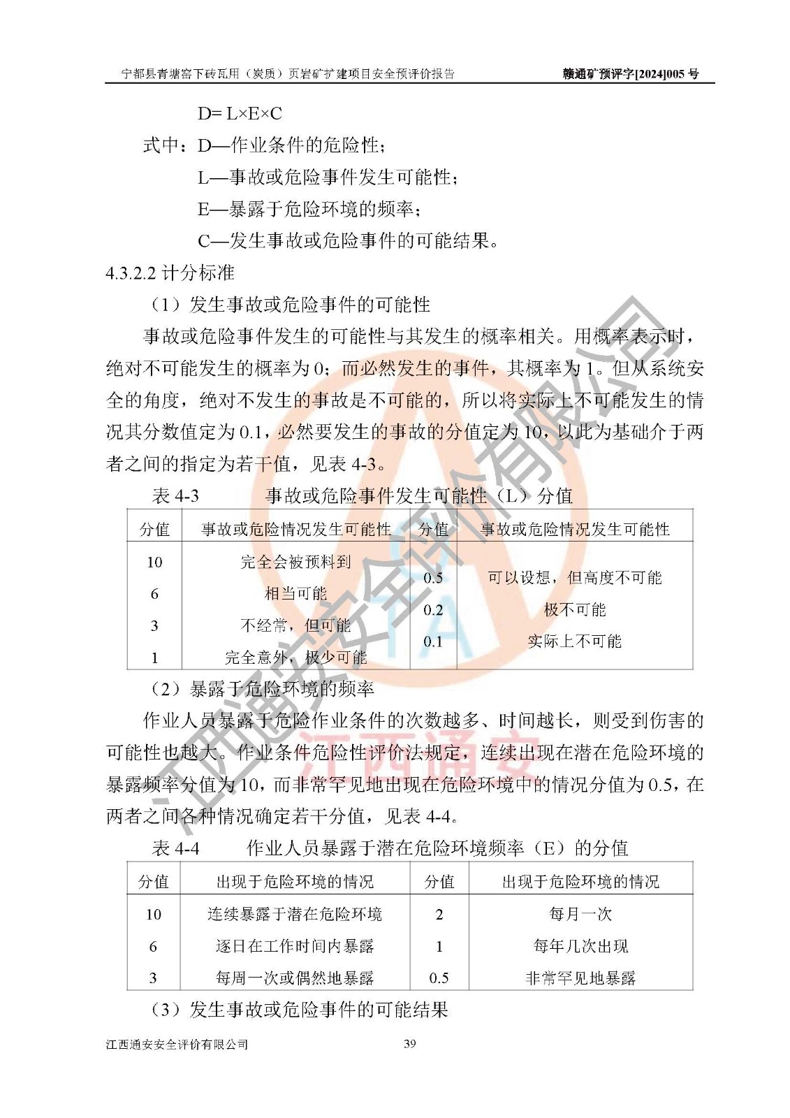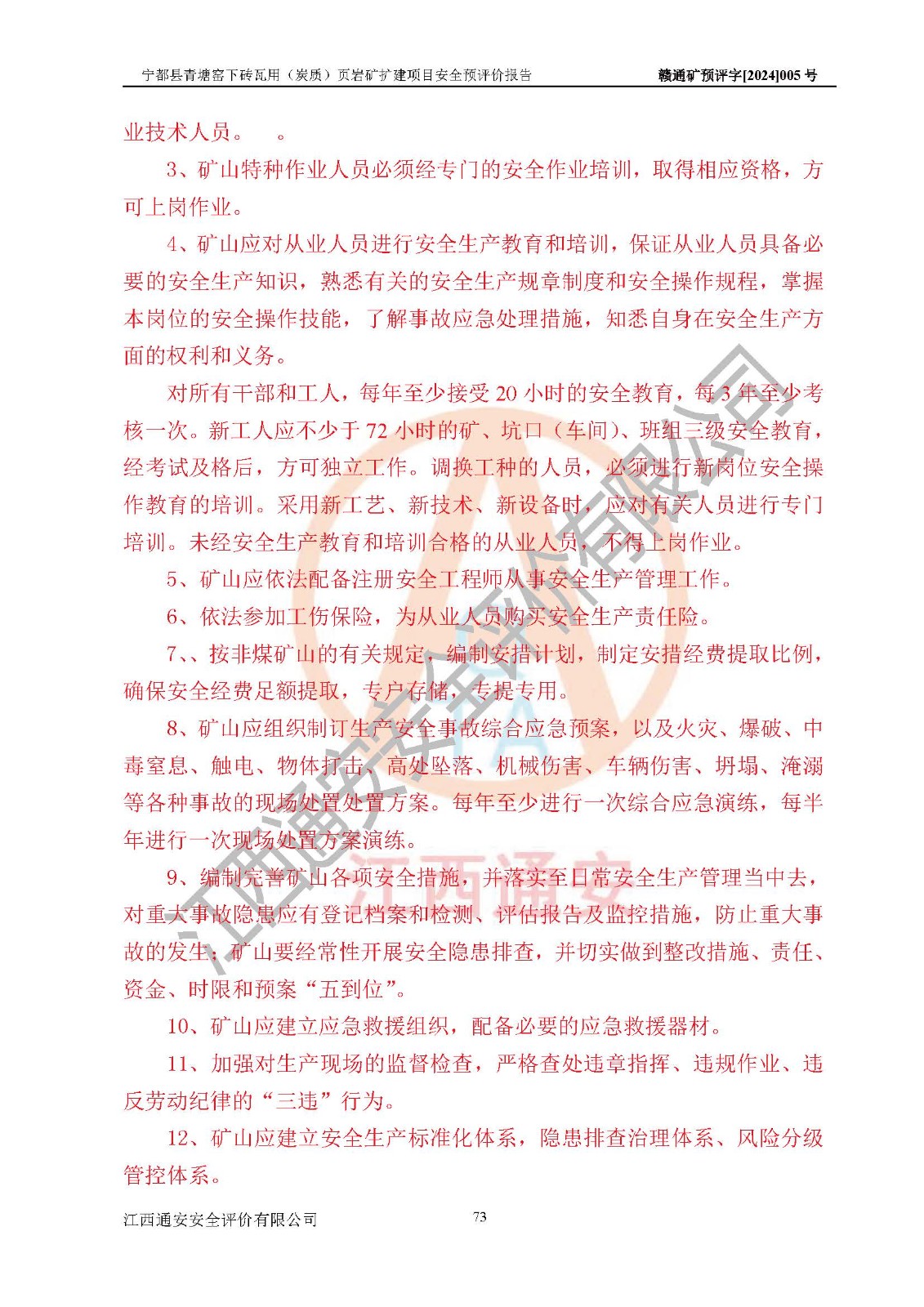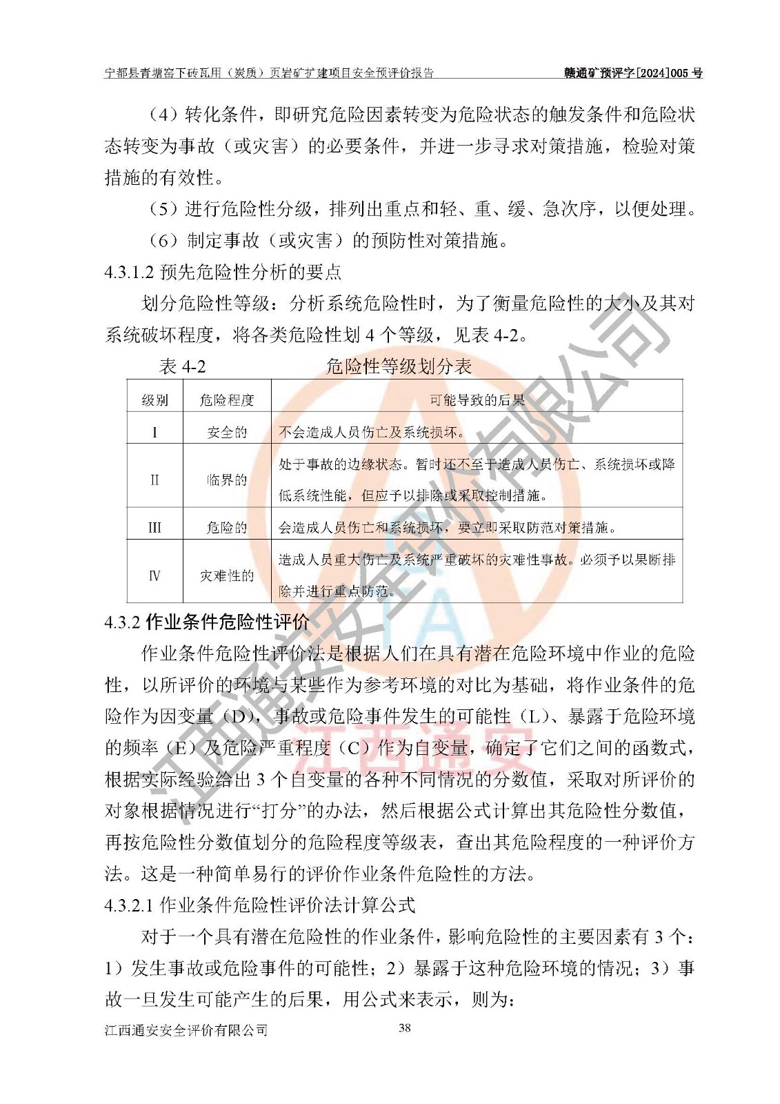 评价结论 | 宁都县青塘镇窑下矿区砖瓦用(炭质)页岩矿露天开采扩建项目存在的主要危险因素有:滑坡和坍塌、**伤害、高处坠落、物体打击、触电、机械伤害、火灾、水灾、淹溺。该扩建建设项目中存在的有害因素有:粉尘、不良作业环境,如高温、雷击对矿山人员的伤害和其他不利的环境因素等。上述主要危险、有害因素在采取本报告第六章中提出的安全对策措施后,能得到**控制。该露天开采扩建建设项目从安全生产角度符合**有关安全生产法律、法规、规章和技术标准的要求。