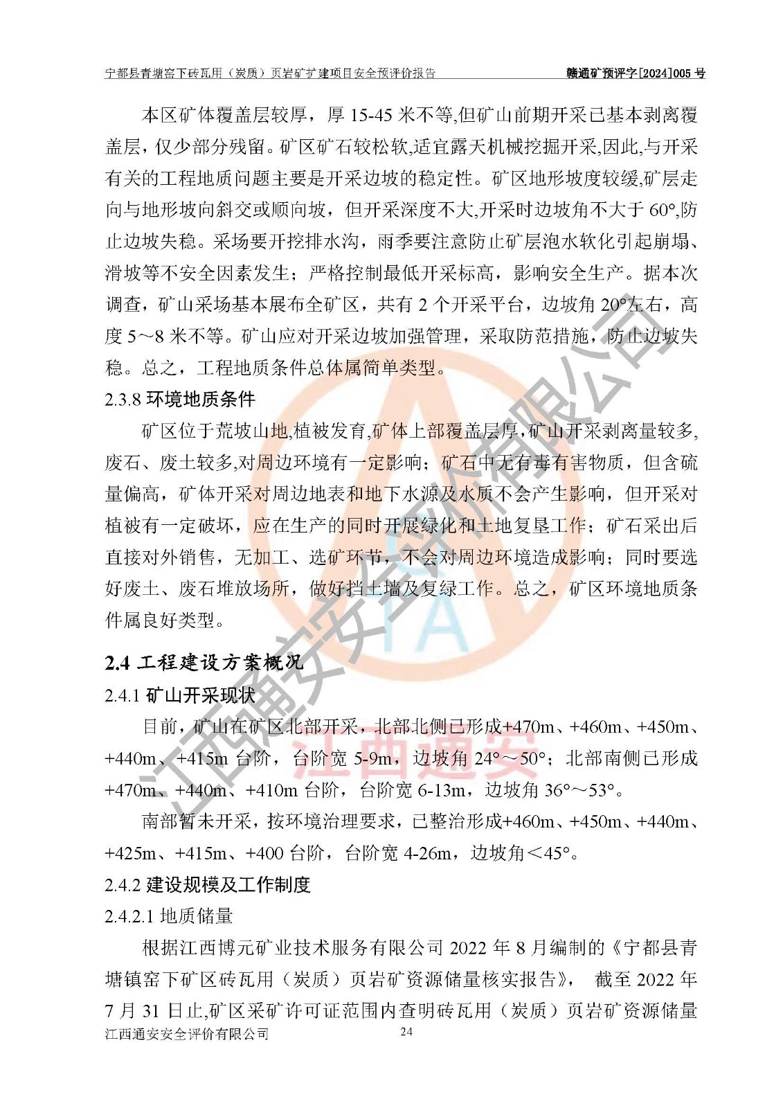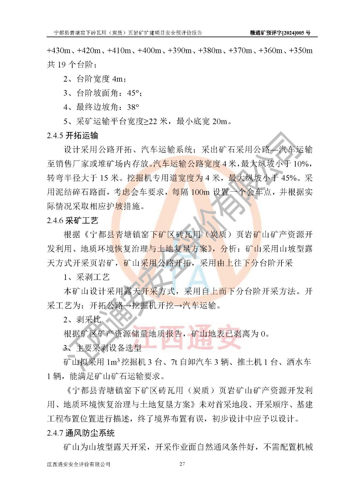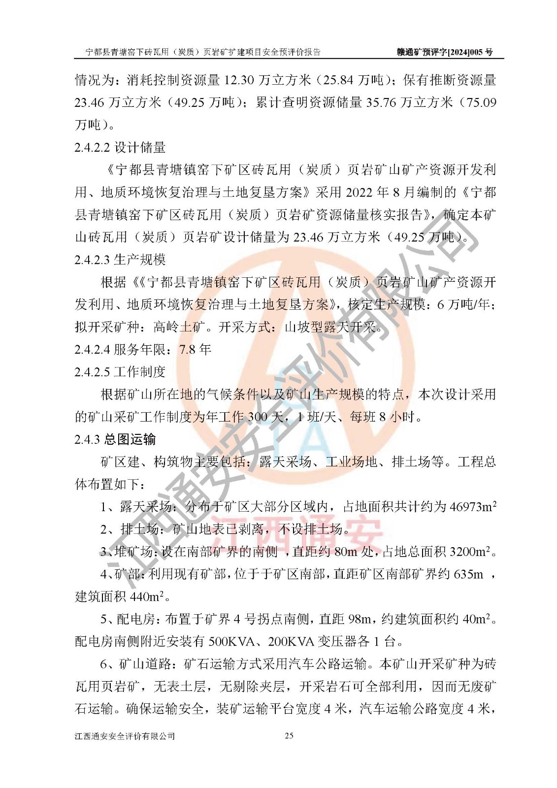 项目简介 | 宁都县青塘窑下砖瓦用(炭质)页岩矿矿权*初于2013年2月18日通过挂牌出让的方式有偿取得,出让方为宁都县矿产资源管理局,受让方为宁都县大祥和机砖制造有限公司。2014年9月1日,矿权进行了**,矿业权人变更为宁都县裕元矿业有限公司。 2021年1月,宁都县裕元矿业有限公司曾委托湖南联盛勘察设计有限公司编制了《宁都县裕元矿业有限公司宁都县青塘窑下砖瓦用(炭质)页岩矿露天开采项目初步设计及安全设施设计》,设计生产规模5万吨/年。之后经验收,矿山于2021年08月03日取得了赣州市行政审批局颁发的安全生产许可证,编号:(赣)FM安许证字[2021]B0033号,单位名称:宁都县裕元矿业有限公司宁都县青塘窑下砖瓦用(炭质)页岩矿,主要负责人:宋章生,单位地址:赣州市宁都县青塘窑下,经济类型:有限责任公司,许可范围:允许开采深度+478m-+410m,开采矿种:砖瓦用页岩矿露天开采,生产规模:5万吨,设计开采台阶+470m、+460m、+450m、+440m、+430m、+420m、+410m共7个台阶,台阶**:8m/10m,工作台阶坡面角:≤50°,*终境界边坡角50°-41°,**期:2021年08月03日至2024年08月02日。 2022年8月,根据《江西省自然资源厅办公室关于进一步加强露天矿山管理的通知》(赣自然资办发[2021]86号)文件精神,宁都县裕元矿业有限公司履行采矿许可证生产规模5万吨/年调整为6万吨/年有关手续,委托江西博元矿业技术服务有限公司编制了《宁都县青塘镇窑下矿区砖瓦用(炭质)页岩矿资源储量核实报告》。2022年8月24日获“关于《宁都县青塘镇窑下矿区砖瓦用炭质页岩矿资源储量核实报告》矿产资源储量评审备案的复函”(宁自然储备字[2022]01号)。2022年8月委托江西博元矿业技术服务有限公司编制了《宁都县青塘镇窑下矿区砖瓦用(炭质)页岩矿山矿产资源开发利用、地质环境恢复治理与土地复垦方案》该方案采用山坡型露天开采,汽车开拓运输,生产规模6万吨/年。2023年8月15日,宁都县自然资源局为该矿山颁发了新采矿许可证,将该矿生产规模由原5万吨/年调整为6万吨/年。 该公司现持宁都县自然资源局换发的采矿许可证,证号:3607302013047130131146,**期2023年08月25日至2024年08月25日;开采矿种:砖瓦用页岩;开采方式:露天开采;生产规模:6万吨/年;开采深度:由540米标高至350米标高。导致《采矿许可证》许可生产规模6万吨/年与现持《安全生产许可证》许可生产规模5万吨/年不一致。 根据《中华人民共和国安全生产法》、《矿山安全法》、《安全生产许可证条例》、《建设项目安全设施“三同时”监督管理办法》和《非煤矿山安全生产许可证实施办法》等有关法律、法规关于建设项目安全设施“三同时”的规定,以及《赣州市安委会办公室关于加强砖瓦用页岩等矿山安全生产工作的紧急通知》文件精神(赣市安办〔2019〕60号),矿山应重新履行“三同时”手续。2024年5月29日,该扩建项目已经宁都县行政审批局备案(项目统一代码2405-360730-04-01-985821)。2024年5月,宁都县裕元矿业有限公司委托江西通安安全评价有限公司编制《宁都县裕元矿业有限公司宁都县青塘窑下砖瓦用(炭质)页岩矿扩建项目安全预评价报告》。 评价项目名称:宁都县青塘窑下砖瓦用(炭质)页岩矿扩建项目。 安全预评价范围:对《采矿许可证》划定矿区范围内的砖瓦用(炭质)页岩矿露天开采活动以及地表工业场地、设施可能存在的主要危险、有害因素进行辨识,定性、定量的分析评价,预防和控制主要危险、有害因素的可能性及其对公共安全的影响,提出安全对策措施。 本评价报告不包括矿山加工厂、危险化学品使用场所 | ||||