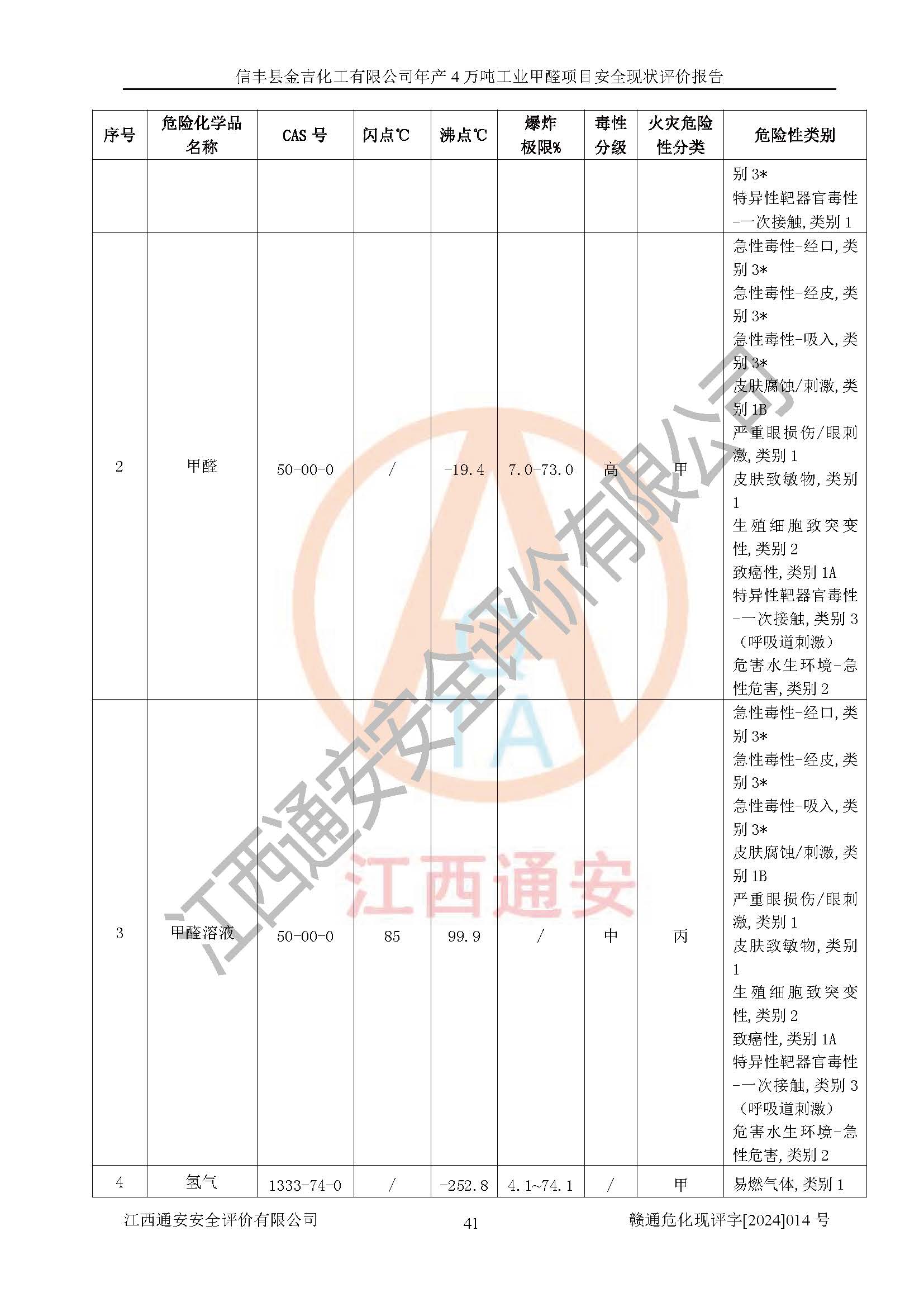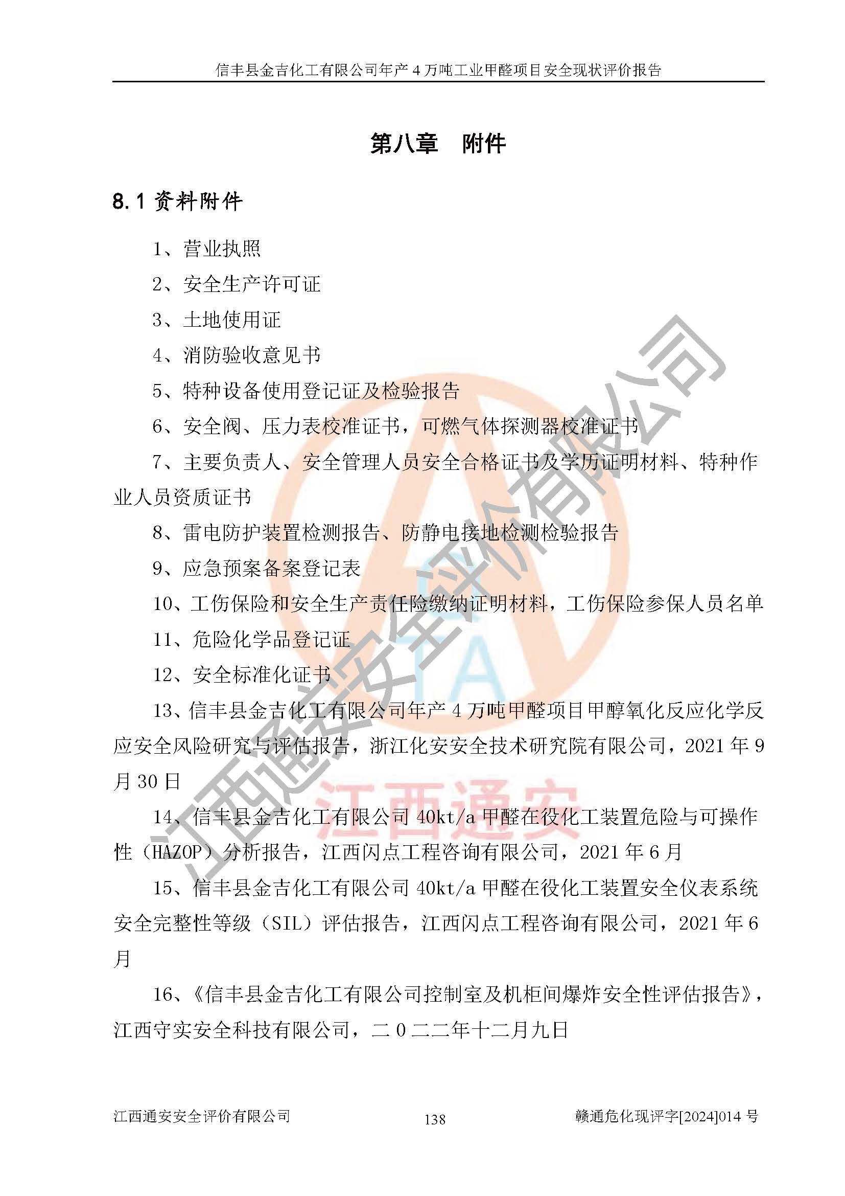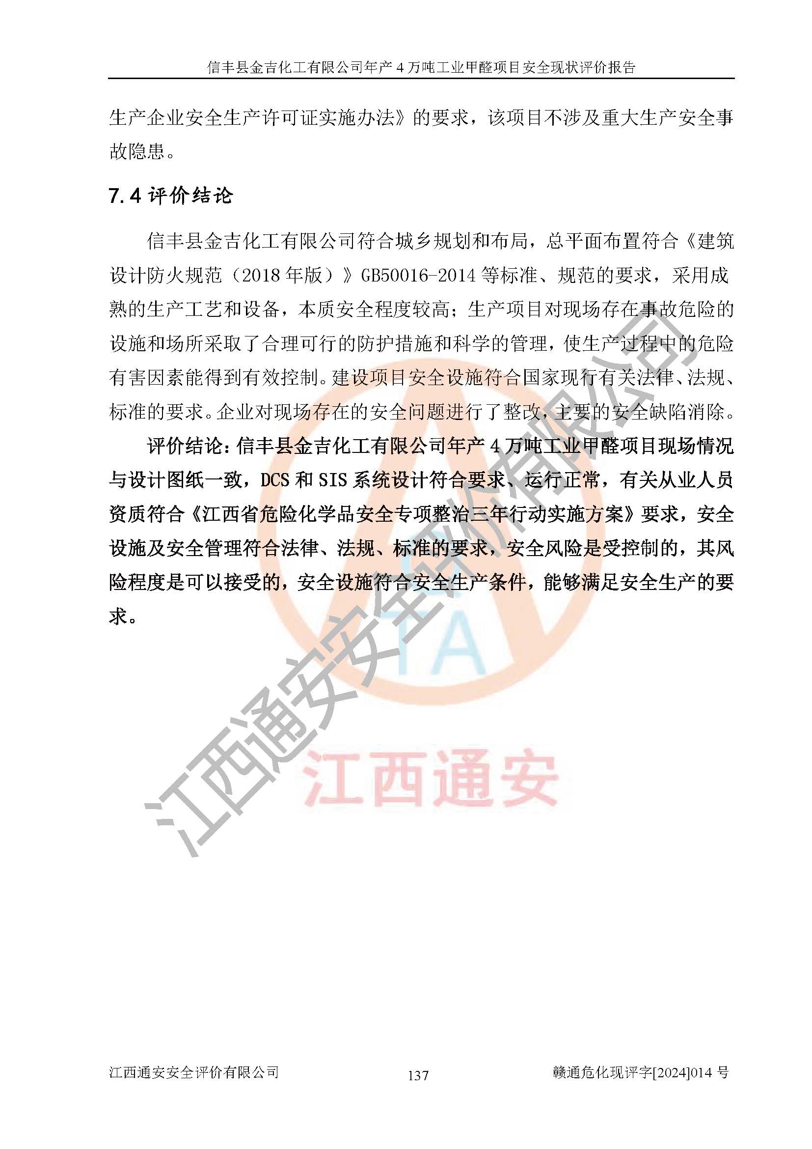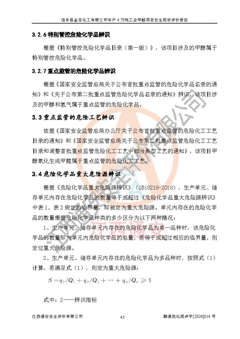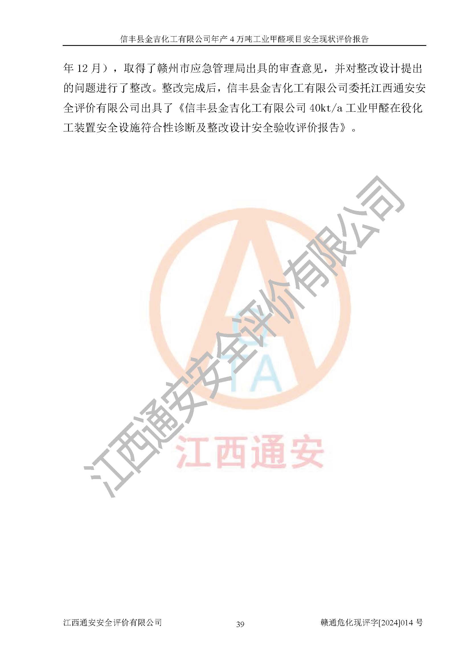 评价结论 | 信丰县金吉化工有限公司年产4万吨工业甲醛项目现场情况与设计图纸一致,DCS和SIS系统设计符合要求、运行正常,有关从业人员资质符合《江西省危险化学品安全专项整治三年行动实施方案》要求,安全设施及安全管理符合法律、法规、标准的要求,安全风险是受控制的,其风险程度是可以接受的,安全设施符合安全生产条件,能够满足安全生产的要求。 | ||||||