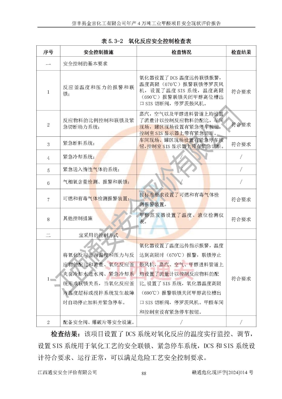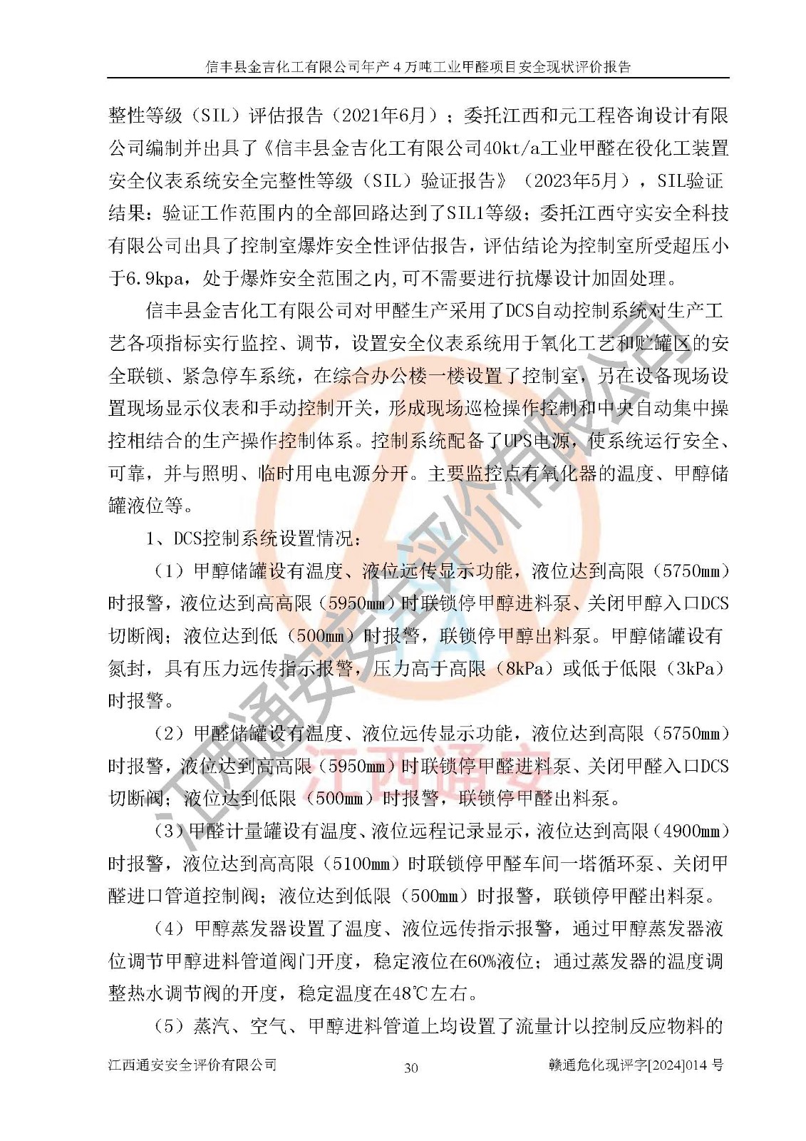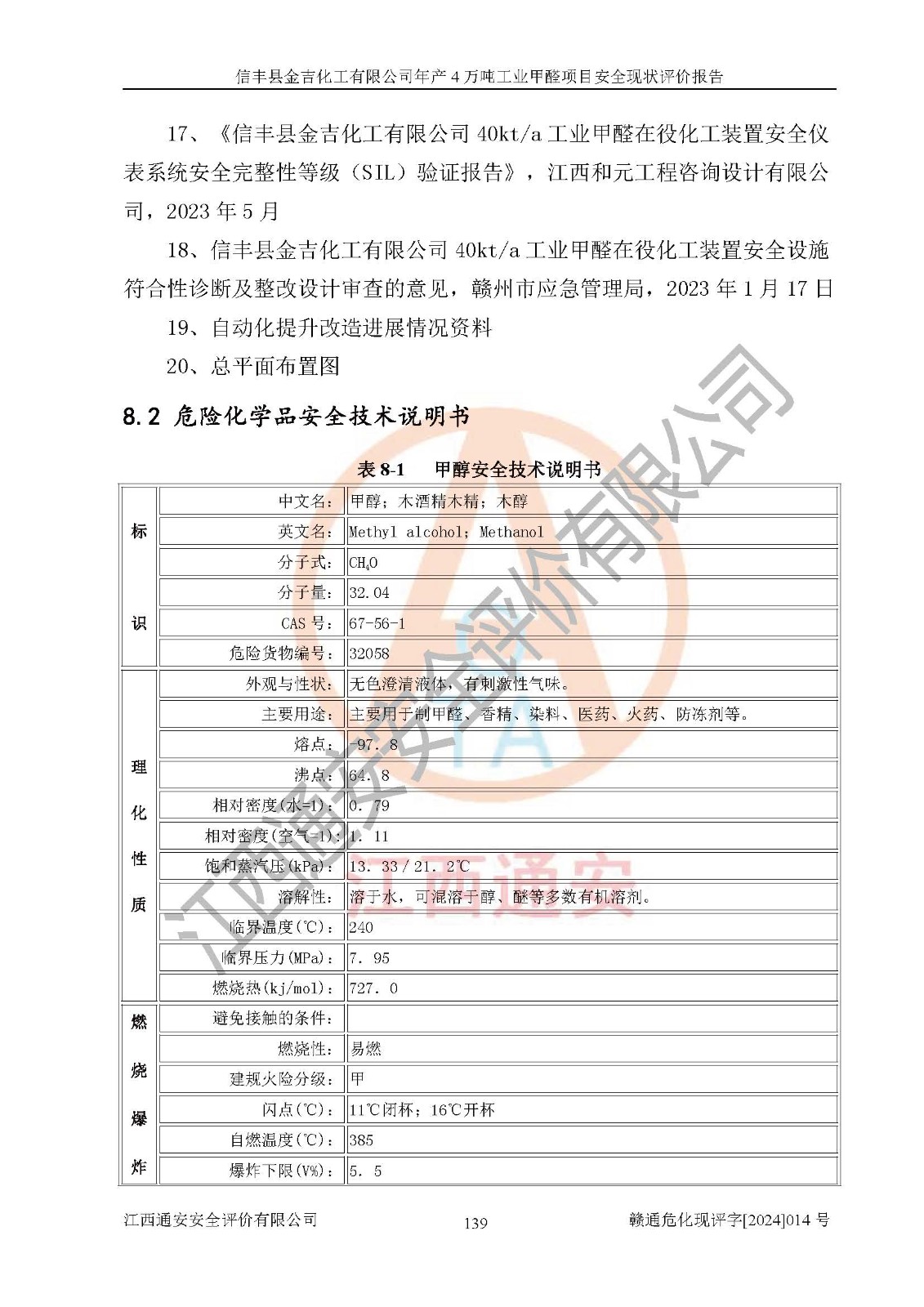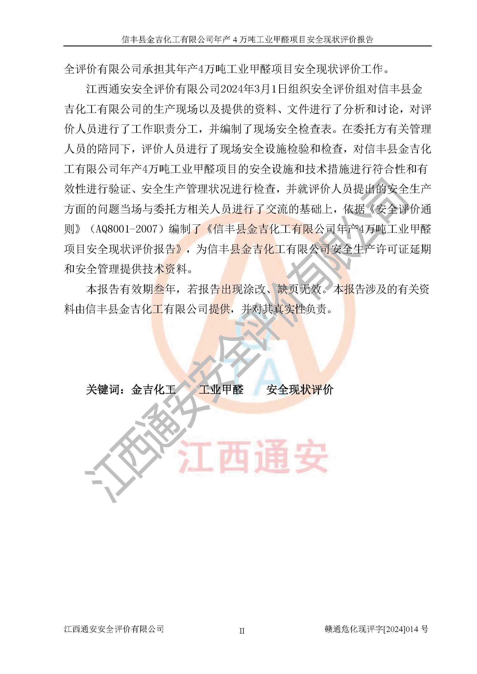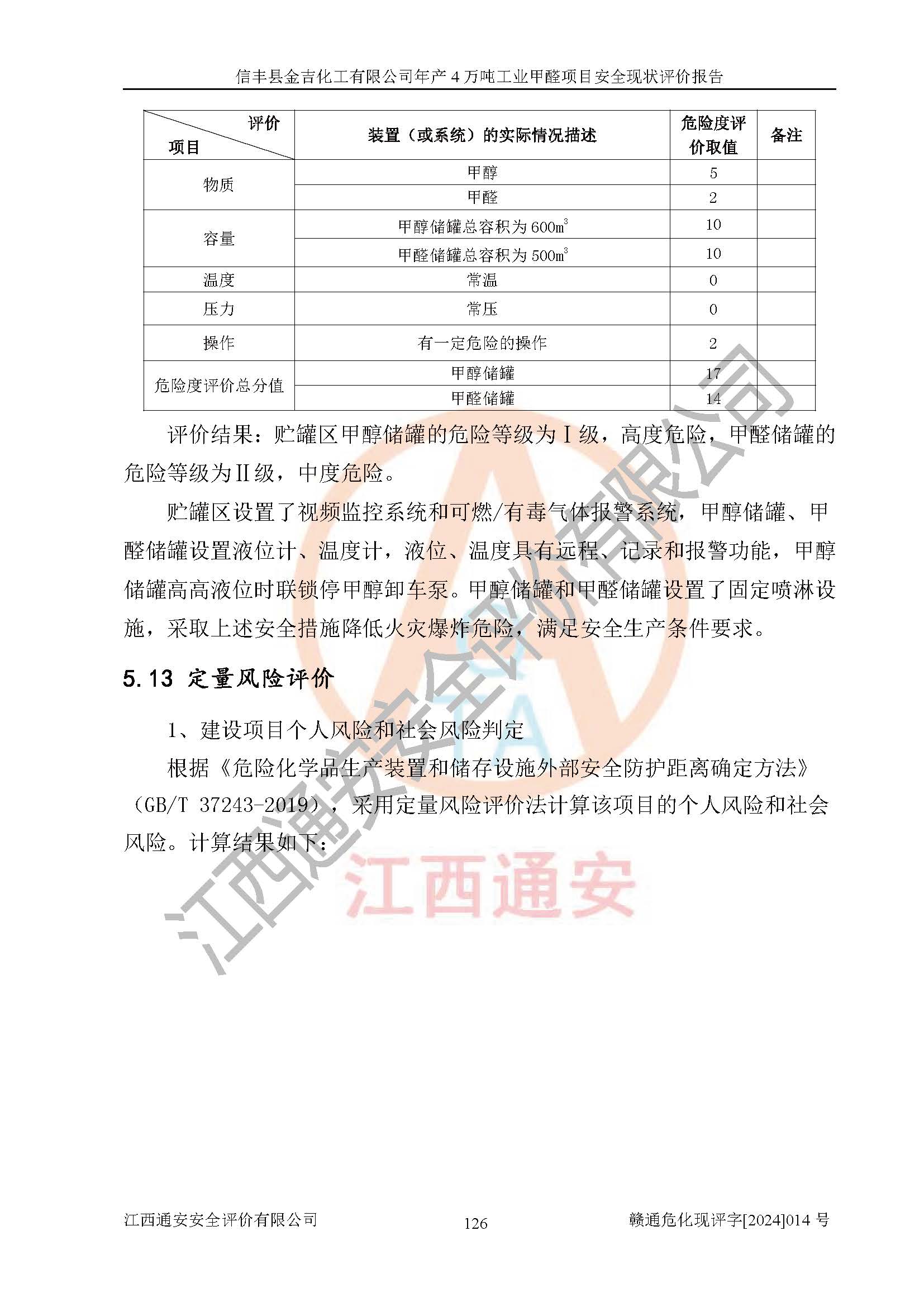 评价结论 | 信丰县金吉化工有限公司年产4万吨工业甲醛项目现场情况与设计图纸一致,DCS和SIS系统设计符合要求、运行正常,有关从业人员资质符合《江西省危险化学品安全专项整治三年行动实施方案》要求,安全设施及安全管理符合法律、法规、标准的要求,安全风险是受控制的,其风险程度是可以接受的,安全设施符合安全生产条件,能够满足安全生产的要求。 | ||||||