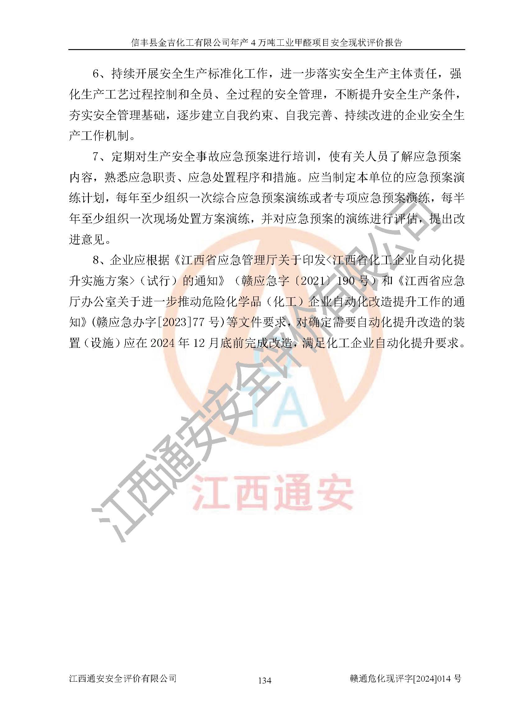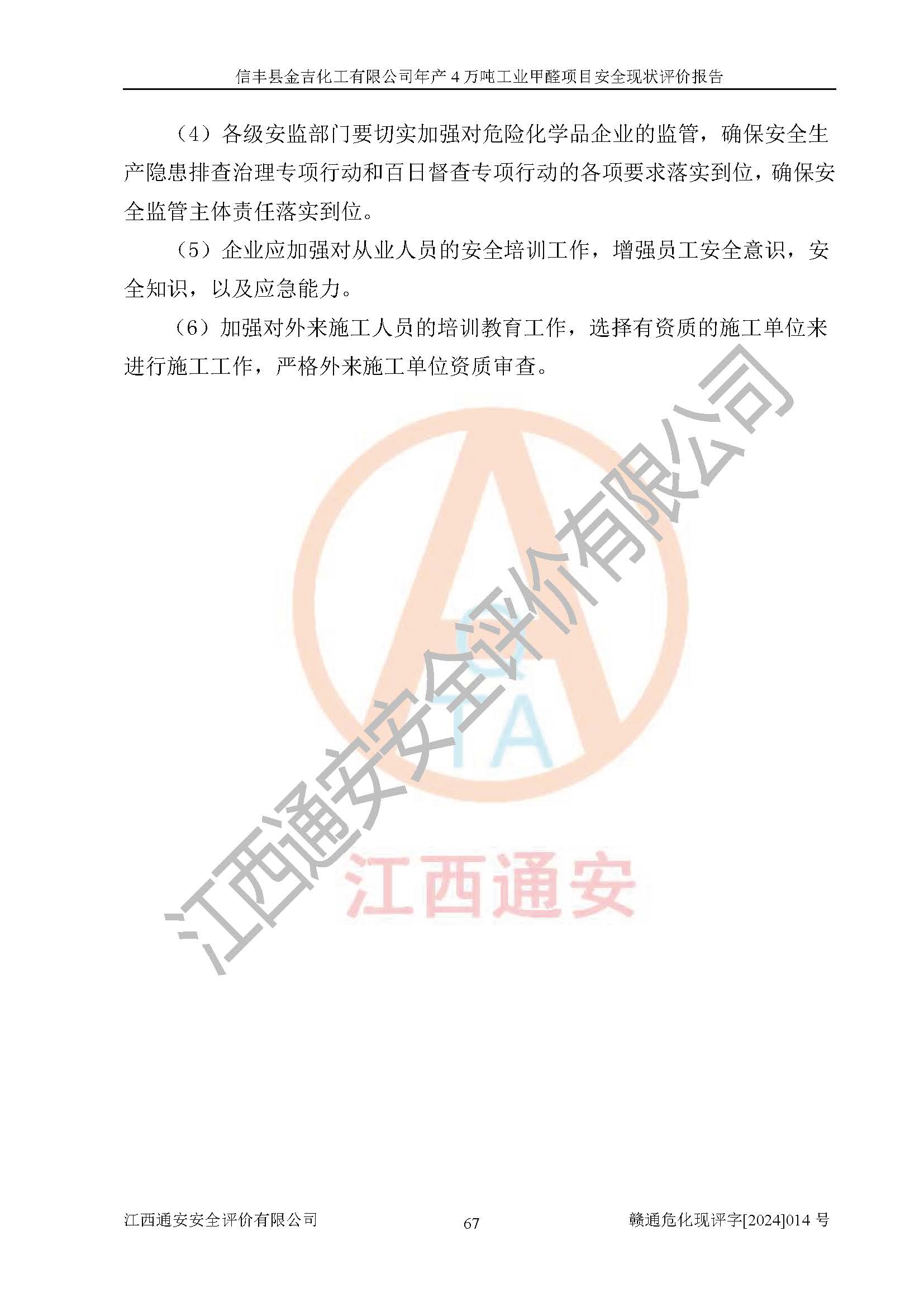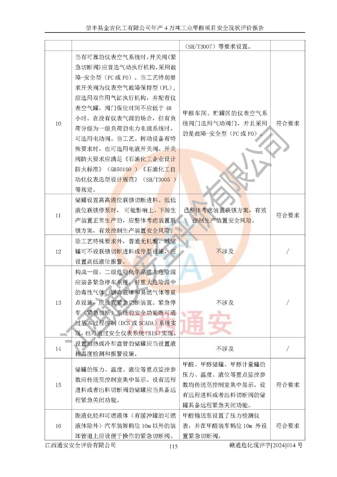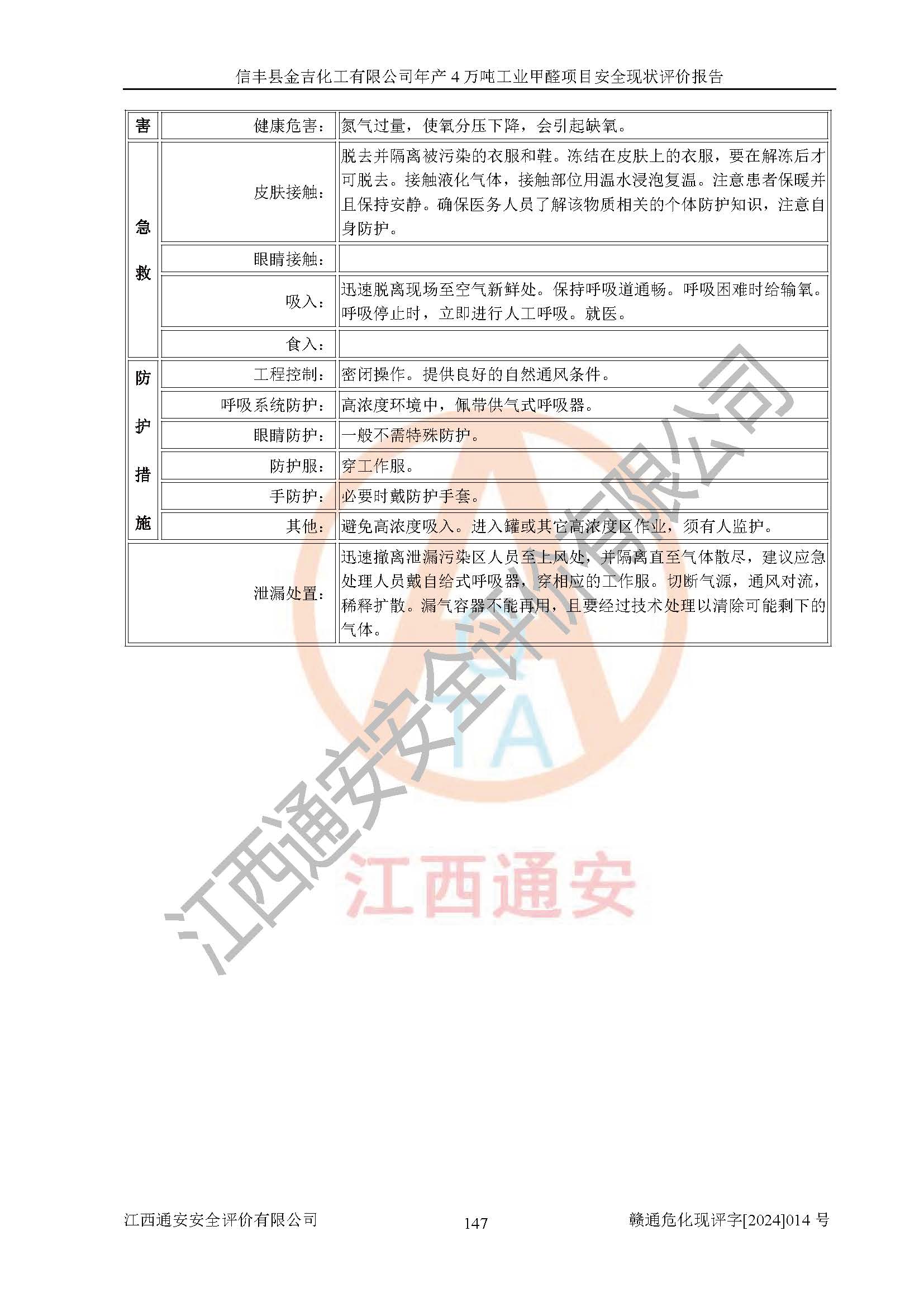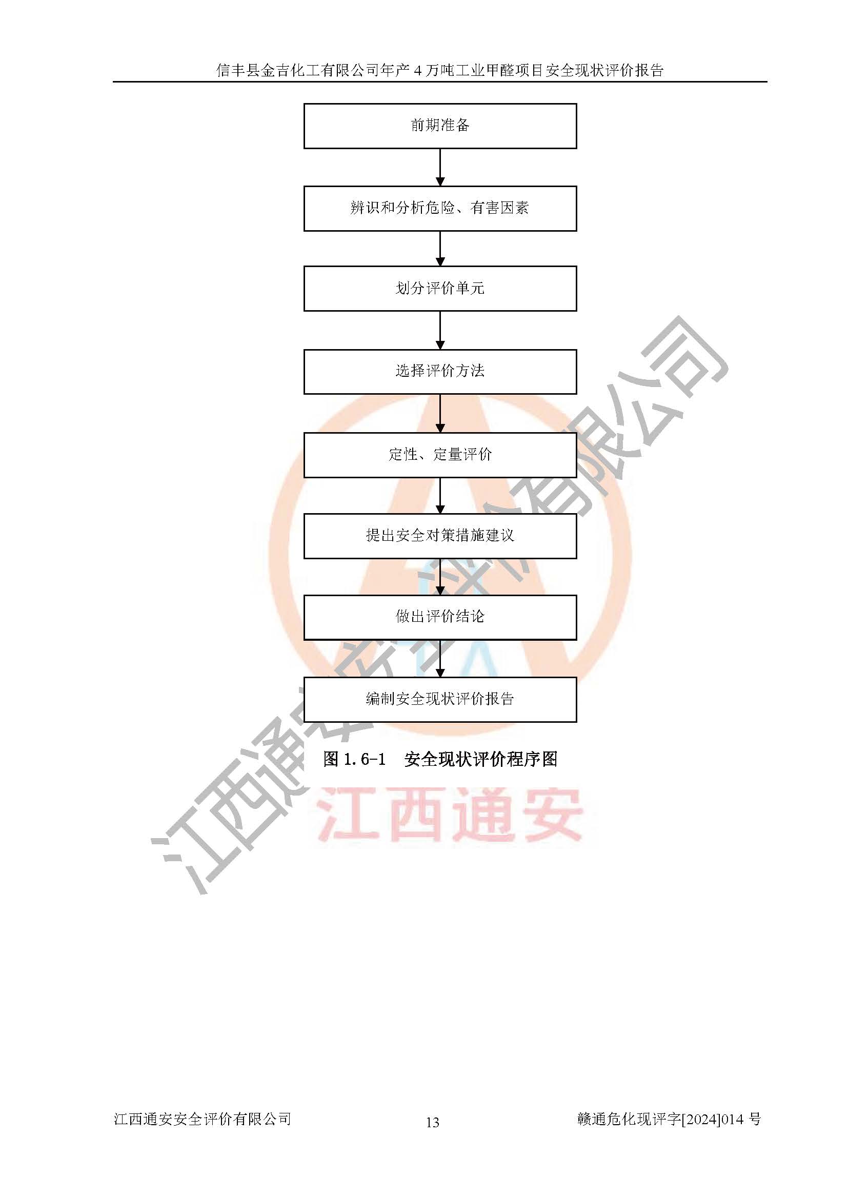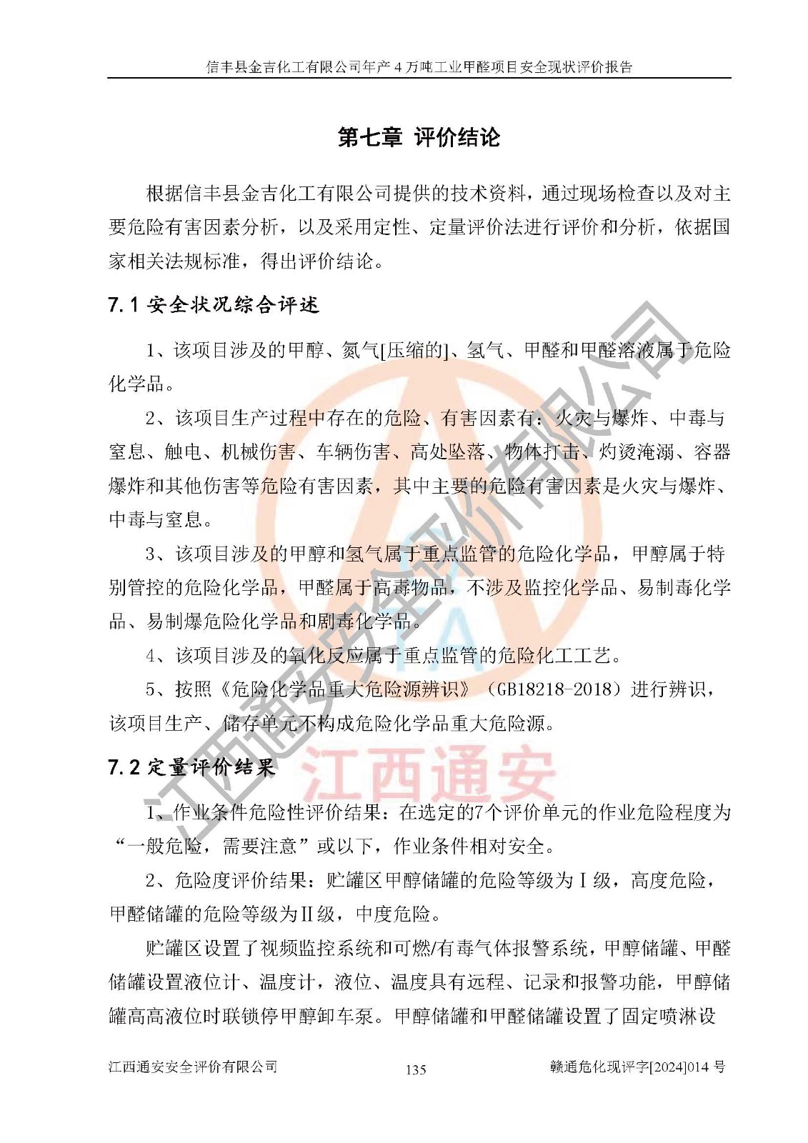 评价结论 | 信丰县金吉化工有限公司年产4万吨工业甲醛项目现场情况与设计图纸一致,DCS和SIS系统设计符合要求、运行正常,有关从业人员资质符合《江西省危险化学品安全专项整治三年行动实施方案》要求,安全设施及安全管理符合法律、法规、标准的要求,安全风险是受控制的,其风险程度是可以接受的,安全设施符合安全生产条件,能够满足安全生产的要求。 | ||||||