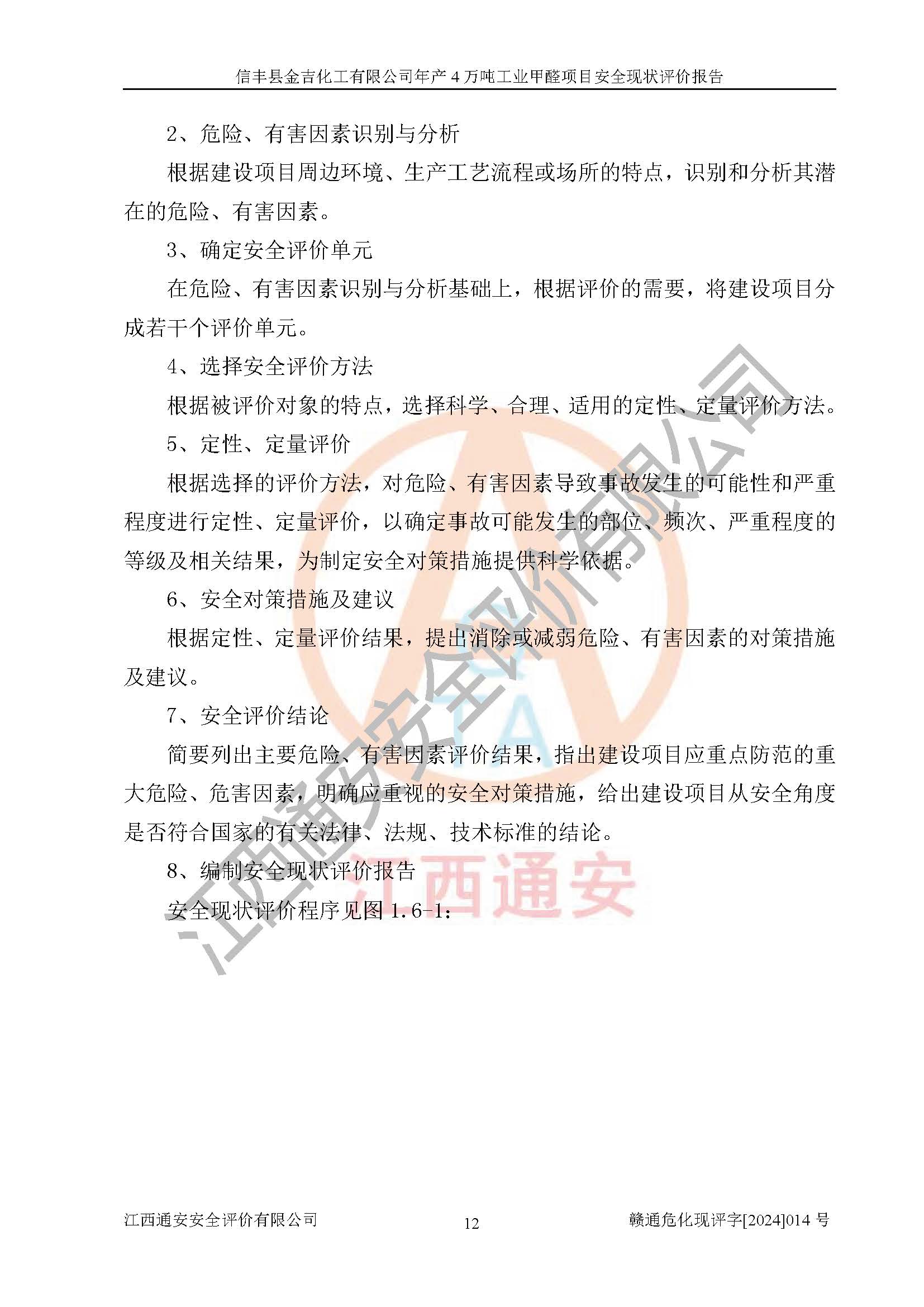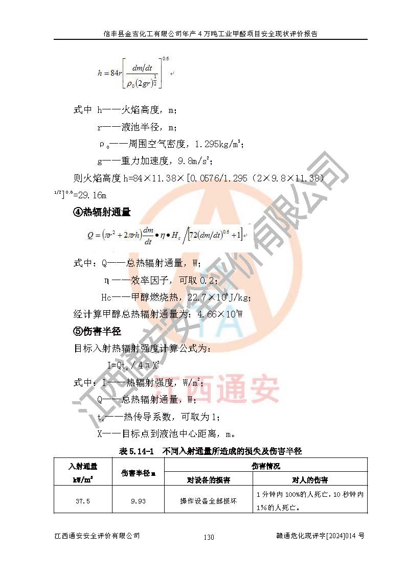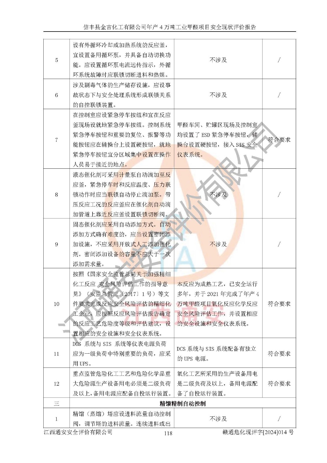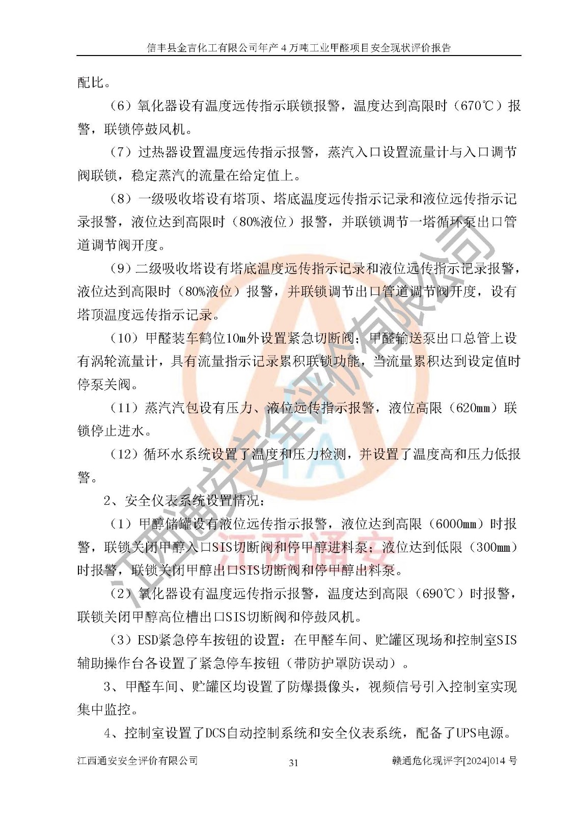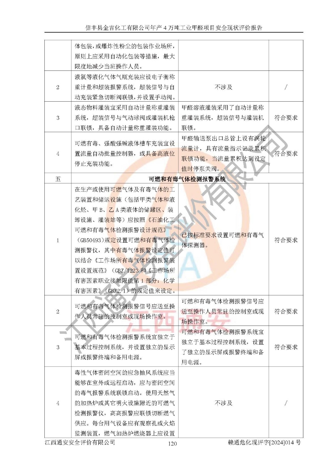 评价结论 | 信丰县金吉化工有限公司年产4万吨工业甲醛项目现场情况与设计图纸一致,DCS和SIS系统设计符合要求、运行正常,有关从业人员资质符合《江西省危险化学品安全专项整治三年行动实施方案》要求,安全设施及安全管理符合法律、法规、标准的要求,安全风险是受控制的,其风险程度是可以接受的,安全设施符合安全生产条件,能够满足安全生产的要求。 | ||||||
