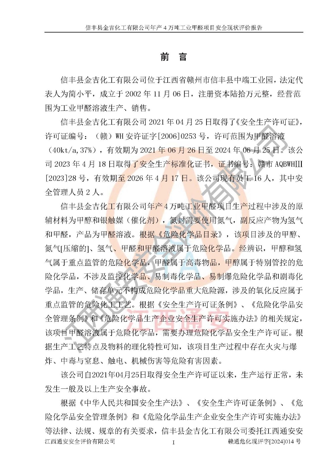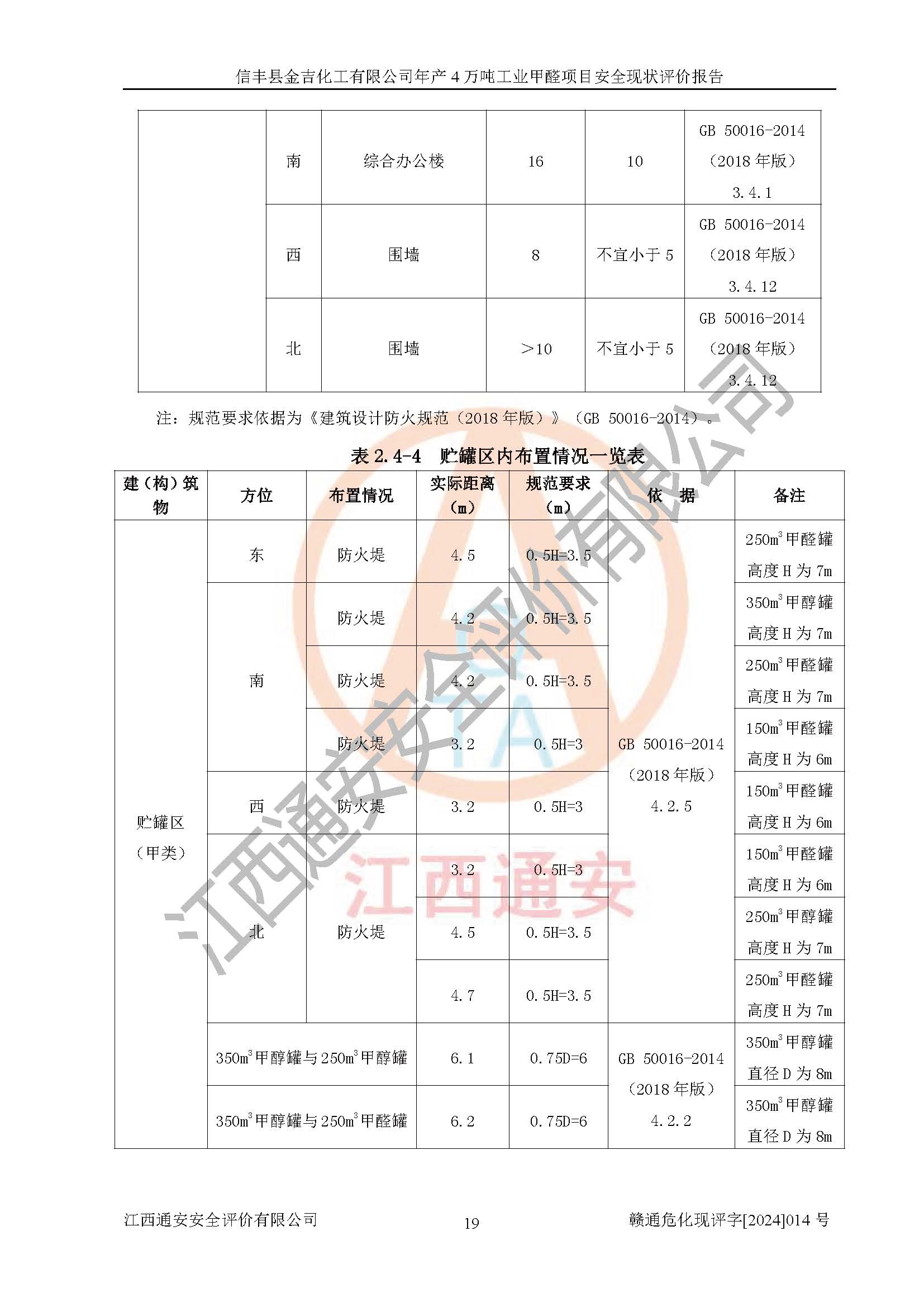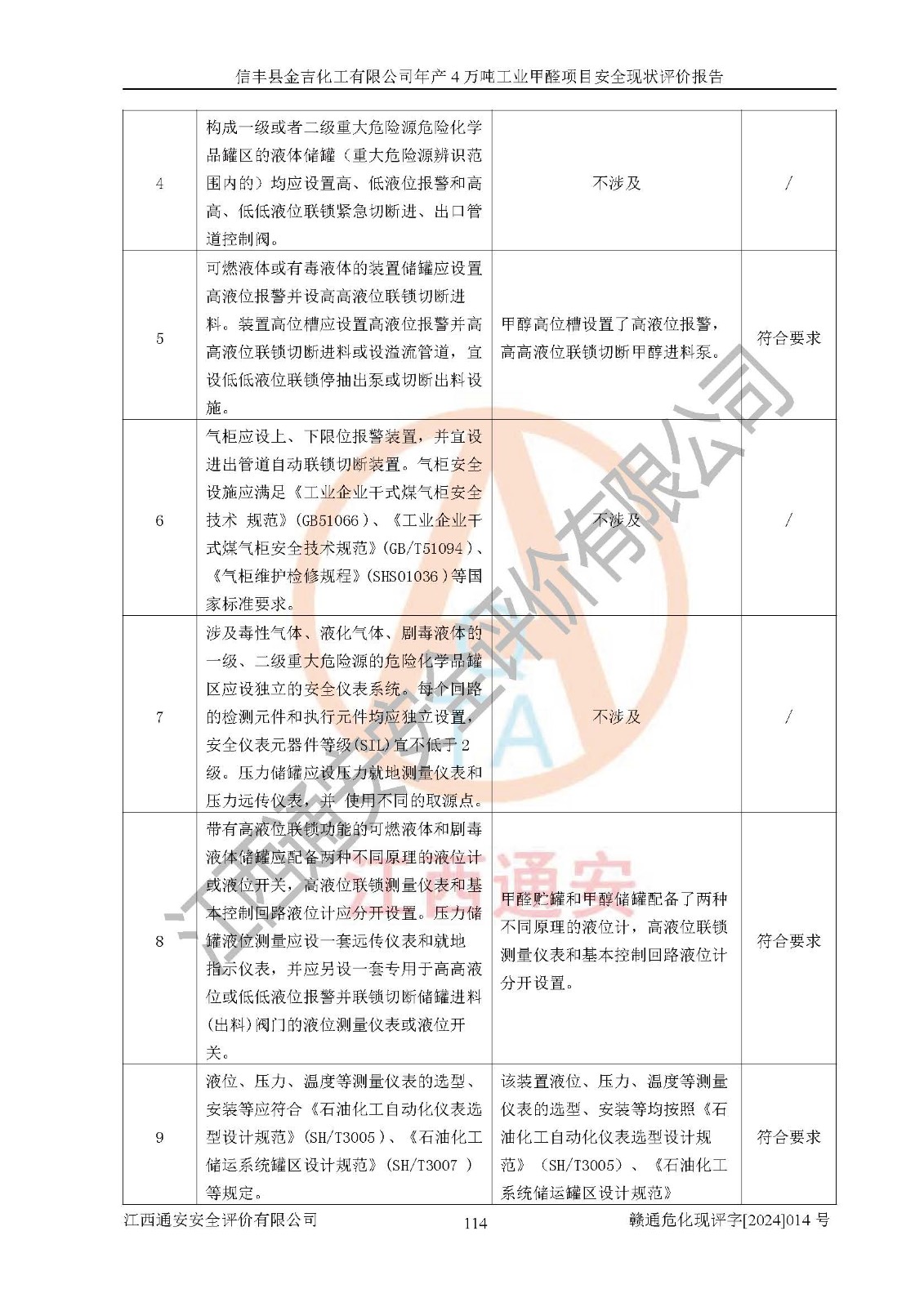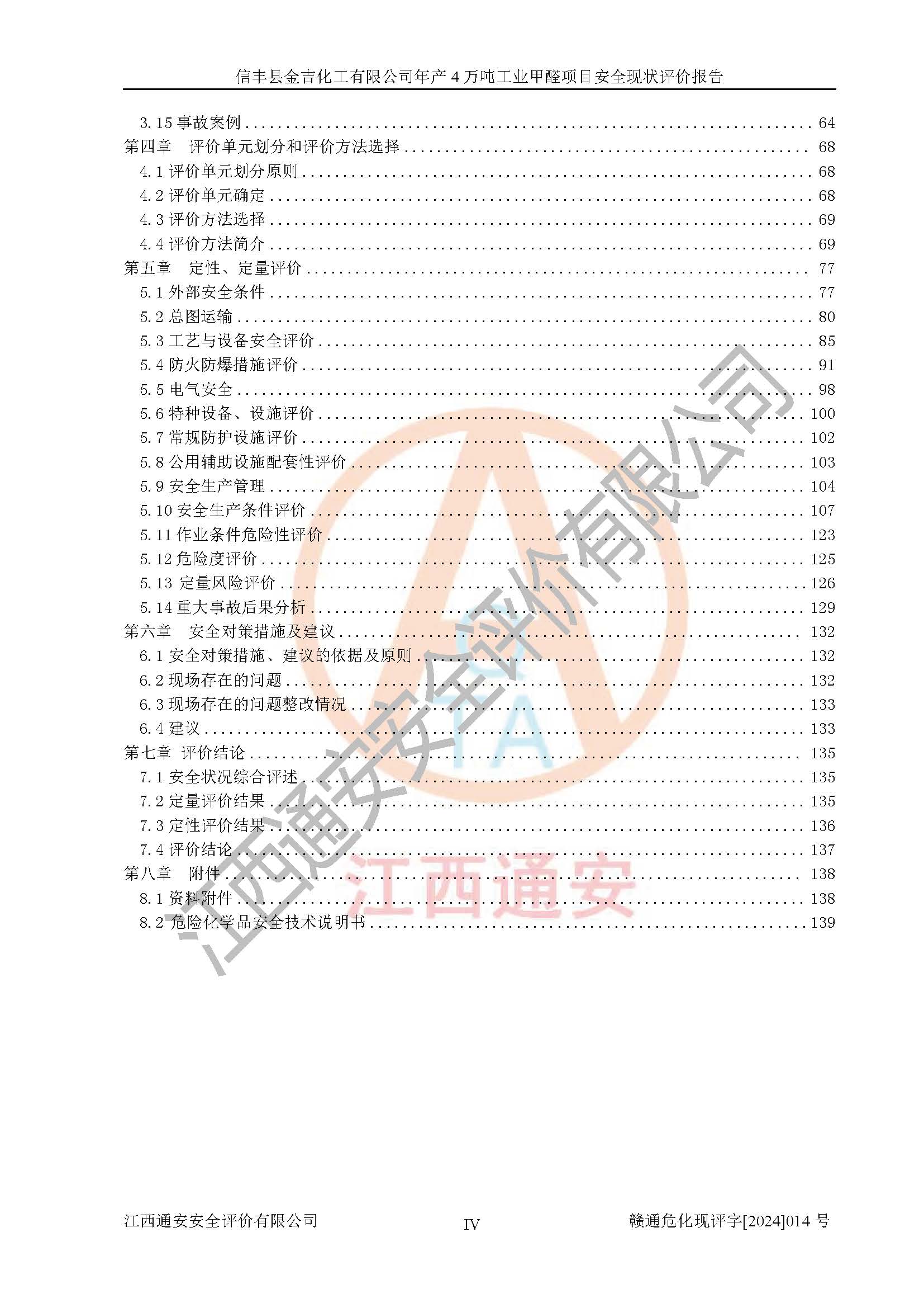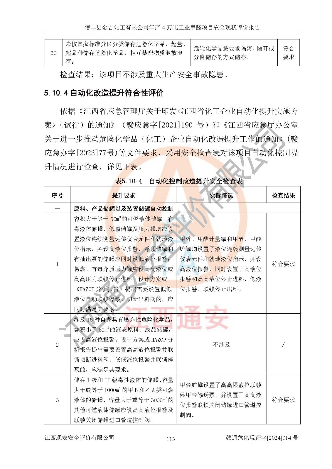 评价结论 | 信丰县金吉化工有限公司年产4万吨工业甲醛项目现场情况与设计图纸一致,DCS和SIS系统设计符合要求、运行正常,有关从业人员资质符合《江西省危险化学品安全专项整治三年行动实施方案》要求,安全设施及安全管理符合法律、法规、标准的要求,安全风险是受控制的,其风险程度是可以接受的,安全设施符合安全生产条件,能够满足安全生产的要求。 | ||||||