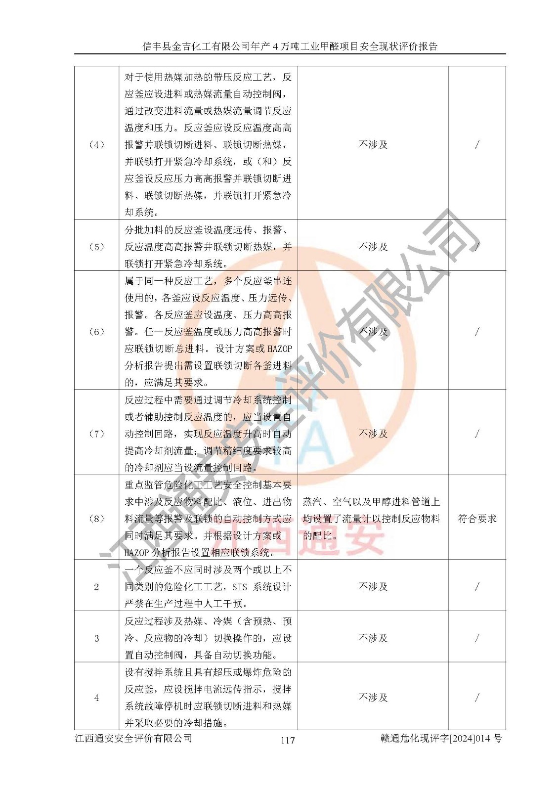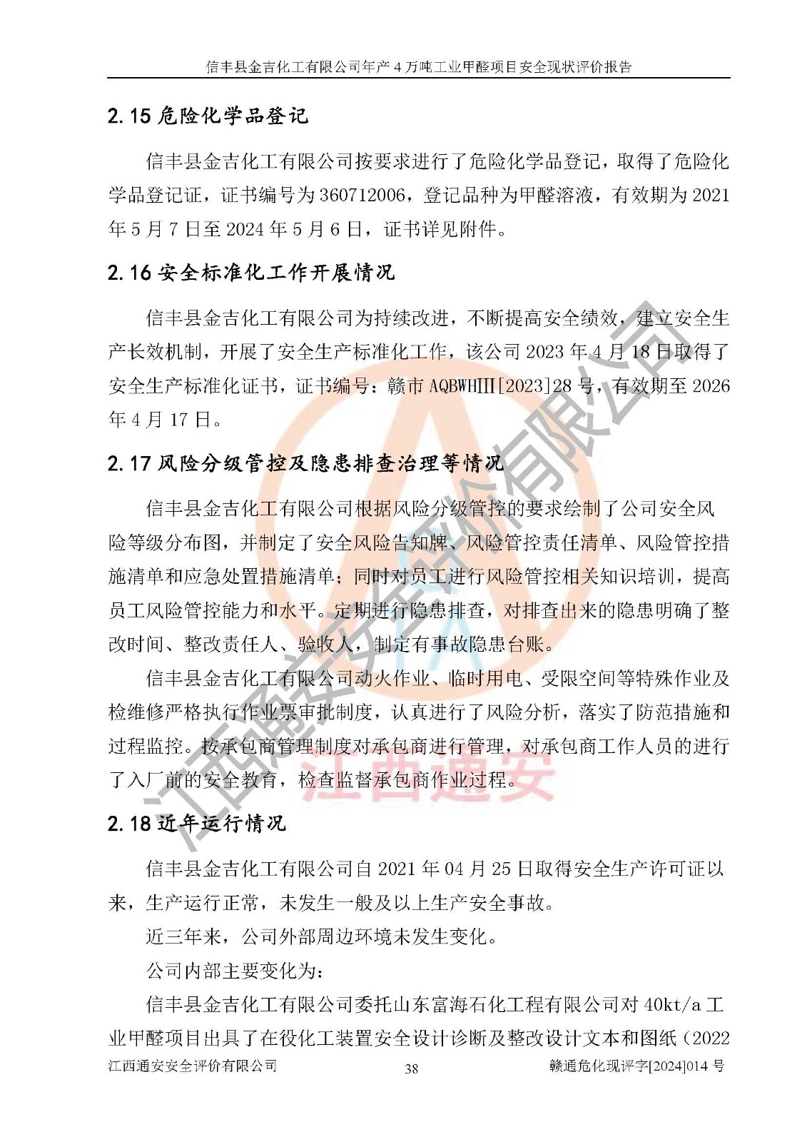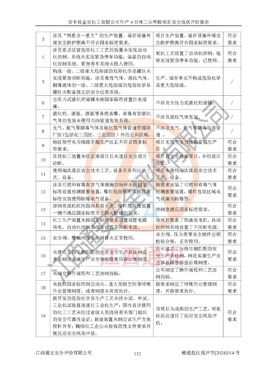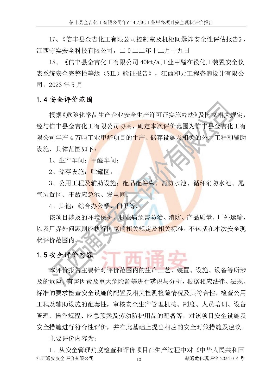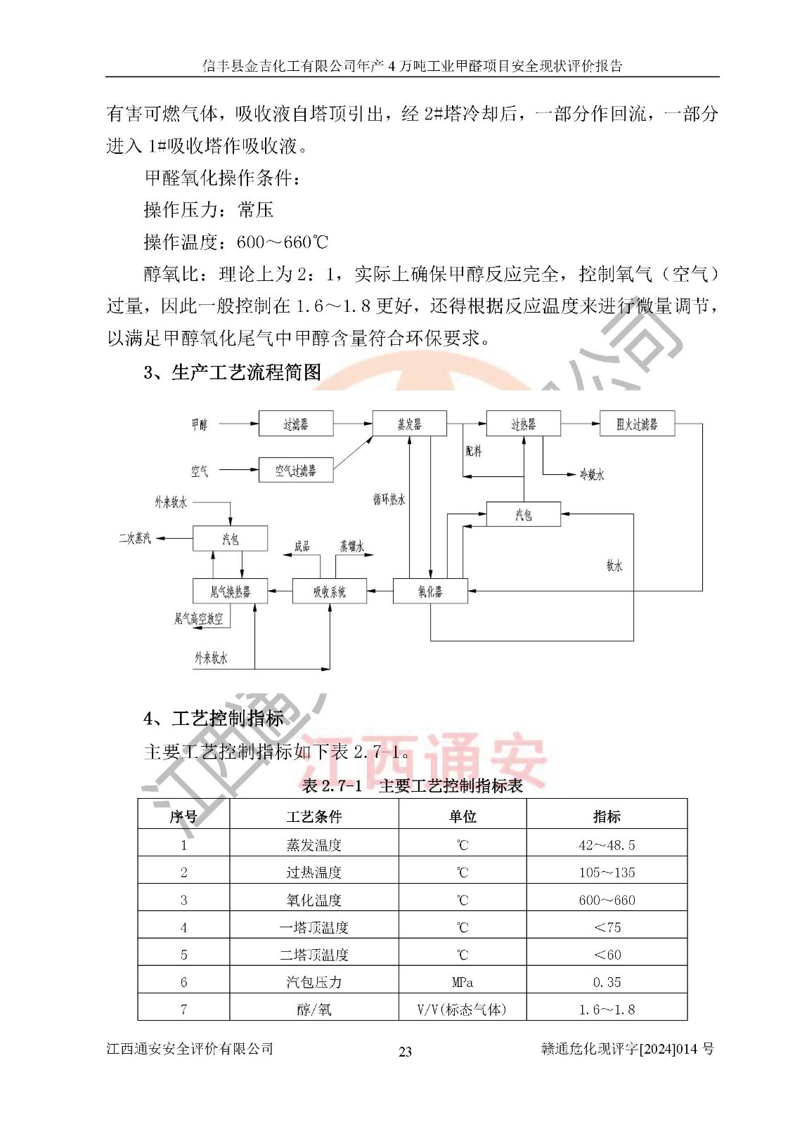 评价结论 | 信丰县金吉化工有限公司年产4万吨工业甲醛项目现场情况与设计图纸一致,DCS和SIS系统设计符合要求、运行正常,有关从业人员资质符合《江西省危险化学品安全专项整治三年行动实施方案》要求,安全设施及安全管理符合法律、法规、标准的要求,安全风险是受控制的,其风险程度是可以接受的,安全设施符合安全生产条件,能够满足安全生产的要求。 | ||||||