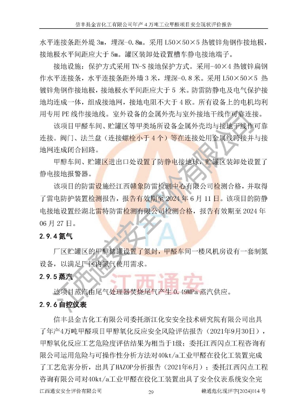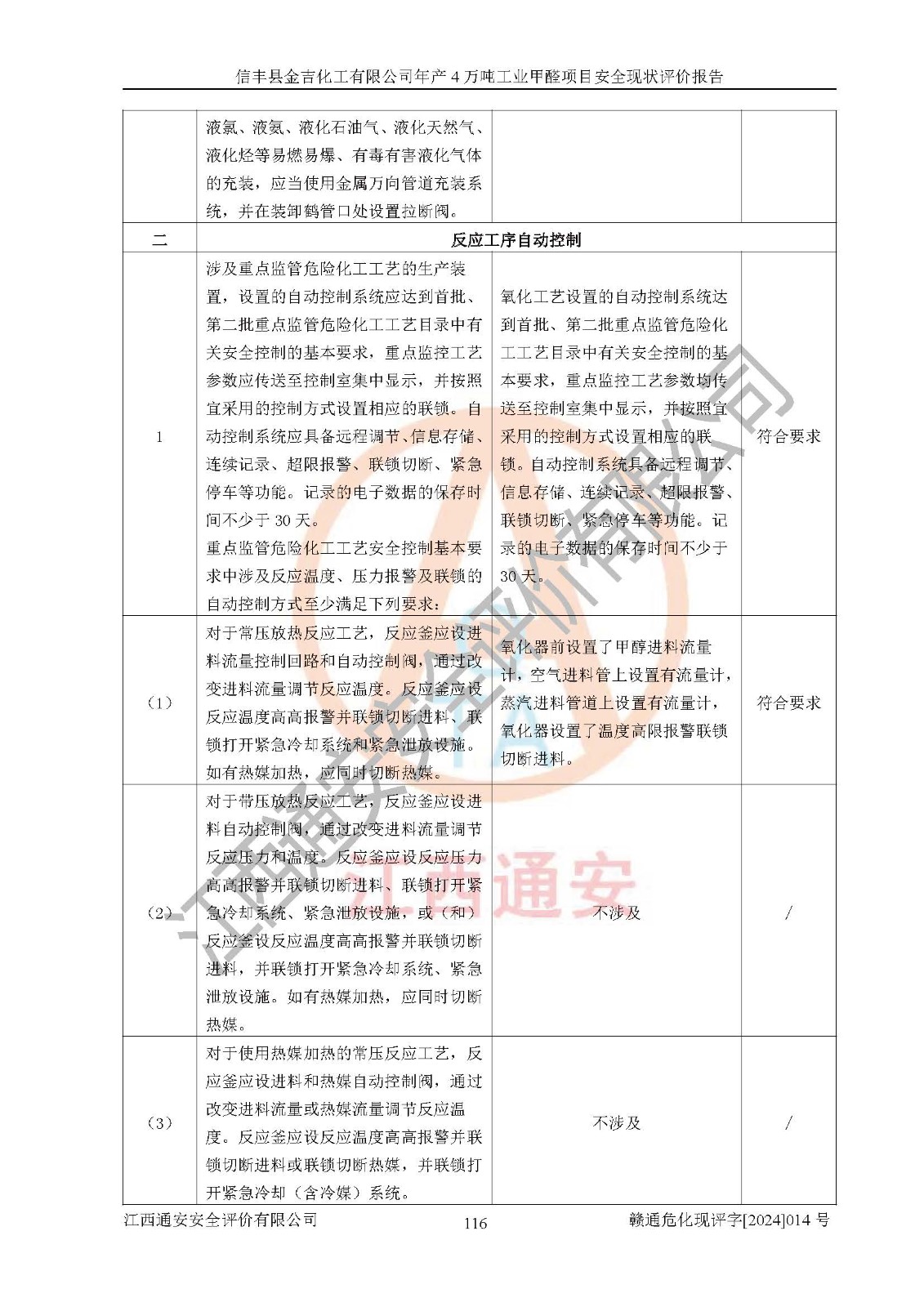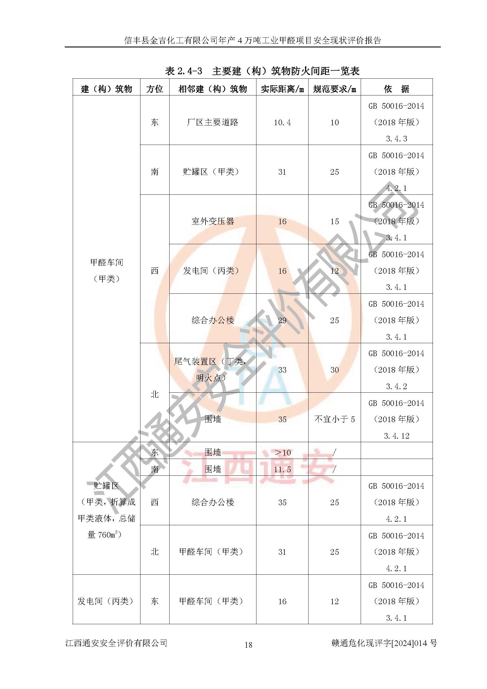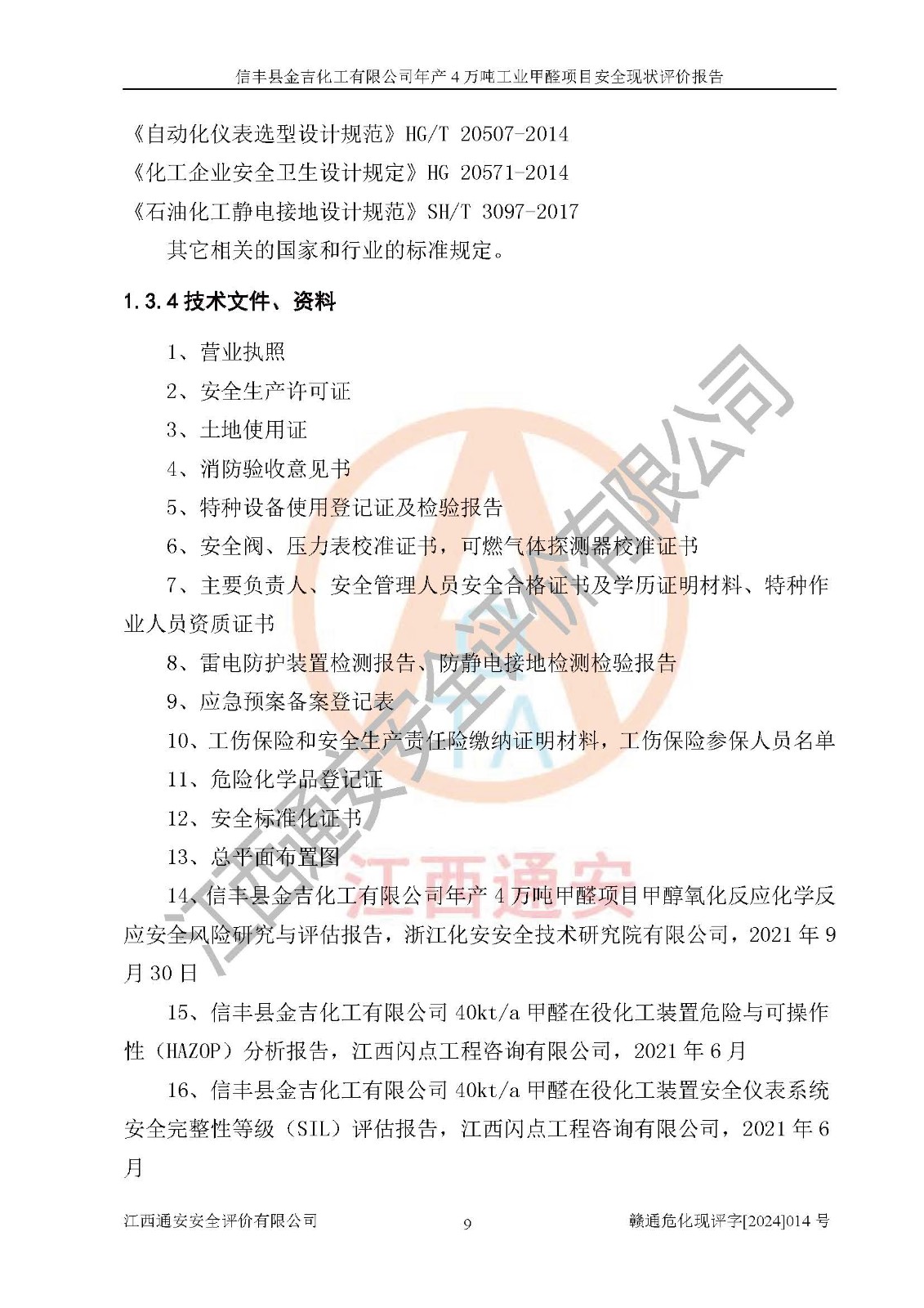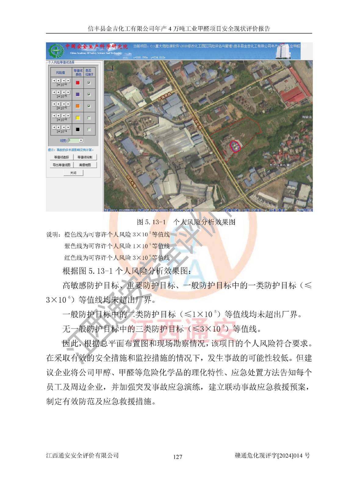 评价结论 | 信丰县金吉化工有限公司年产4万吨工业甲醛项目现场情况与设计图纸一致,DCS和SIS系统设计符合要求、运行正常,有关从业人员资质符合《江西省危险化学品安全专项整治三年行动实施方案》要求,安全设施及安全管理符合法律、法规、标准的要求,安全风险是受控制的,其风险程度是可以接受的,安全设施符合安全生产条件,能够满足安全生产的要求。 | ||||||