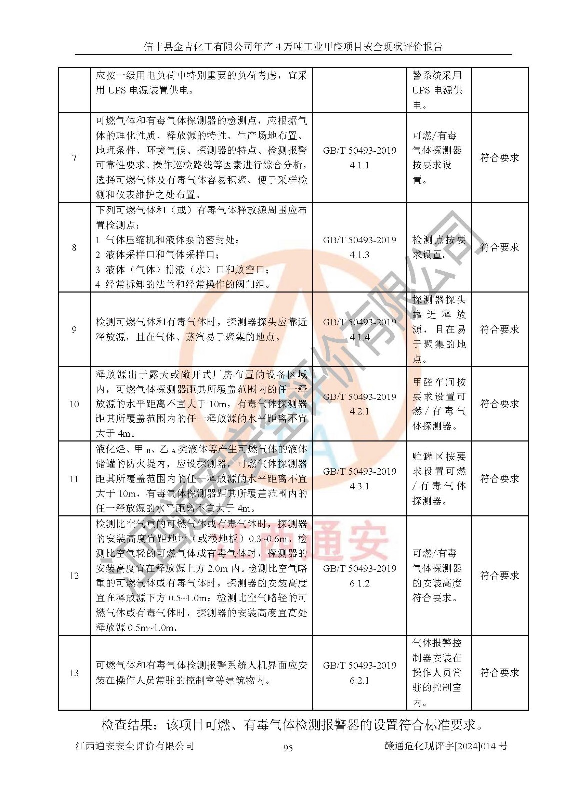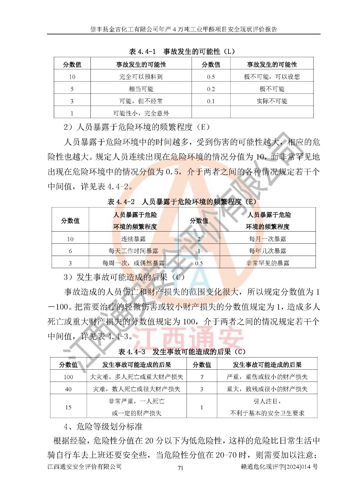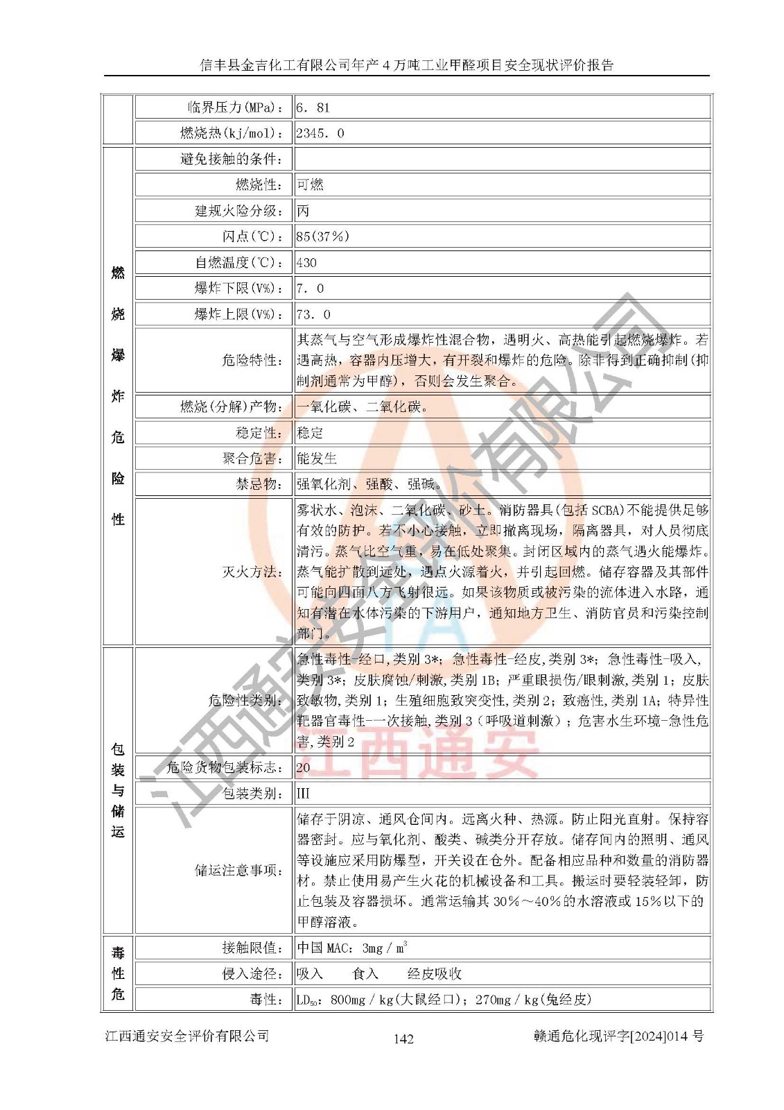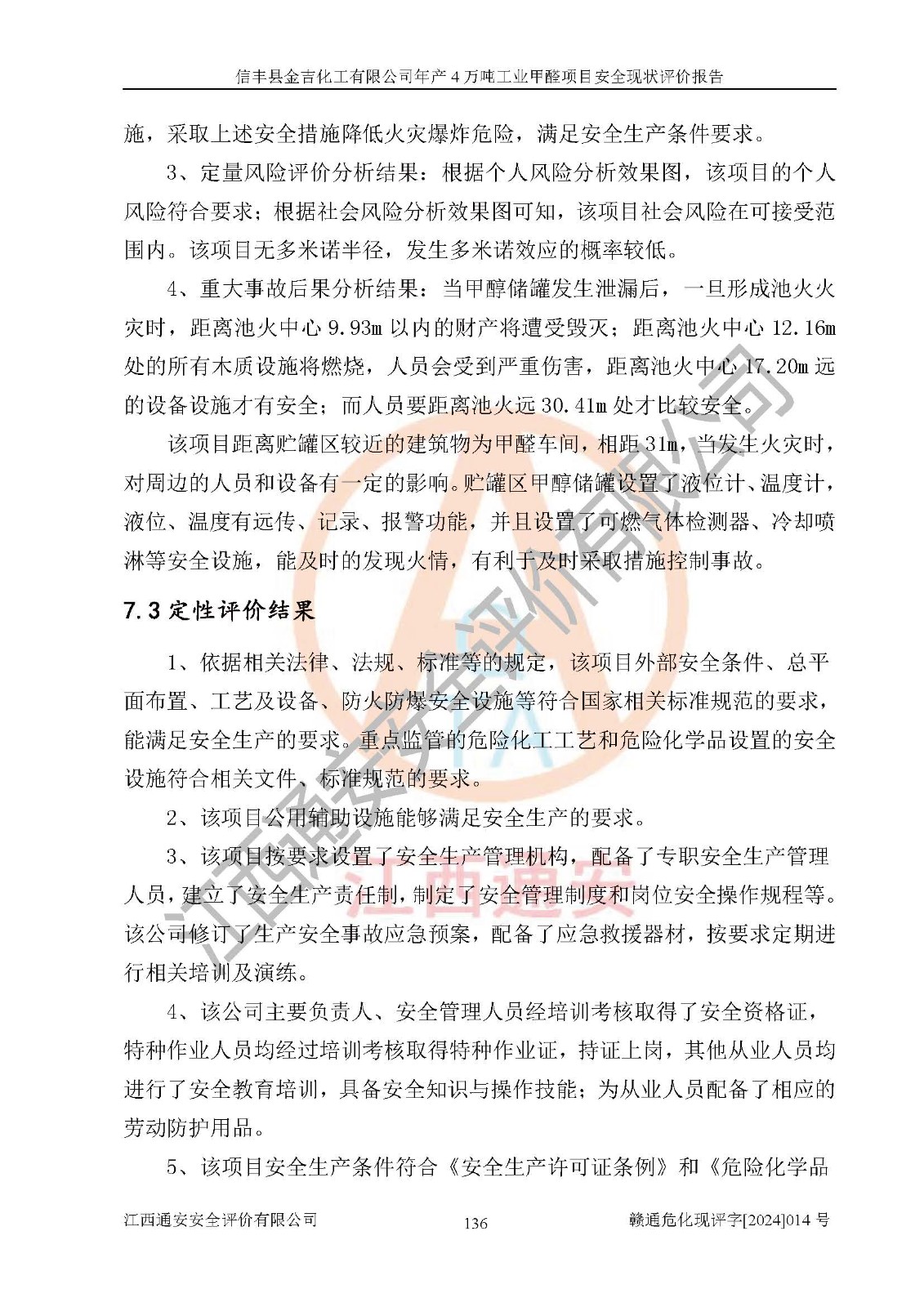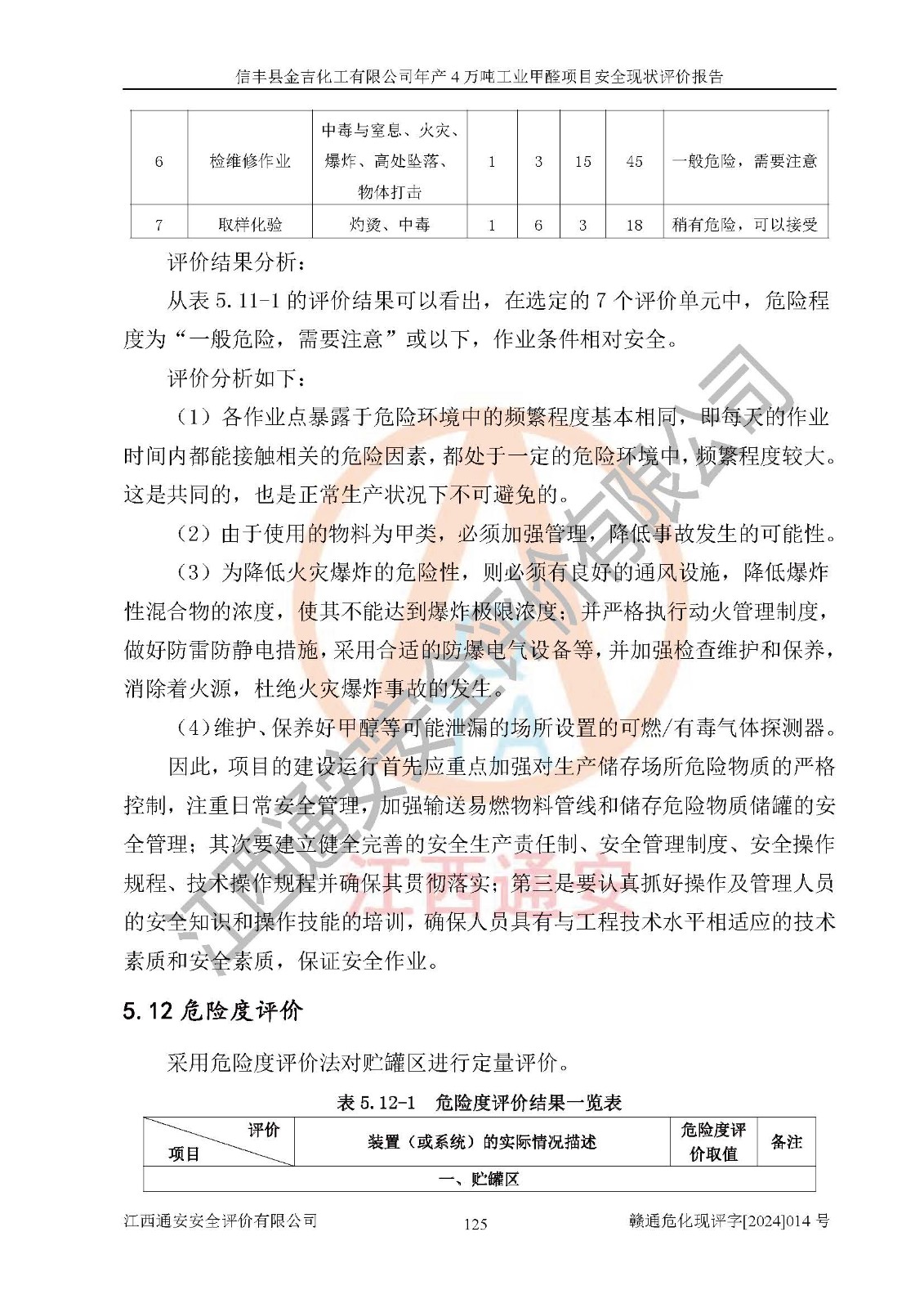 评价结论 | 信丰县金吉化工有限公司年产4万吨工业甲醛项目现场情况与设计图纸一致,DCS和SIS系统设计符合要求、运行正常,有关从业人员资质符合《江西省危险化学品安全专项整治三年行动实施方案》要求,安全设施及安全管理符合法律、法规、标准的要求,安全风险是受控制的,其风险程度是可以接受的,安全设施符合安全生产条件,能够满足安全生产的要求。 | ||||||