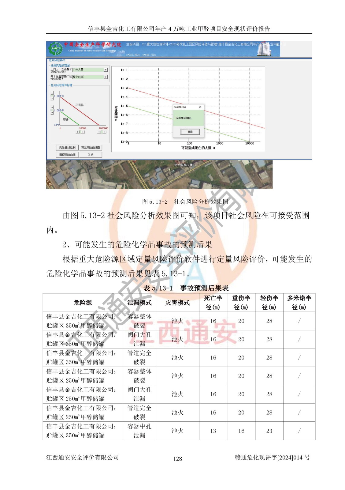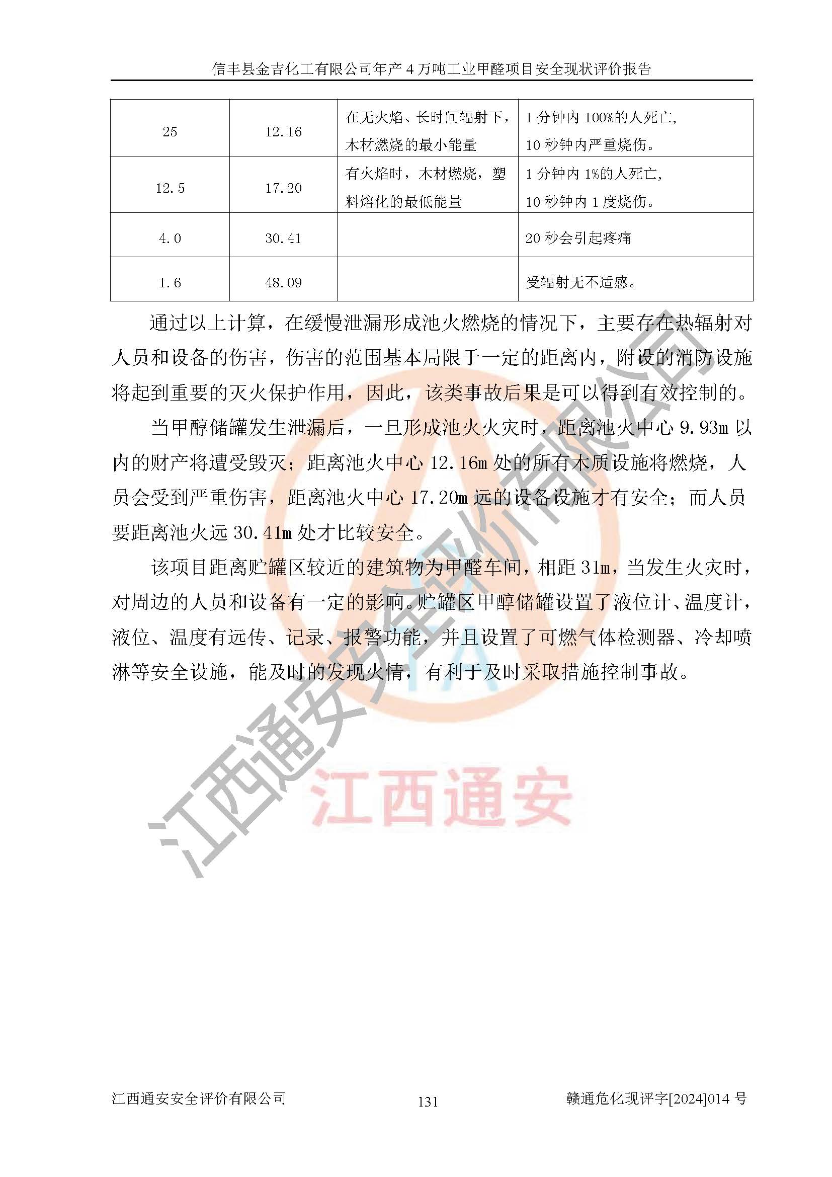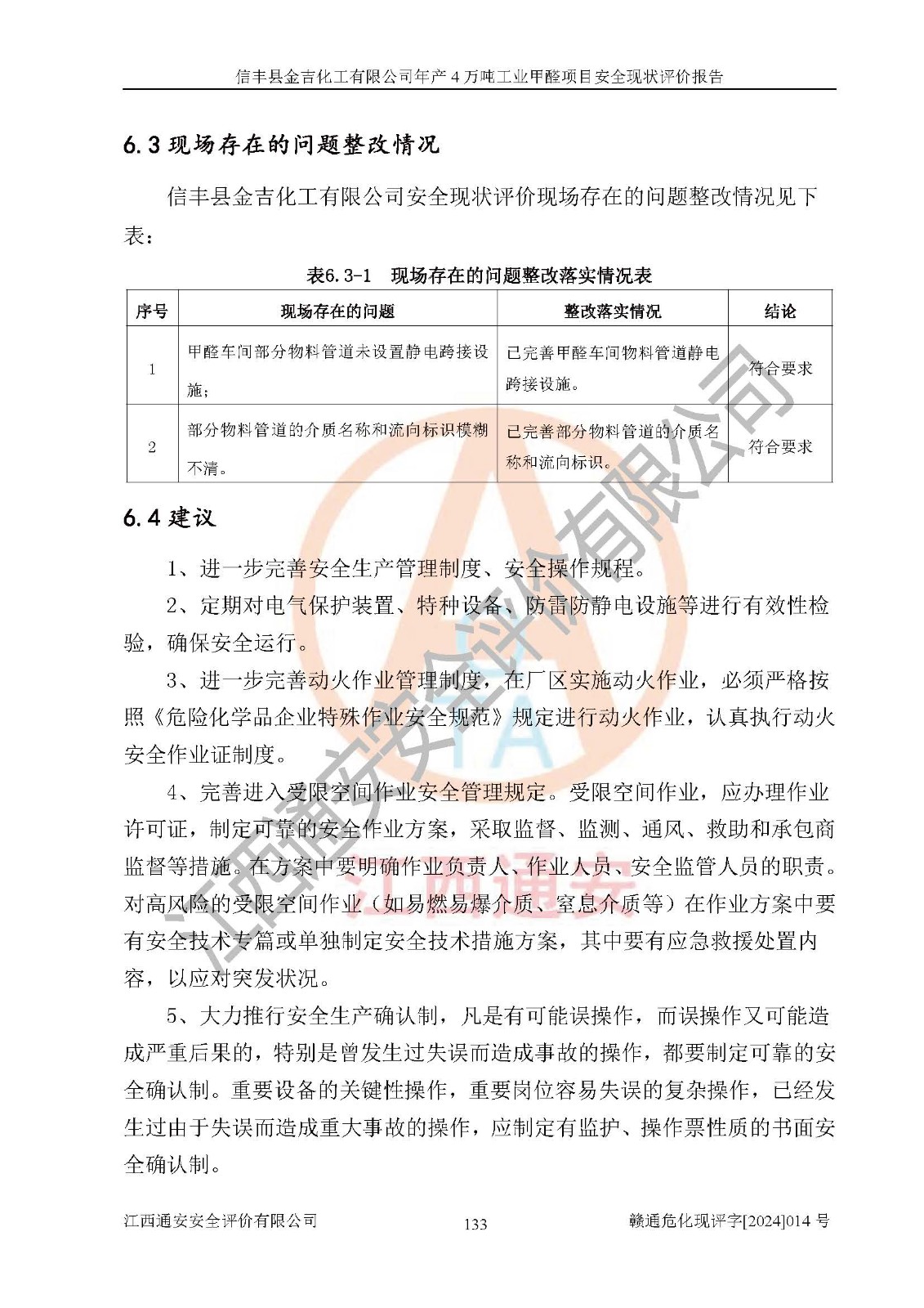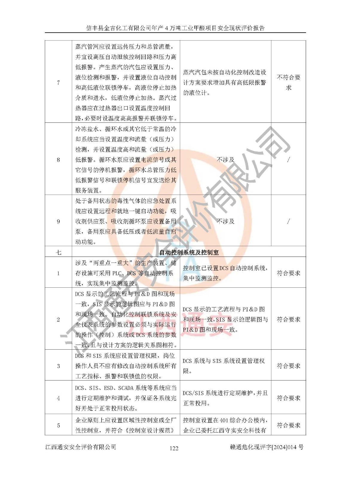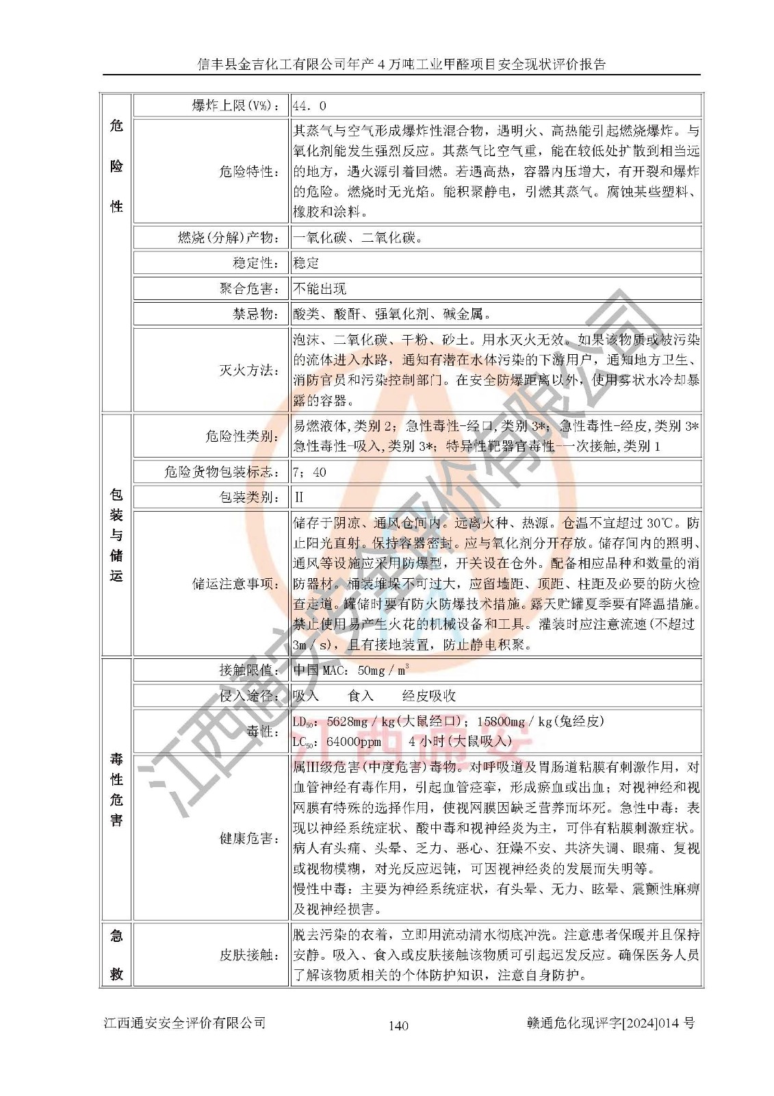评价结论 | 信丰县金吉化工有限公司年产4万吨工业甲醛项目现场情况与设计图纸一致,DCS和SIS系统设计符合要求、运行正常,有关从业人员资质符合《江西省危险化学品安全专项整治三年行动实施方案》要求,安全设施及安全管理符合法律、法规、标准的要求,安全风险是受控制的,其风险程度是可以接受的,安全设施符合安全生产条件,能够满足安全生产的要求。 | ||||||