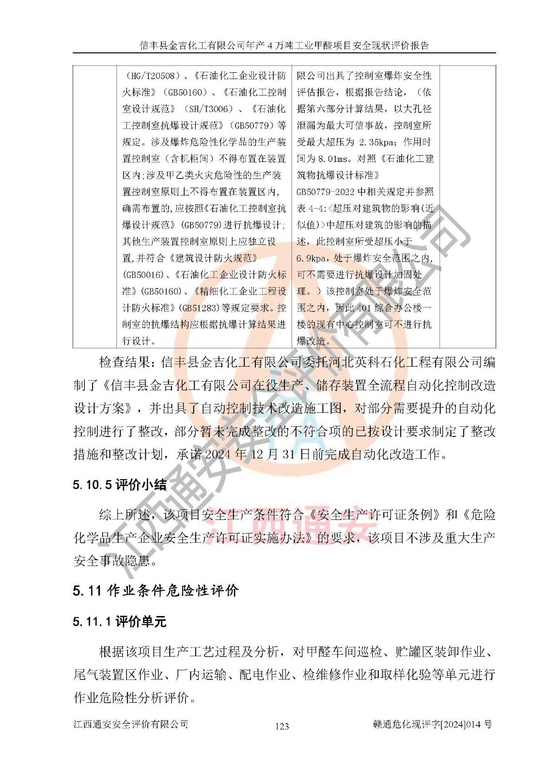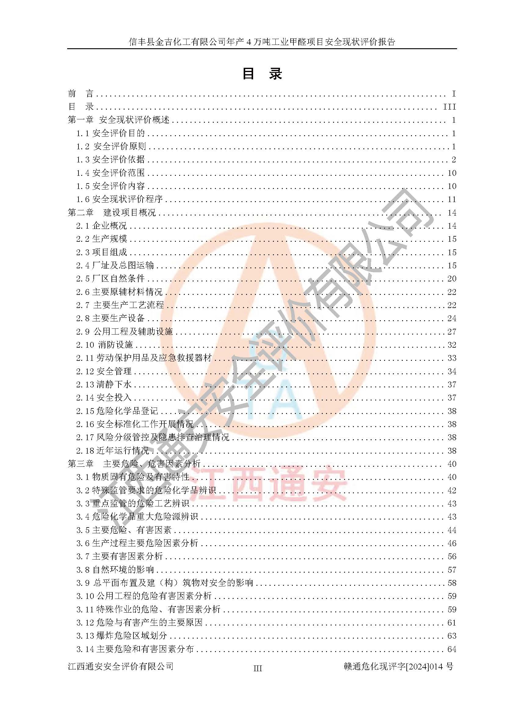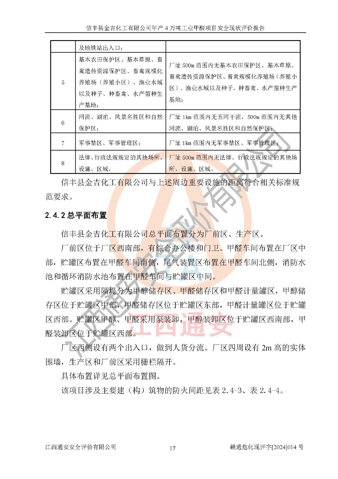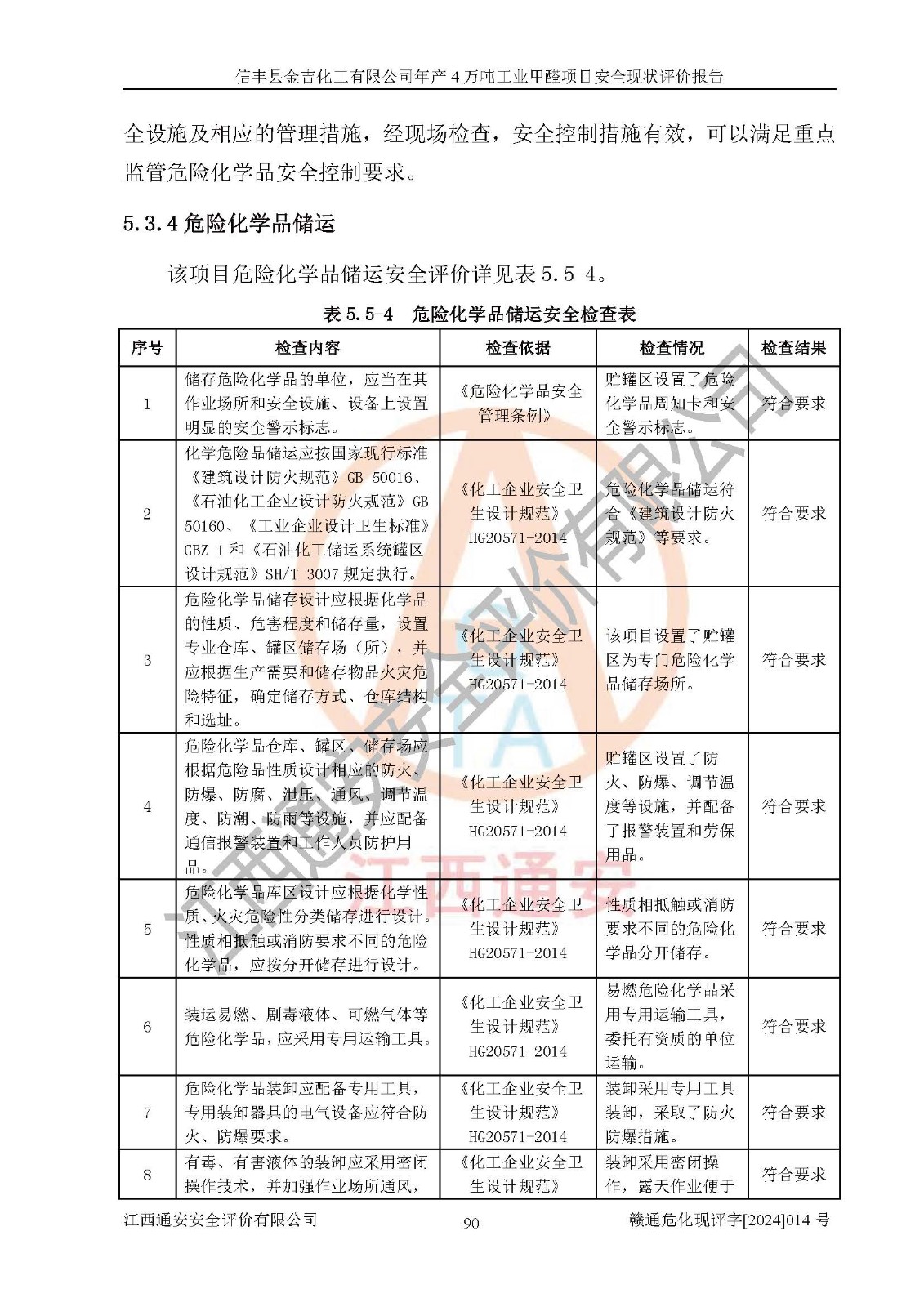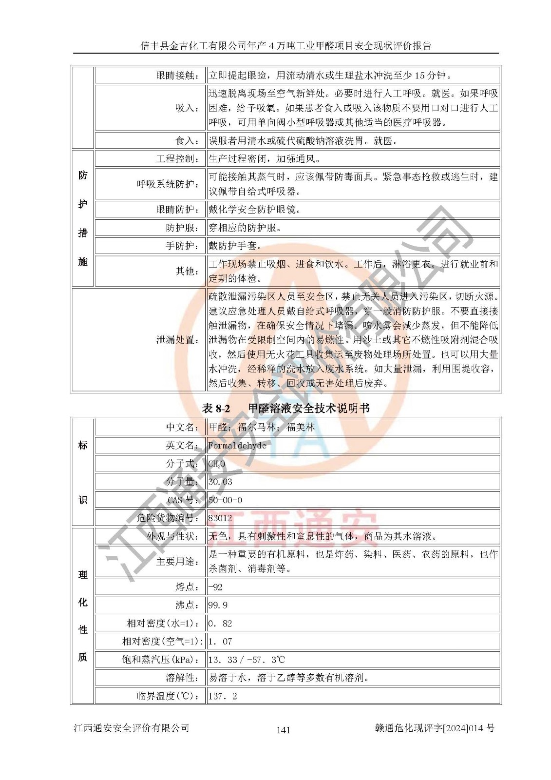 评价结论 | 信丰县金吉化工有限公司年产4万吨工业甲醛项目现场情况与设计图纸一致,DCS和SIS系统设计符合要求、运行正常,有关从业人员资质符合《江西省危险化学品安全专项整治三年行动实施方案》要求,安全设施及安全管理符合法律、法规、标准的要求,安全风险是受控制的,其风险程度是可以接受的,安全设施符合安全生产条件,能够满足安全生产的要求。 | ||||||