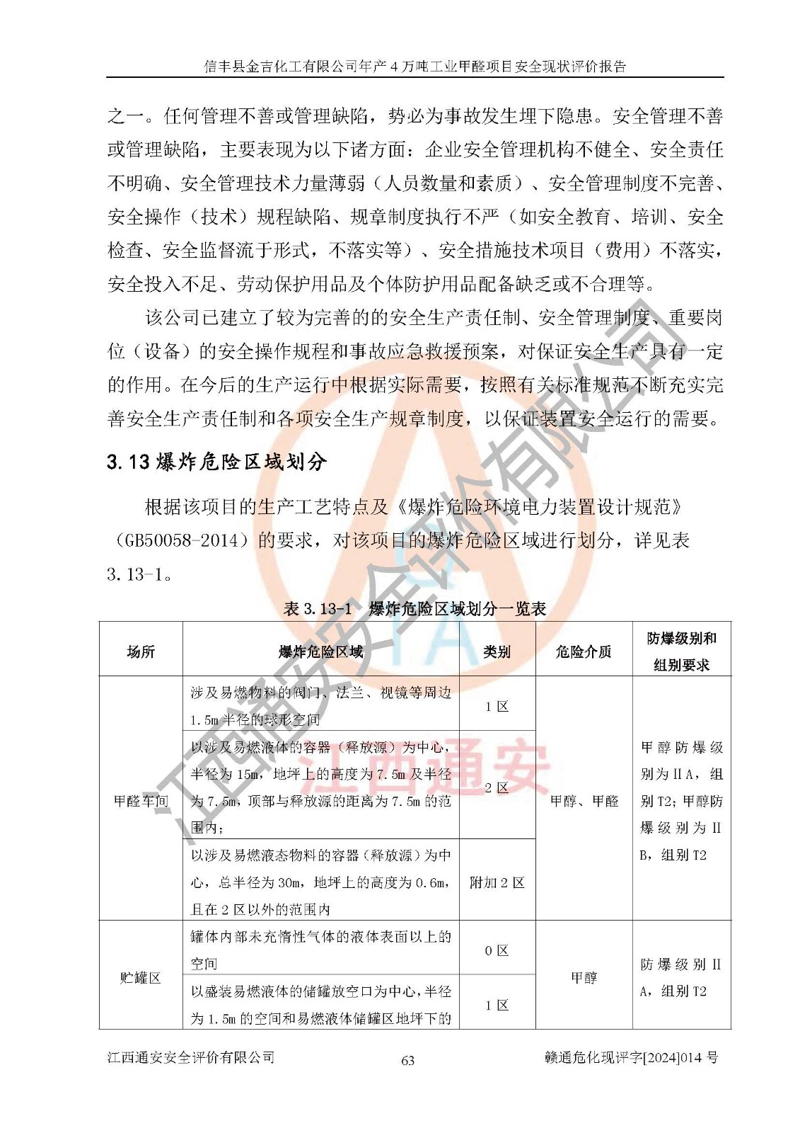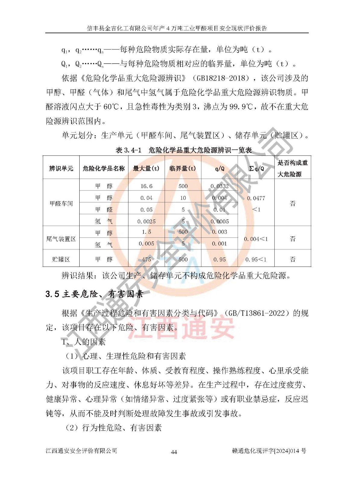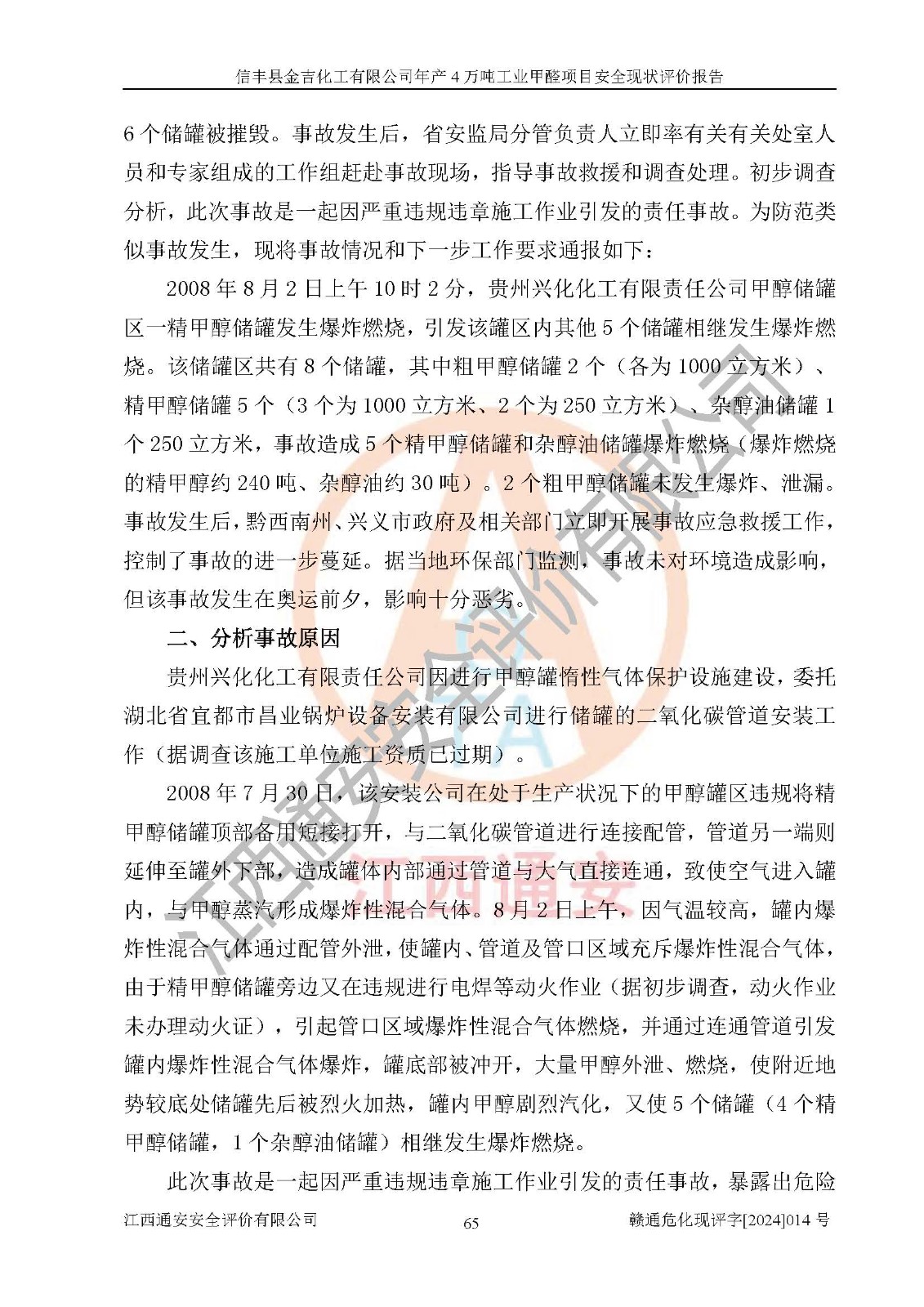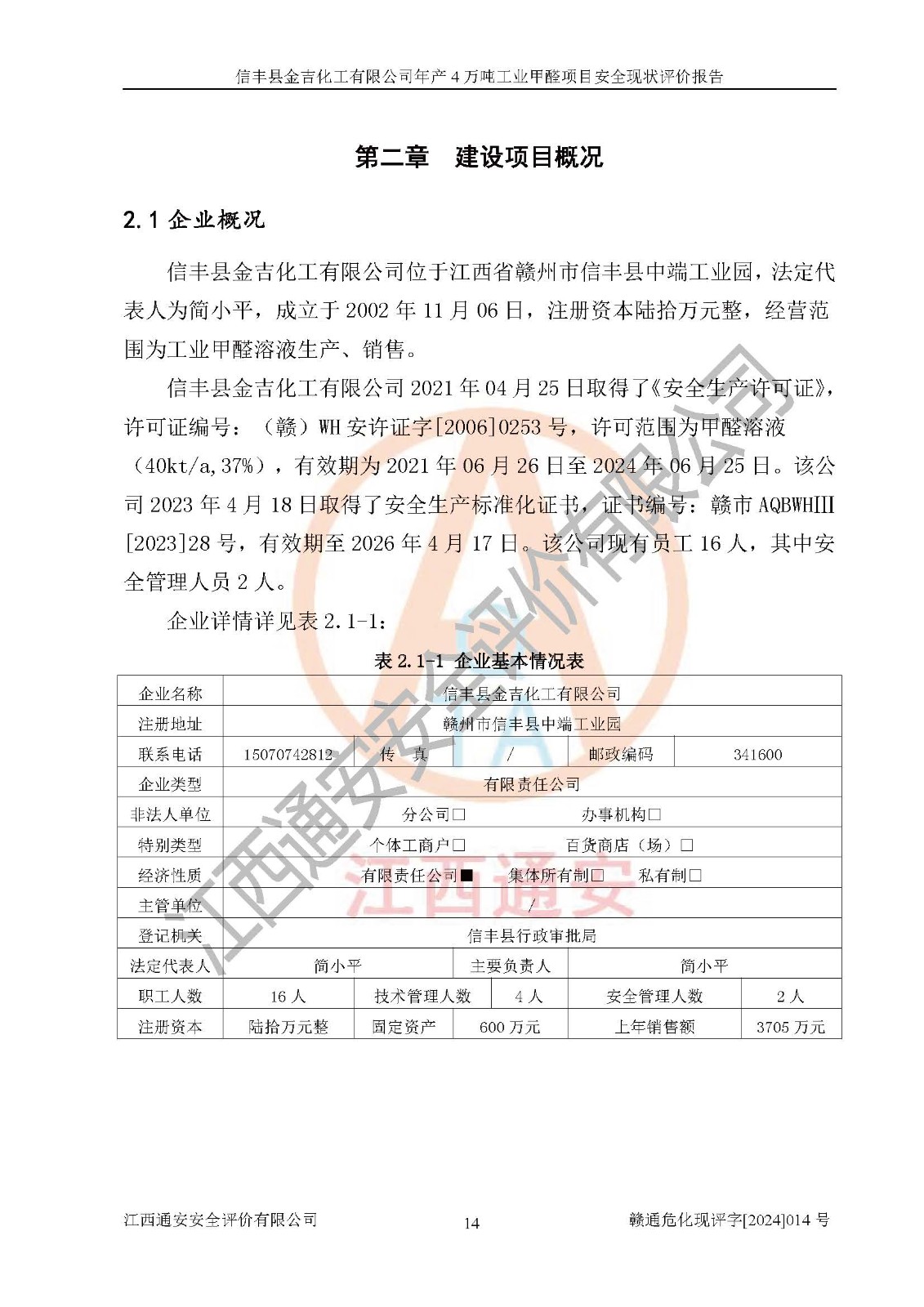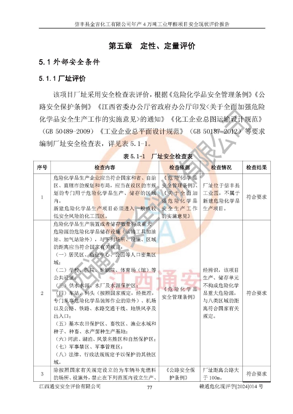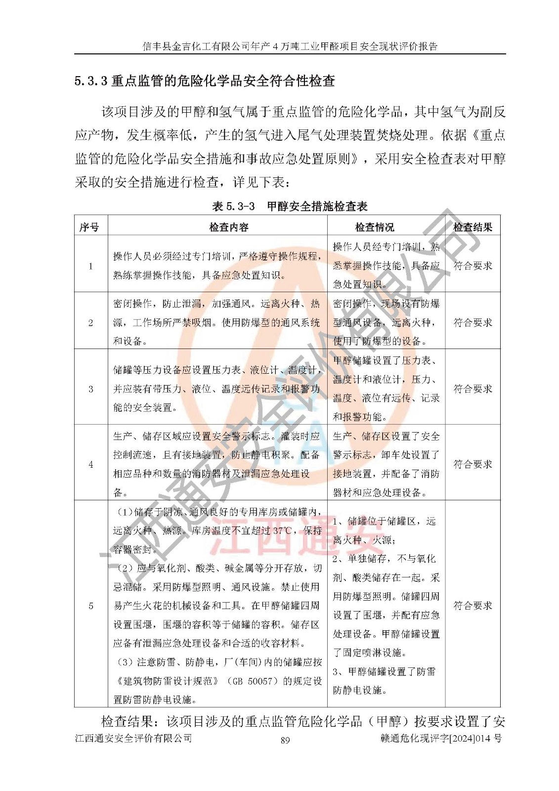 评价结论 | 信丰县金吉化工有限公司年产4万吨工业甲醛项目现场情况与设计图纸一致,DCS和SIS系统设计符合要求、运行正常,有关从业人员资质符合《江西省危险化学品安全专项整治三年行动实施方案》要求,安全设施及安全管理符合法律、法规、标准的要求,安全风险是受控制的,其风险程度是可以接受的,安全设施符合安全生产条件,能够满足安全生产的要求。 | ||||||