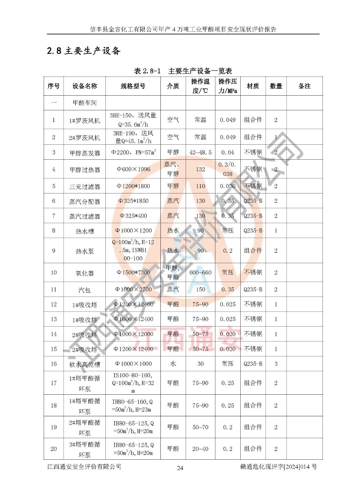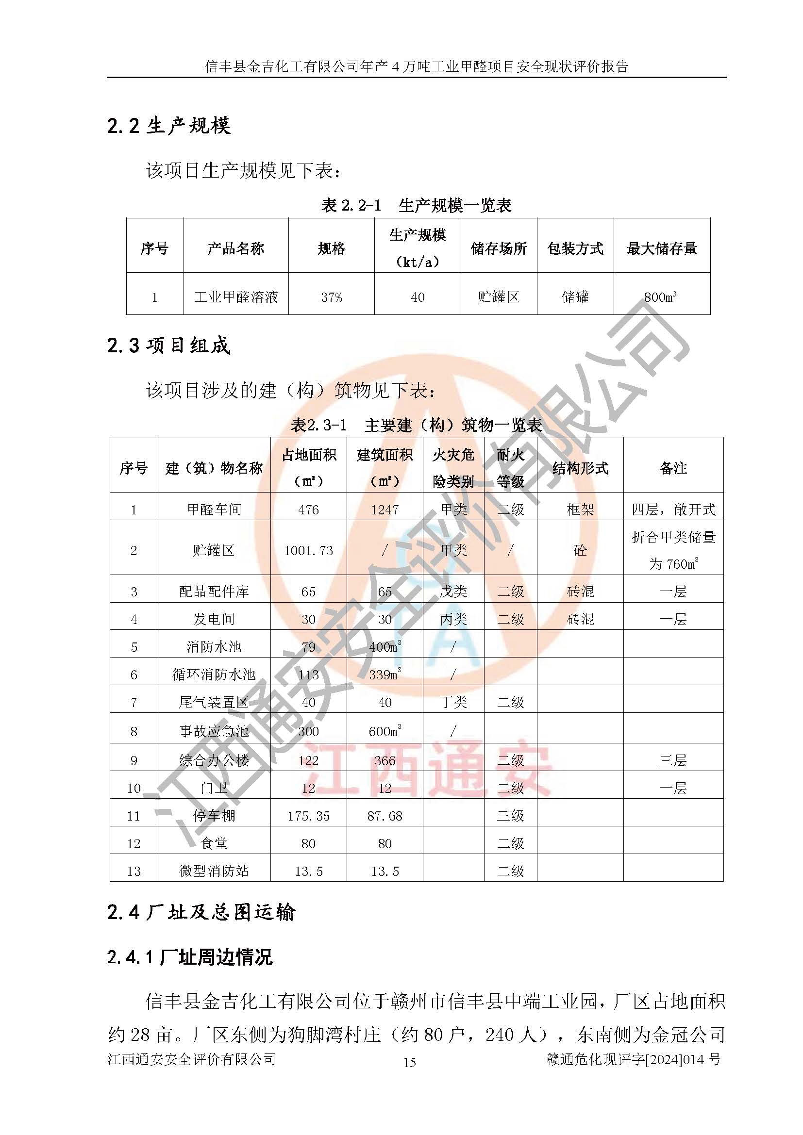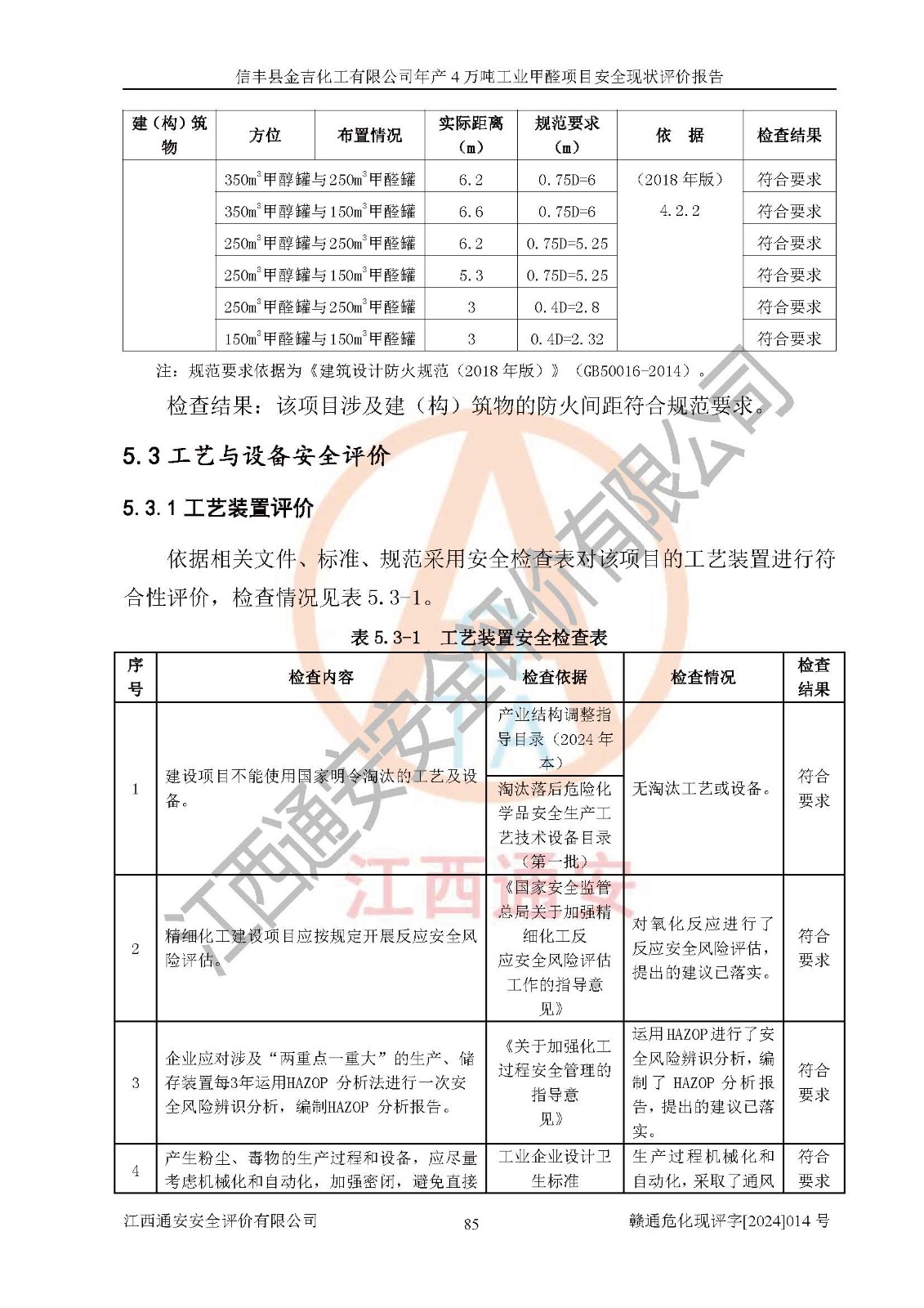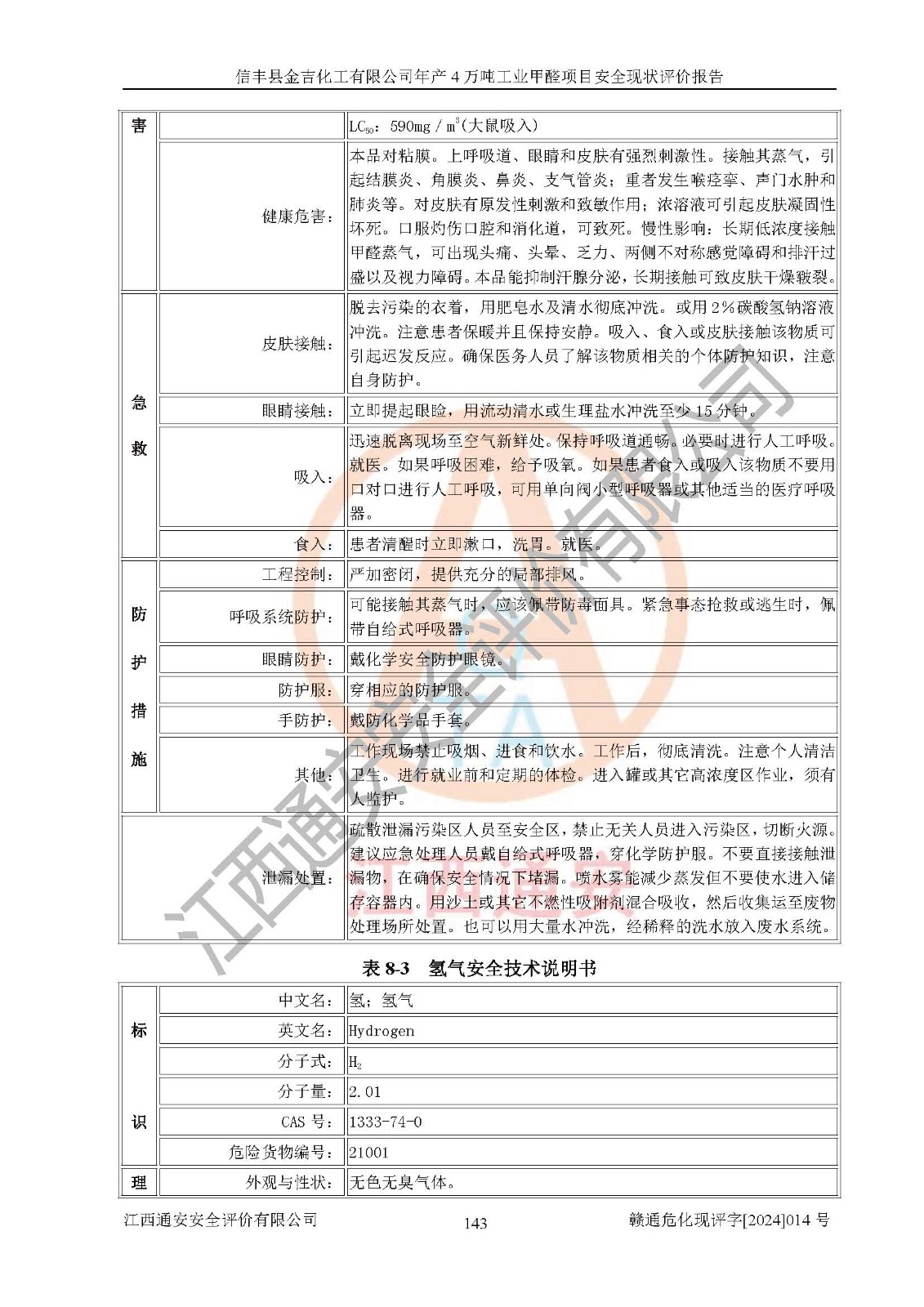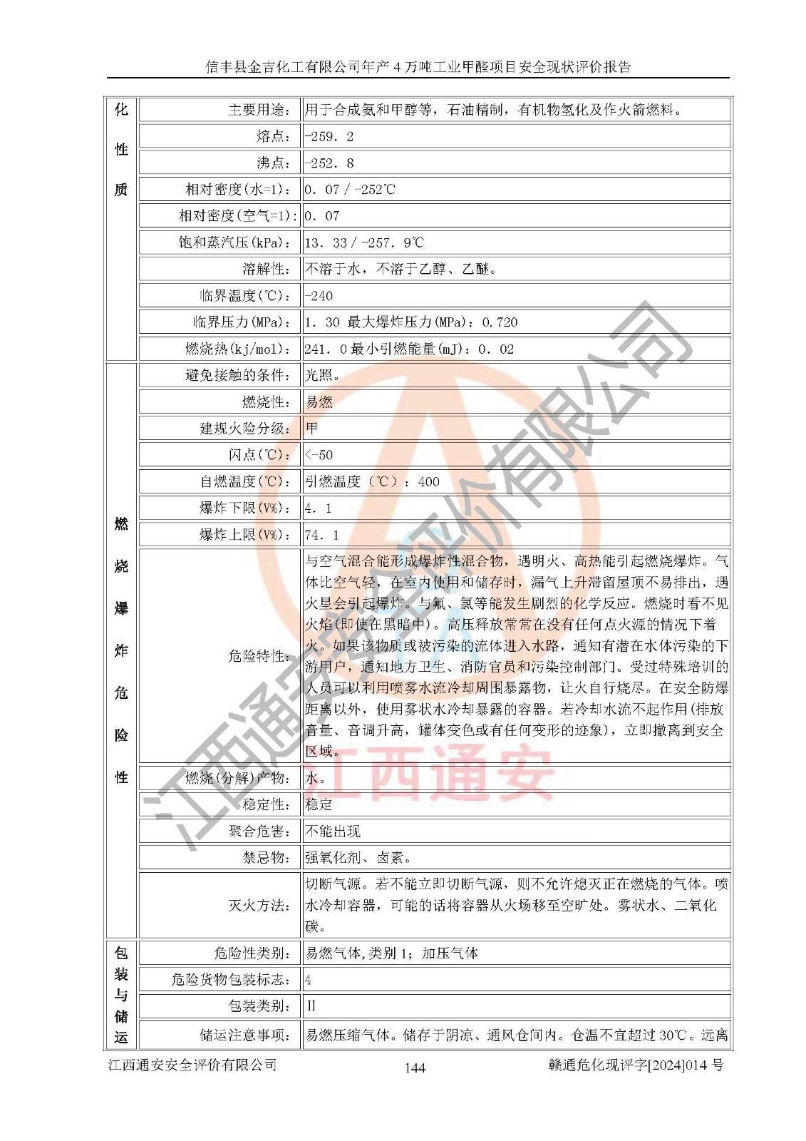 评价结论 | 信丰县金吉化工有限公司年产4万吨工业甲醛项目现场情况与设计图纸一致,DCS和SIS系统设计符合要求、运行正常,有关从业人员资质符合《江西省危险化学品安全专项整治三年行动实施方案》要求,安全设施及安全管理符合法律、法规、标准的要求,安全风险是受控制的,其风险程度是可以接受的,安全设施符合安全生产条件,能够满足安全生产的要求。 | ||||||