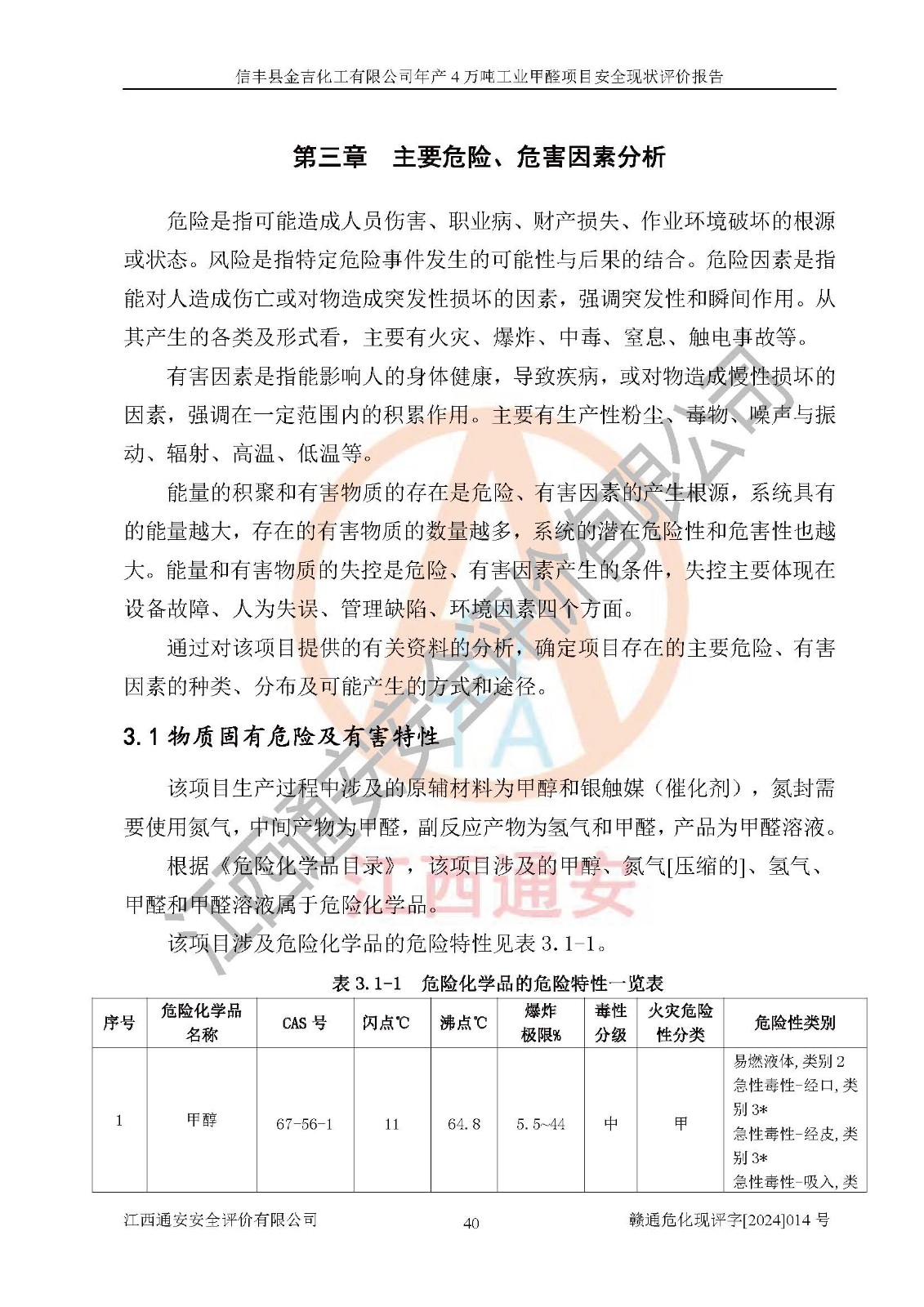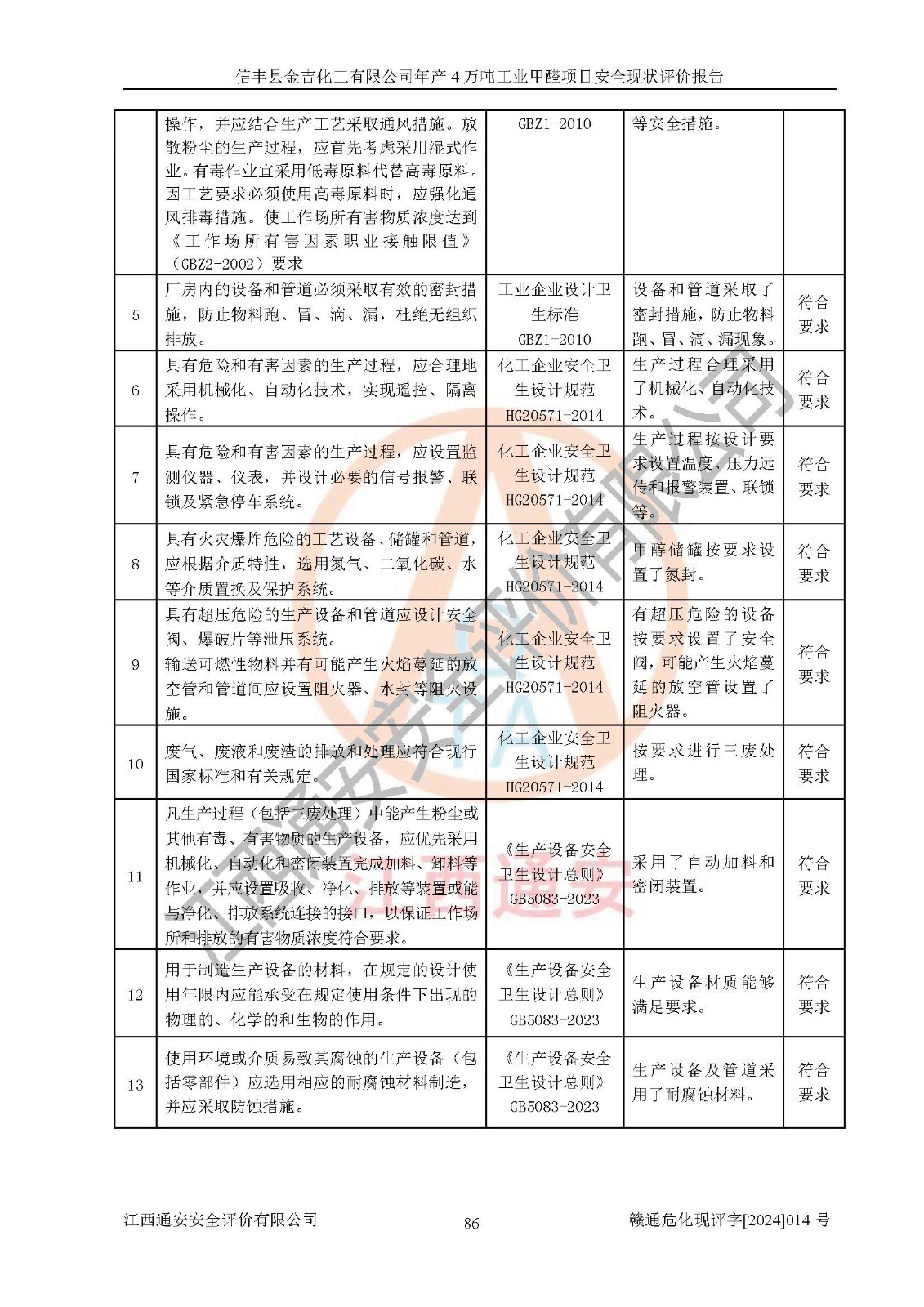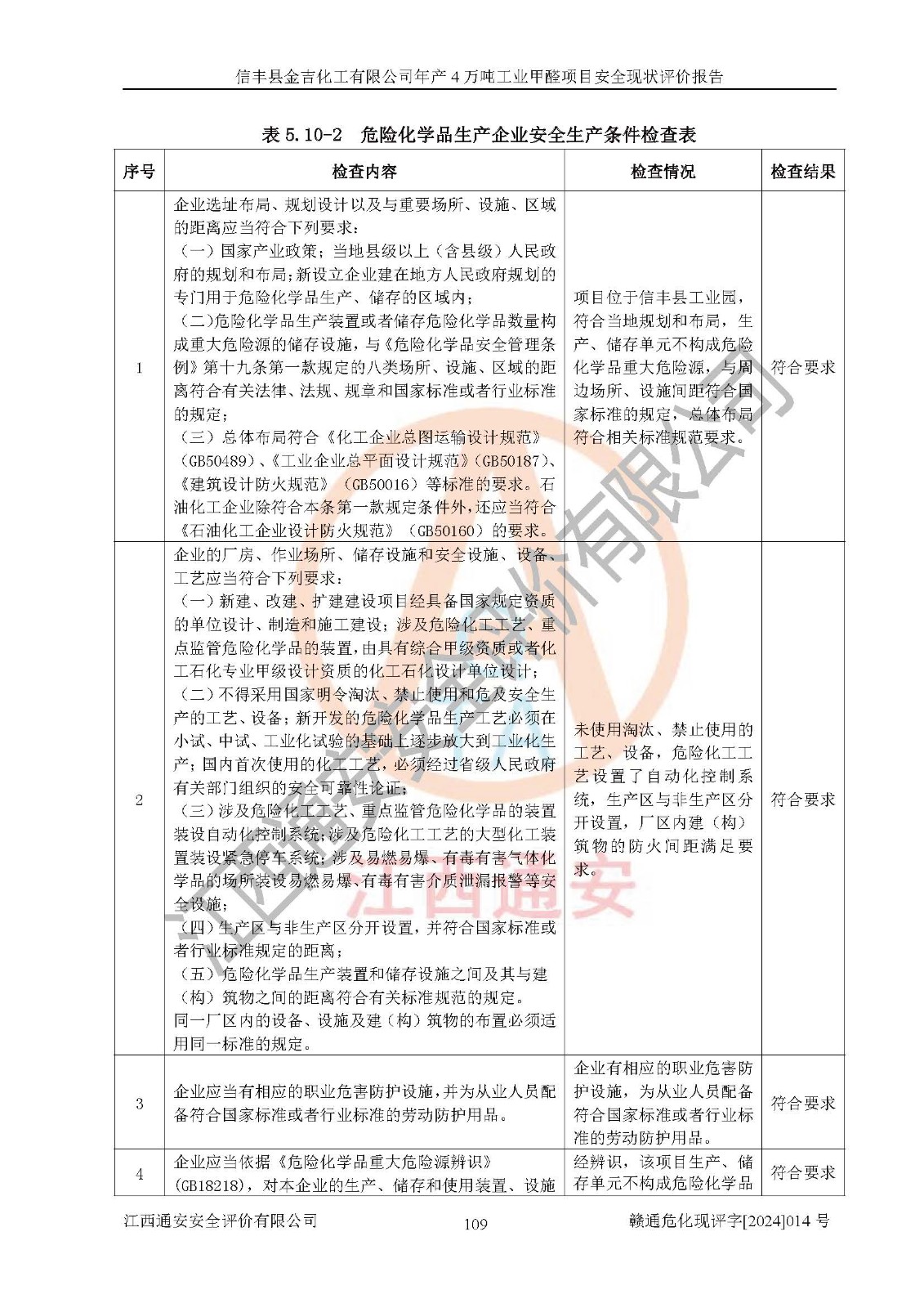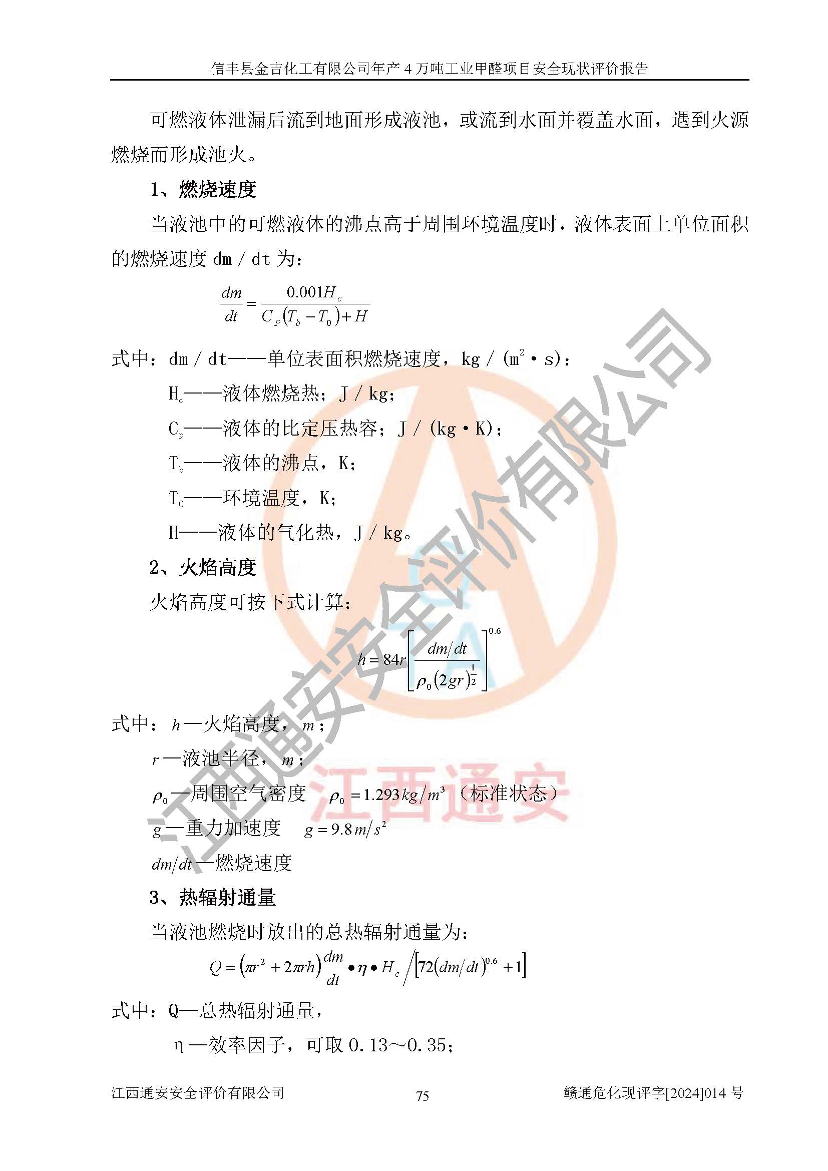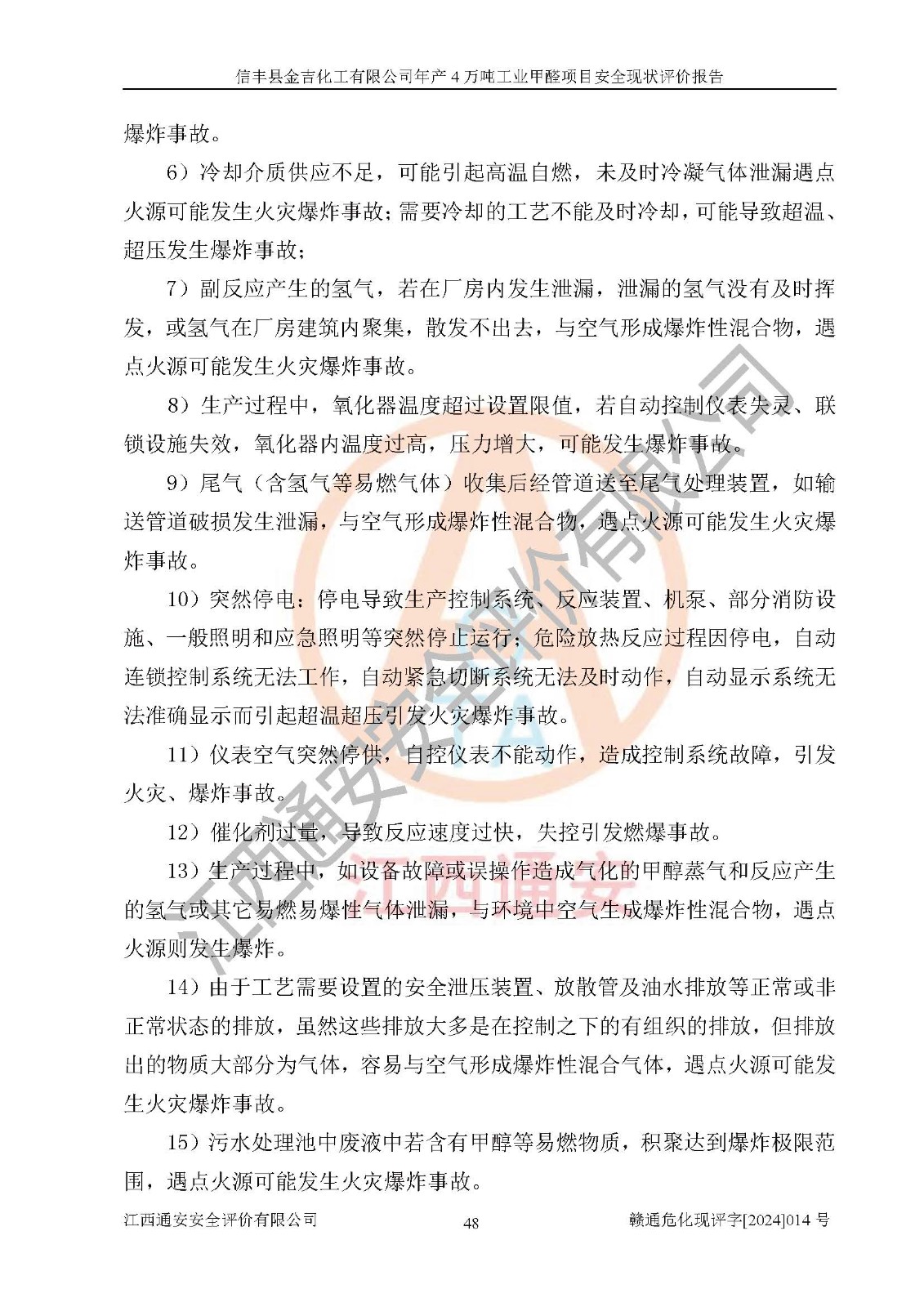 评价结论 | 信丰县金吉化工有限公司年产4万吨工业甲醛项目现场情况与设计图纸一致,DCS和SIS系统设计符合要求、运行正常,有关从业人员资质符合《江西省危险化学品安全专项整治三年行动实施方案》要求,安全设施及安全管理符合法律、法规、标准的要求,安全风险是受控制的,其风险程度是可以接受的,安全设施符合安全生产条件,能够满足安全生产的要求。 | ||||||