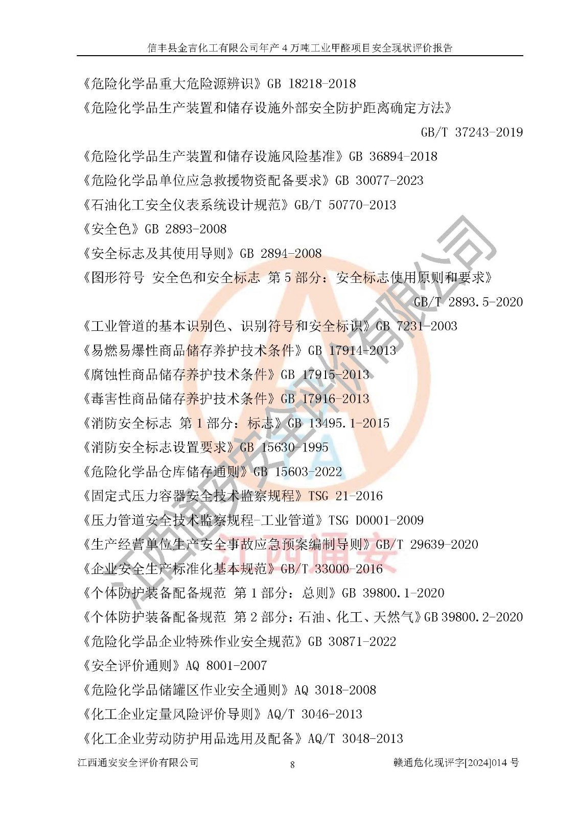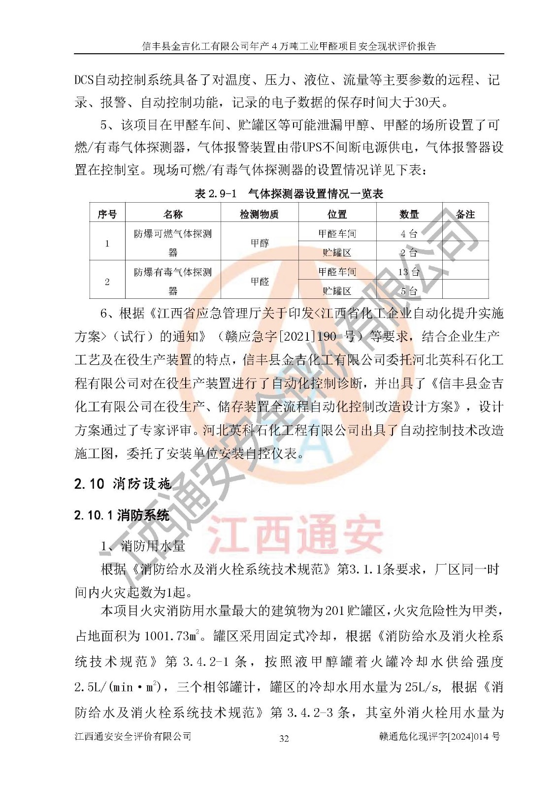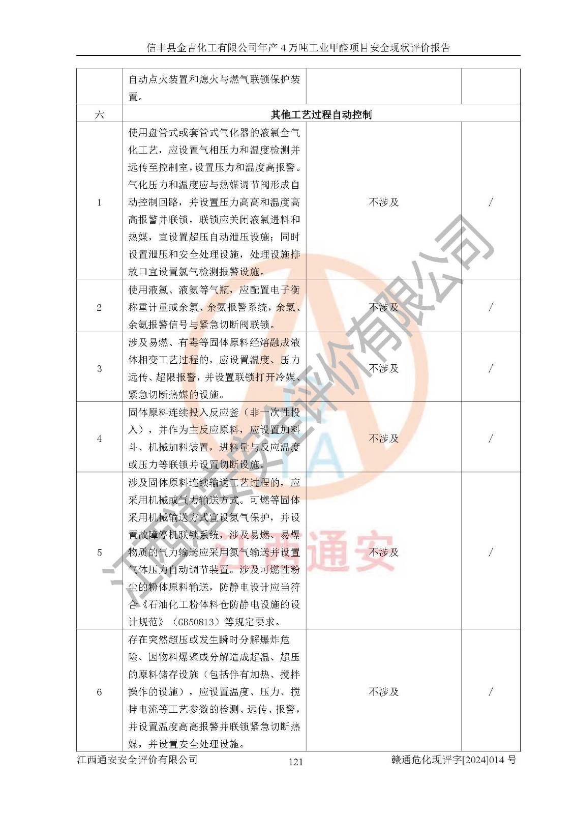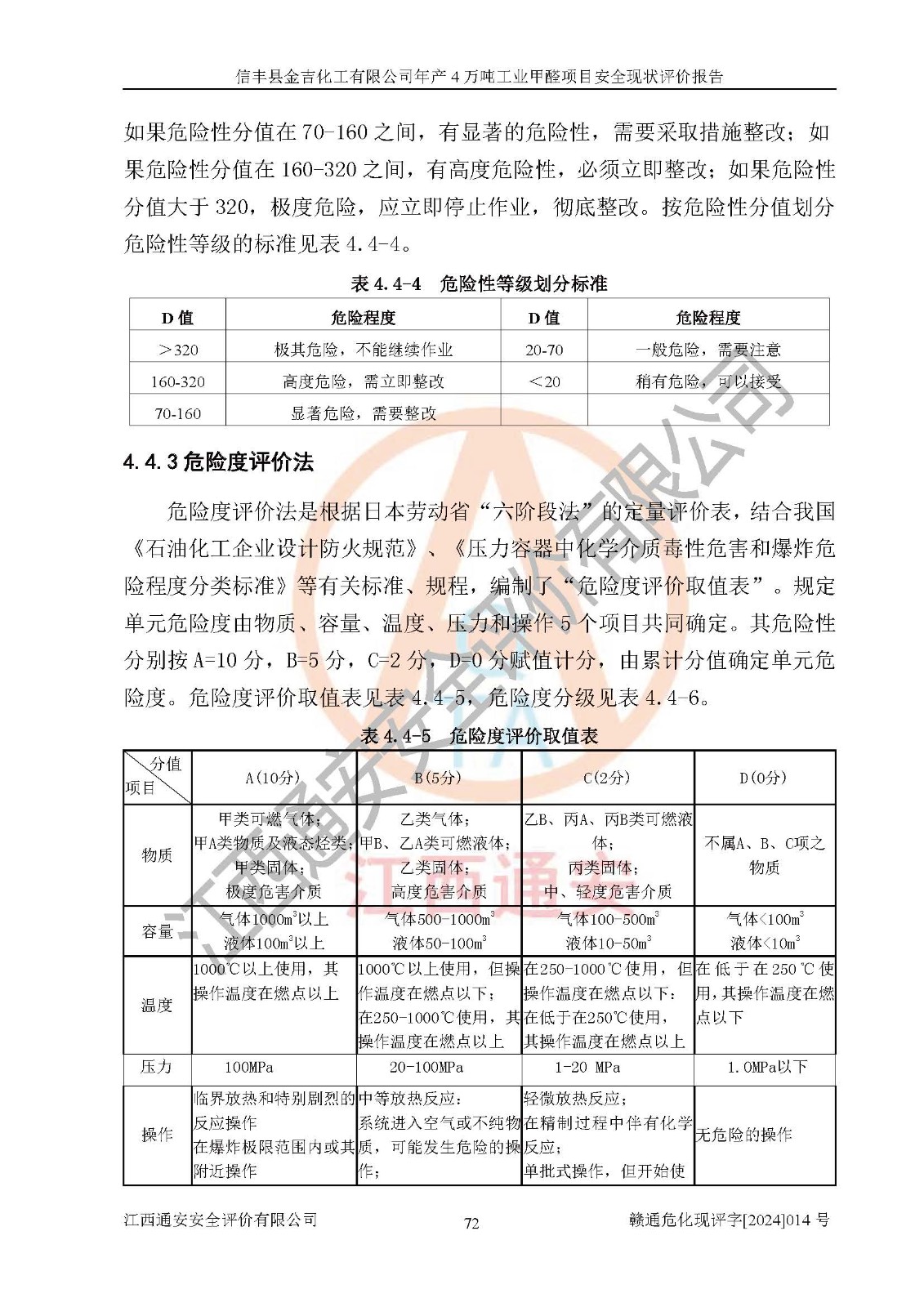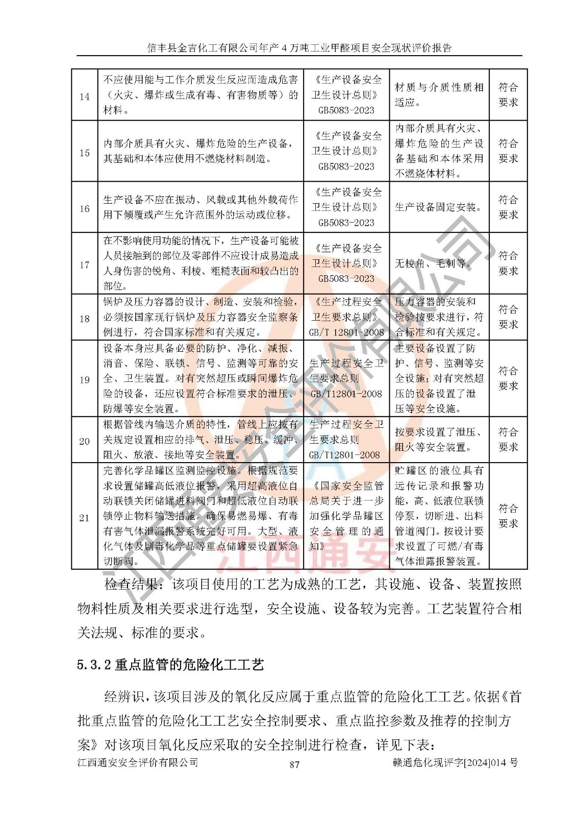 评价结论 | 信丰县金吉化工有限公司年产4万吨工业甲醛项目现场情况与设计图纸一致,DCS和SIS系统设计符合要求、运行正常,有关从业人员资质符合《江西省危险化学品安全专项整治三年行动实施方案》要求,安全设施及安全管理符合法律、法规、标准的要求,安全风险是受控制的,其风险程度是可以接受的,安全设施符合安全生产条件,能够满足安全生产的要求。 | ||||||