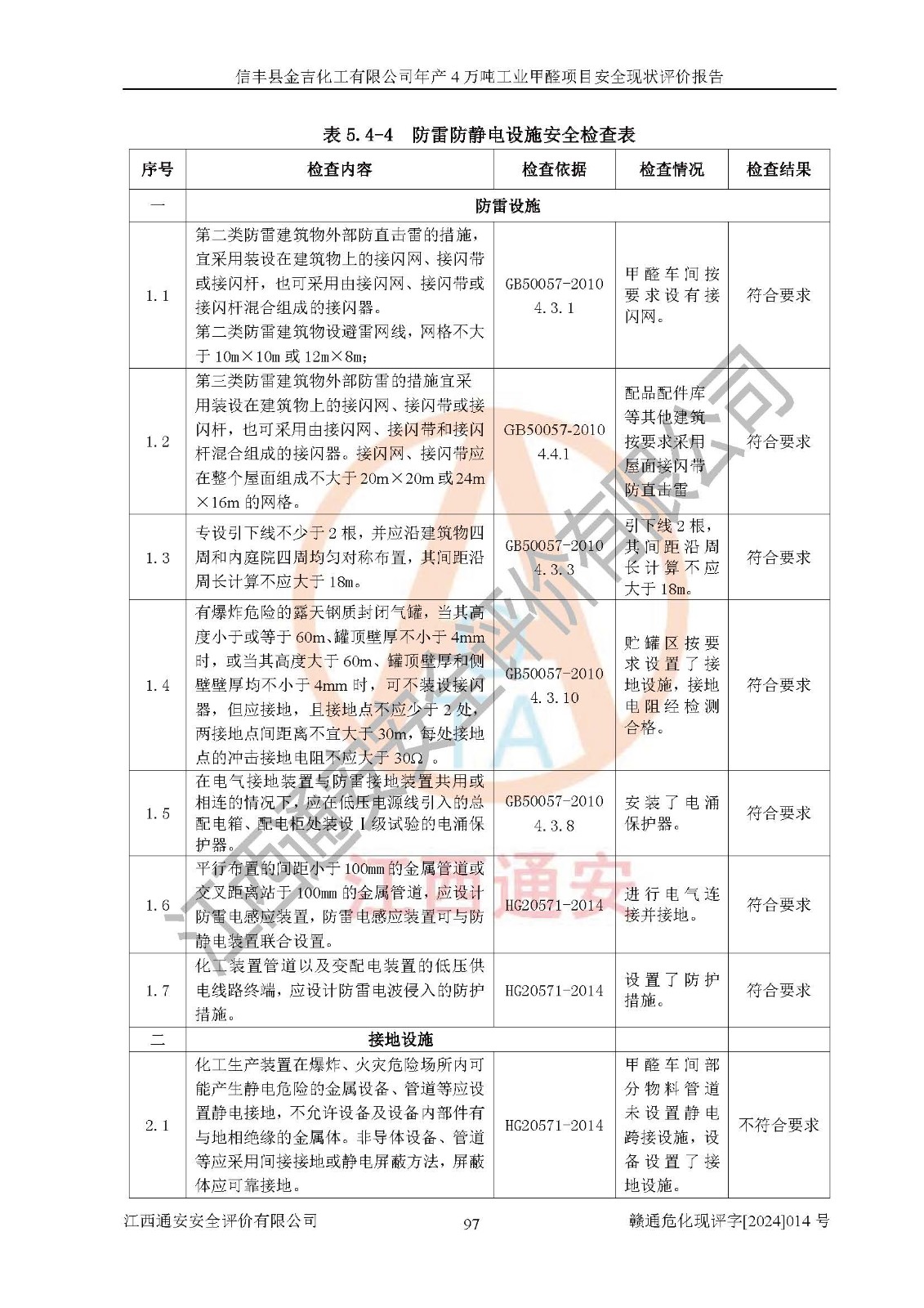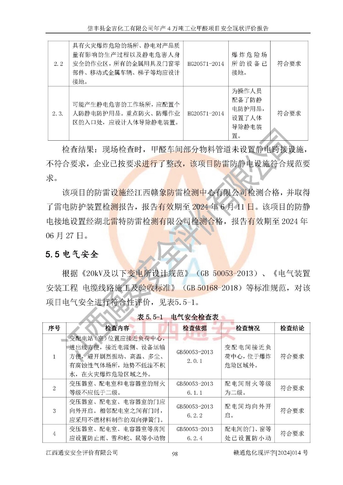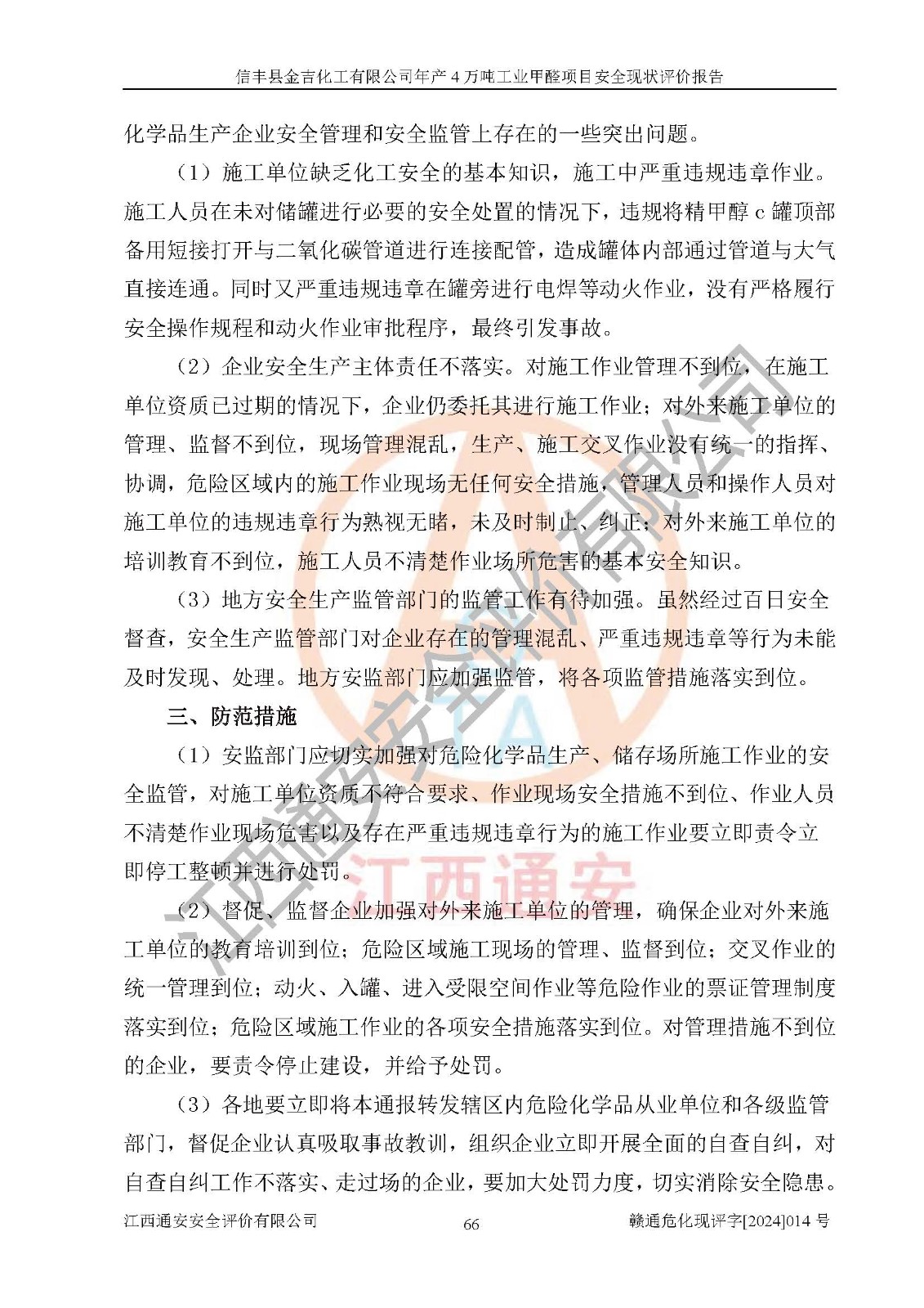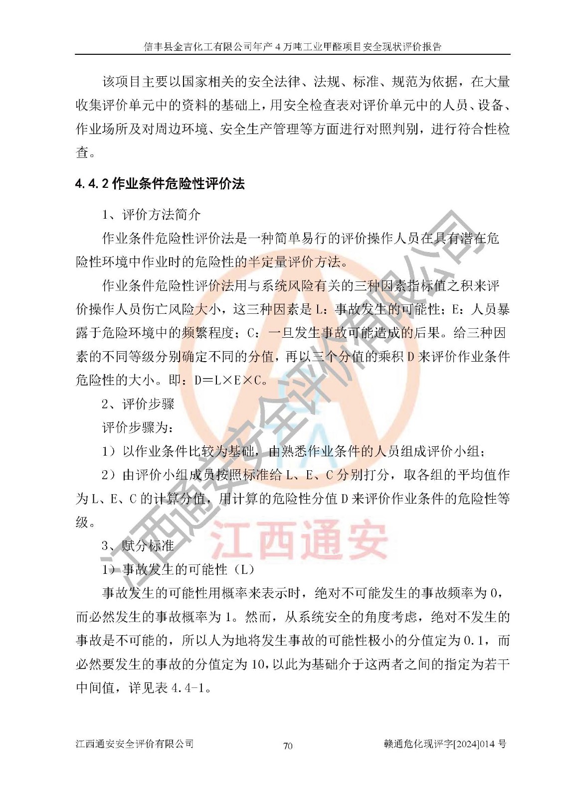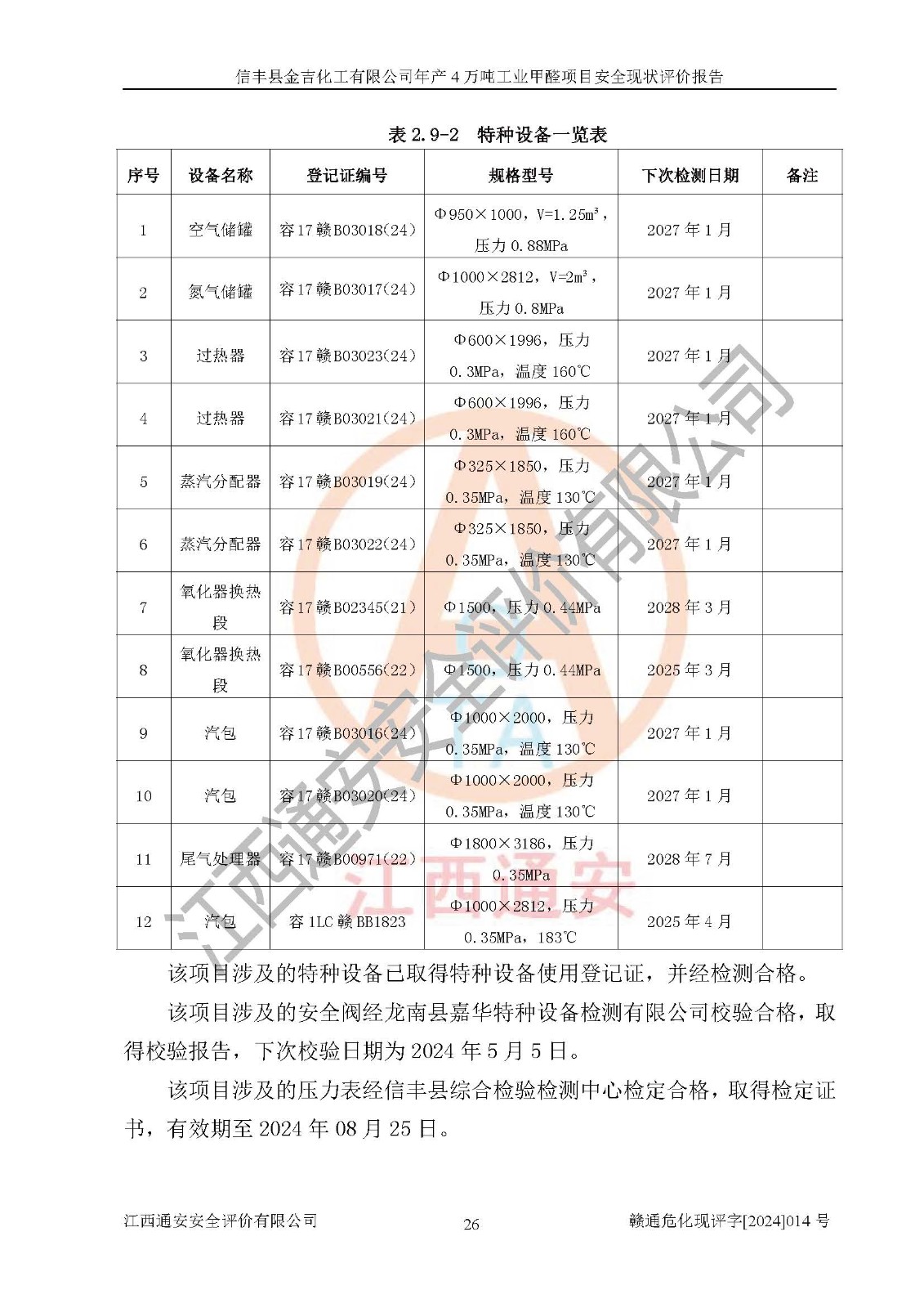 评价结论 | 信丰县金吉化工有限公司年产4万吨工业甲醛项目现场情况与设计图纸一致,DCS和SIS系统设计符合要求、运行正常,有关从业人员资质符合《江西省危险化学品安全专项整治三年行动实施方案》要求,安全设施及安全管理符合法律、法规、标准的要求,安全风险是受控制的,其风险程度是可以接受的,安全设施符合安全生产条件,能够满足安全生产的要求。 | ||||||