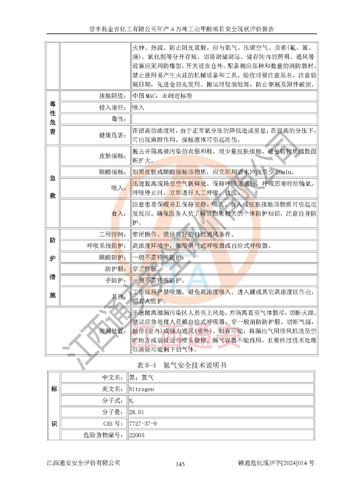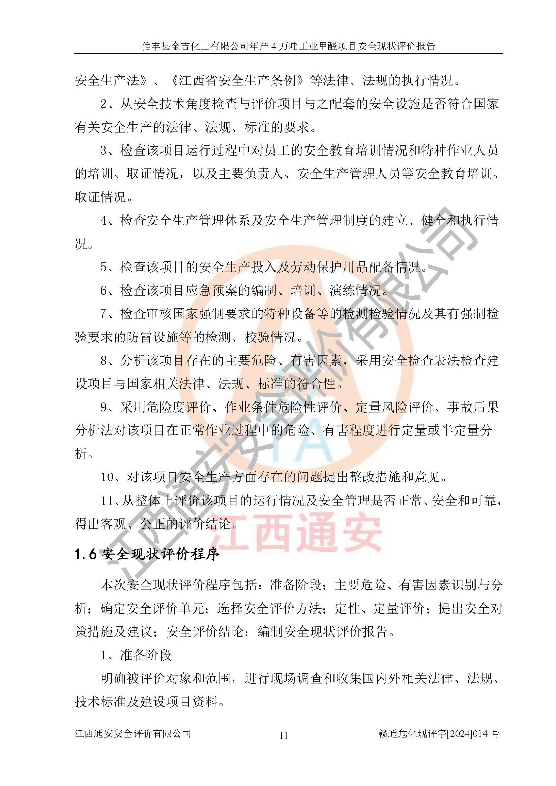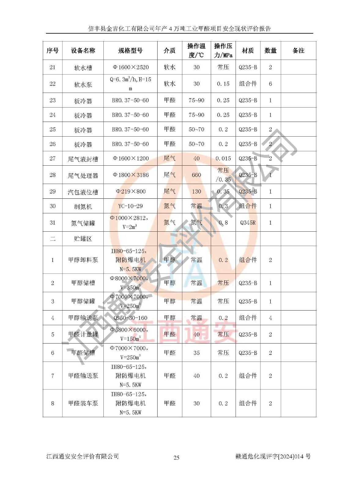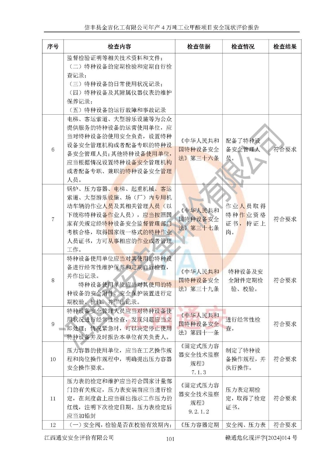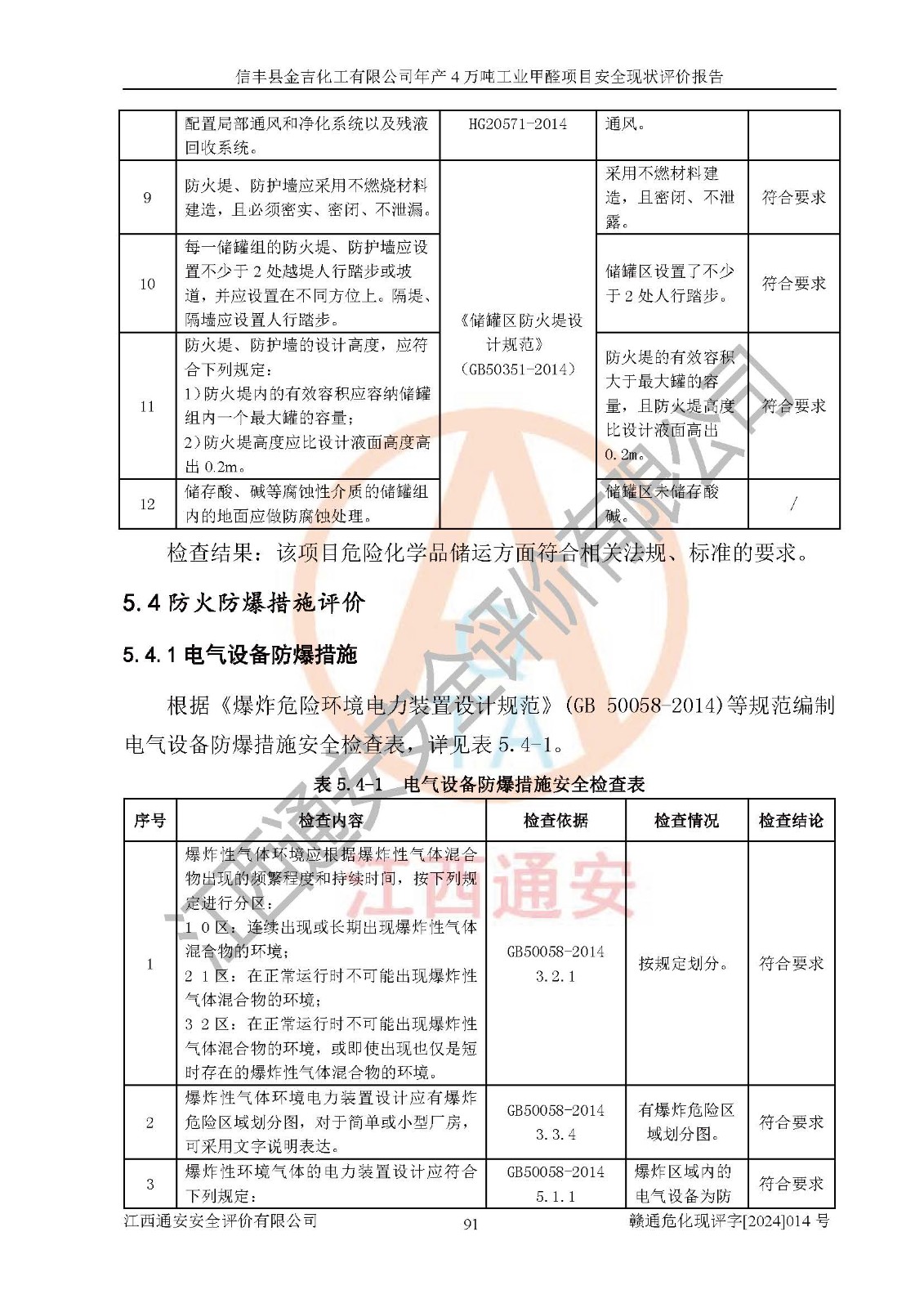 评价结论 | 信丰县金吉化工有限公司年产4万吨工业甲醛项目现场情况与设计图纸一致,DCS和SIS系统设计符合要求、运行正常,有关从业人员资质符合《江西省危险化学品安全专项整治三年行动实施方案》要求,安全设施及安全管理符合法律、法规、标准的要求,安全风险是受控制的,其风险程度是可以接受的,安全设施符合安全生产条件,能够满足安全生产的要求。 | ||||||