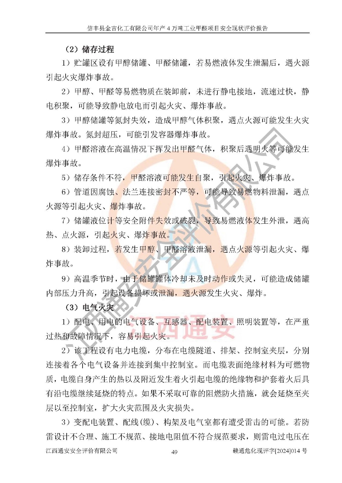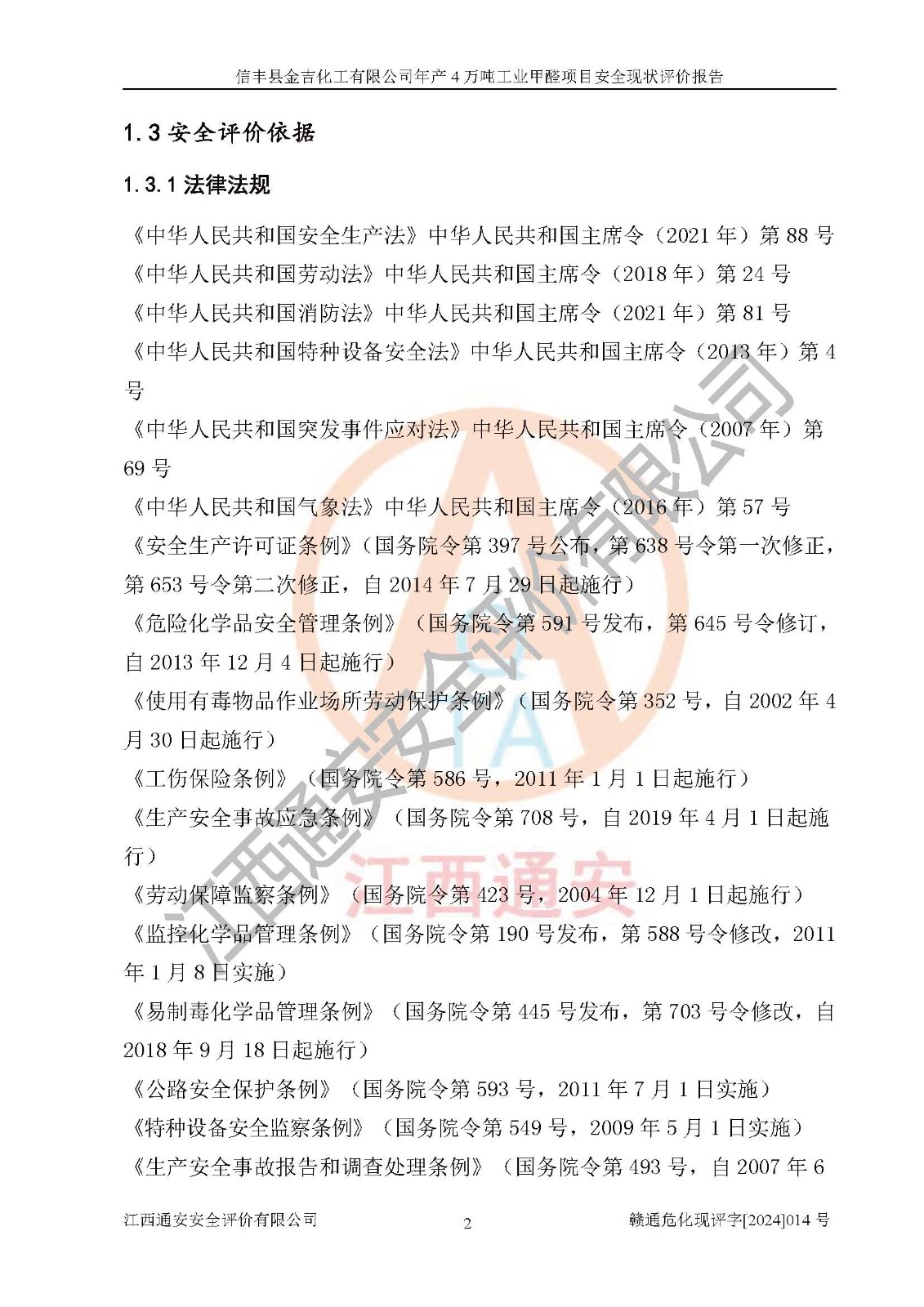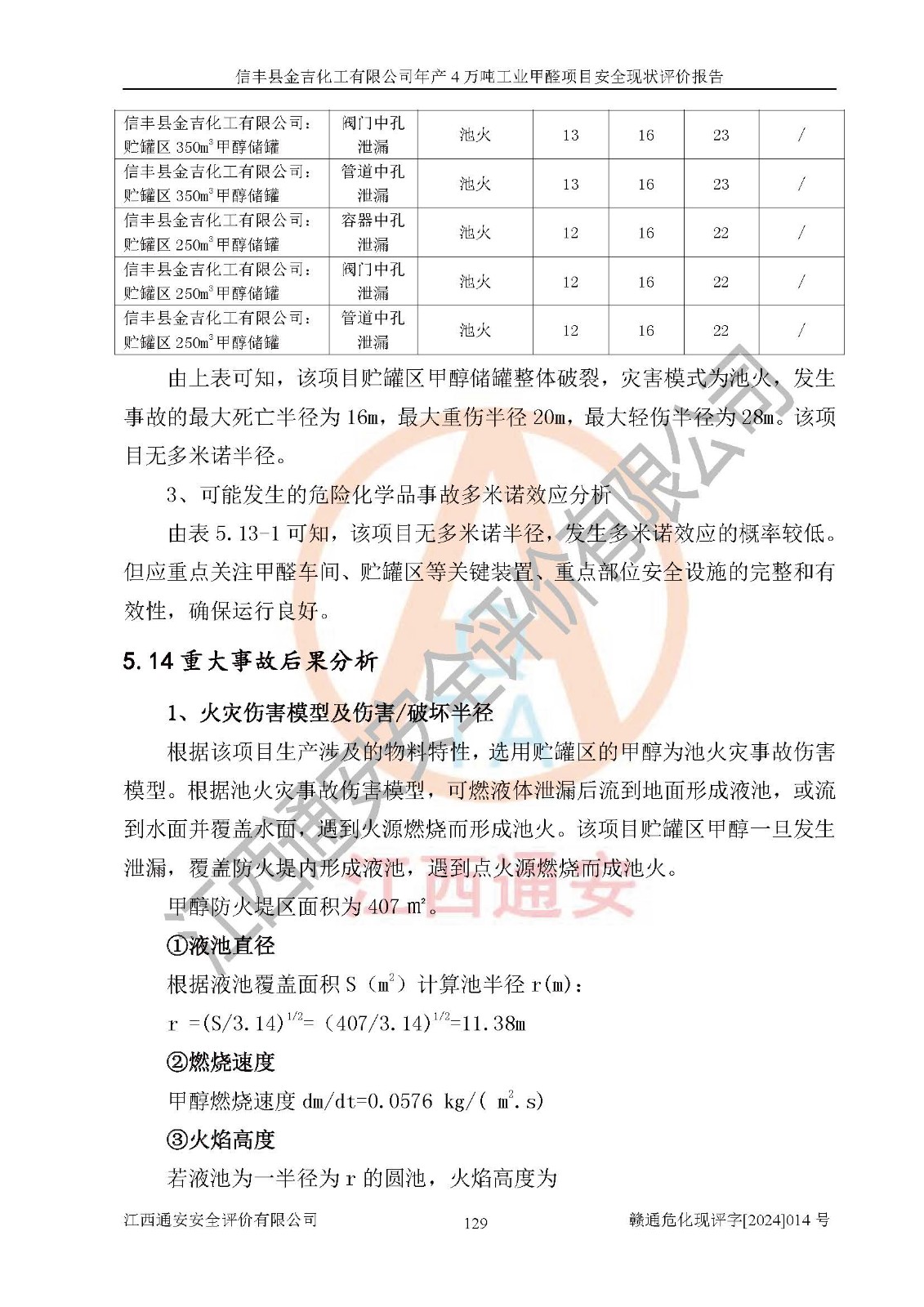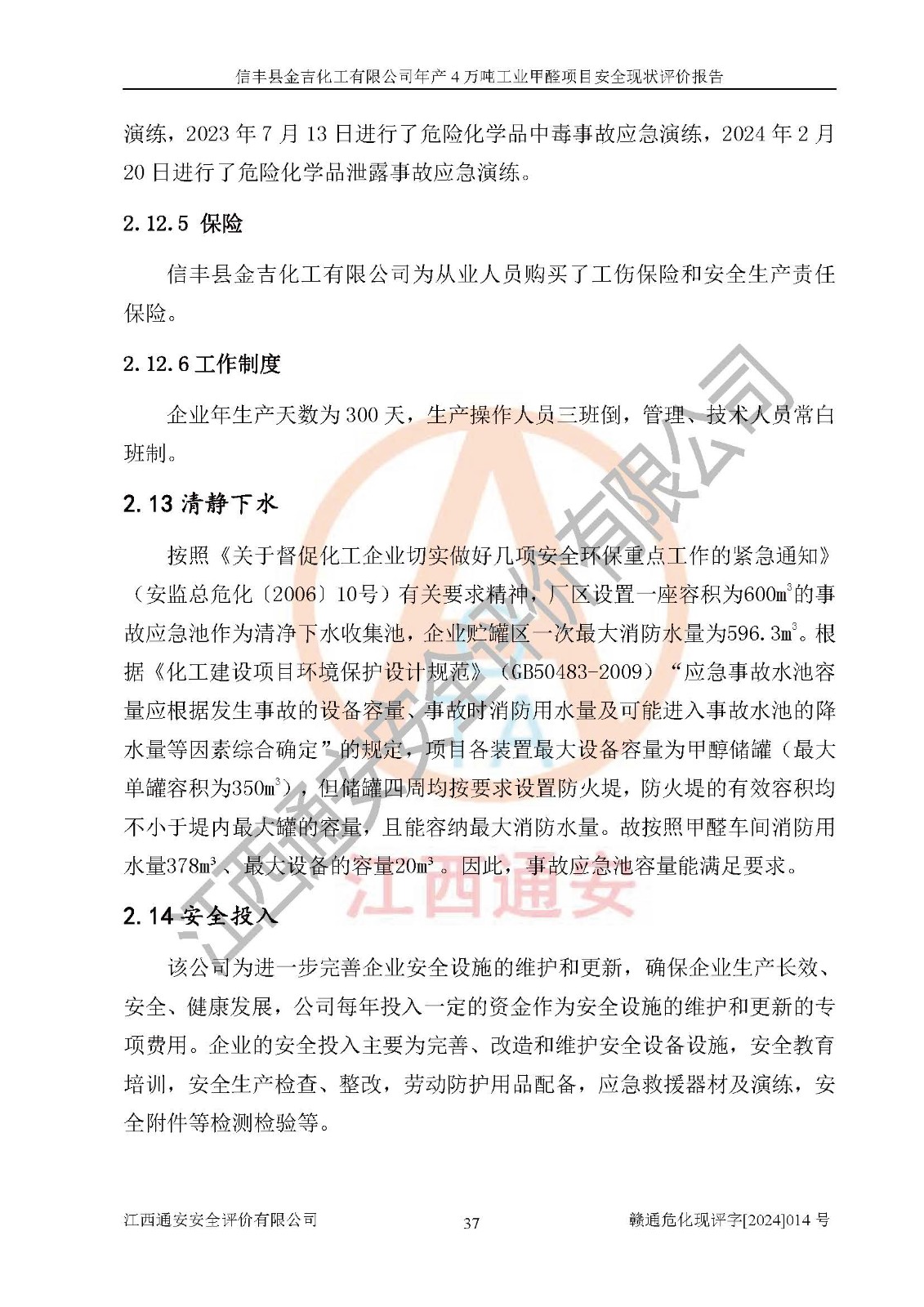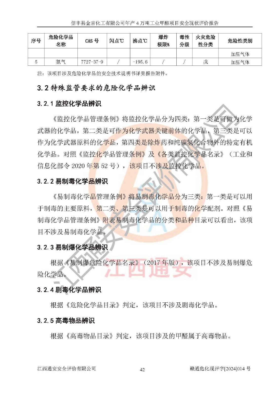 评价结论 | 信丰县金吉化工有限公司年产4万吨工业甲醛项目现场情况与设计图纸一致,DCS和SIS系统设计符合要求、运行正常,有关从业人员资质符合《江西省危险化学品安全专项整治三年行动实施方案》要求,安全设施及安全管理符合法律、法规、标准的要求,安全风险是受控制的,其风险程度是可以接受的,安全设施符合安全生产条件,能够满足安全生产的要求。 | ||||||