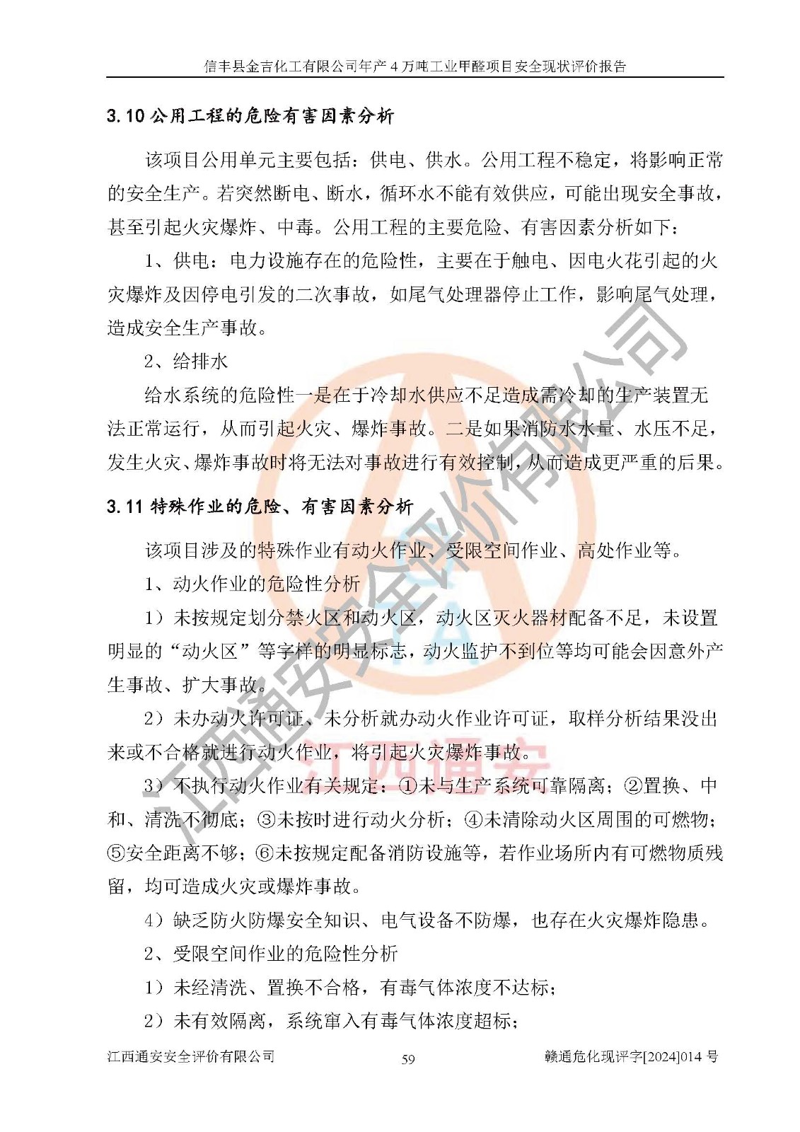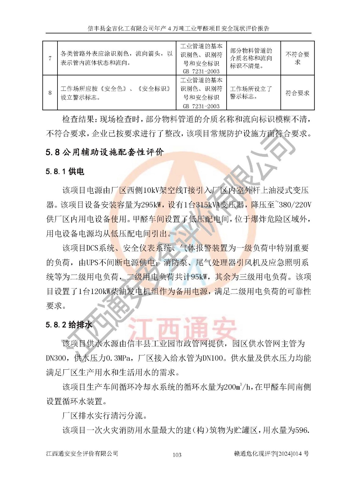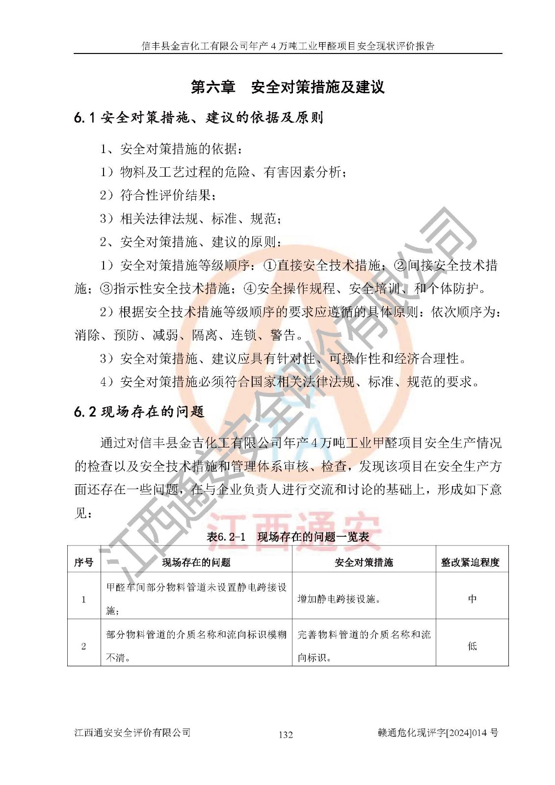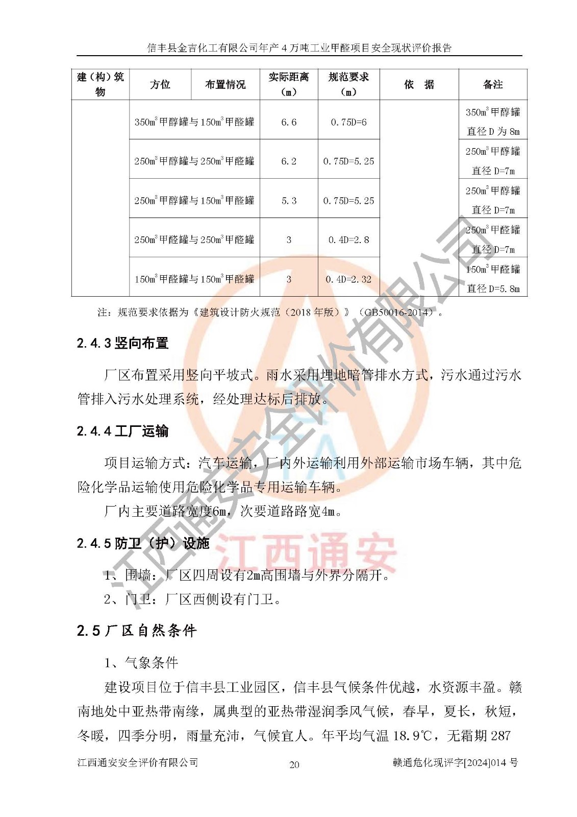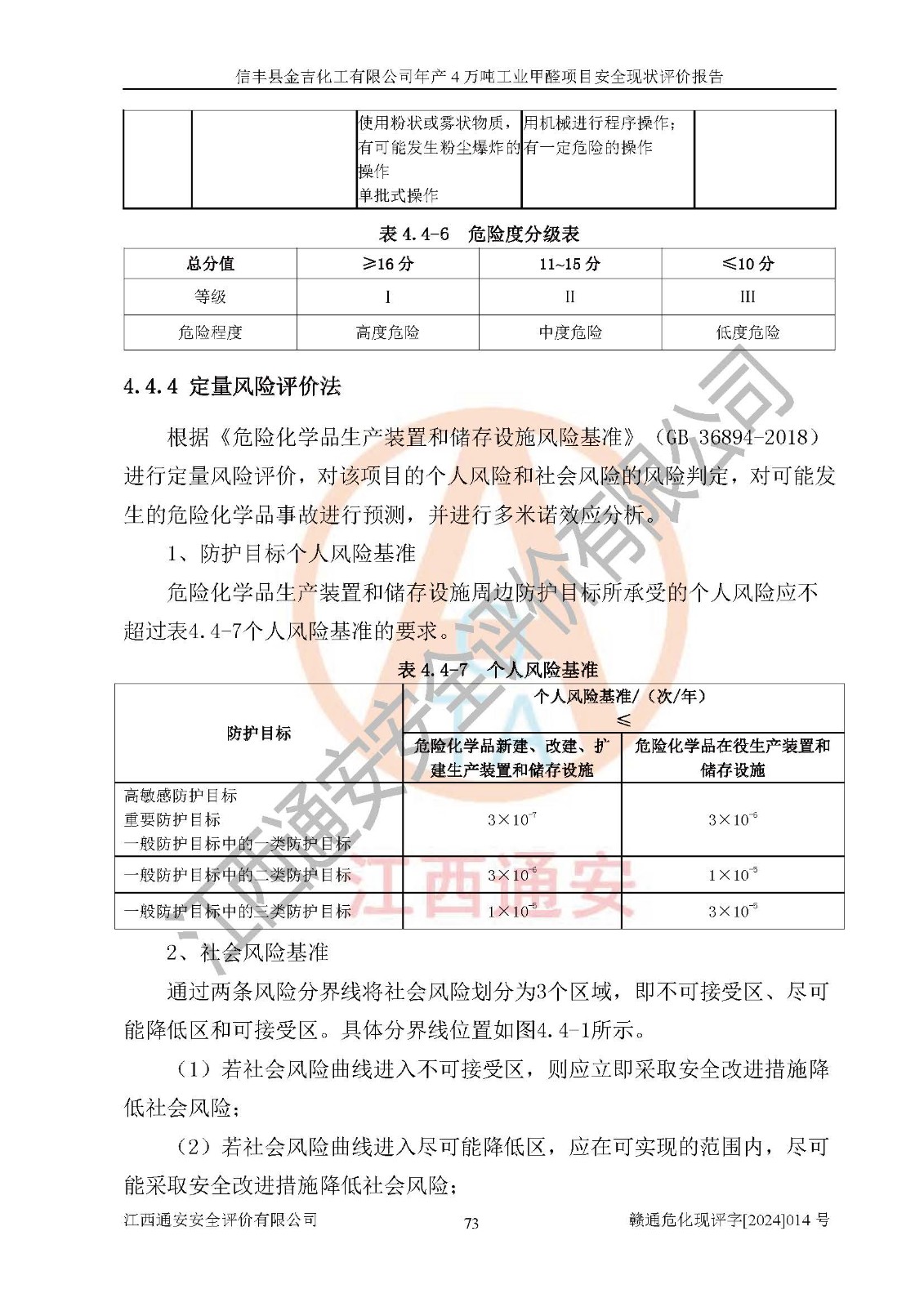 评价结论 | 信丰县金吉化工有限公司年产4万吨工业甲醛项目现场情况与设计图纸一致,DCS和SIS系统设计符合要求、运行正常,有关从业人员资质符合《江西省危险化学品安全专项整治三年行动实施方案》要求,安全设施及安全管理符合法律、法规、标准的要求,安全风险是受控制的,其风险程度是可以接受的,安全设施符合安全生产条件,能够满足安全生产的要求。 | ||||||