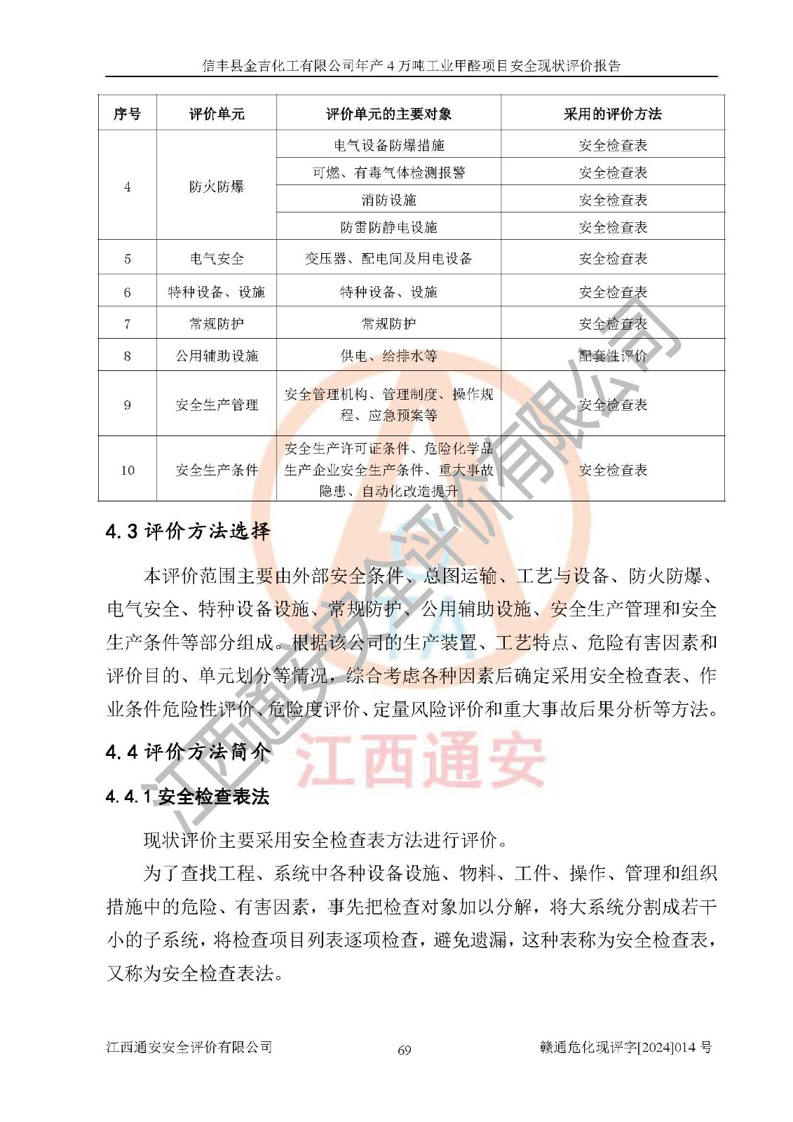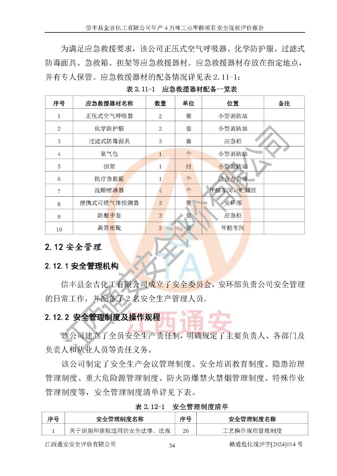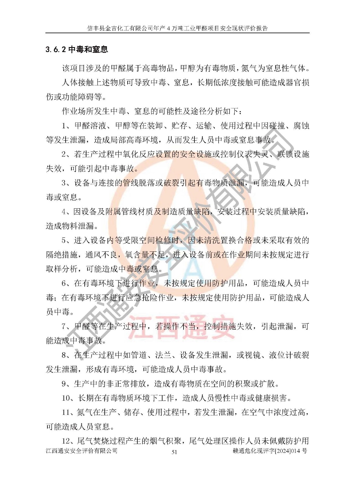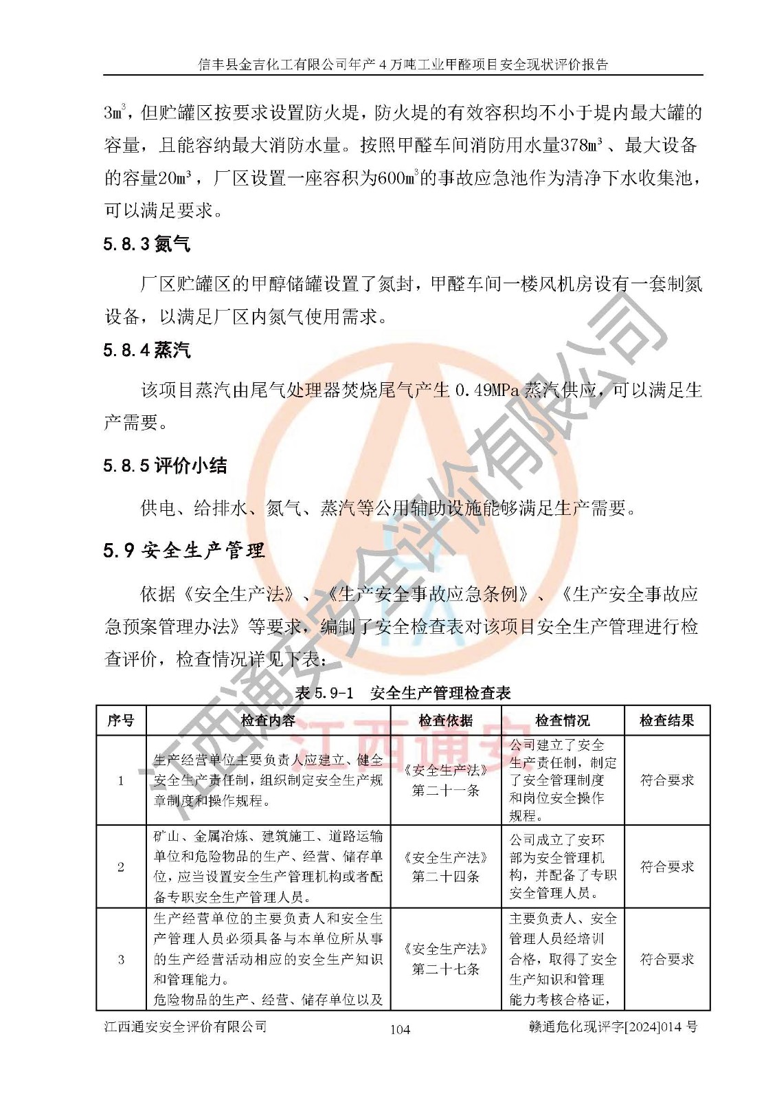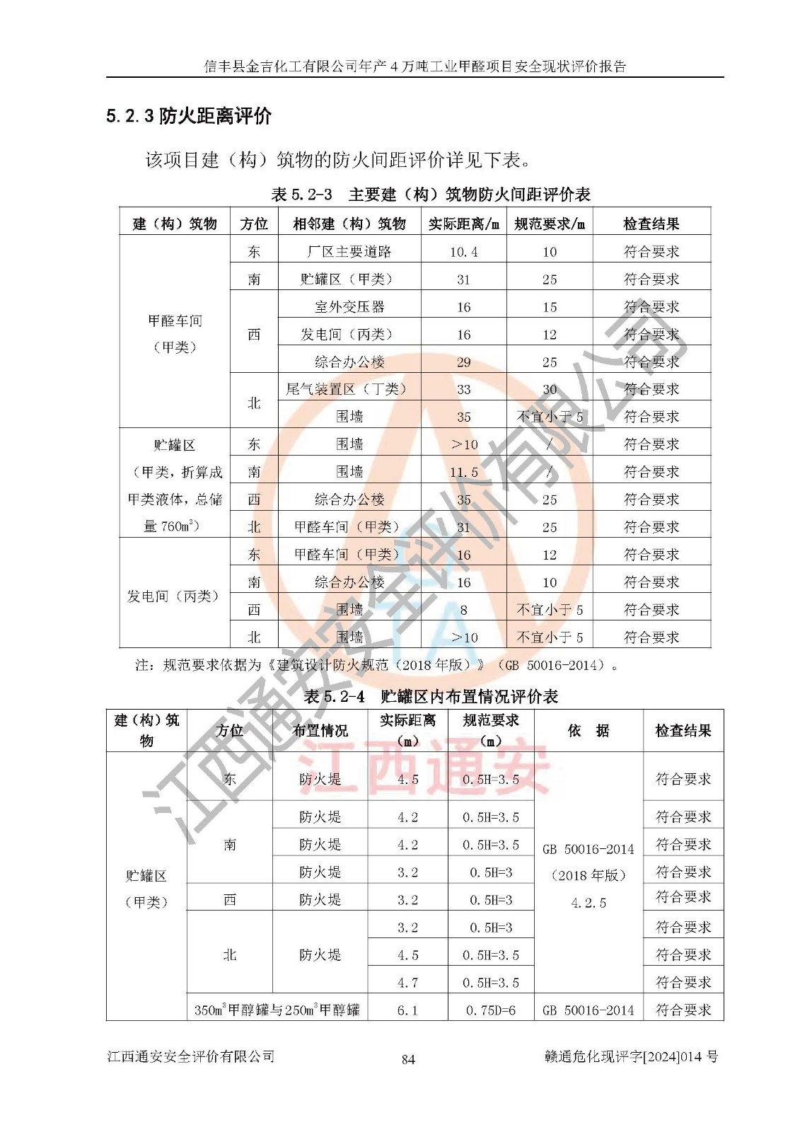 评价结论 | 信丰县金吉化工有限公司年产4万吨工业甲醛项目现场情况与设计图纸一致,DCS和SIS系统设计符合要求、运行正常,有关从业人员资质符合《江西省危险化学品安全专项整治三年行动实施方案》要求,安全设施及安全管理符合法律、法规、标准的要求,安全风险是受控制的,其风险程度是可以接受的,安全设施符合安全生产条件,能够满足安全生产的要求。 | ||||||