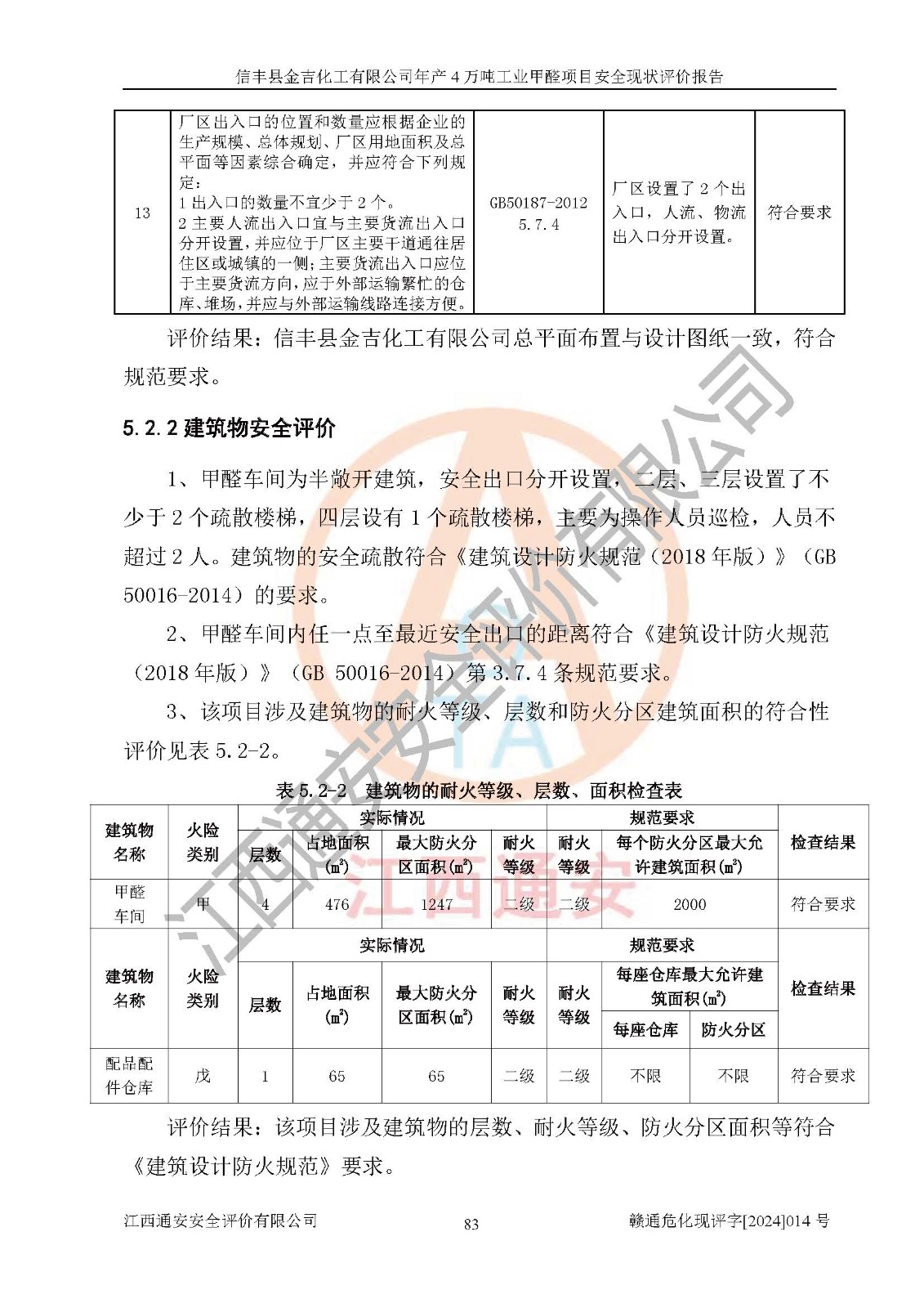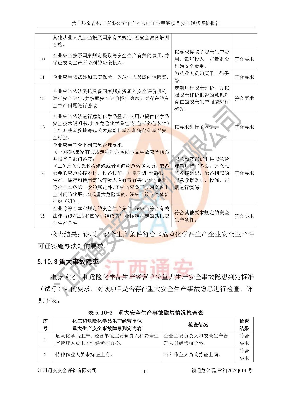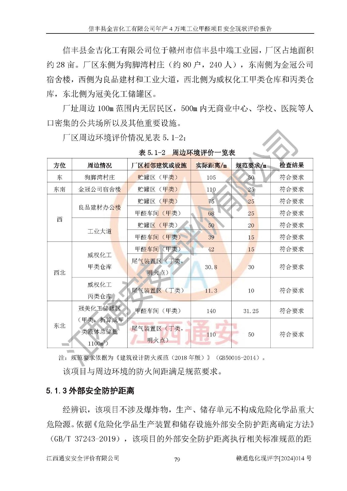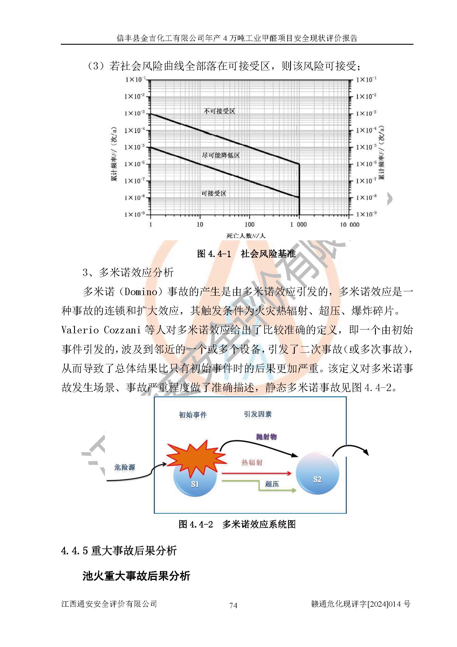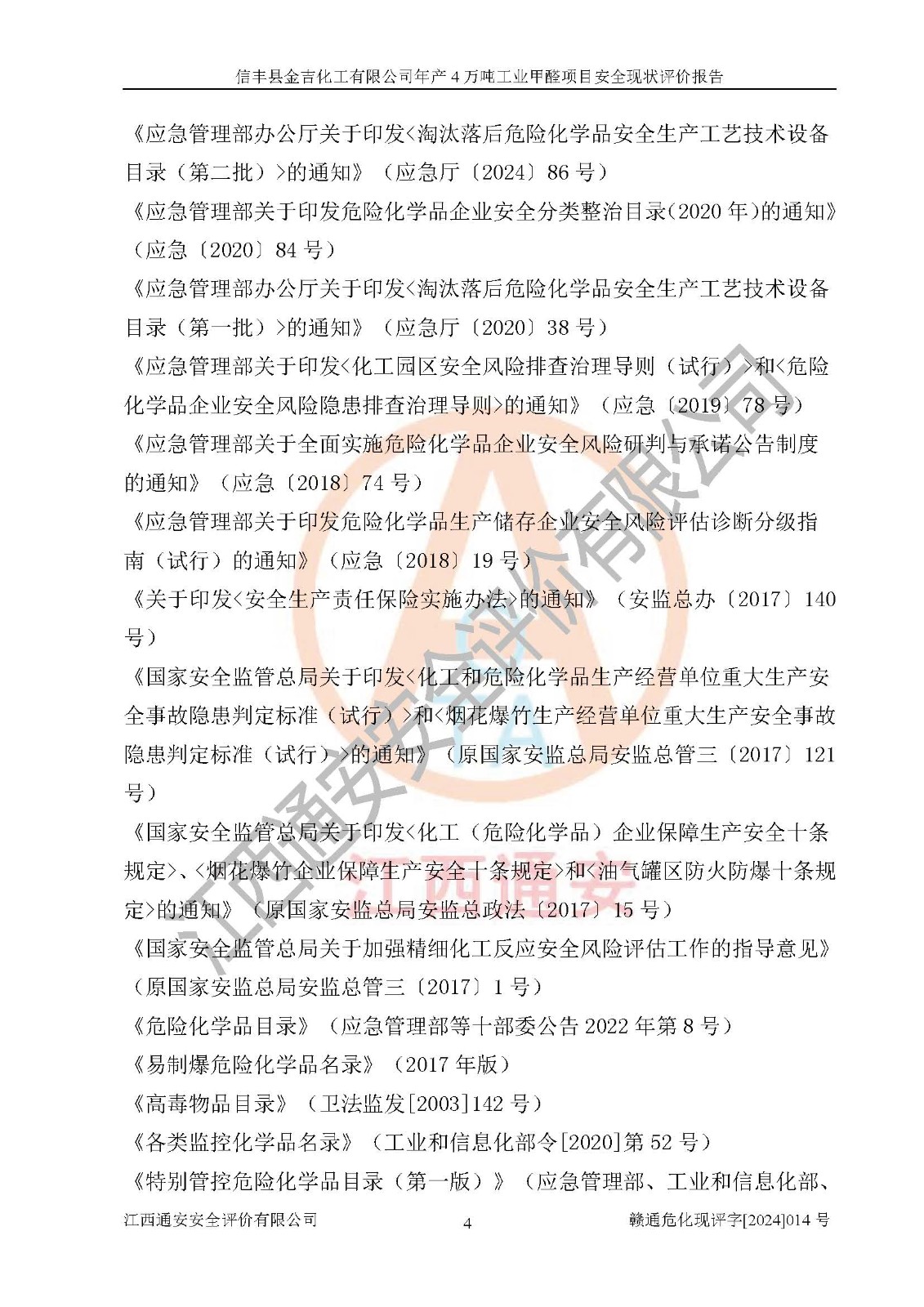 评价结论 | 信丰县金吉化工有限公司年产4万吨工业甲醛项目现场情况与设计图纸一致,DCS和SIS系统设计符合要求、运行正常,有关从业人员资质符合《江西省危险化学品安全专项整治三年行动实施方案》要求,安全设施及安全管理符合法律、法规、标准的要求,安全风险是受控制的,其风险程度是可以接受的,安全设施符合安全生产条件,能够满足安全生产的要求。 | ||||||