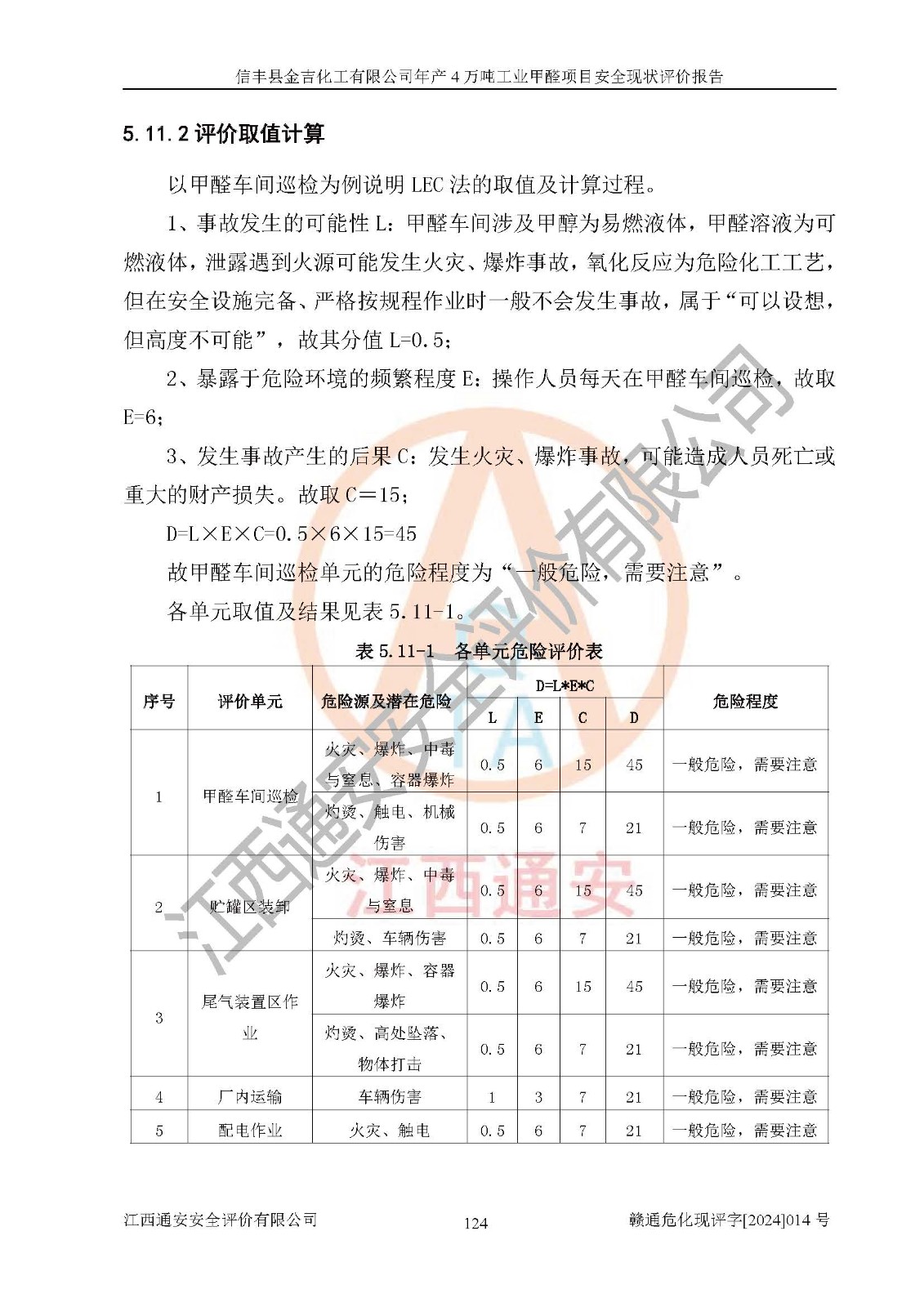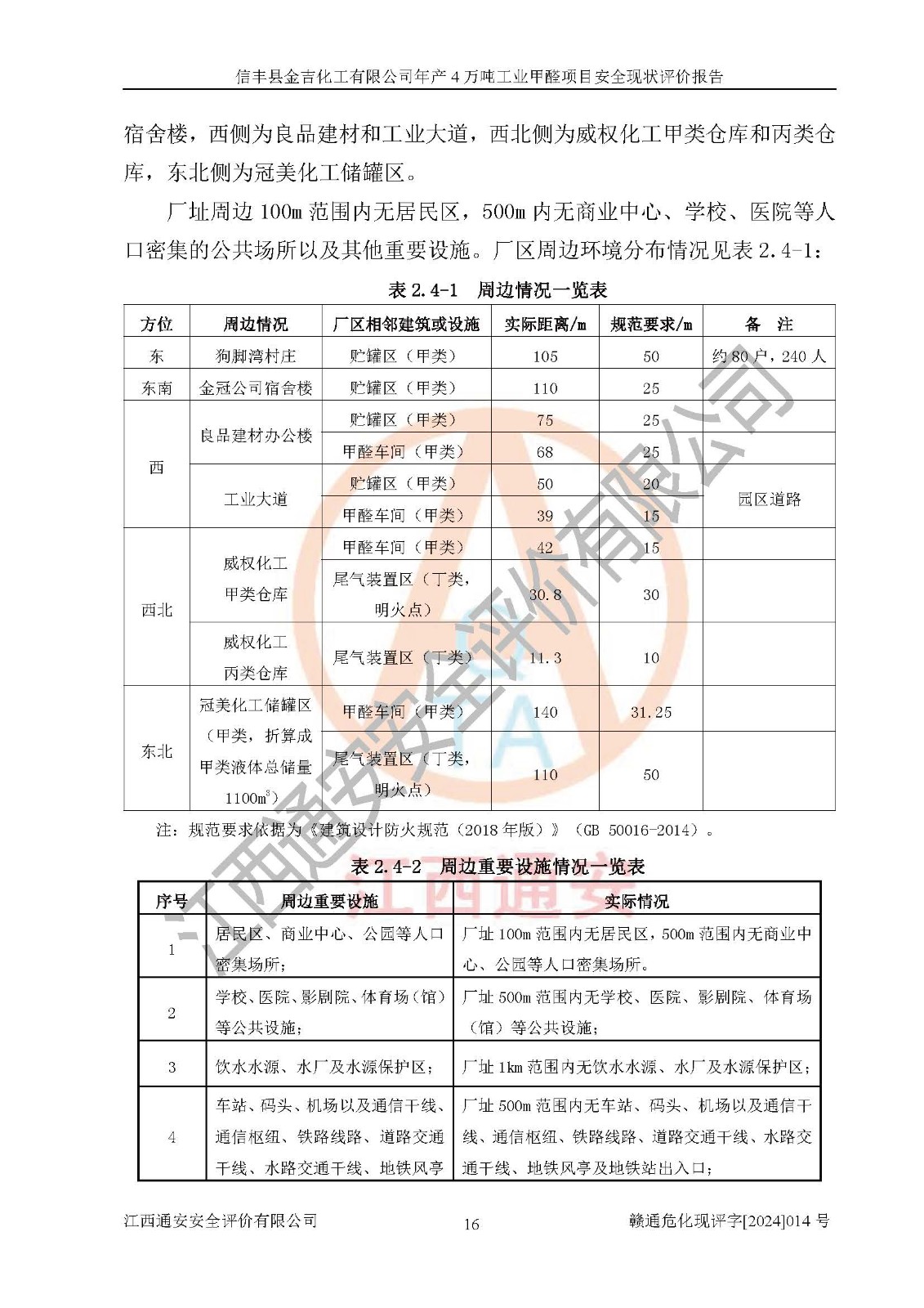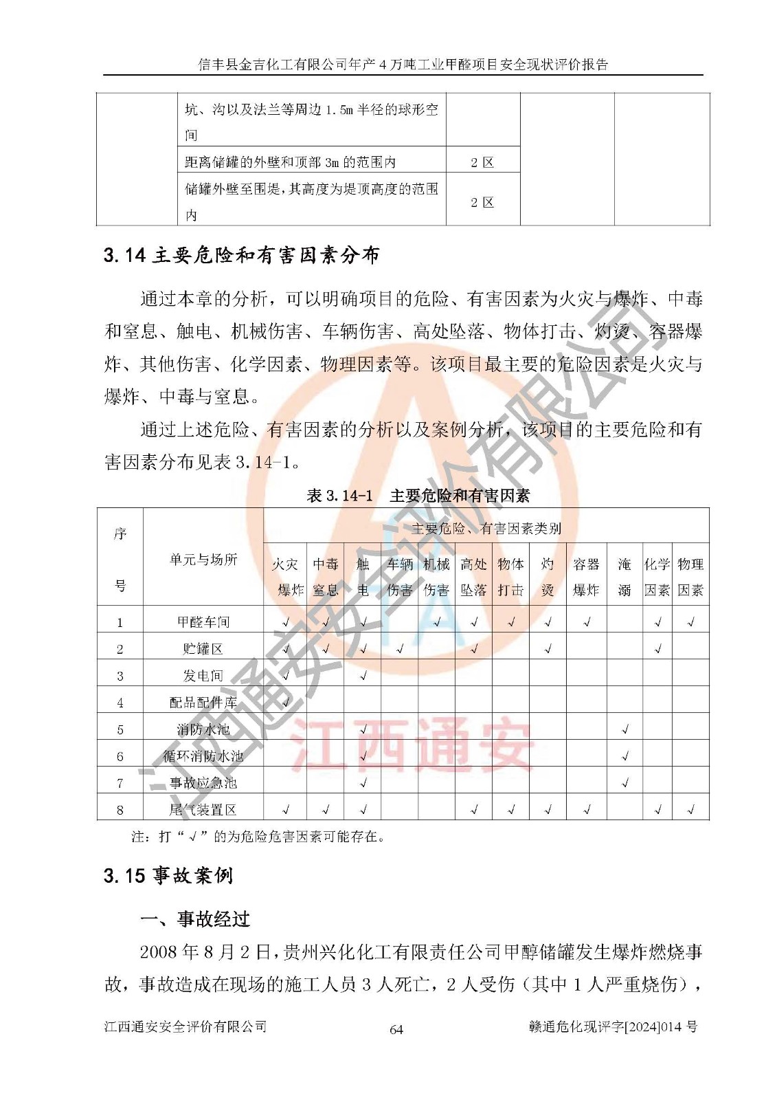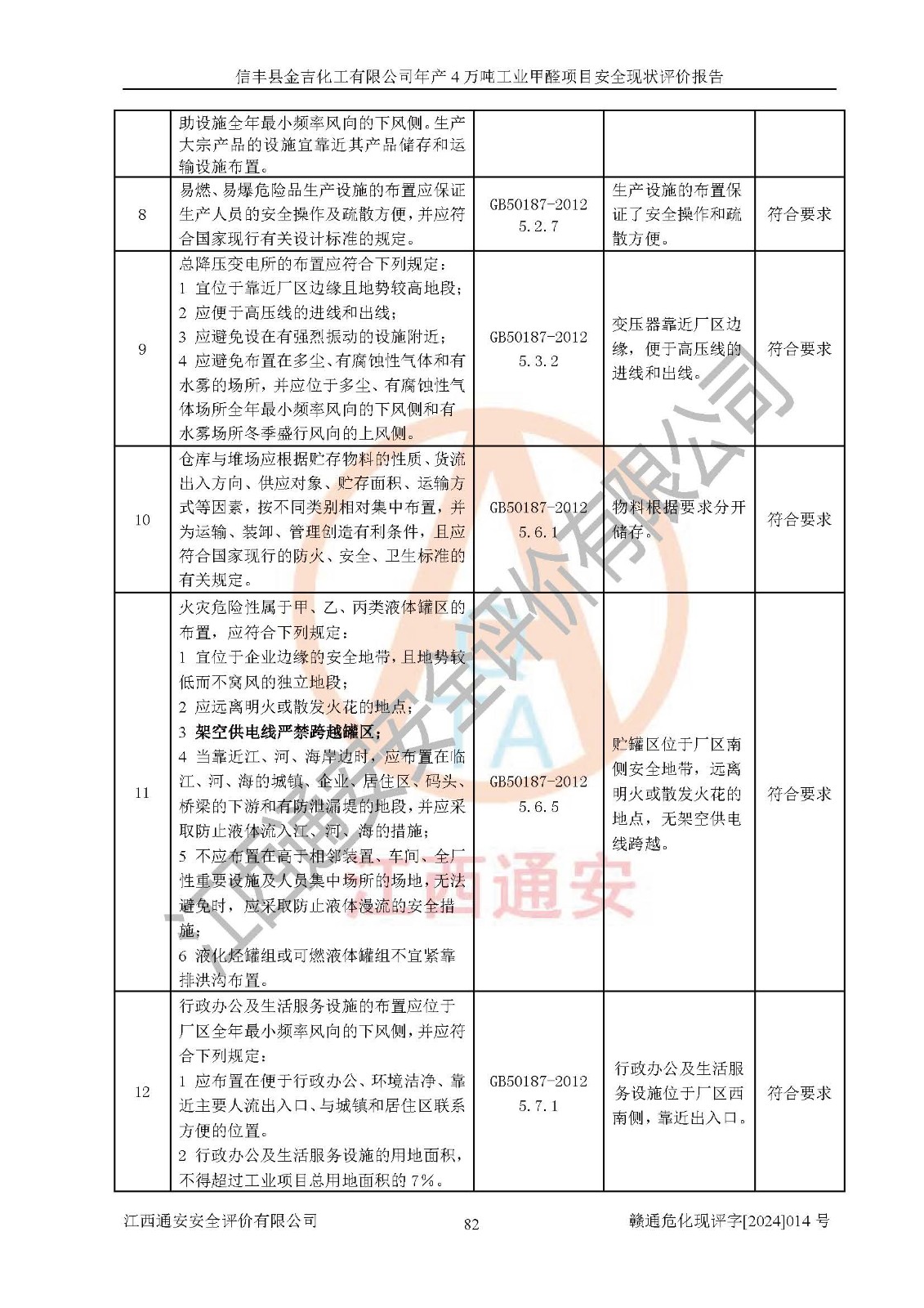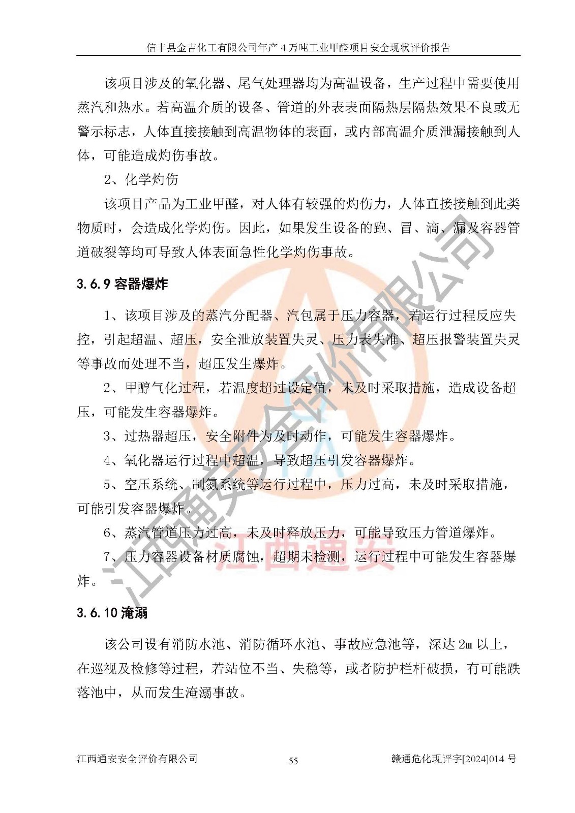 评价结论 | 信丰县金吉化工有限公司年产4万吨工业甲醛项目现场情况与设计图纸一致,DCS和SIS系统设计符合要求、运行正常,有关从业人员资质符合《江西省危险化学品安全专项整治三年行动实施方案》要求,安全设施及安全管理符合法律、法规、标准的要求,安全风险是受控制的,其风险程度是可以接受的,安全设施符合安全生产条件,能够满足安全生产的要求。 | ||||||