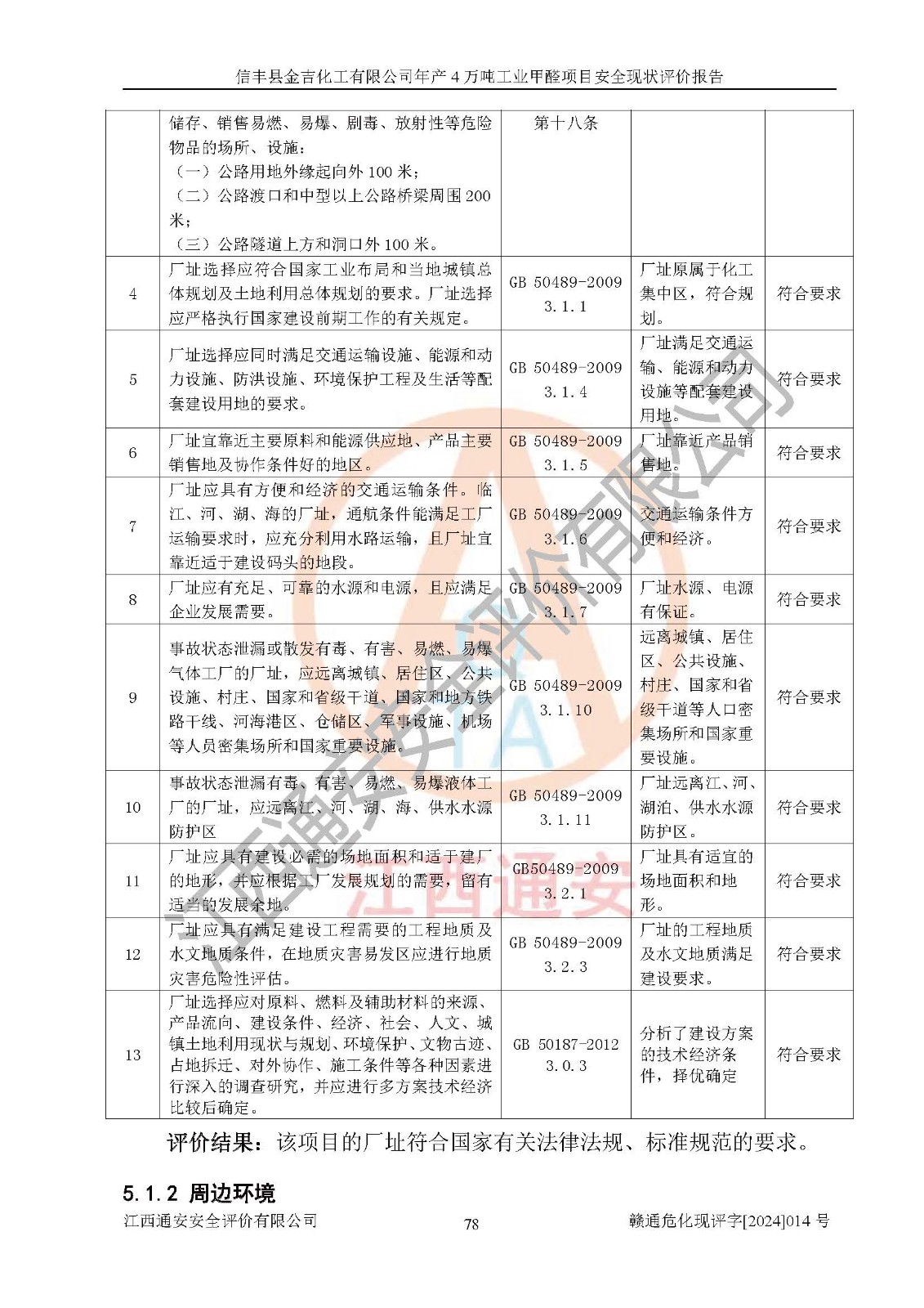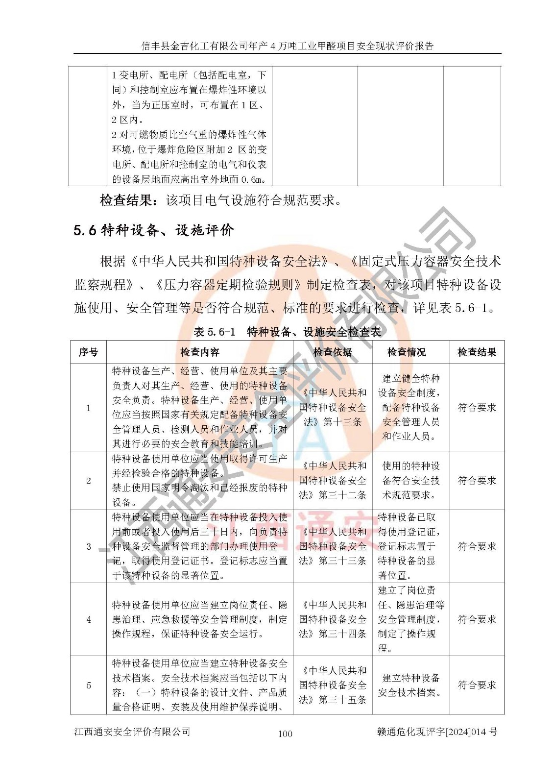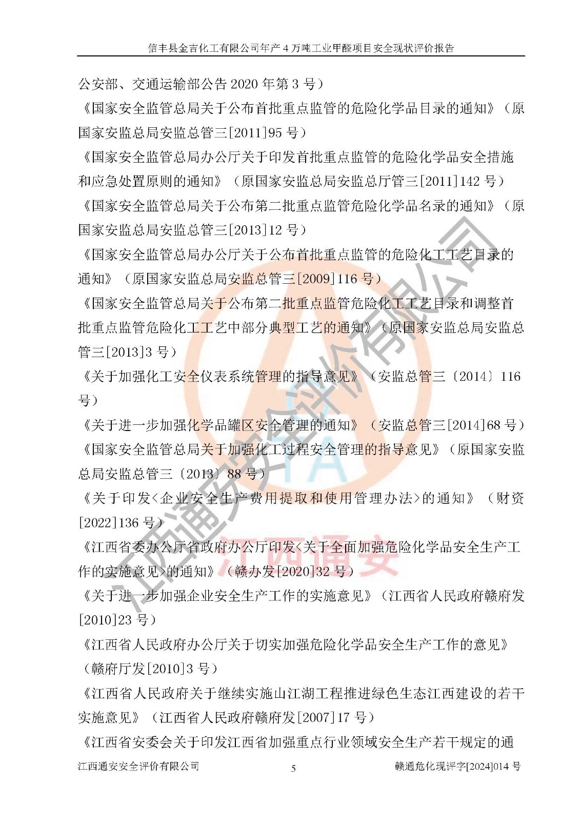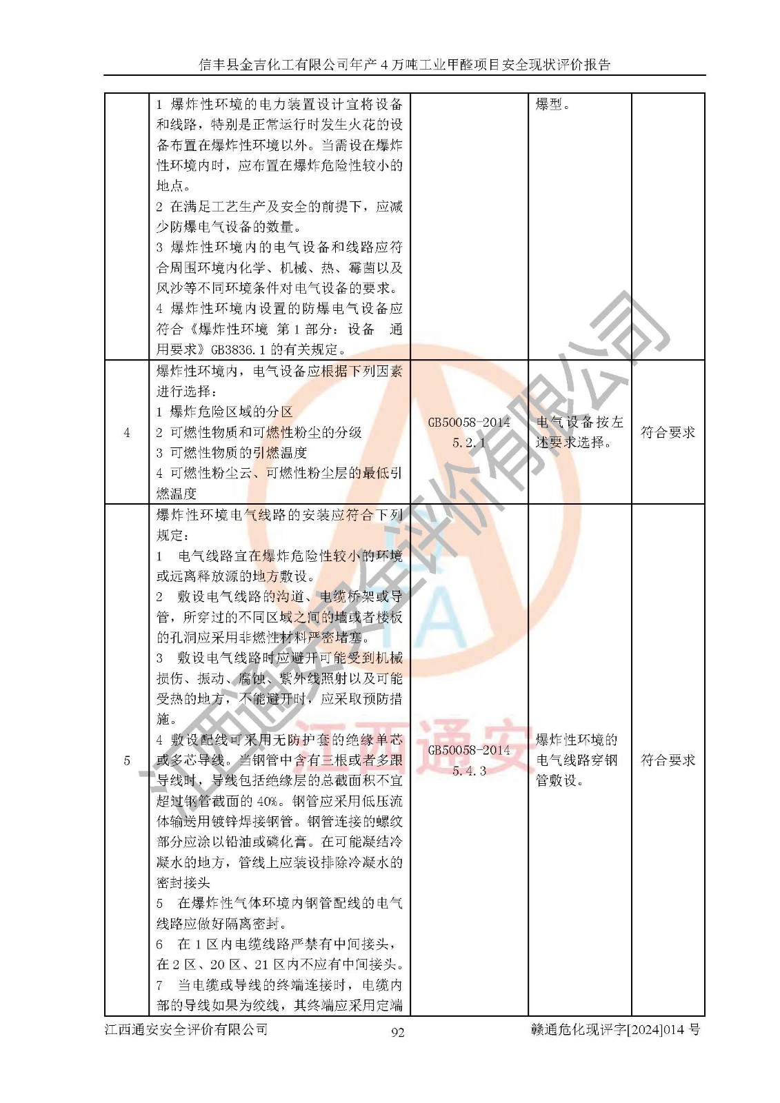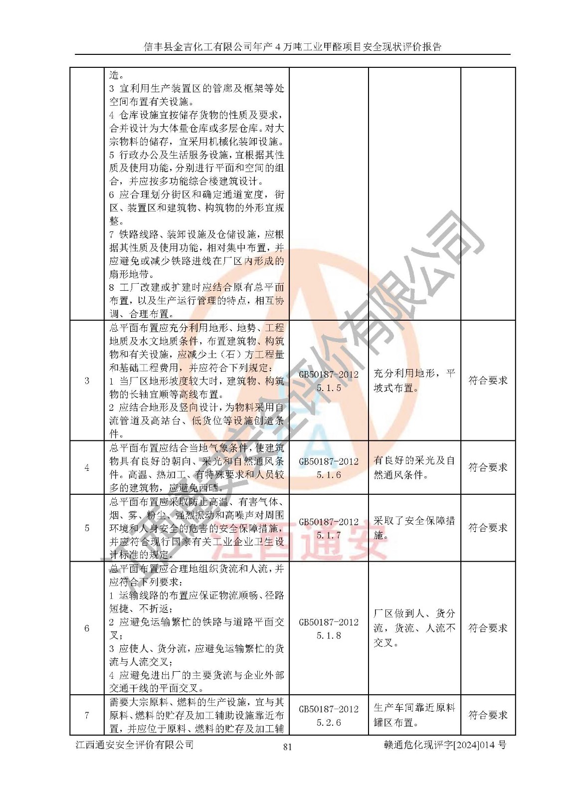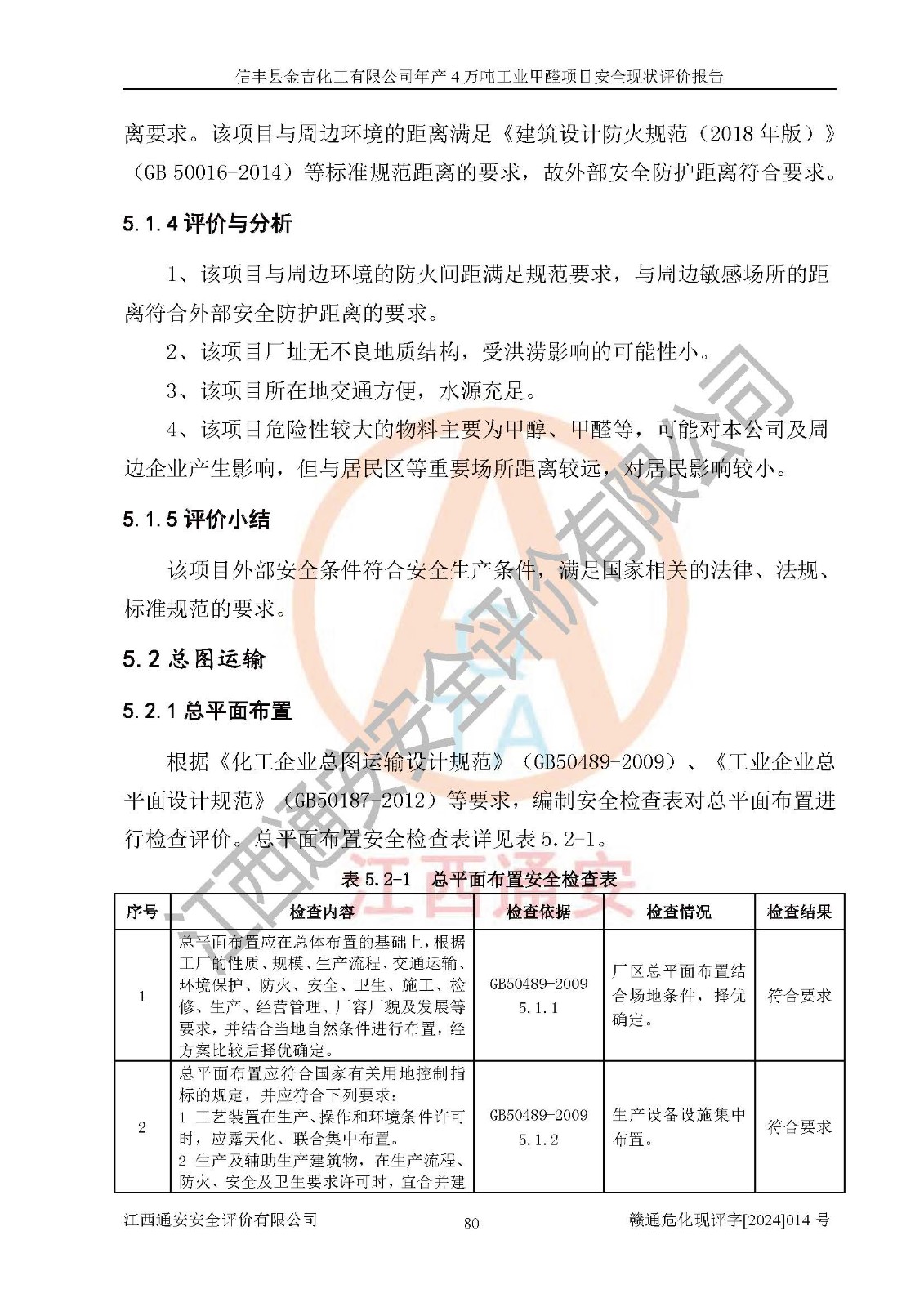 评价结论 | 信丰县金吉化工有限公司年产4万吨工业甲醛项目现场情况与设计图纸一致,DCS和SIS系统设计符合要求、运行正常,有关从业人员资质符合《江西省危险化学品安全专项整治三年行动实施方案》要求,安全设施及安全管理符合法律、法规、标准的要求,安全风险是受控制的,其风险程度是可以接受的,安全设施符合安全生产条件,能够满足安全生产的要求。 | ||||||