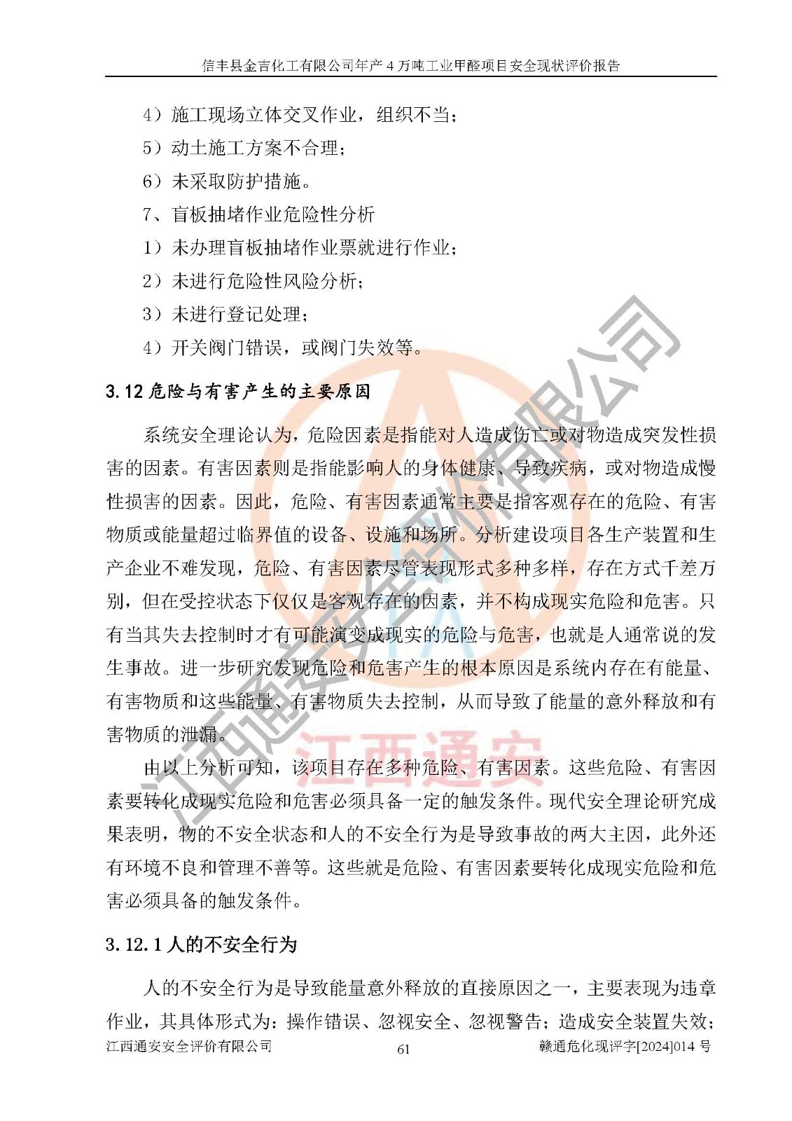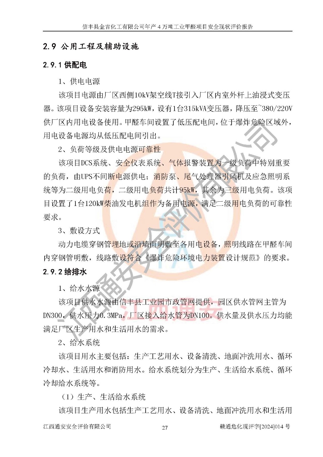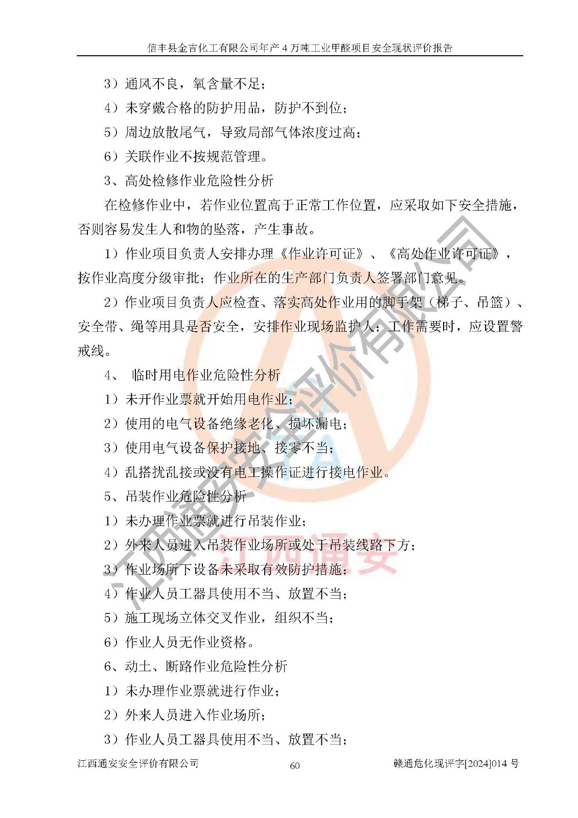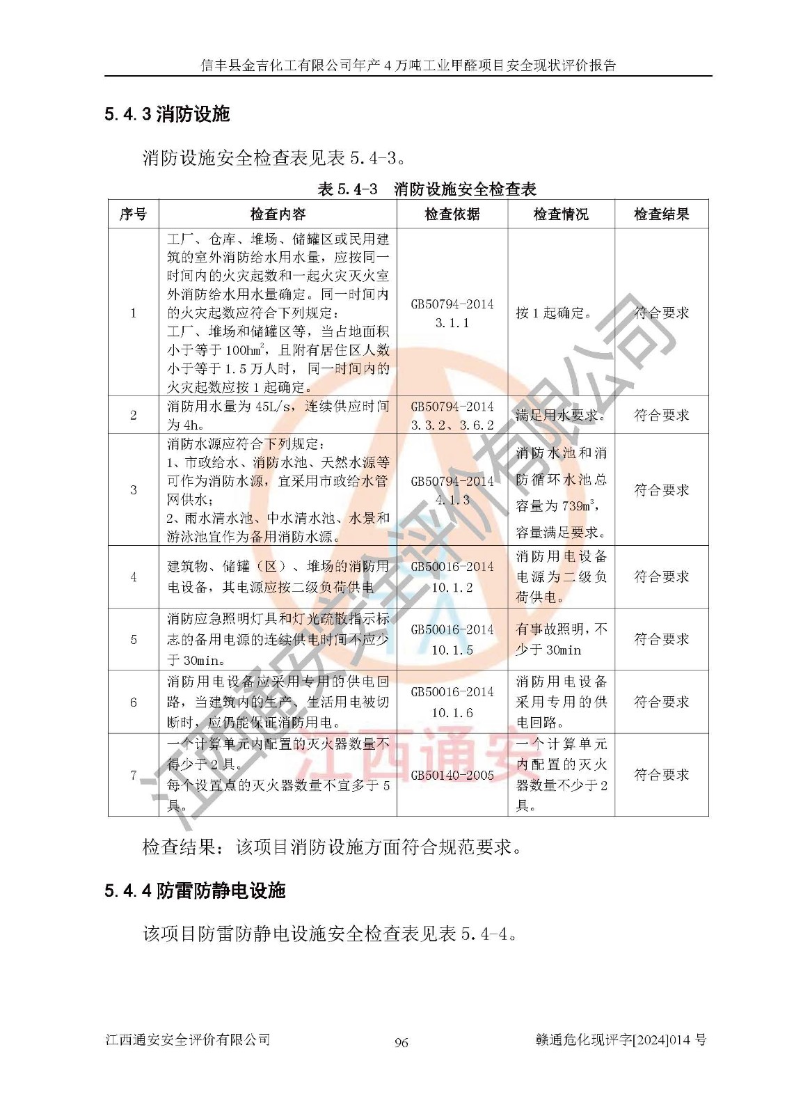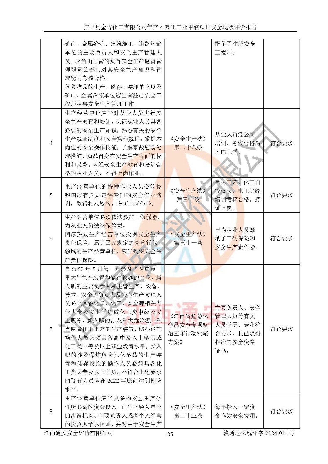 评价结论 | 信丰县金吉化工有限公司年产4万吨工业甲醛项目现场情况与设计图纸一致,DCS和SIS系统设计符合要求、运行正常,有关从业人员资质符合《江西省危险化学品安全专项整治三年行动实施方案》要求,安全设施及安全管理符合法律、法规、标准的要求,安全风险是受控制的,其风险程度是可以接受的,安全设施符合安全生产条件,能够满足安全生产的要求。 | ||||||